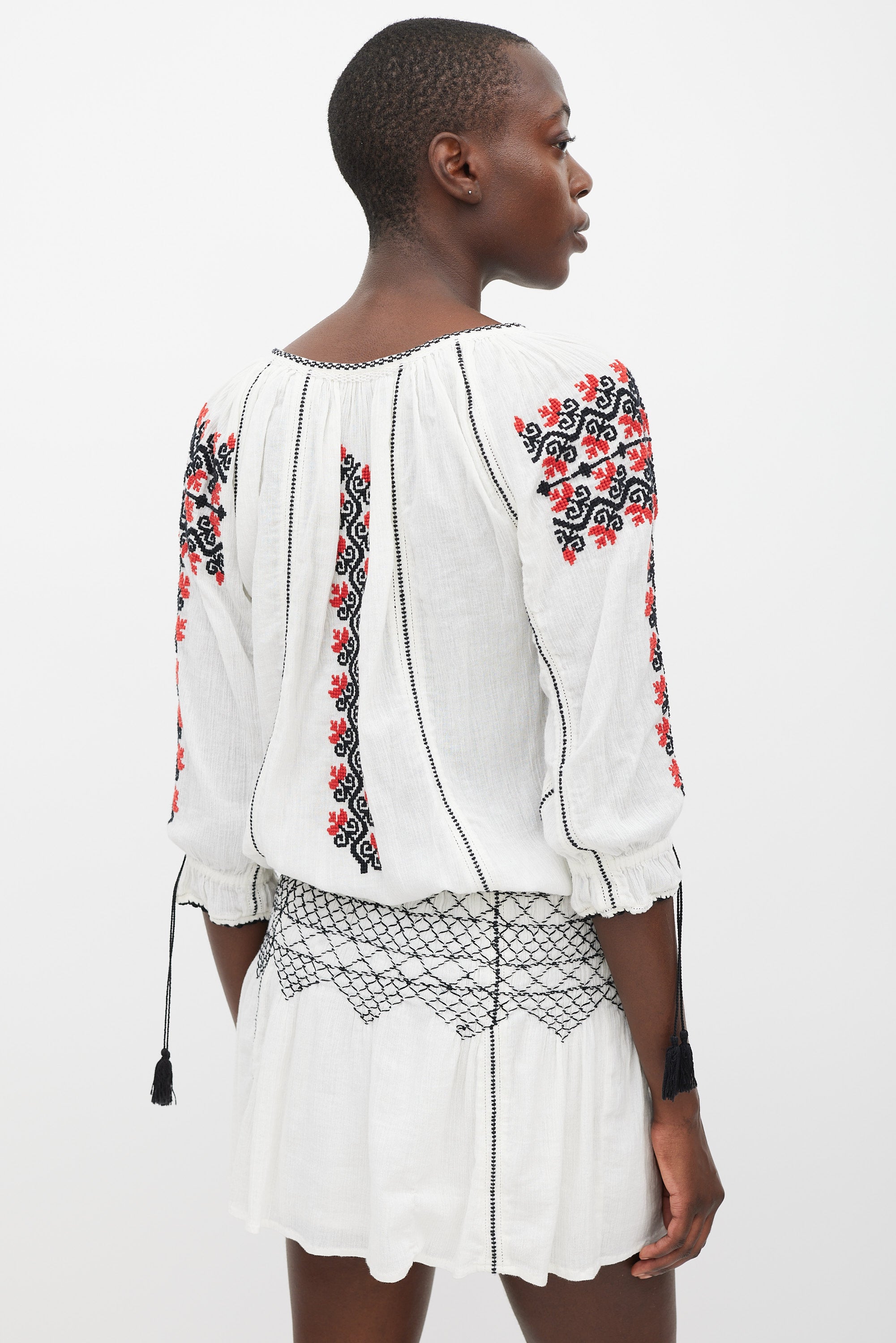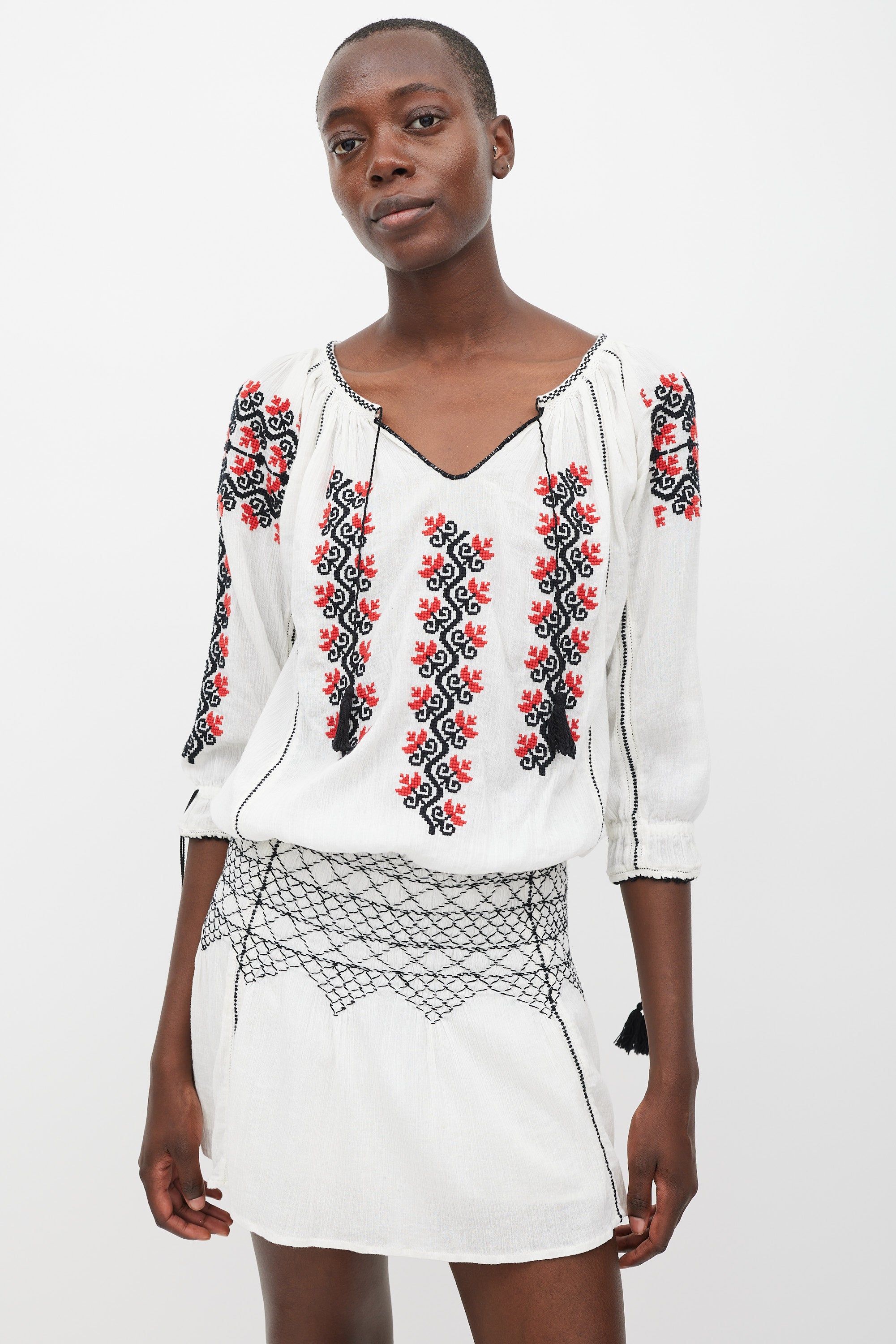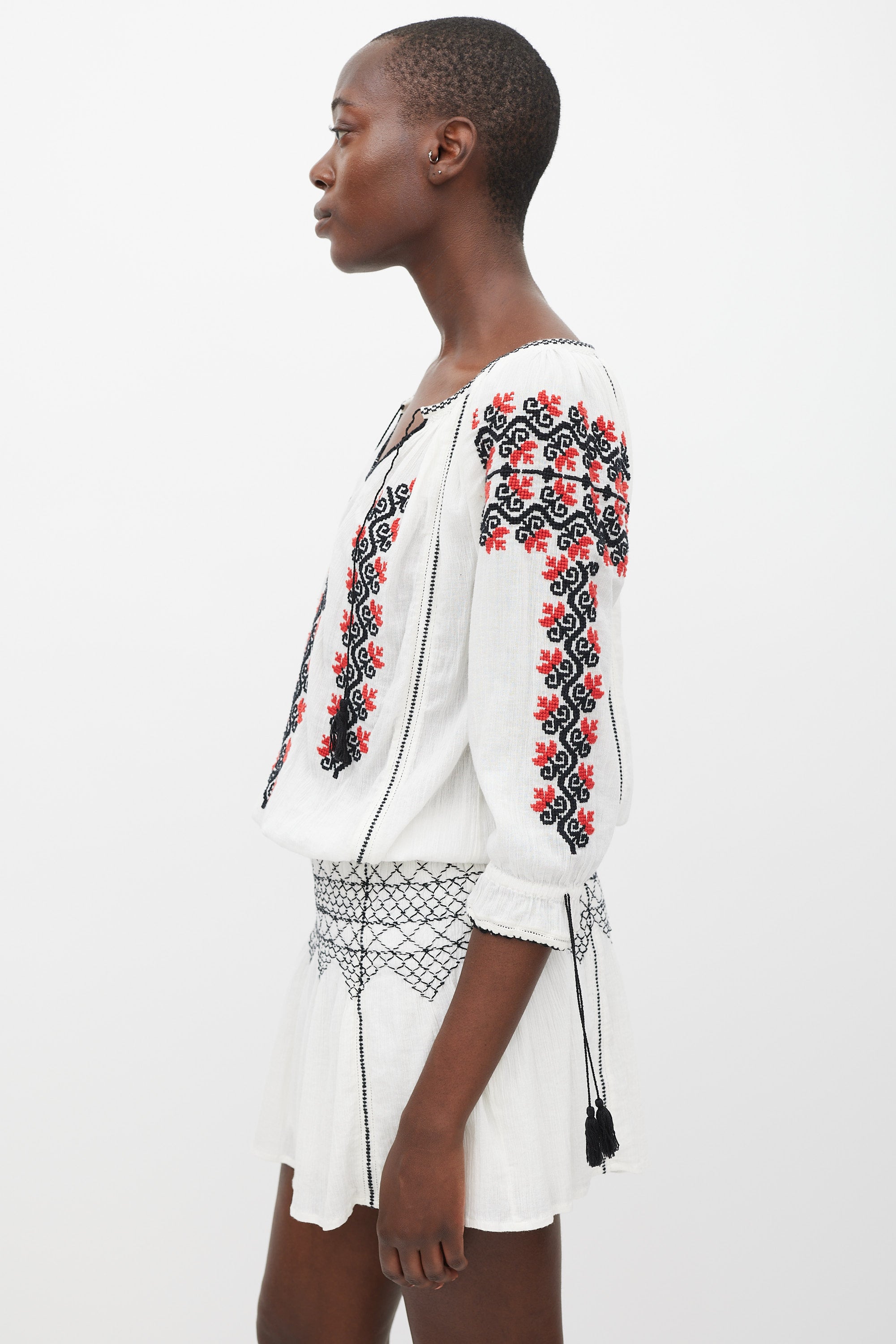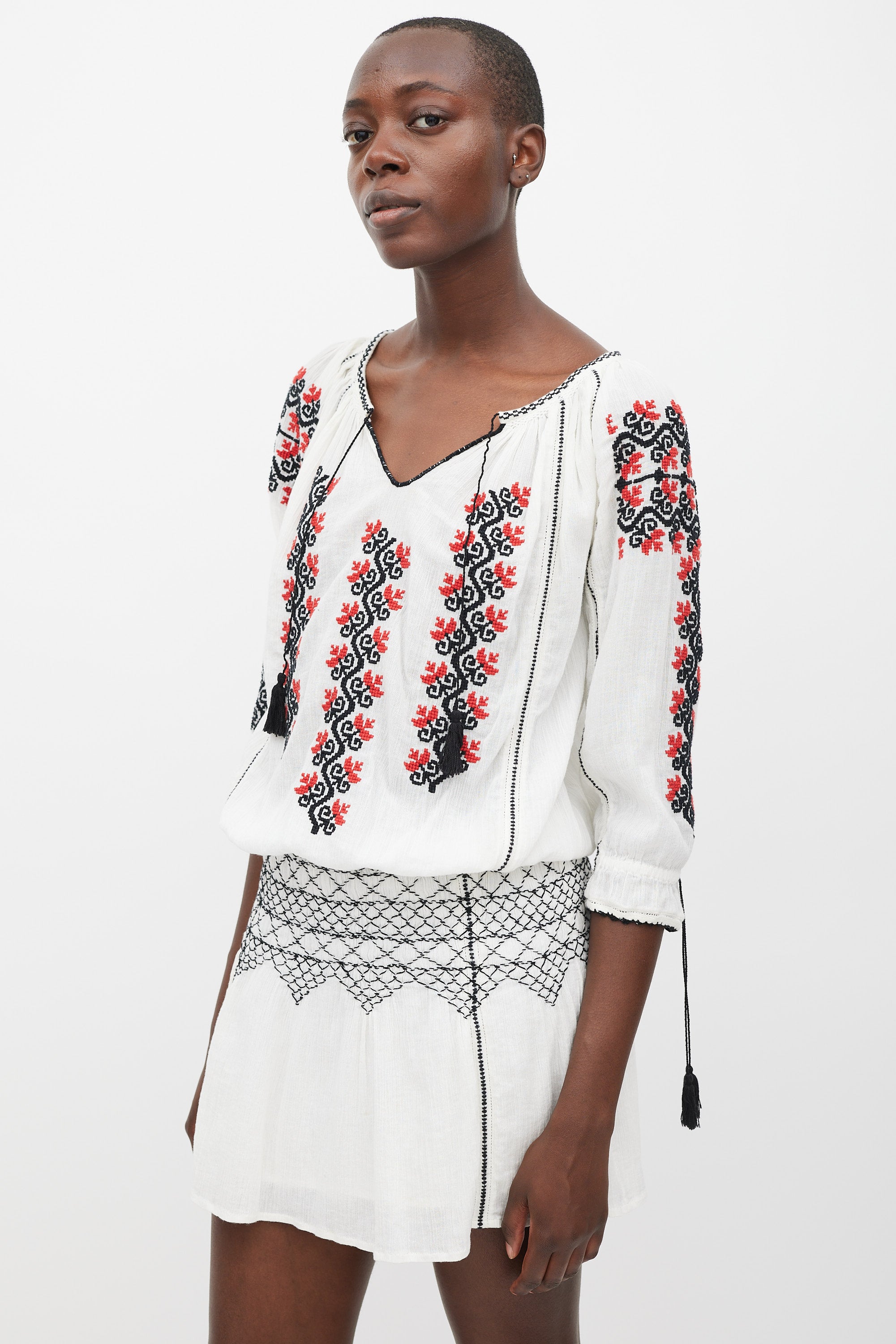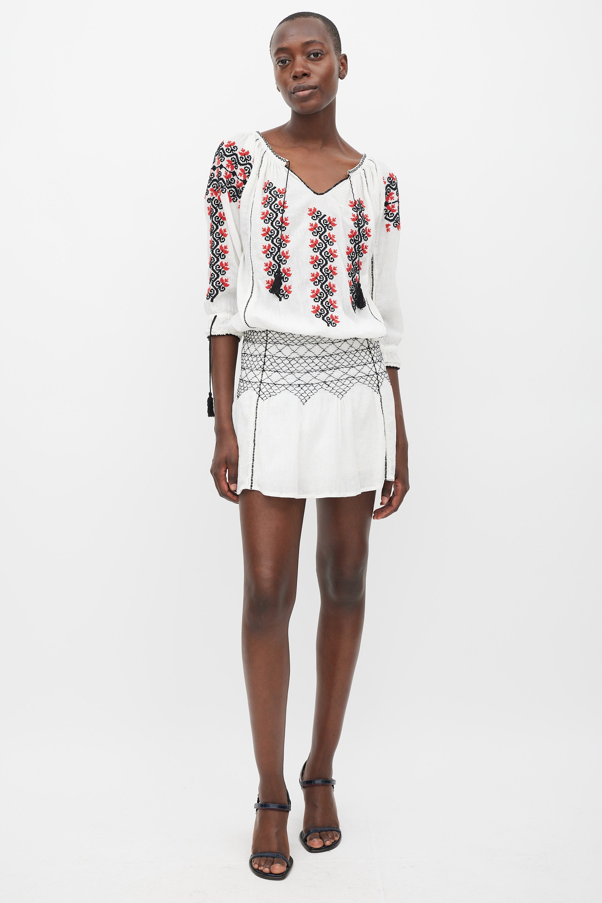 Pre-owned Ulla Johnson white Samira mini dress featuring navy and red embroidery throughout, V-neckline with tie detail, panelled construction, dropped waist, smocking at hip, and three quarter length sleeves with tie detail at cuffs. Lined.