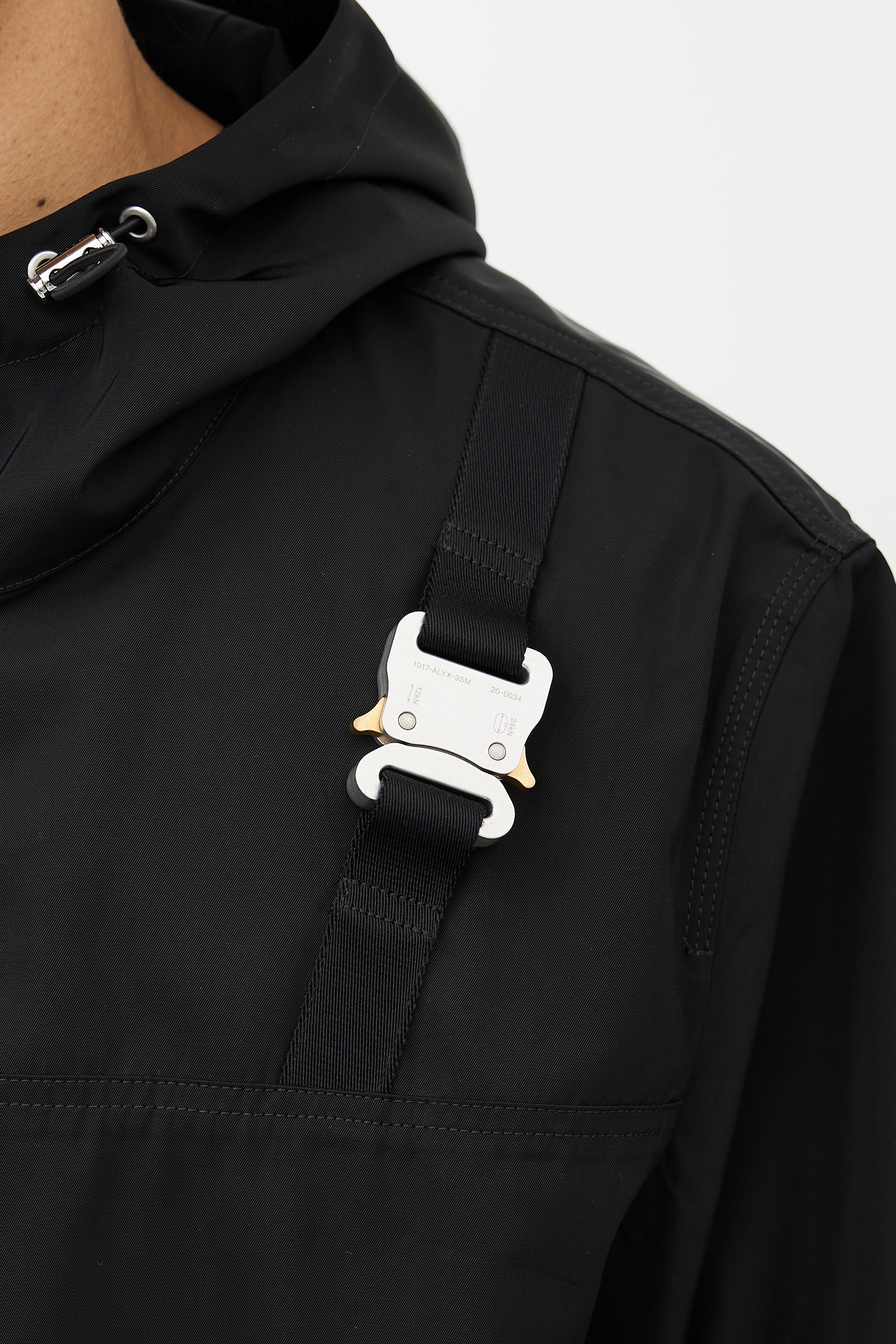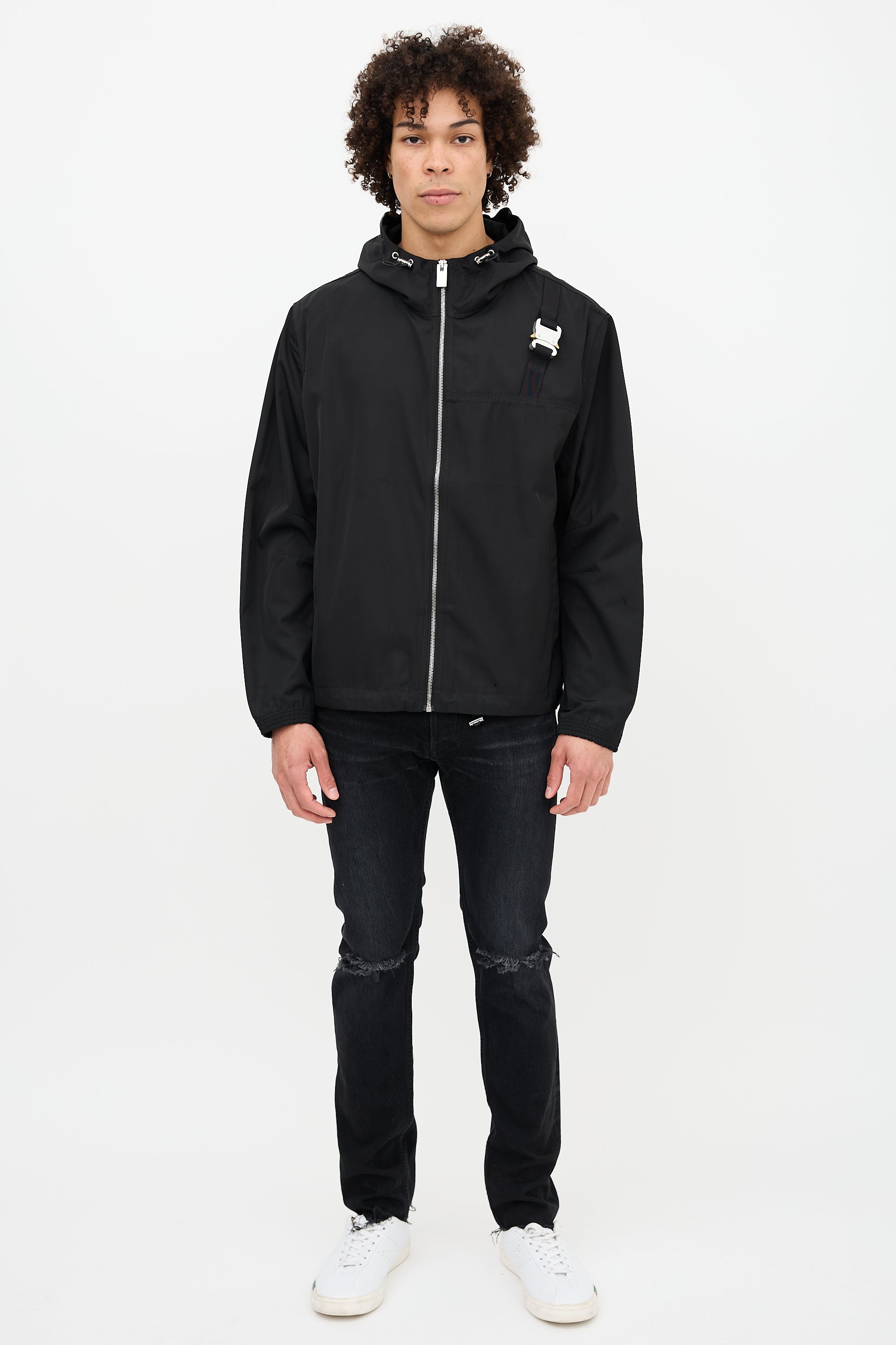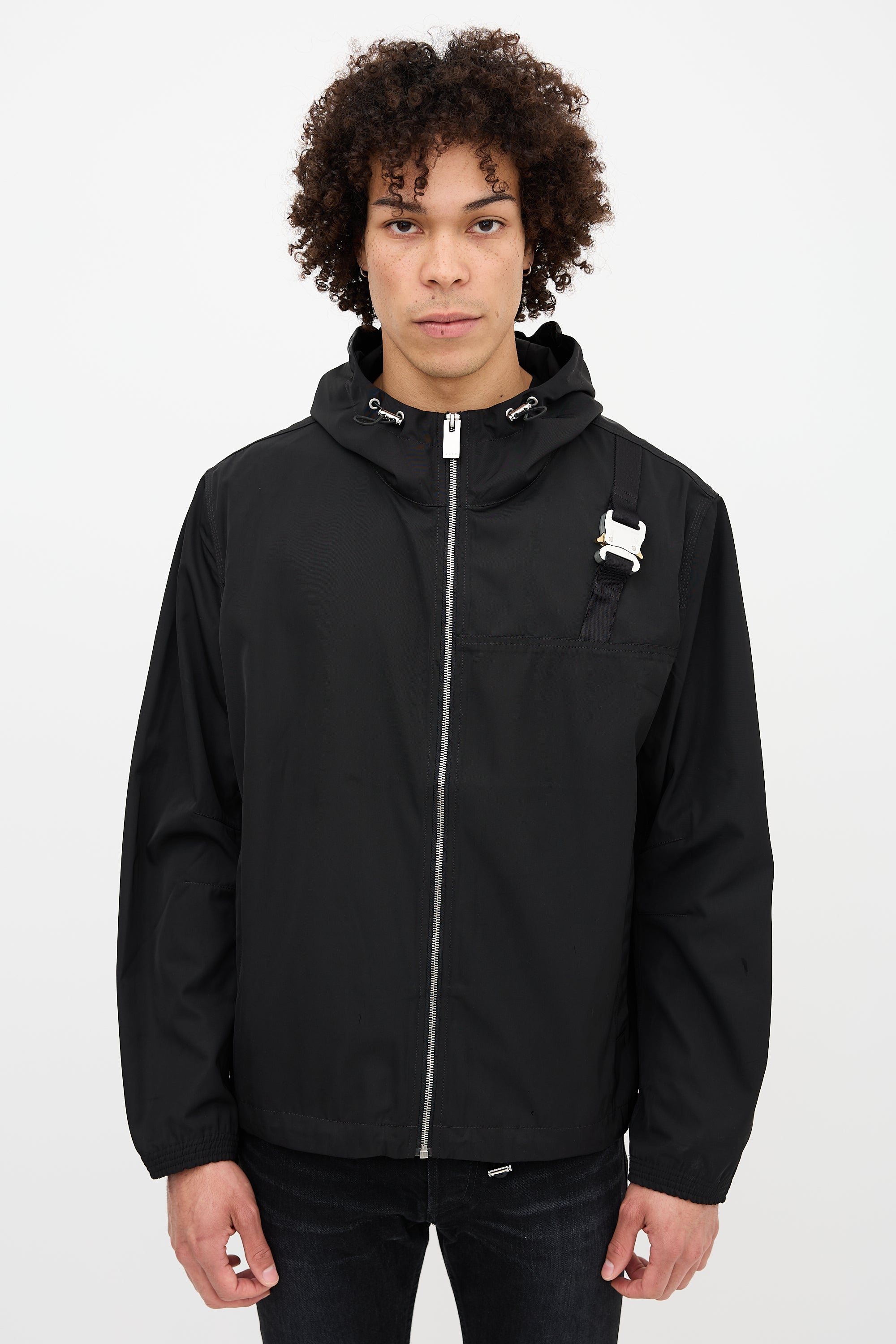 Pre-owned 1017 Alyx 9SM black windbreaker jacket featuring a cinchable hood, funnel collar, zip up front, two welt pockets at waist, silver tone hardware, signature buckle detail at chest with logo engraving, webbed logo hang tag at back collar, elasticized cuffs, and cinchable hem.