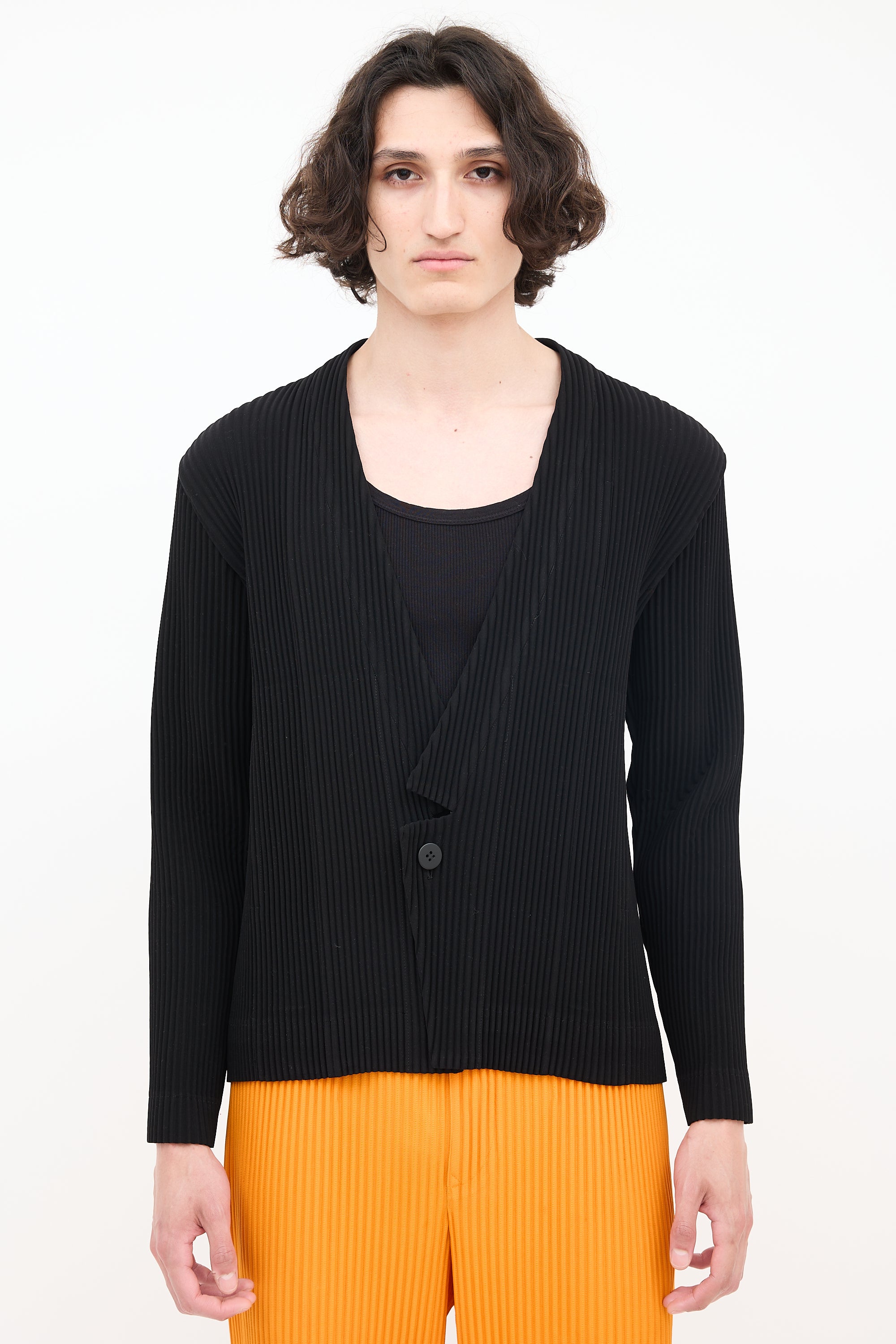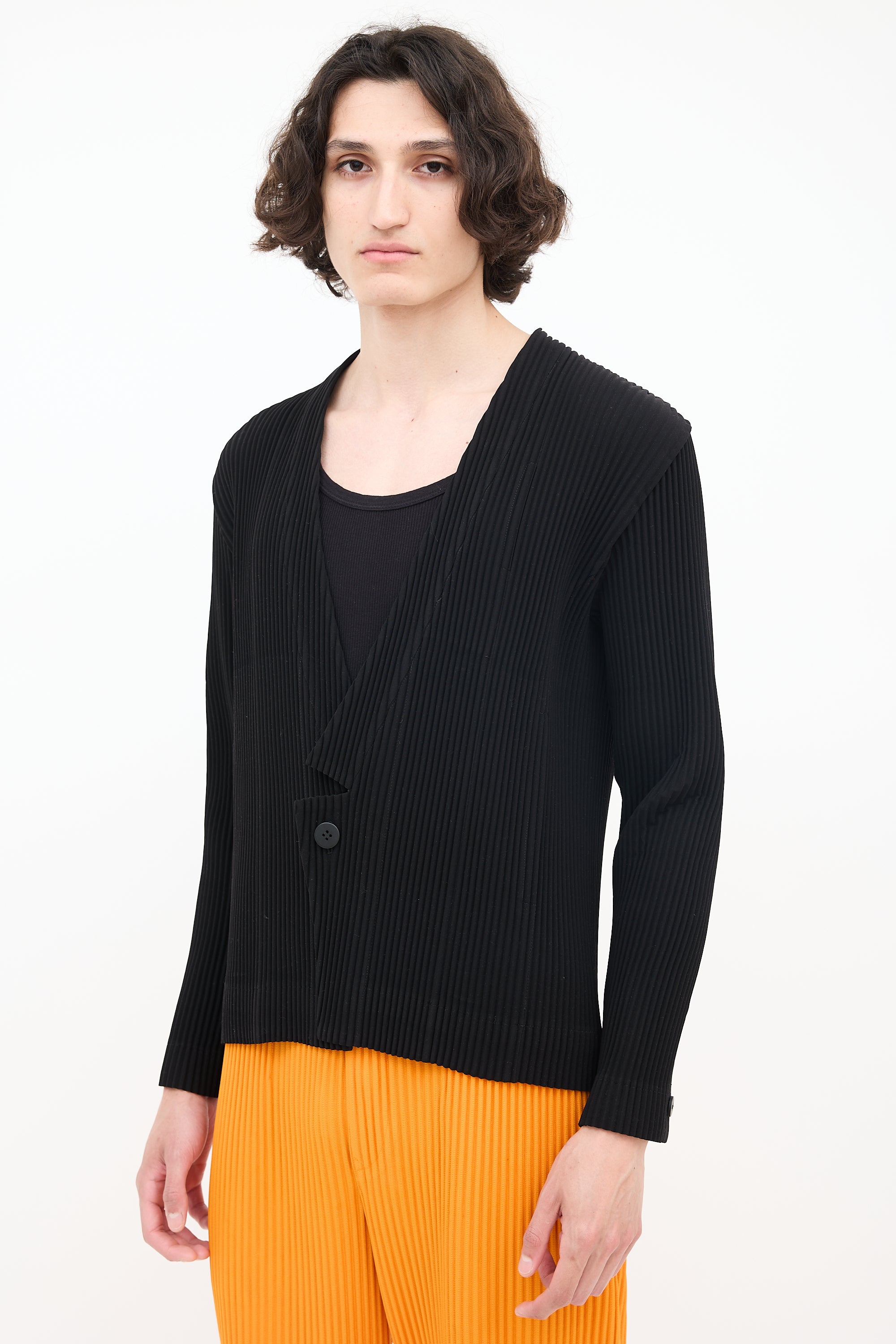 Pre-owned Homme Plissé Issey Miyake black pleated cardigan featuring notched shawl collar, button front, and two in seam pockets. Lined.