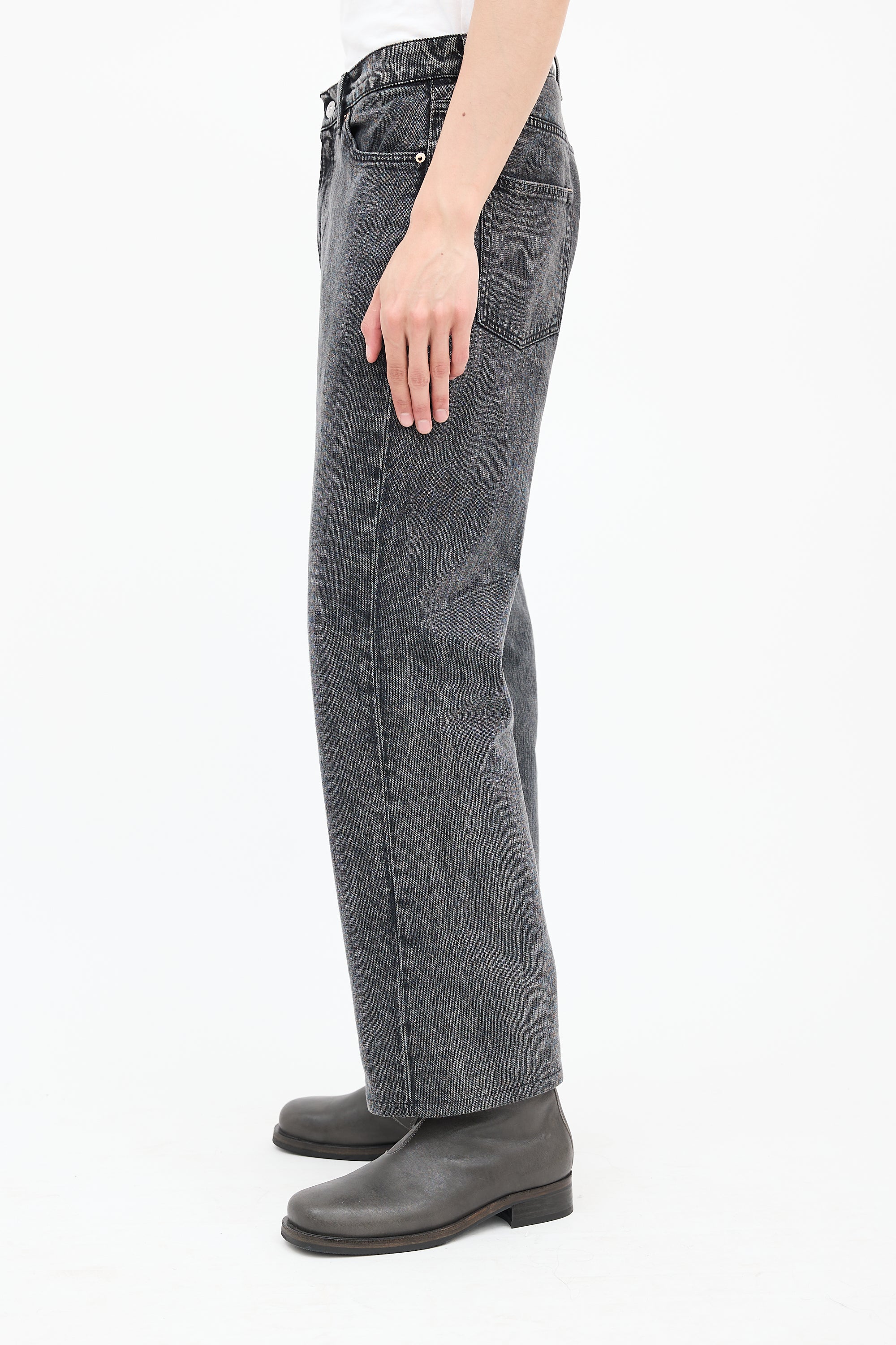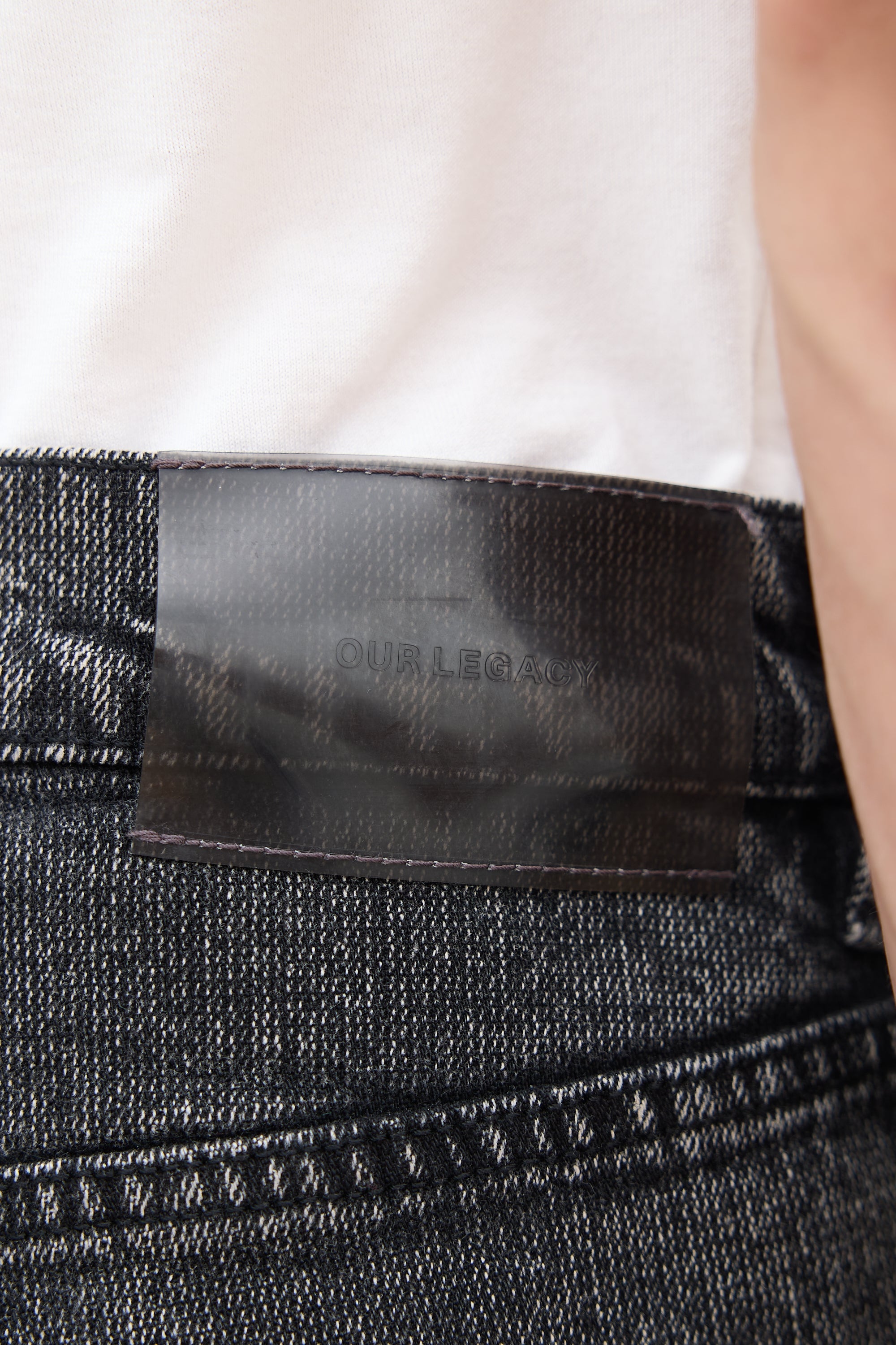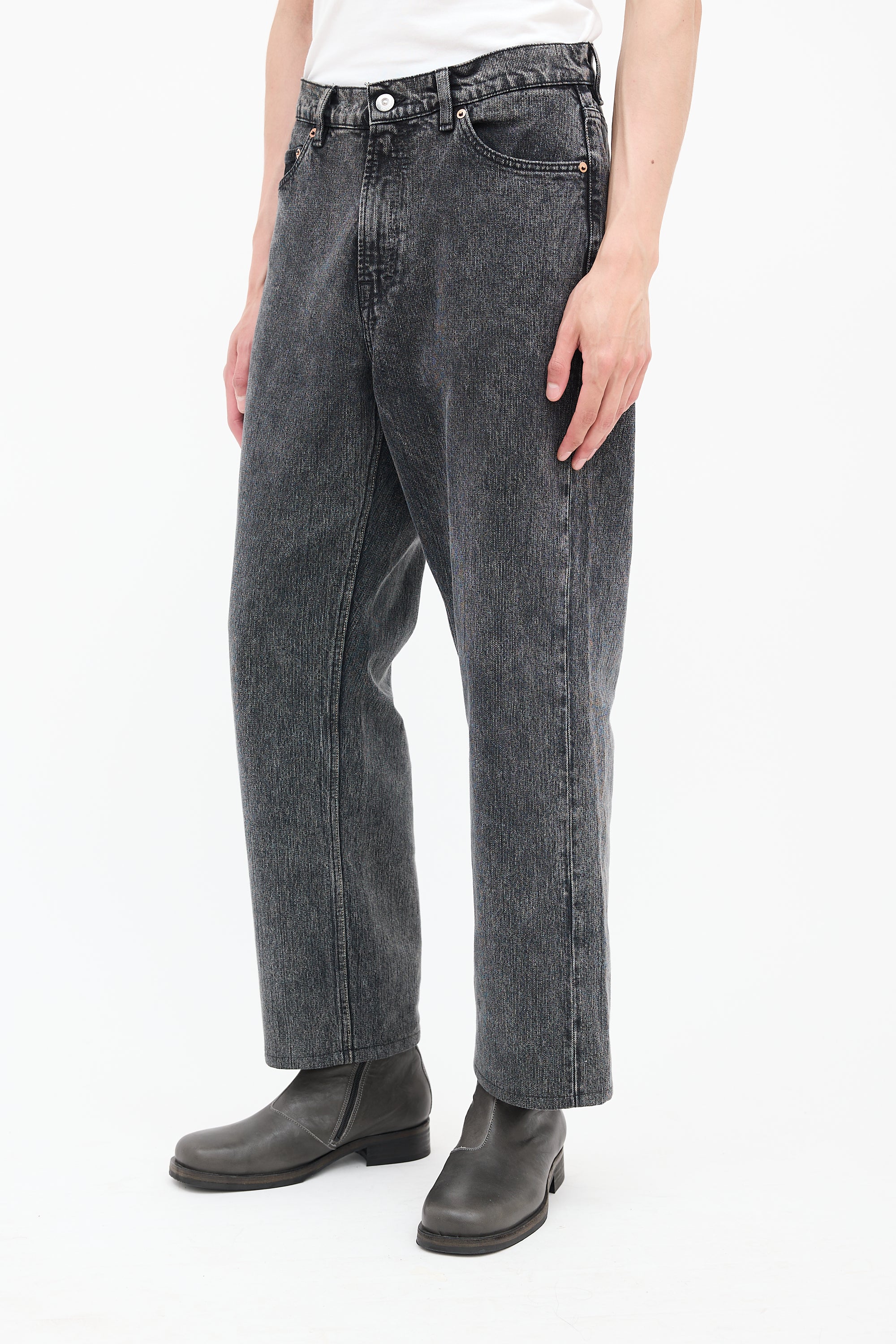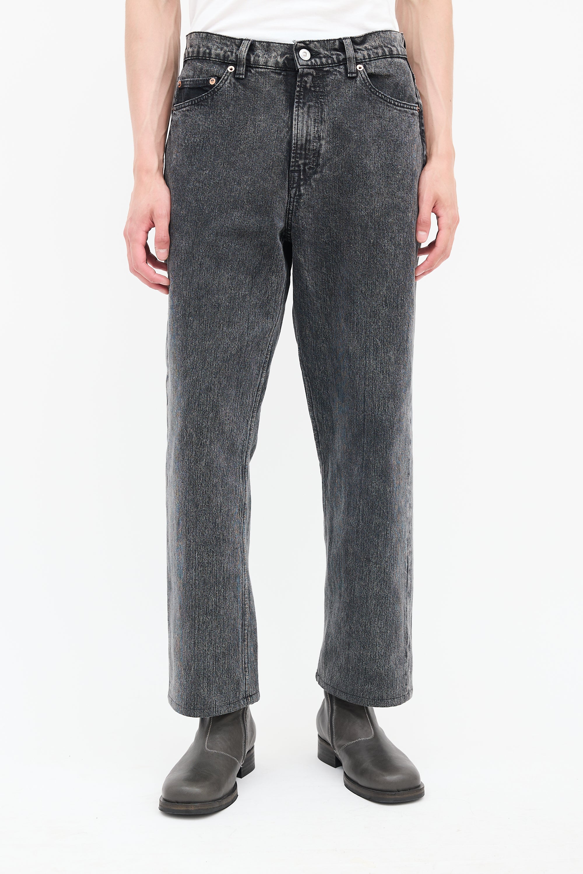 Pre-owned Our Legacy washed black textured jeans featuring zip fly, five pocket styling, black vinyl Jacron, and straight leg.