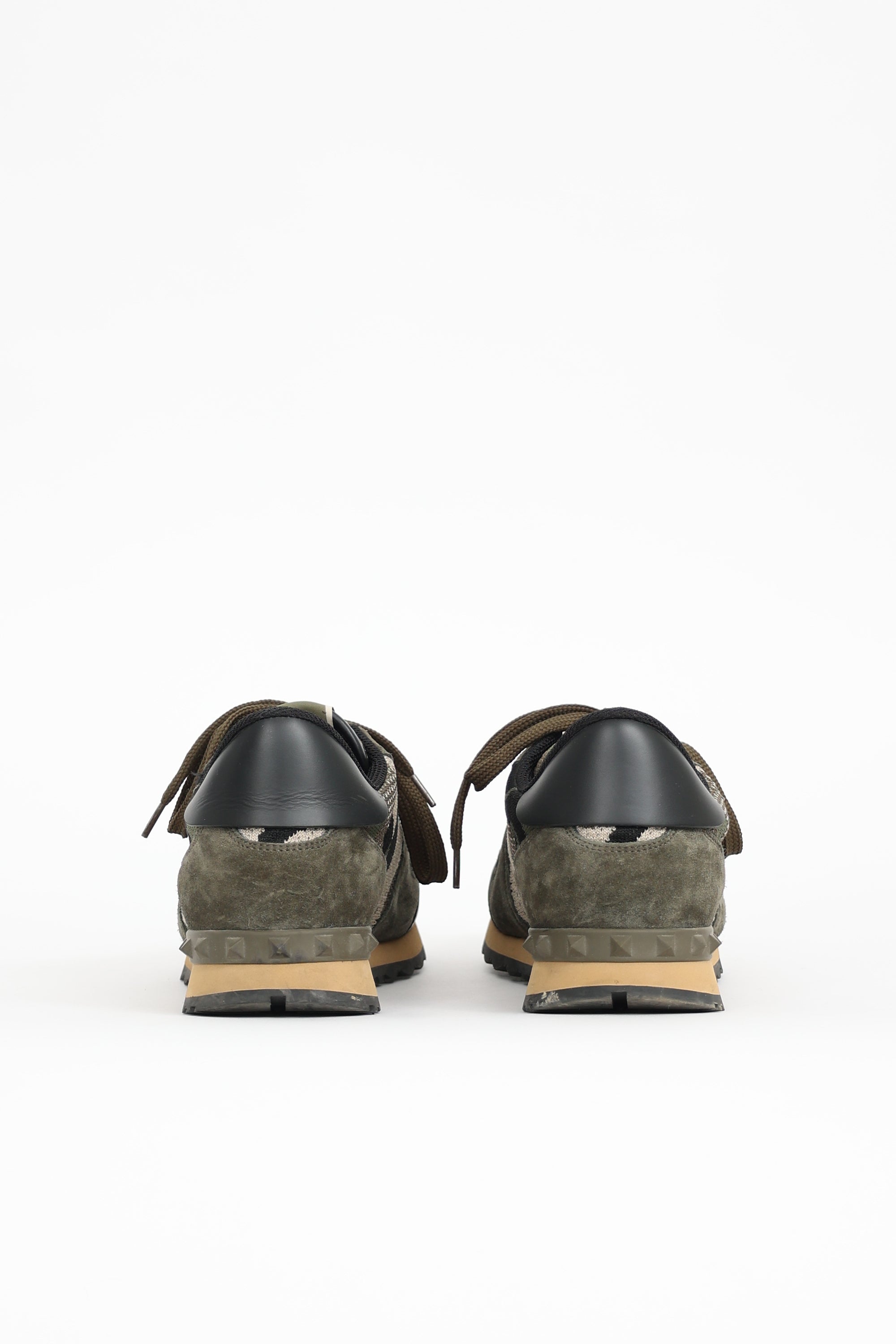 Pre-owned Valentino green camo Rockrunner sneakers featuring rounded toe, mixed mesh and suede upper, lace up front, and tonal rubber Rockstud trim at back. Includes original dust bag.