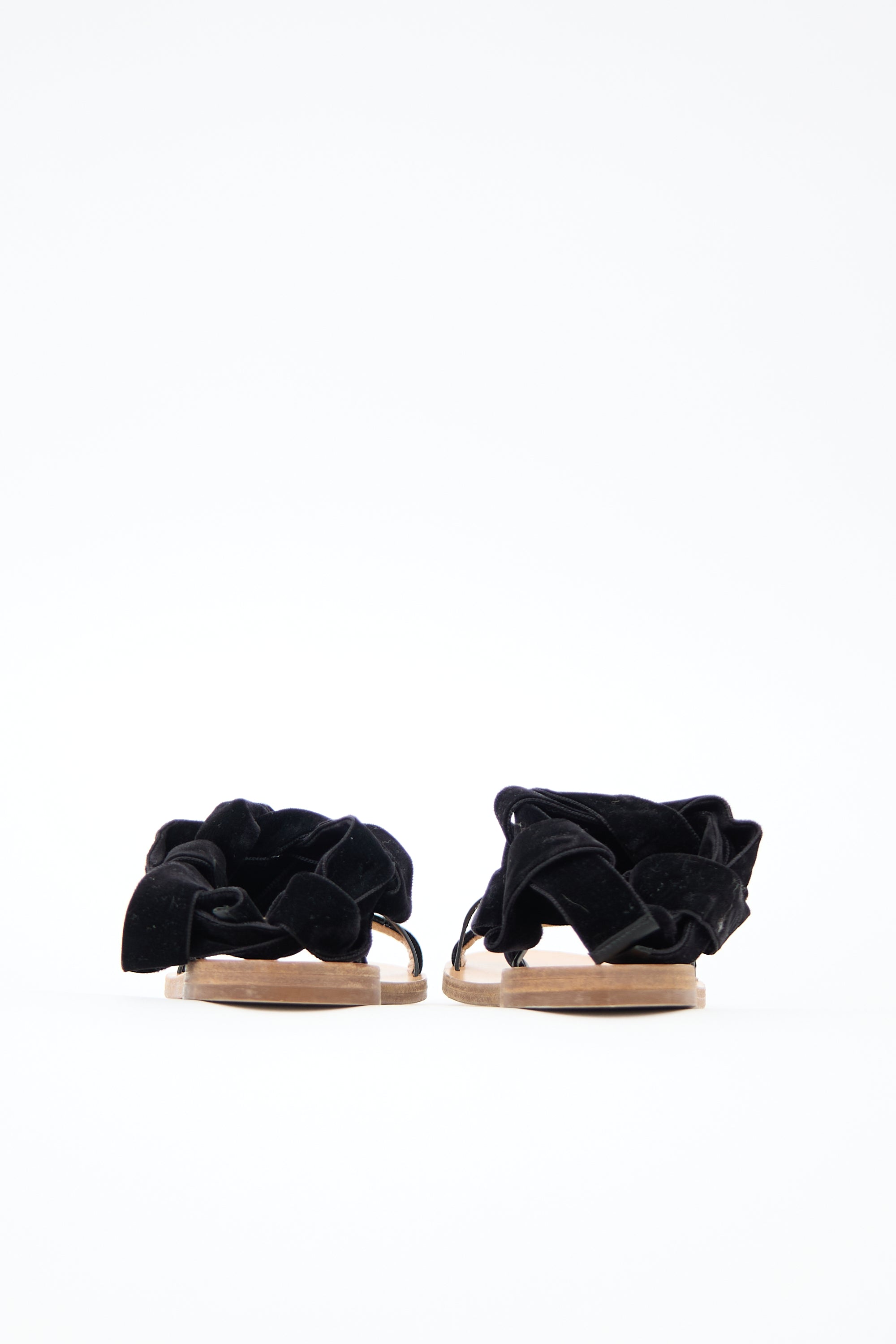 Pre-owned Valentino black velvet and leather sandals featuring rounded toe, thin criss cross instep, black velvet wraparound ankle tie, and leather insole and outsole.