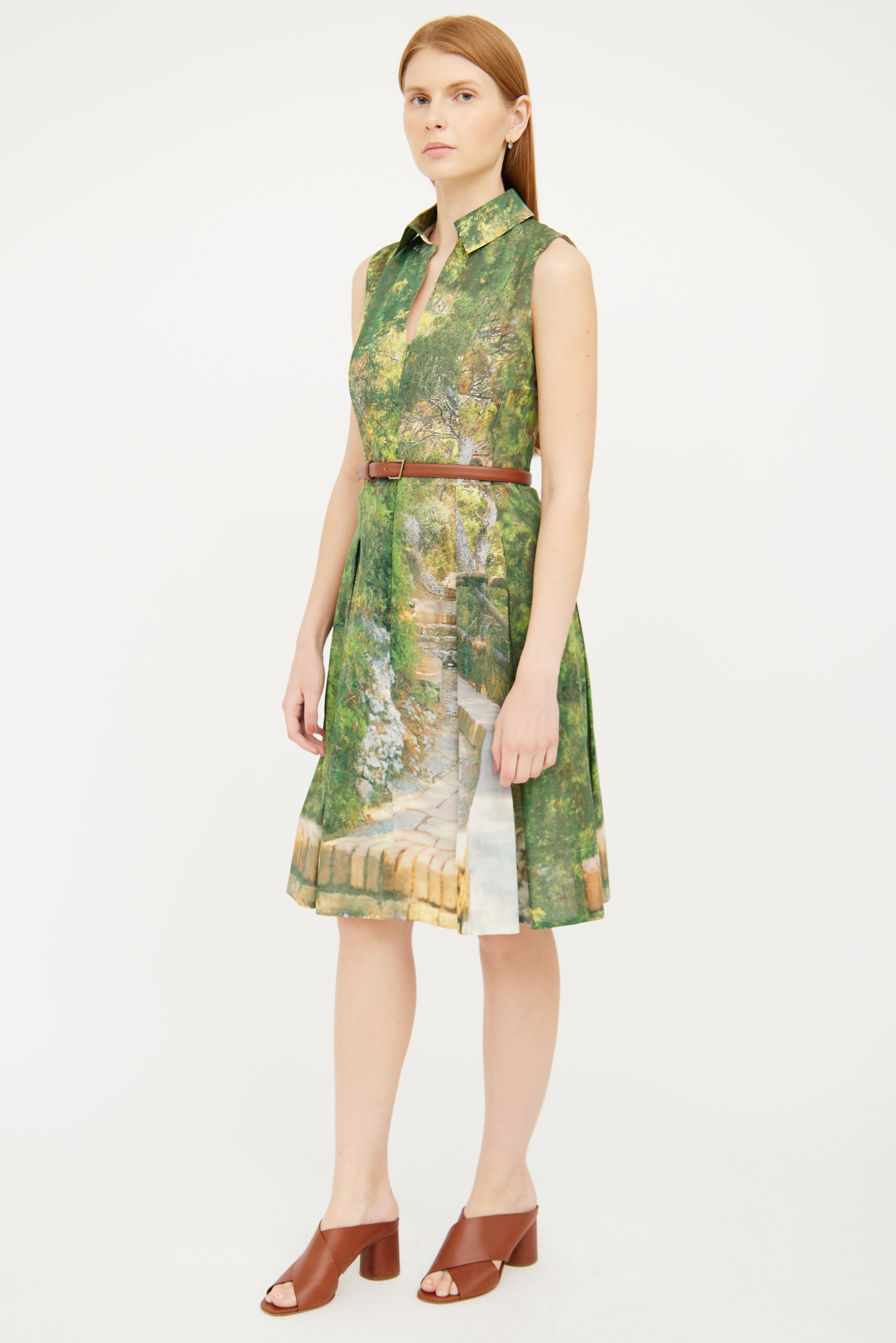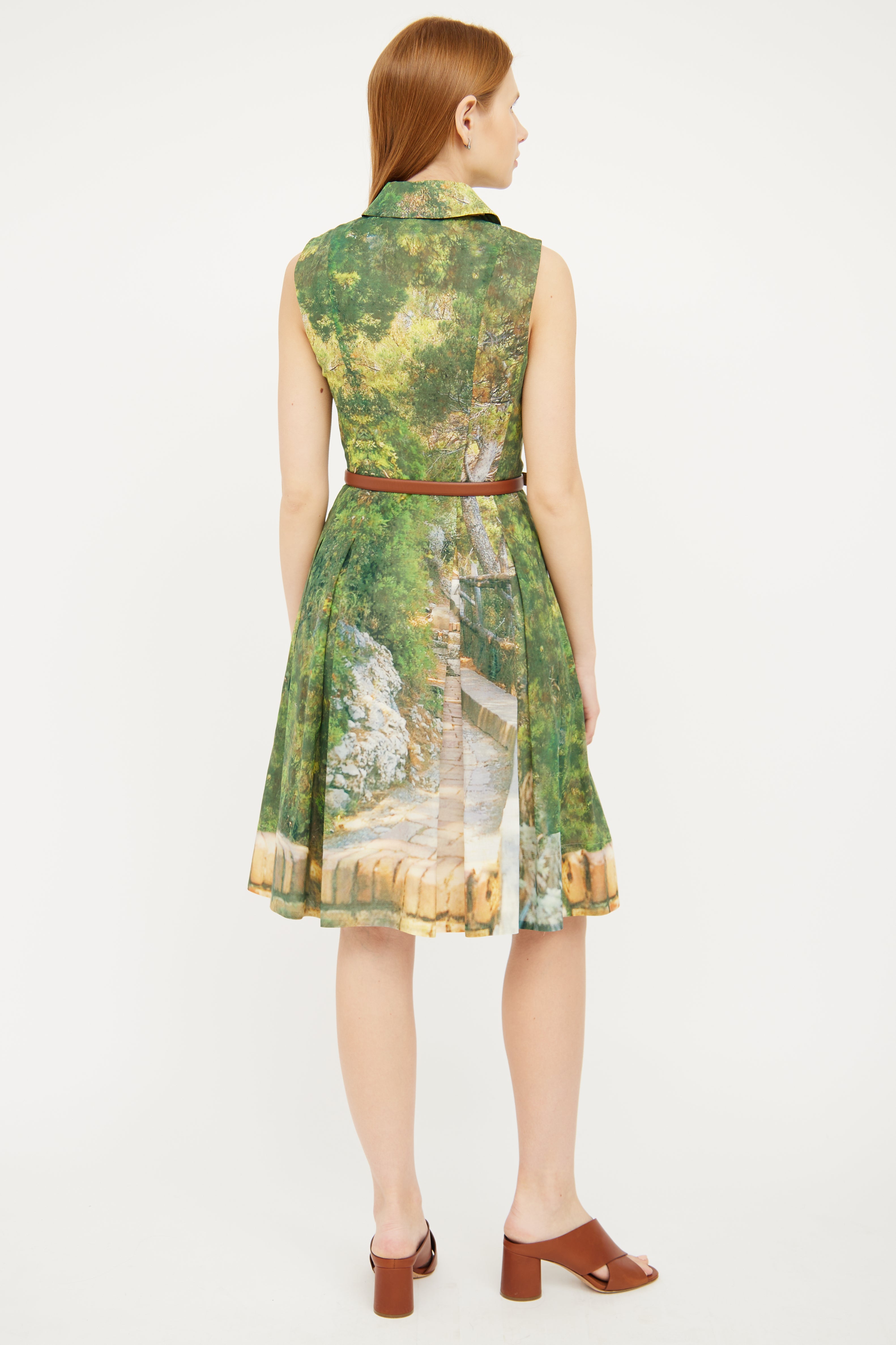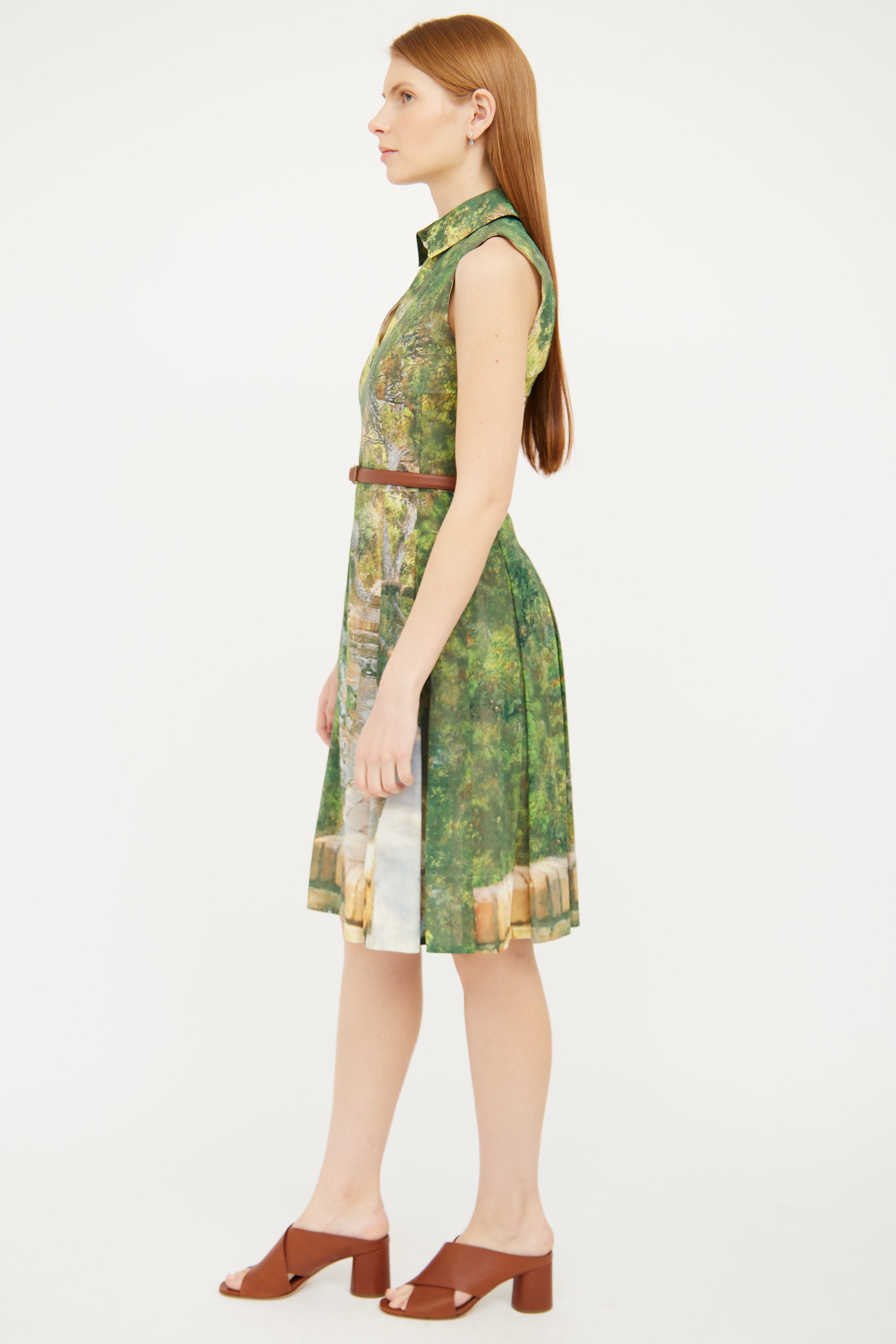 Pre-owned Akris green sleeveless dress featuring detachable pointed collar, V-neckline, concealed front zip closure, side slip pockets, structured boning at upper sides, detachable brown leather belt, pleated and flared skirt and nature motif throughout. Lined.