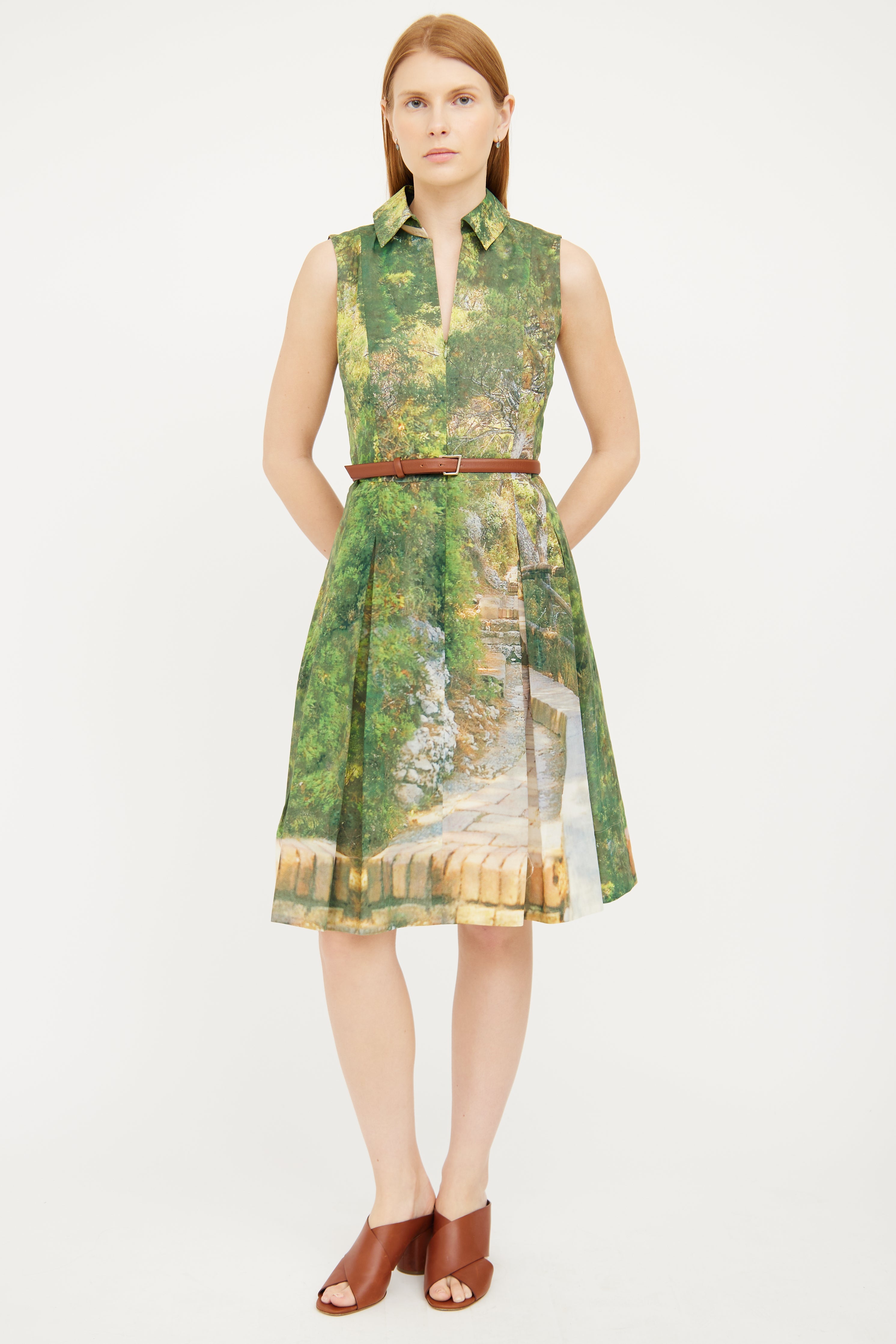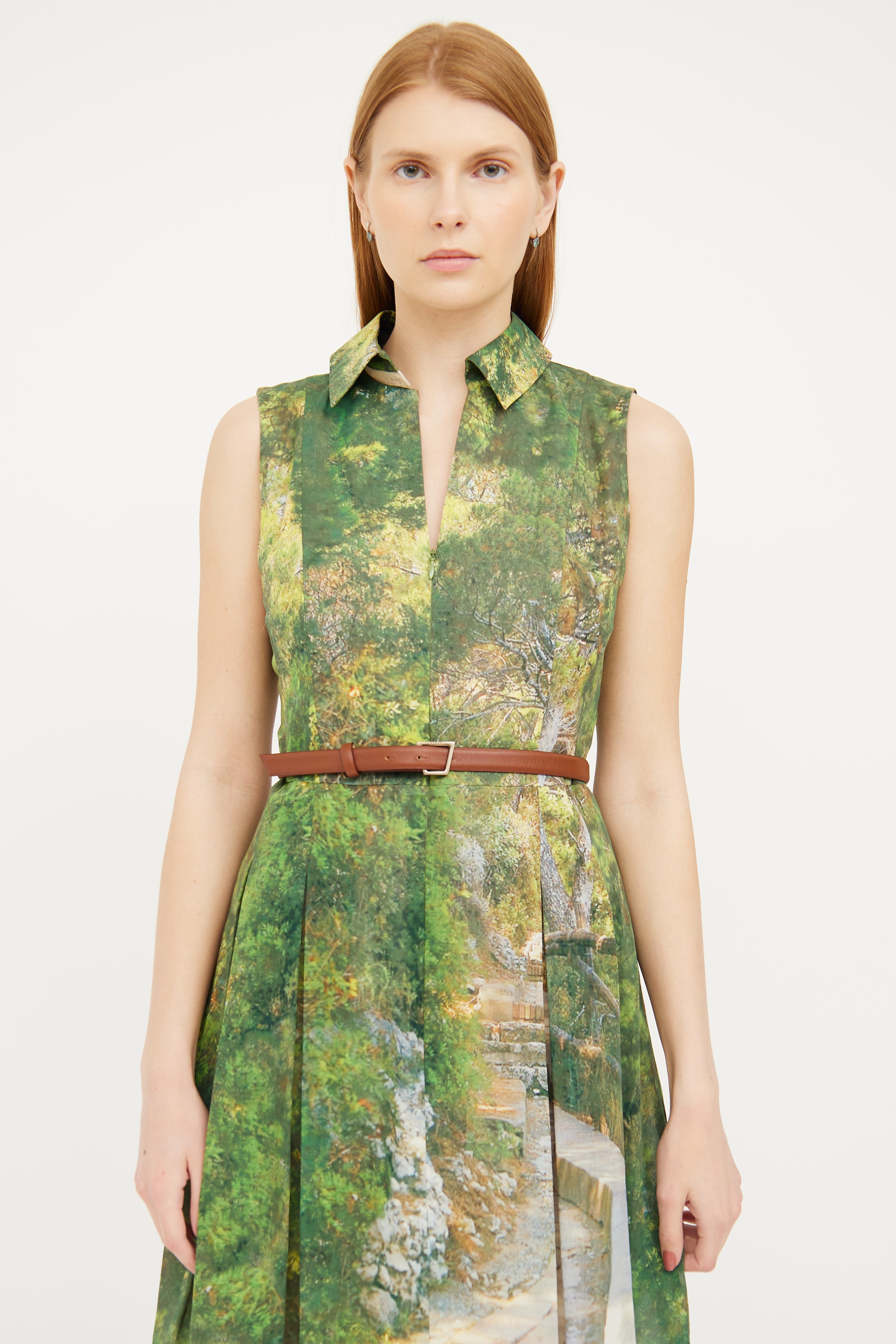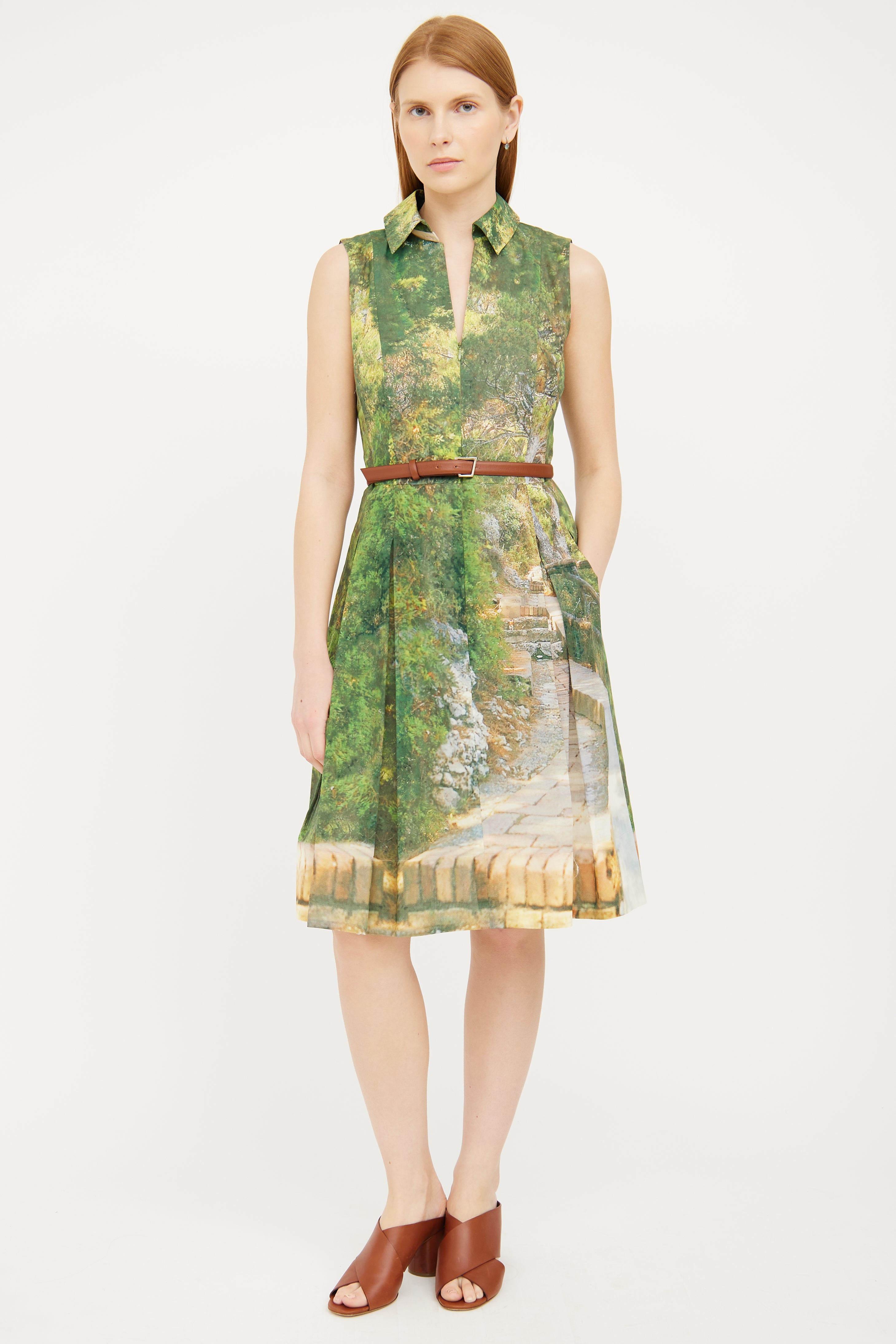 Pre-owned Akris green sleeveless dress featuring detachable pointed collar, V-neckline, concealed front zip closure, side slip pockets, structured boning at upper sides, detachable brown leather belt, pleated and flared skirt and nature motif throughout. Lined.