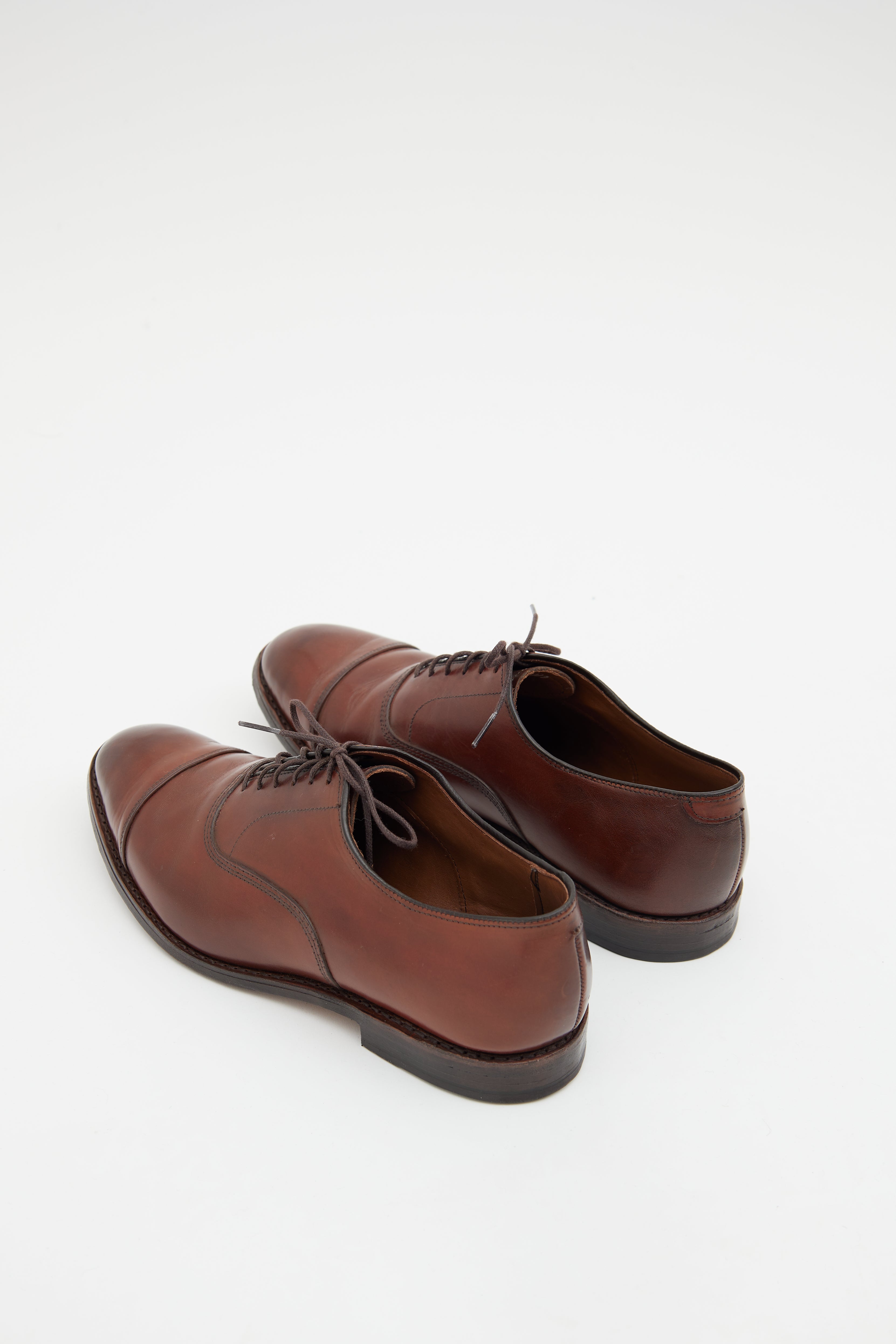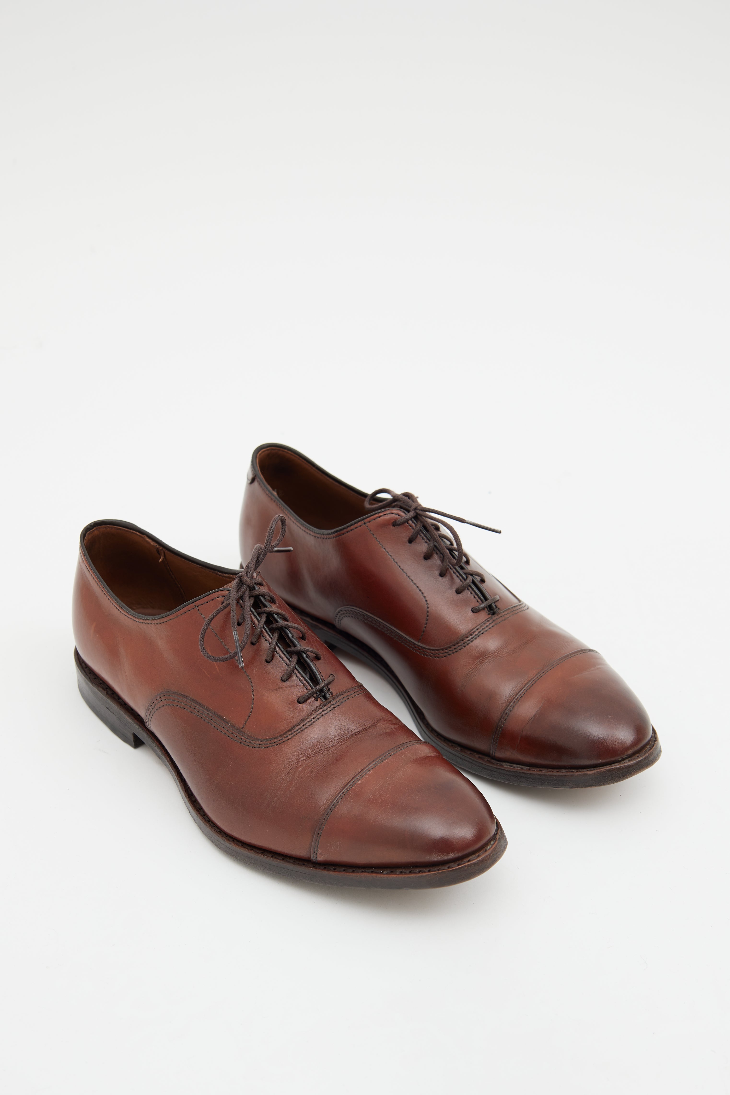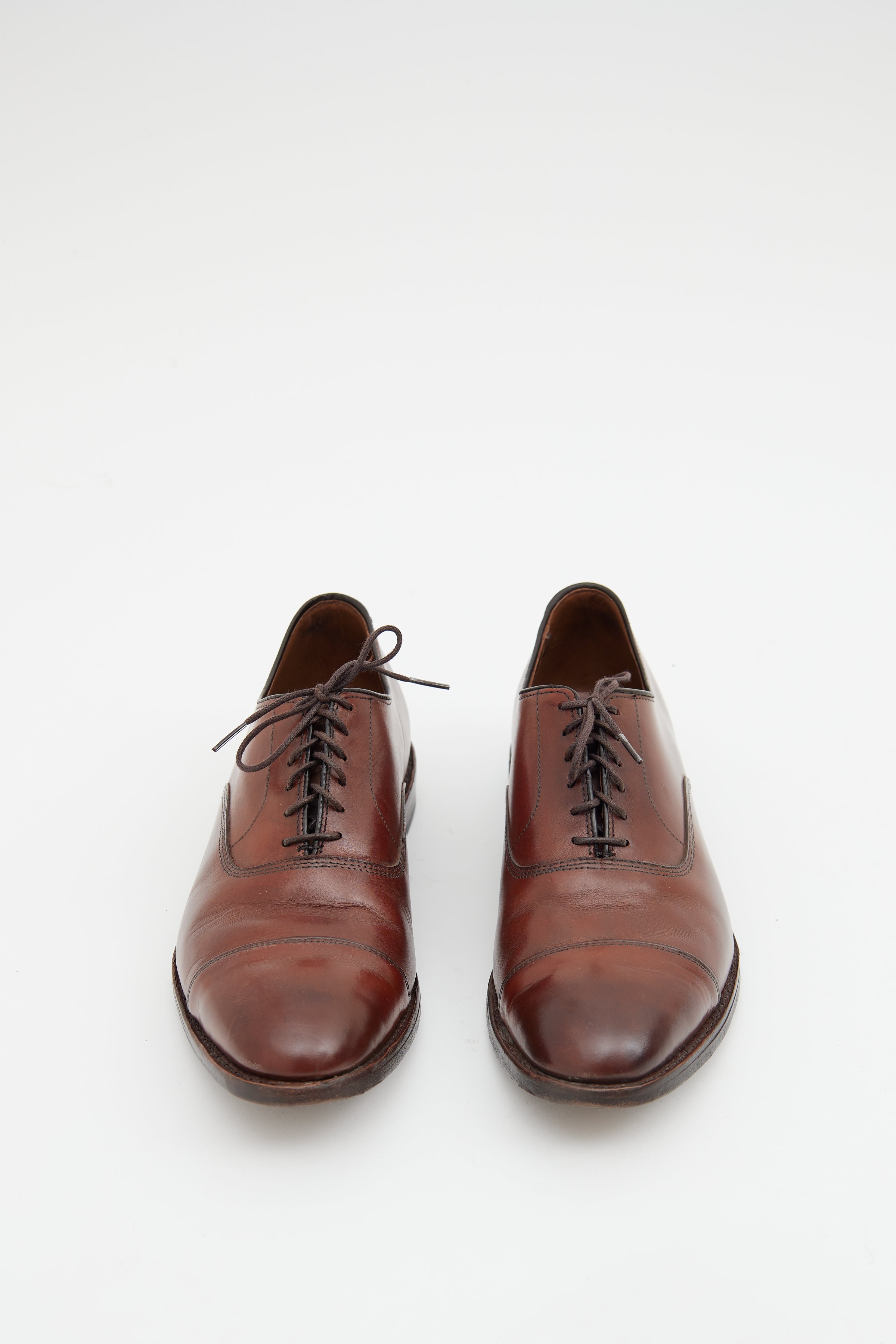 Pre-owned Allen Edmonds brown leather oxfords featuring round toe, lace up and stacked heel.