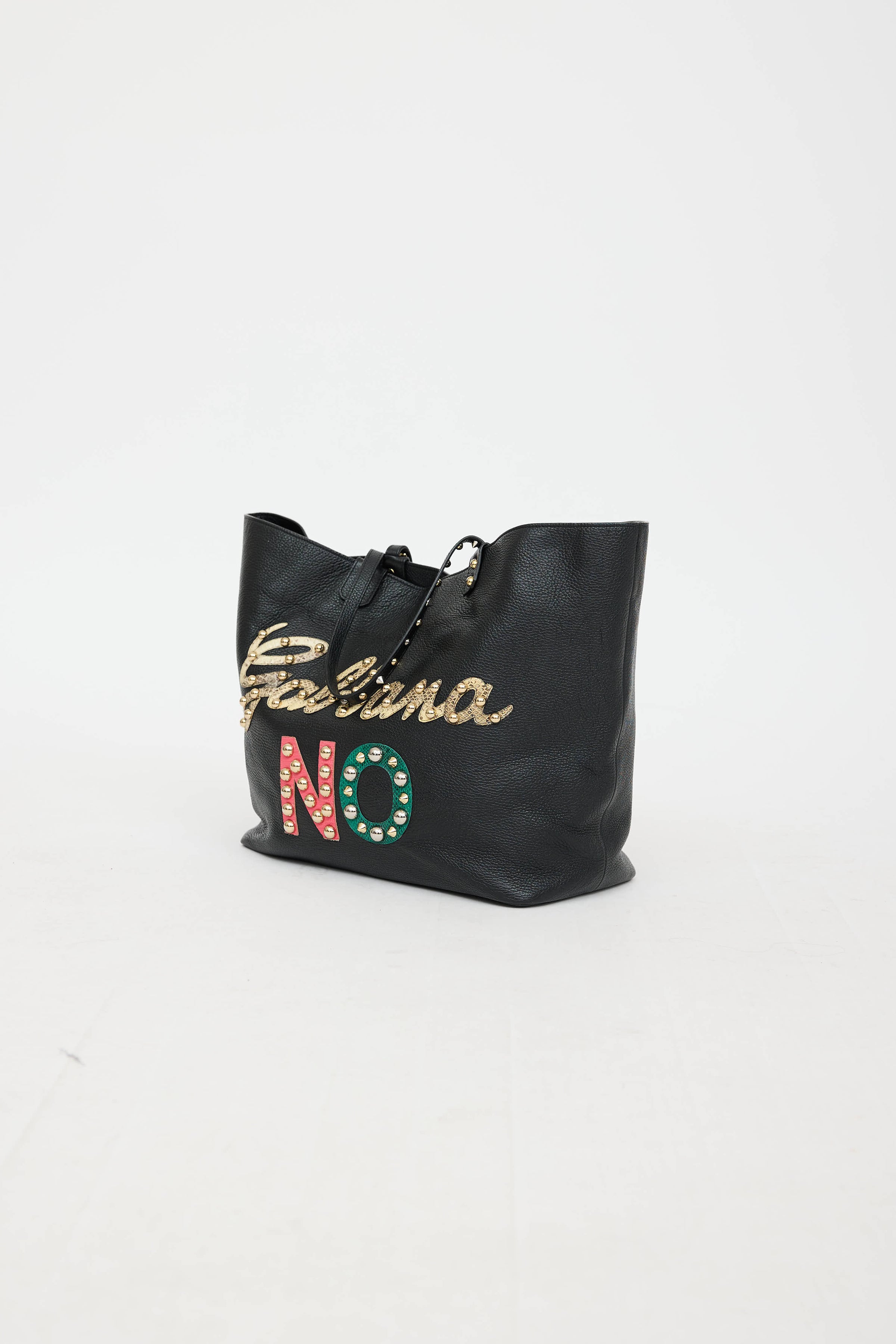 Pre-owned Dolce & Gabbana black Beatrice leather tote bag featuring multicolour patched logo studding at front and back, two flat studded shoulder straps, one main compartment with two slip pockets and one zip pocket, and magnetic top snap closure.