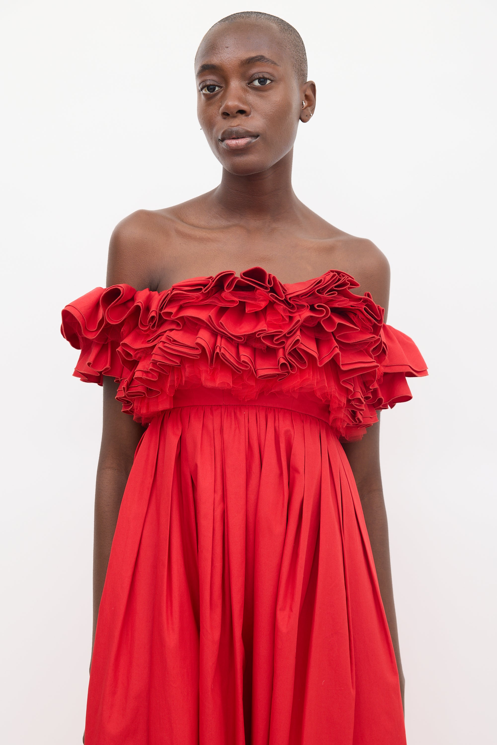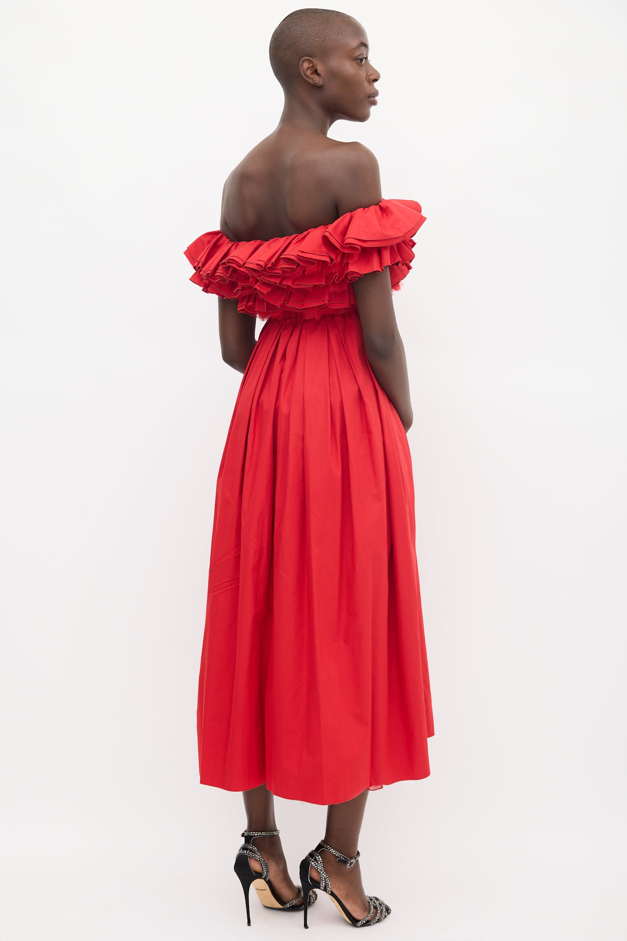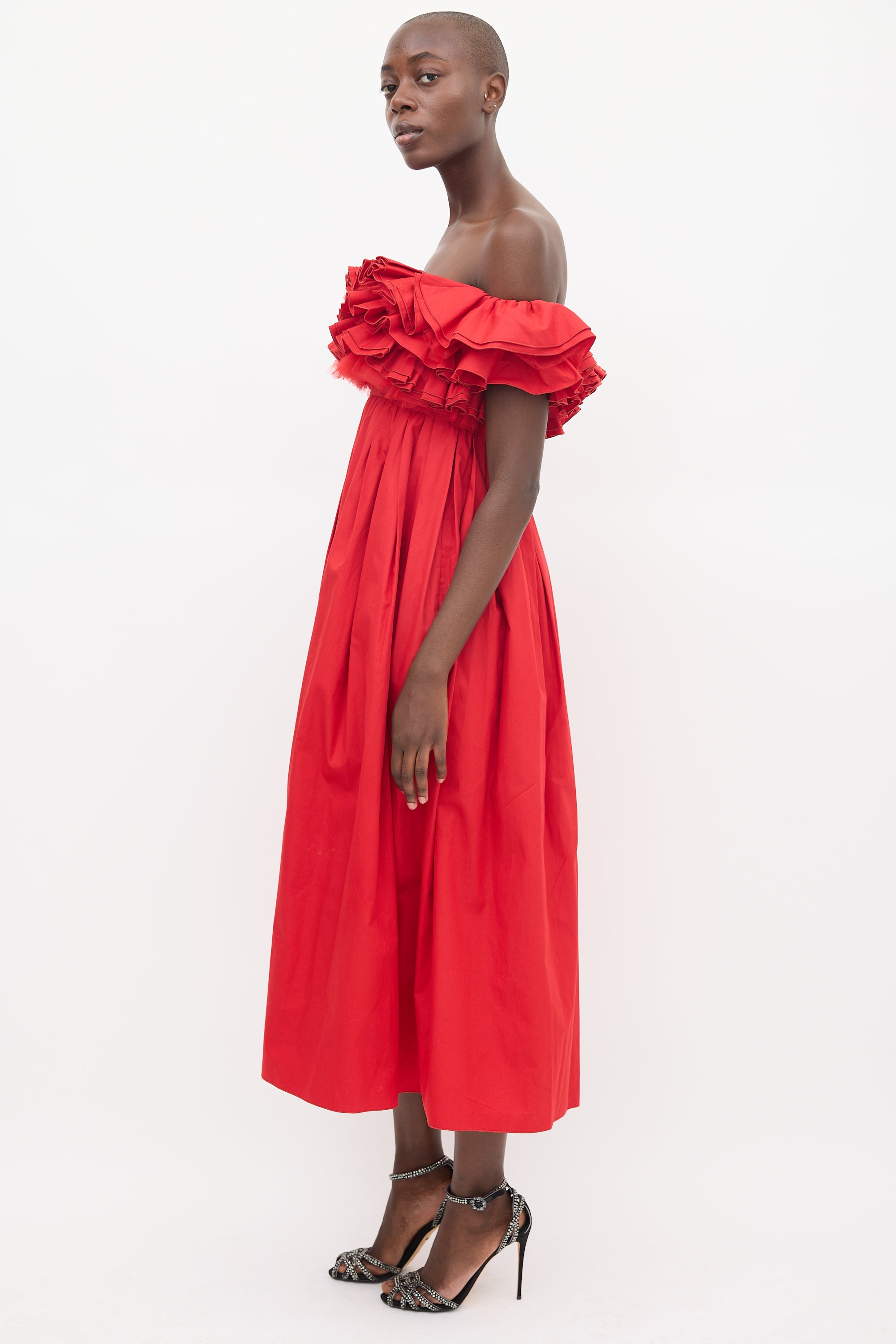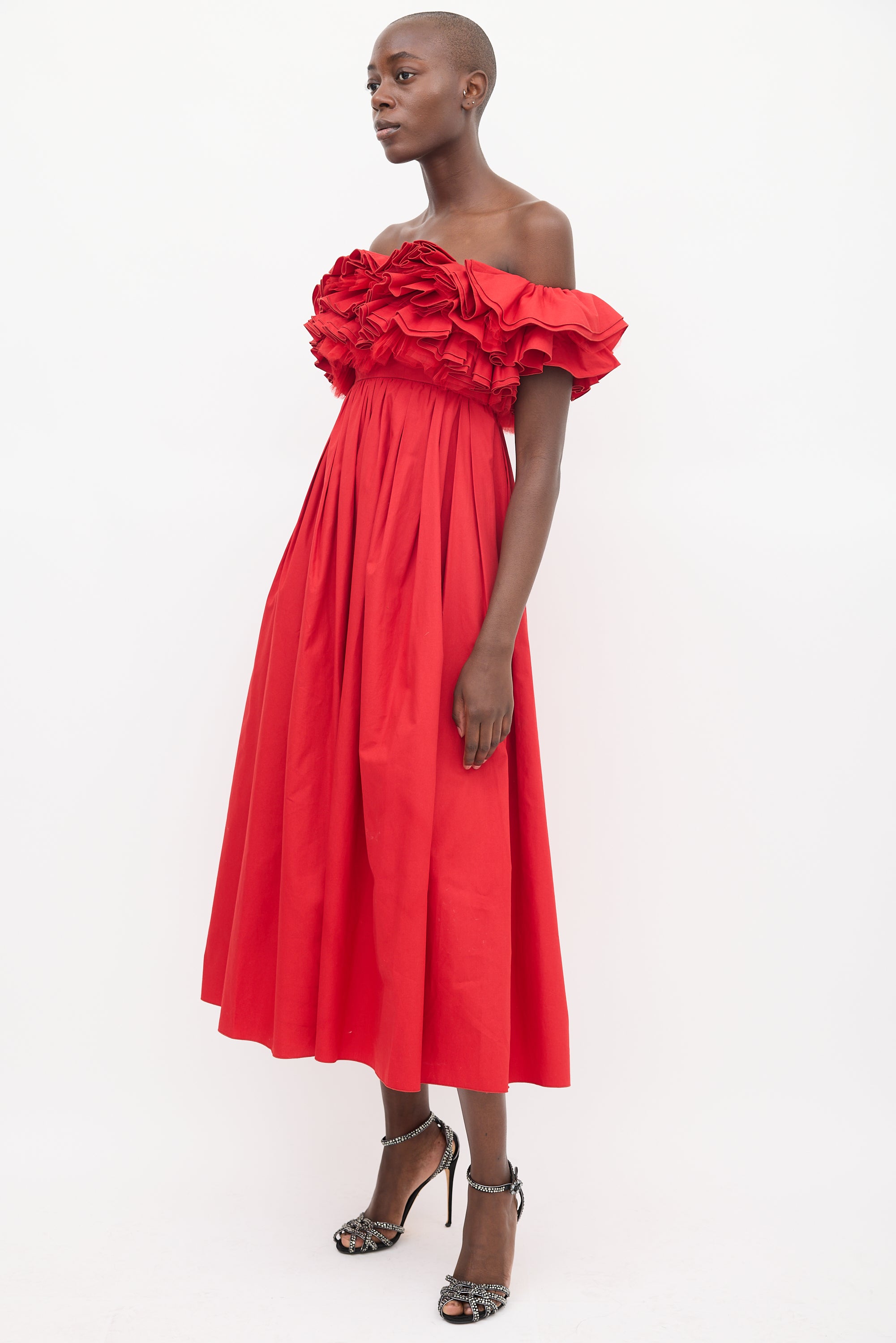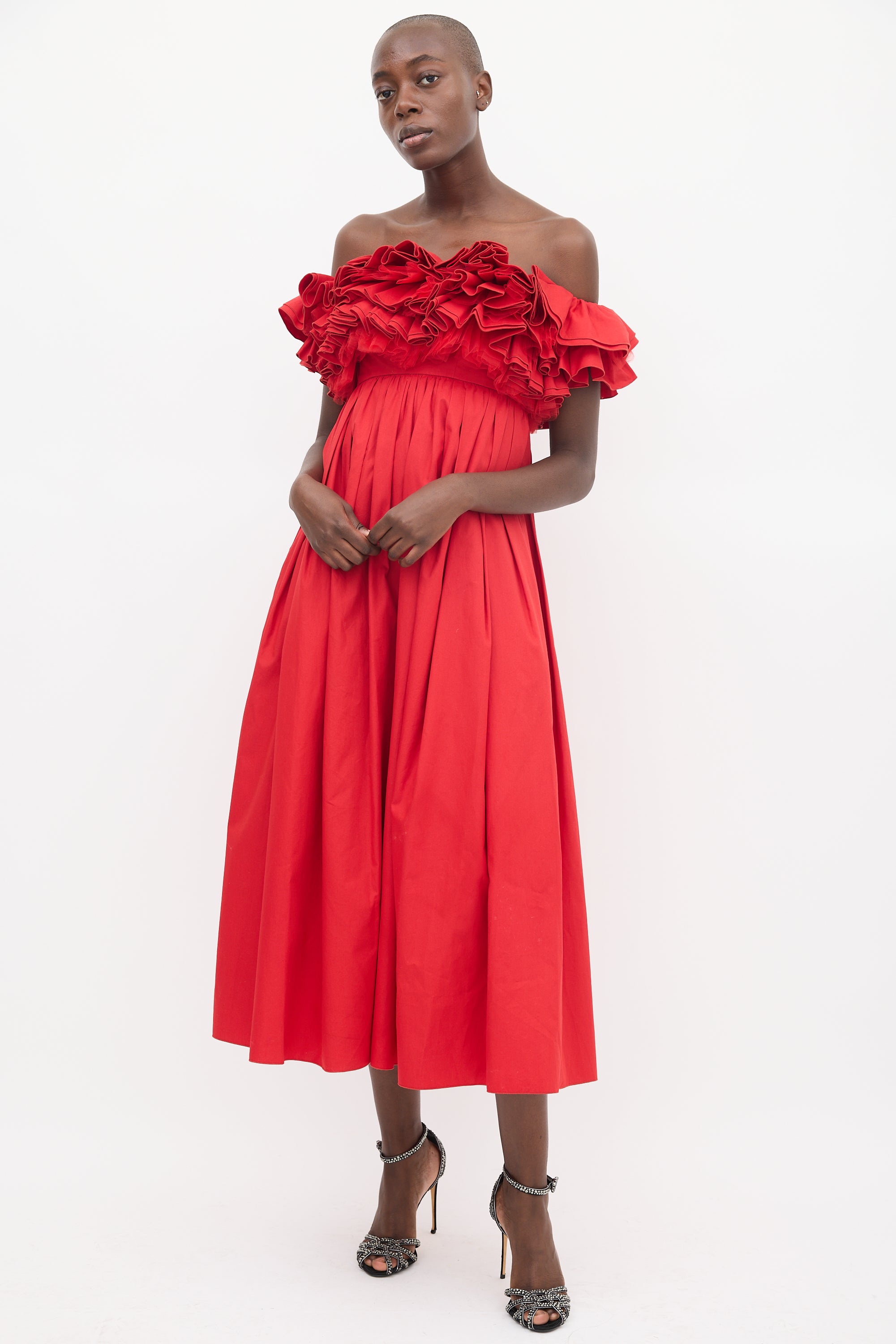 Pre-owned Giambattista Valli red midi dress featuring an off shoulder layered ruffled neckline, sleeveless styling, structured bust, pleated skirt, and zip at back with button closure. Lined.