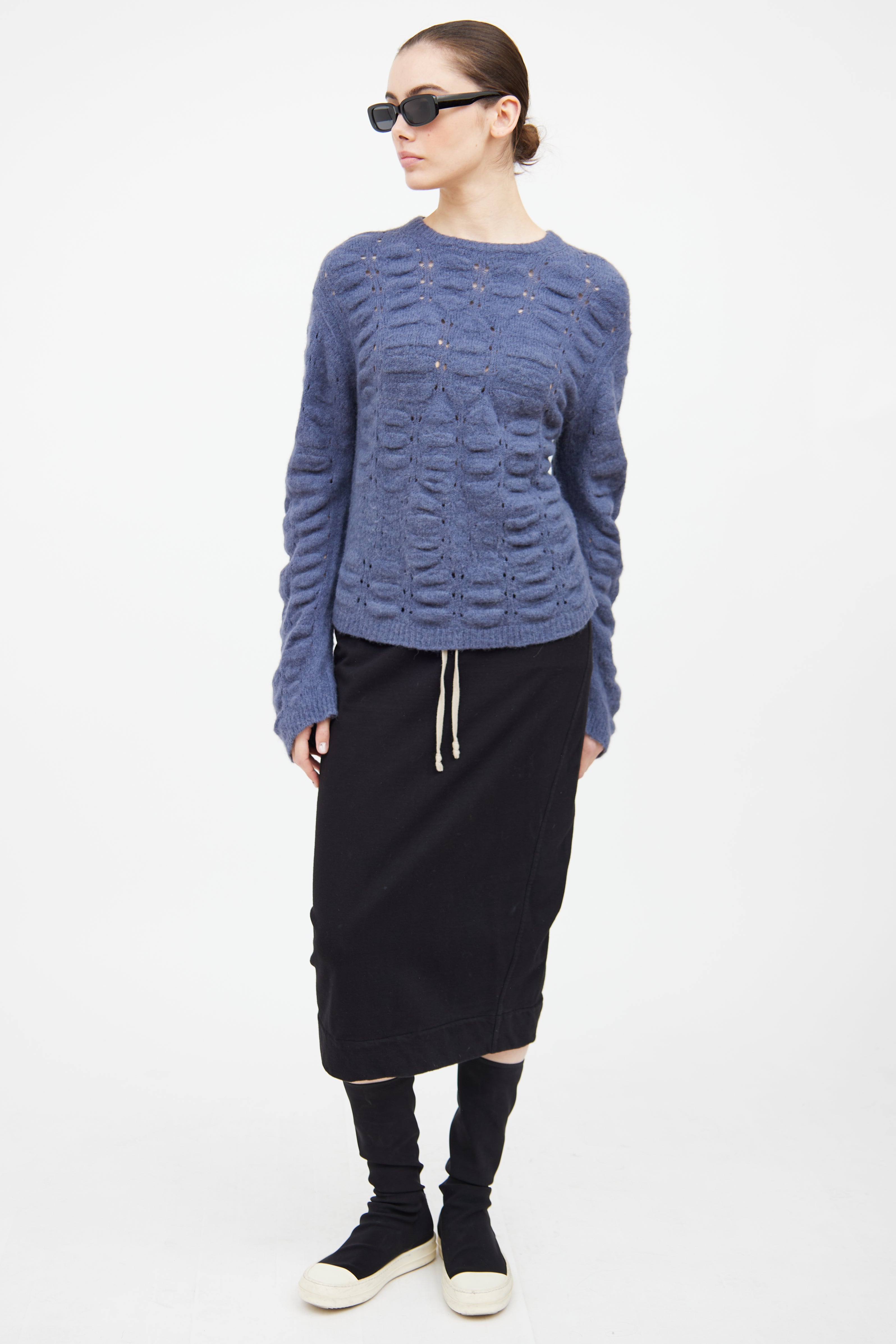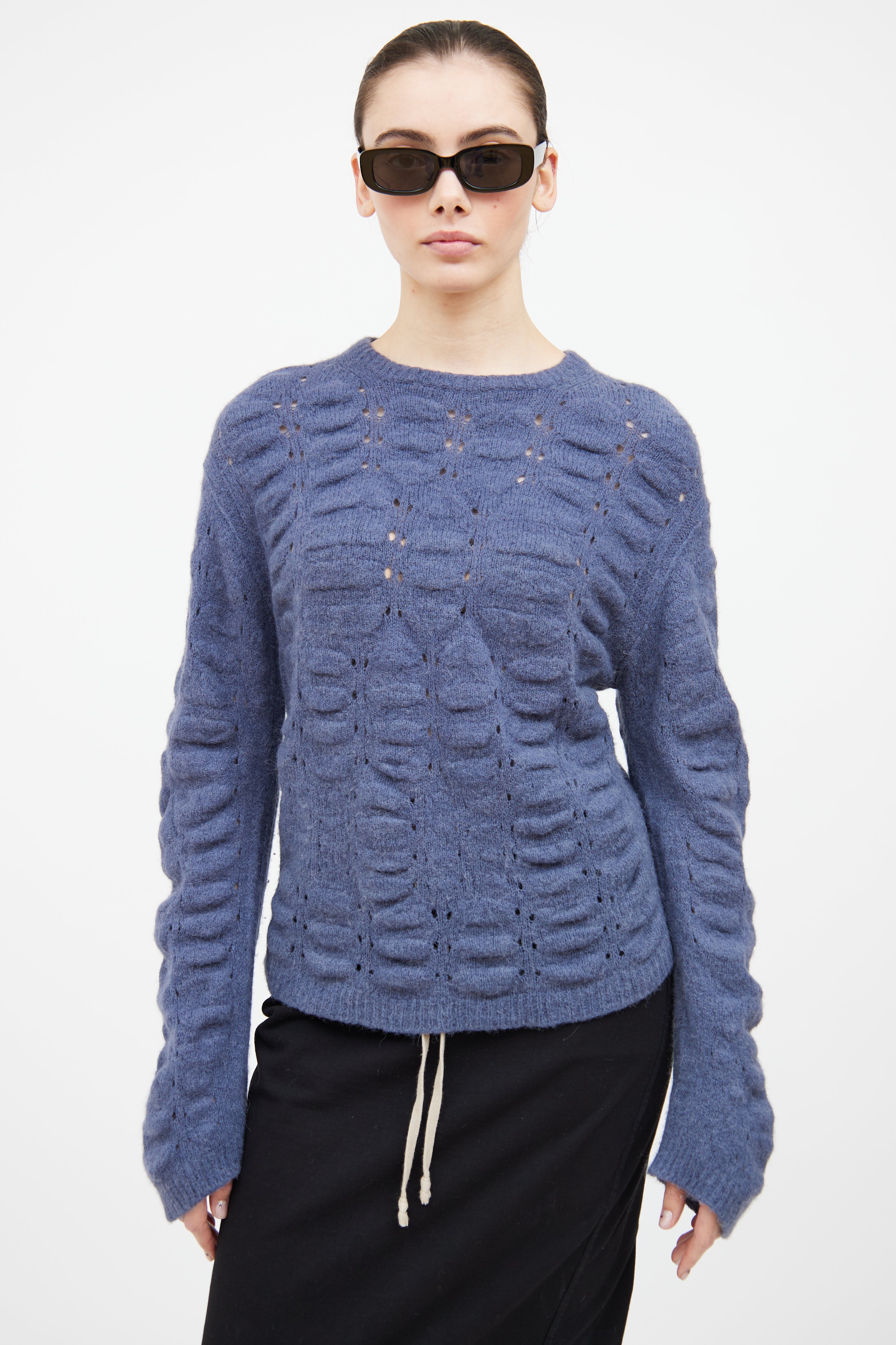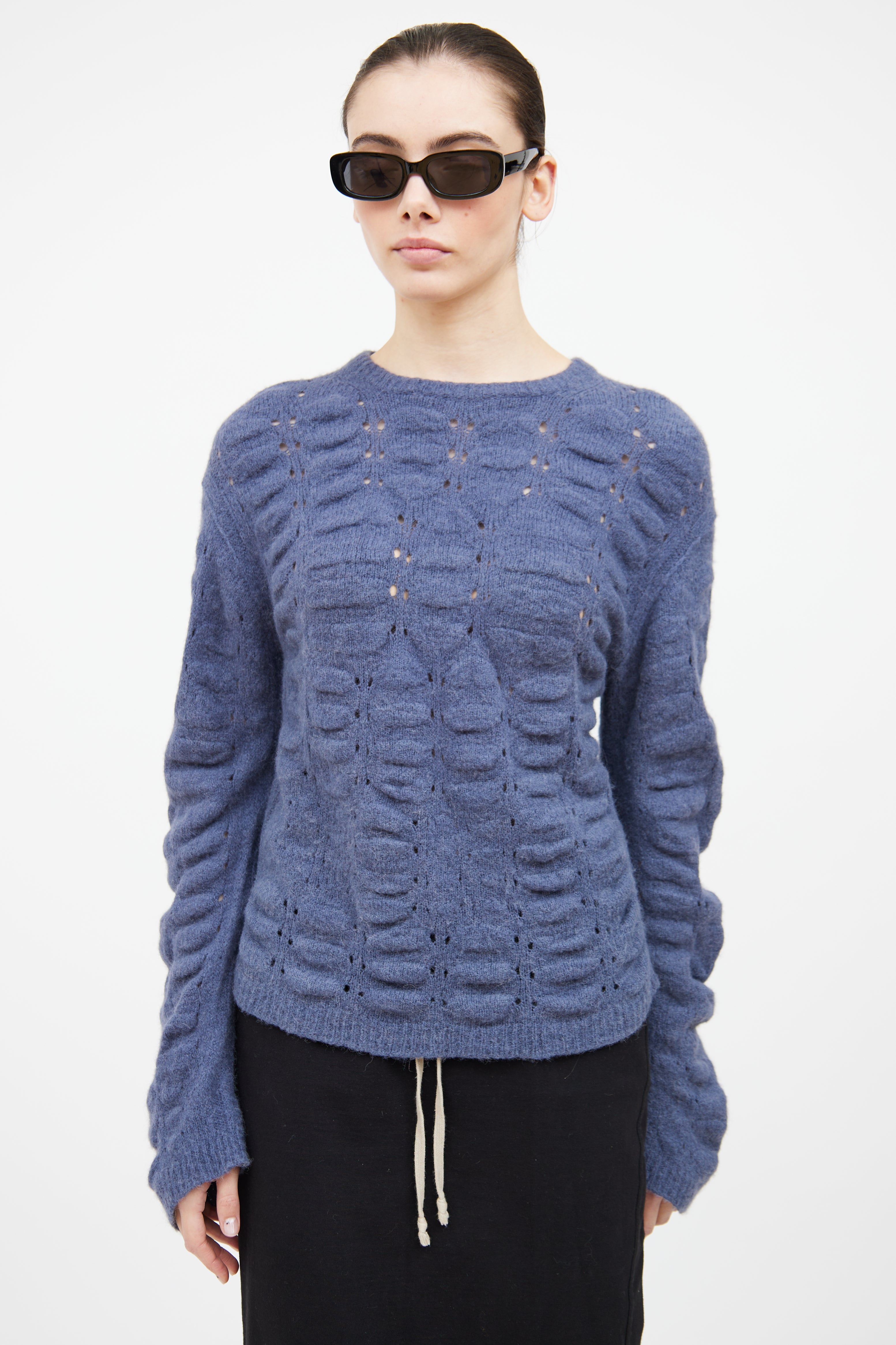 Pre-owned Rick Owens FW 2020 blue knit sweater featuring crewneck, curved longsleeves, raised knit with eyelets and ribbed hem. From the FW 2020 Performa collection.