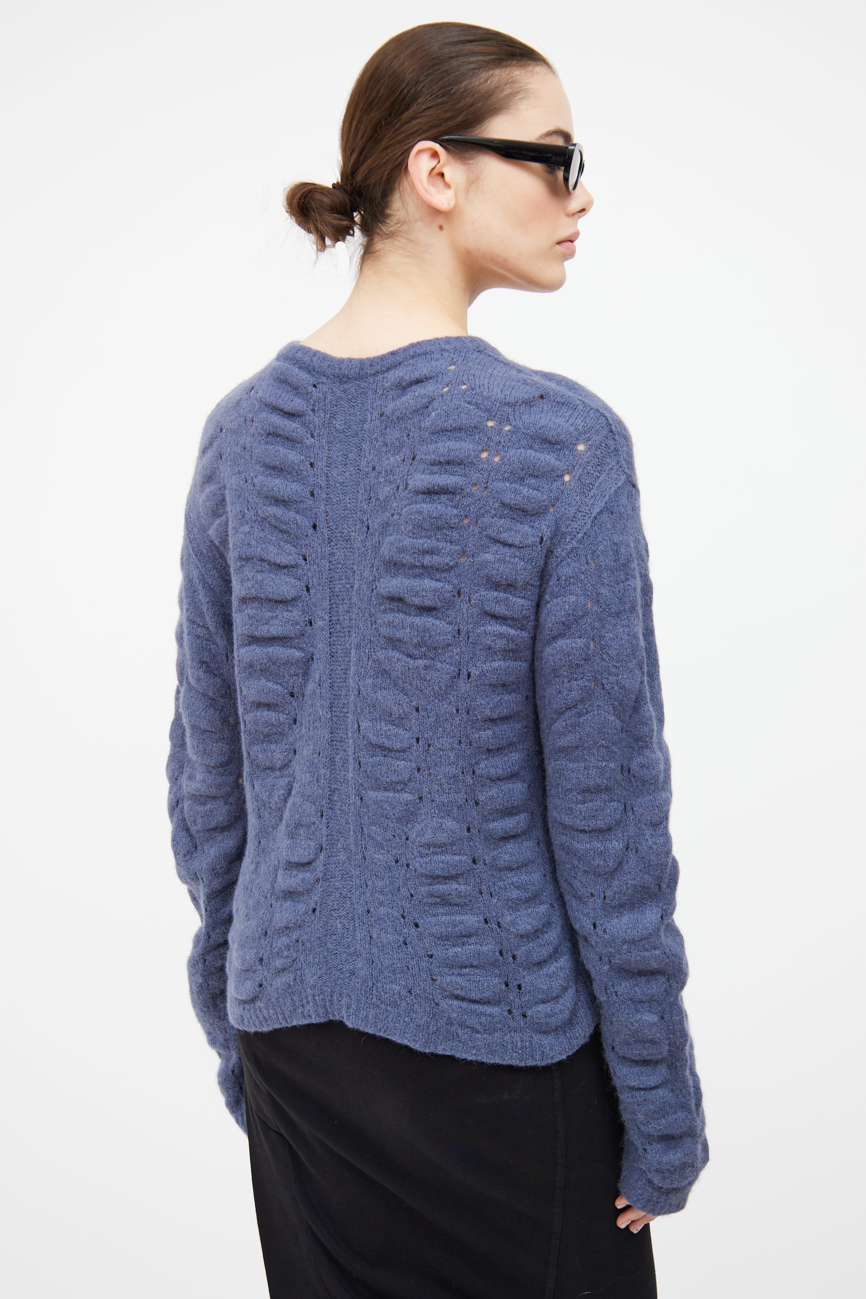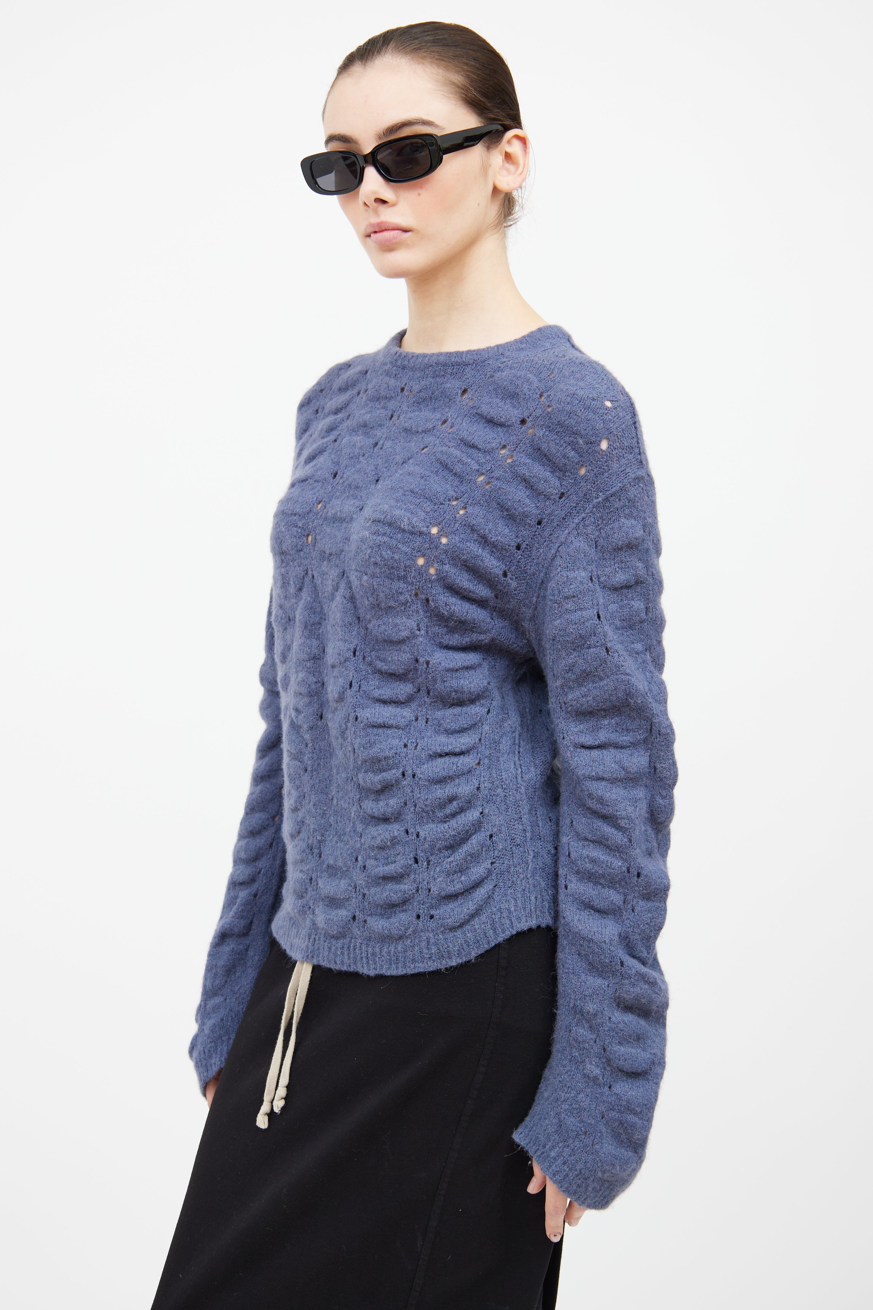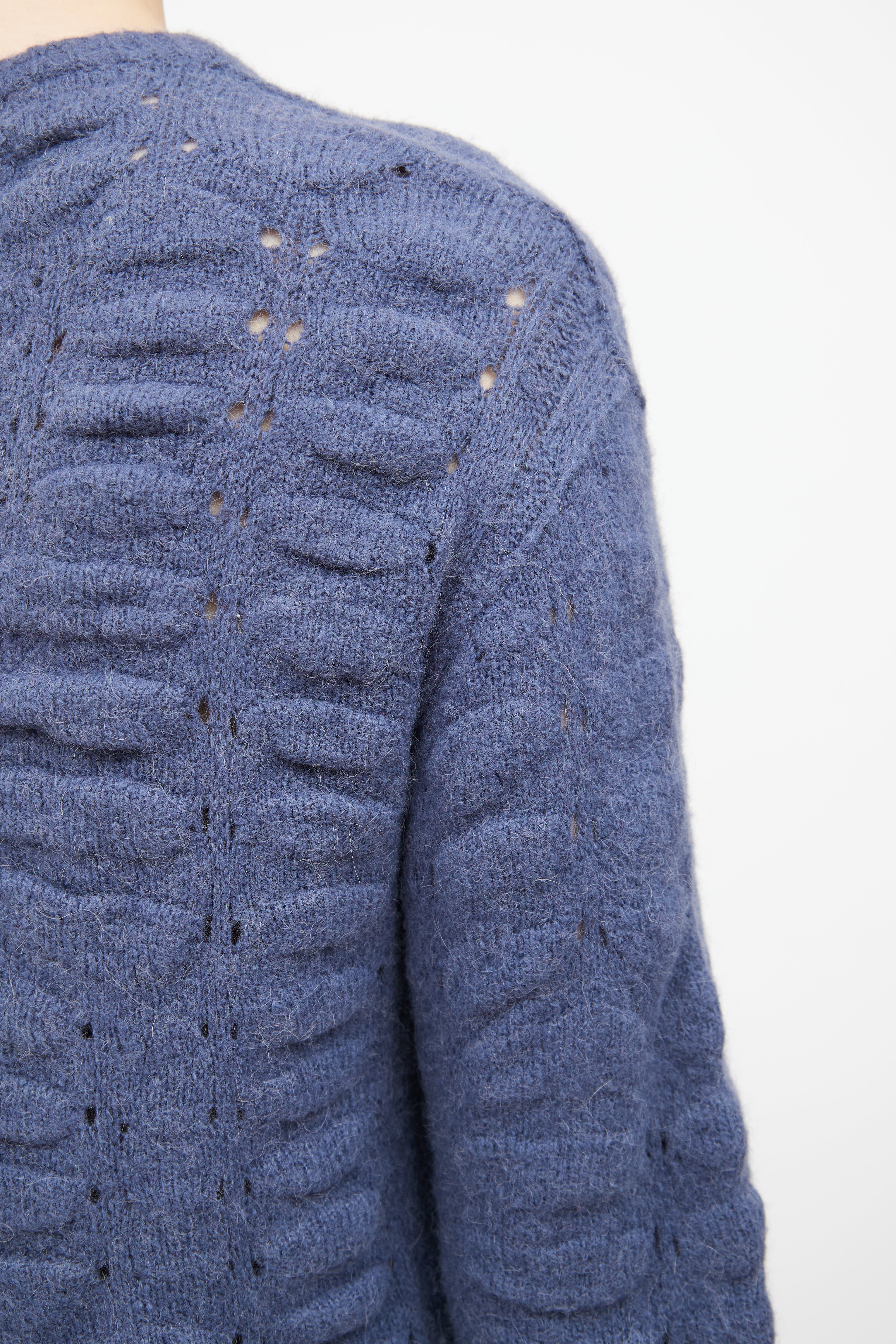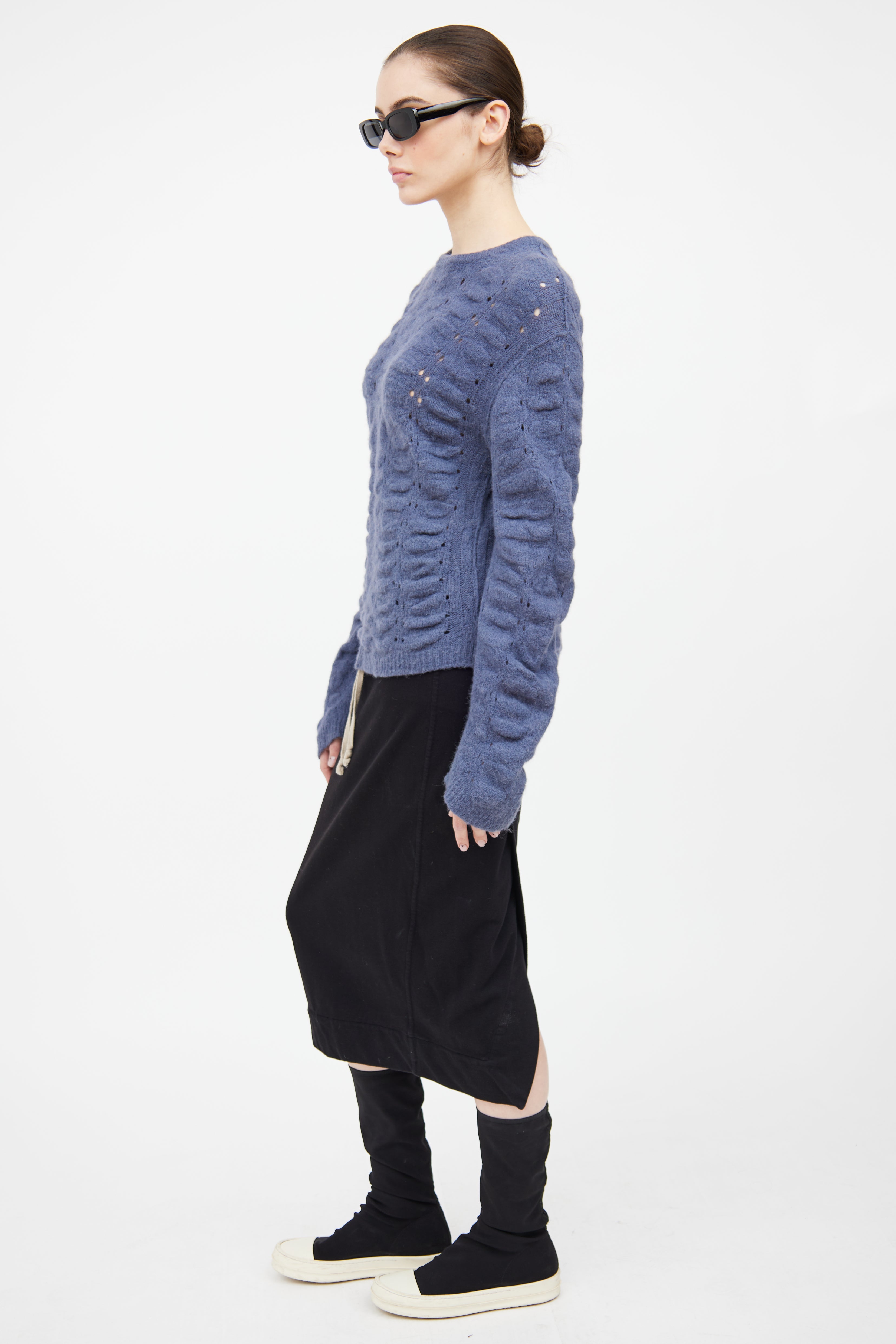 Pre-owned Rick Owens FW 2020 blue knit sweater featuring crewneck, curved longsleeves, raised knit with eyelets and ribbed hem. From the FW 2020 Performa collection.