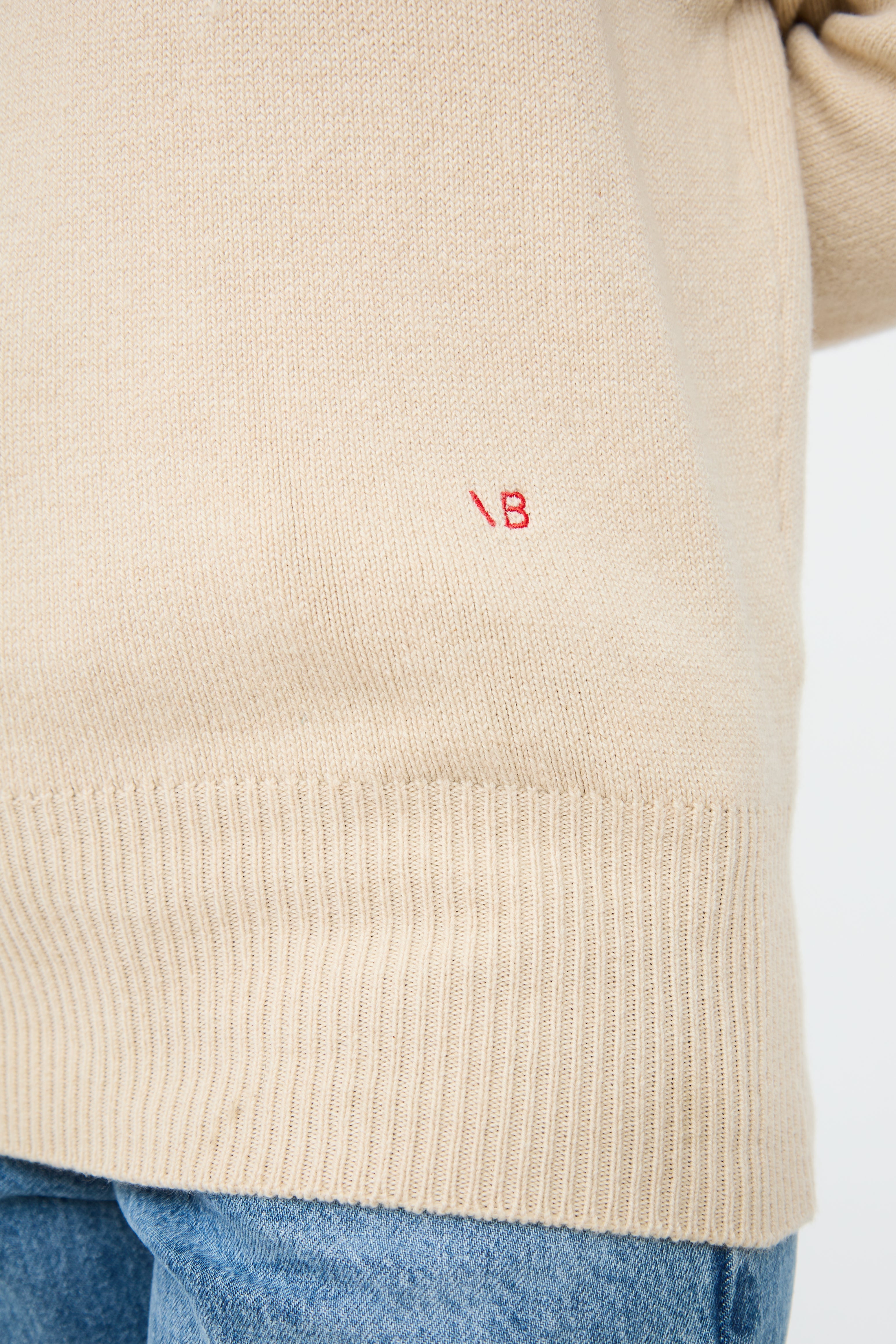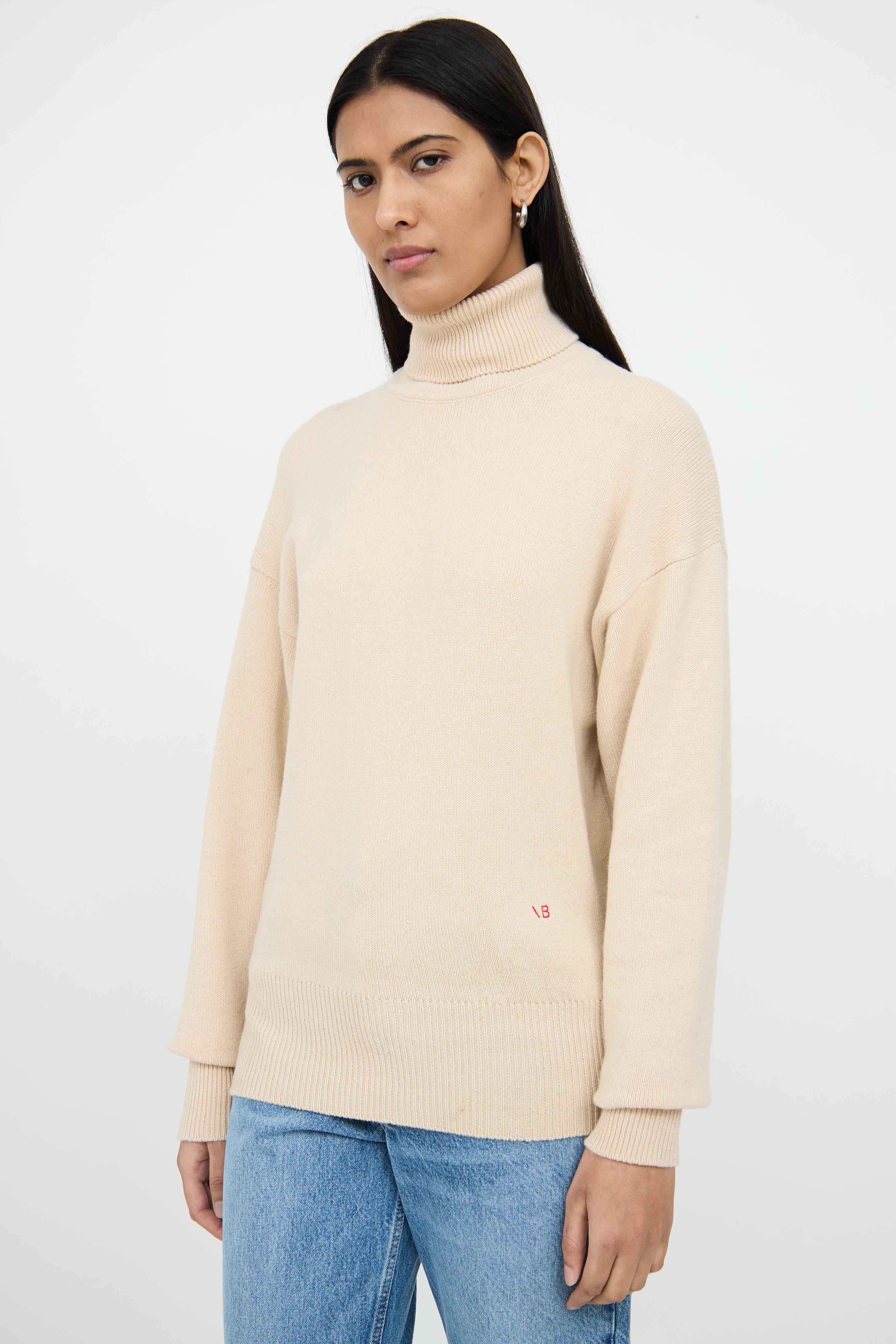 Pre-owned Victoria Beckham beige long sleeve top featuring turtleneck, ribbed cuffs and hem and red embroidered VB logo on front.