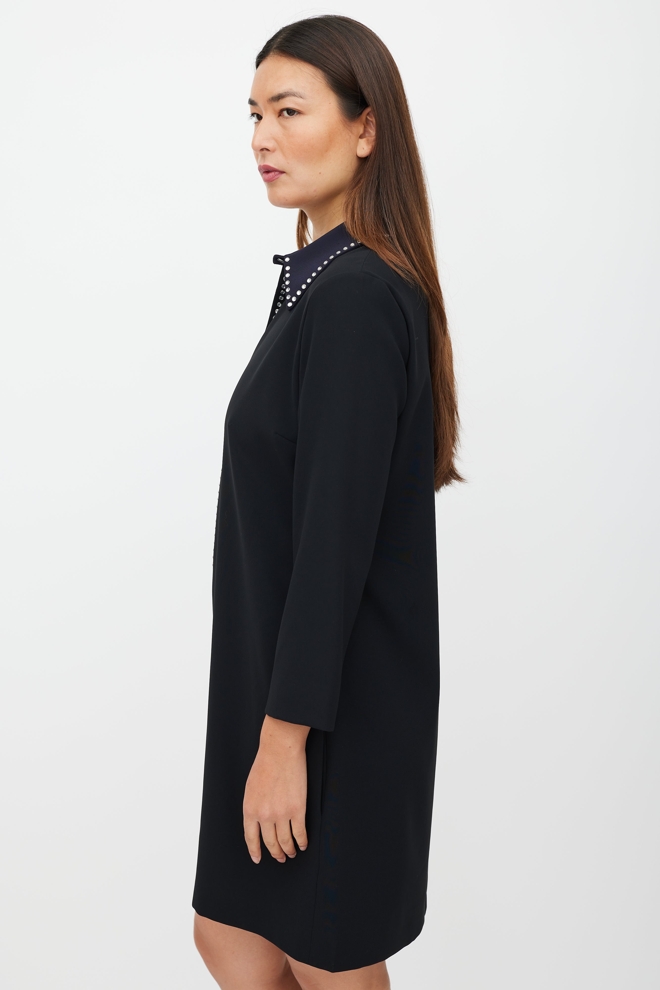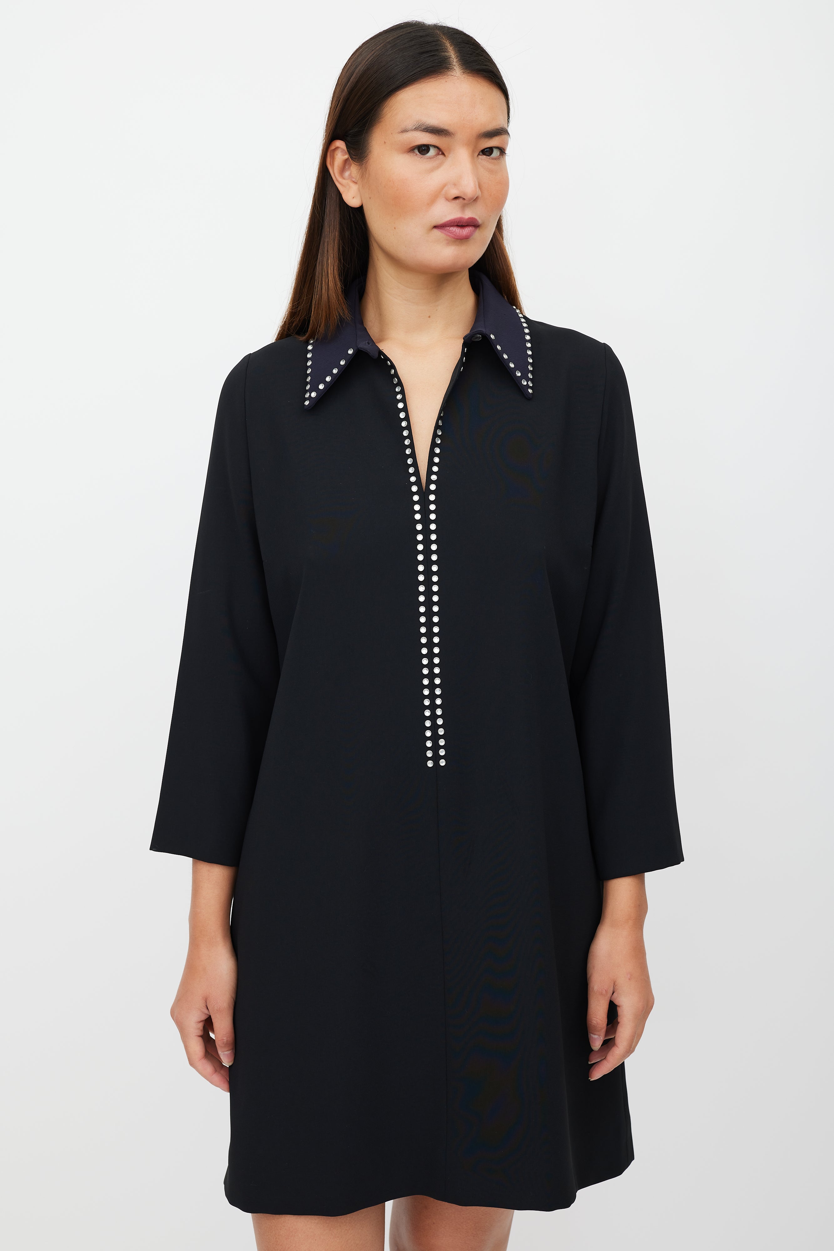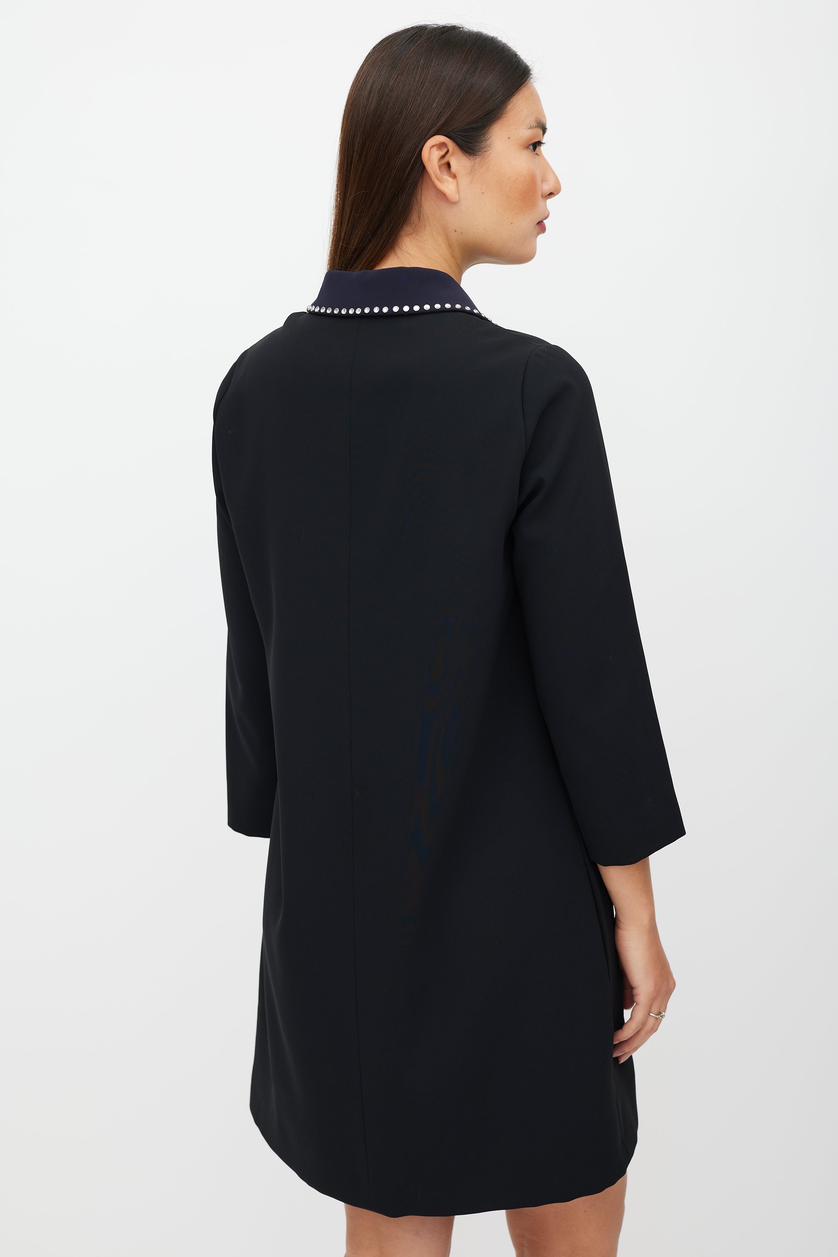Pre-owned VVB black dress featuring a navy pointed keyhole collar, studded jewel detailing, long sleeves, two slip pockets at hip, and zip closure at side. Lined.