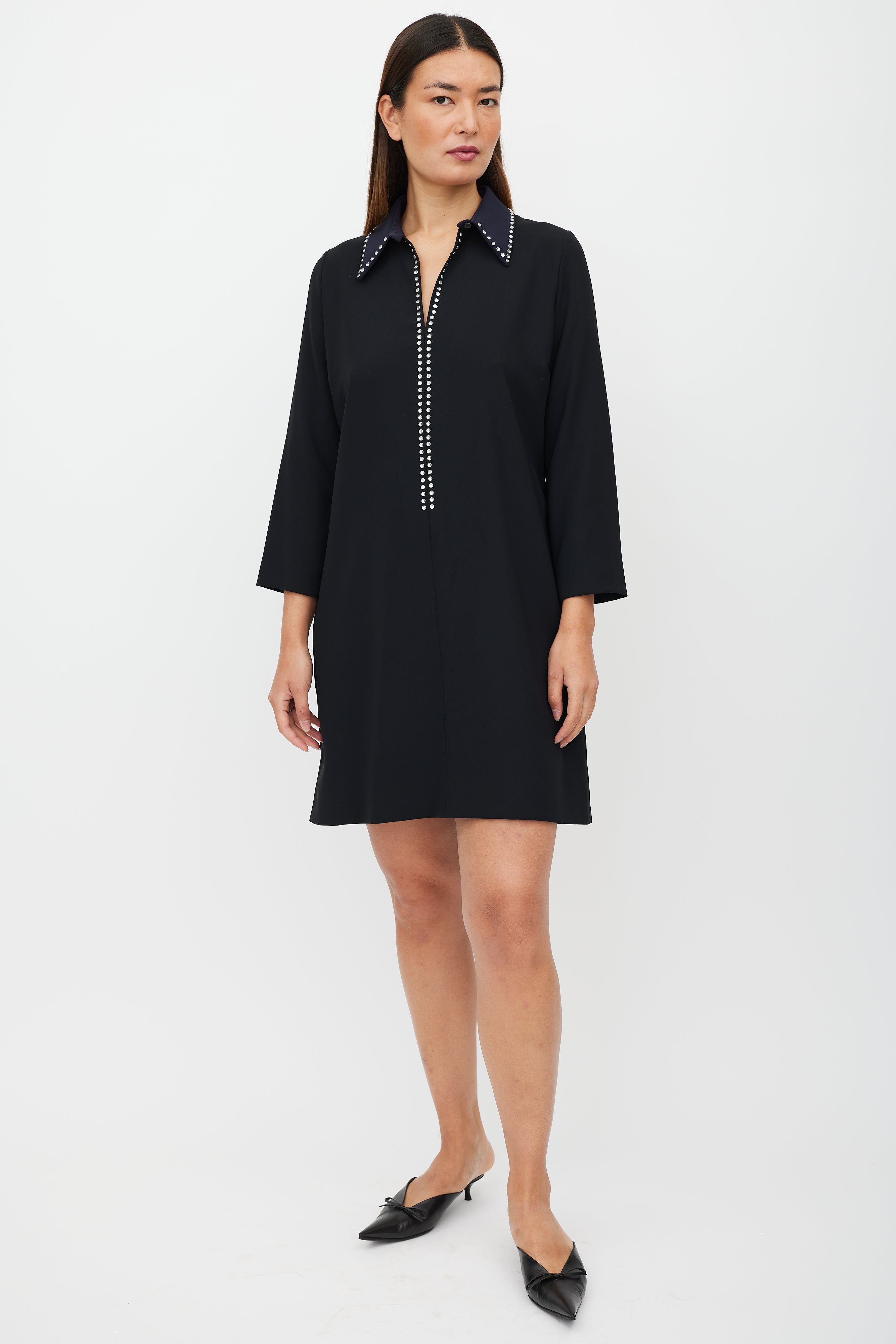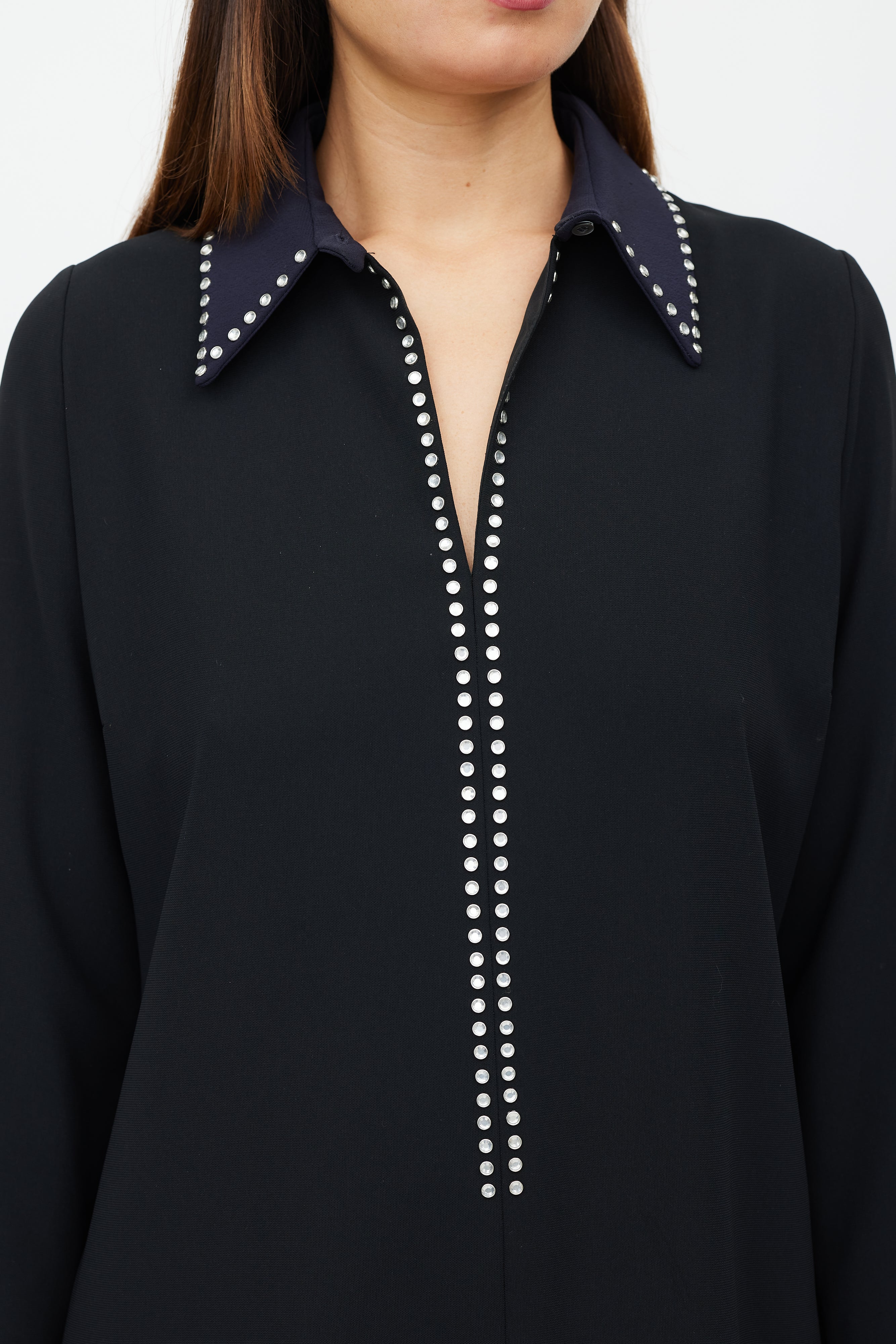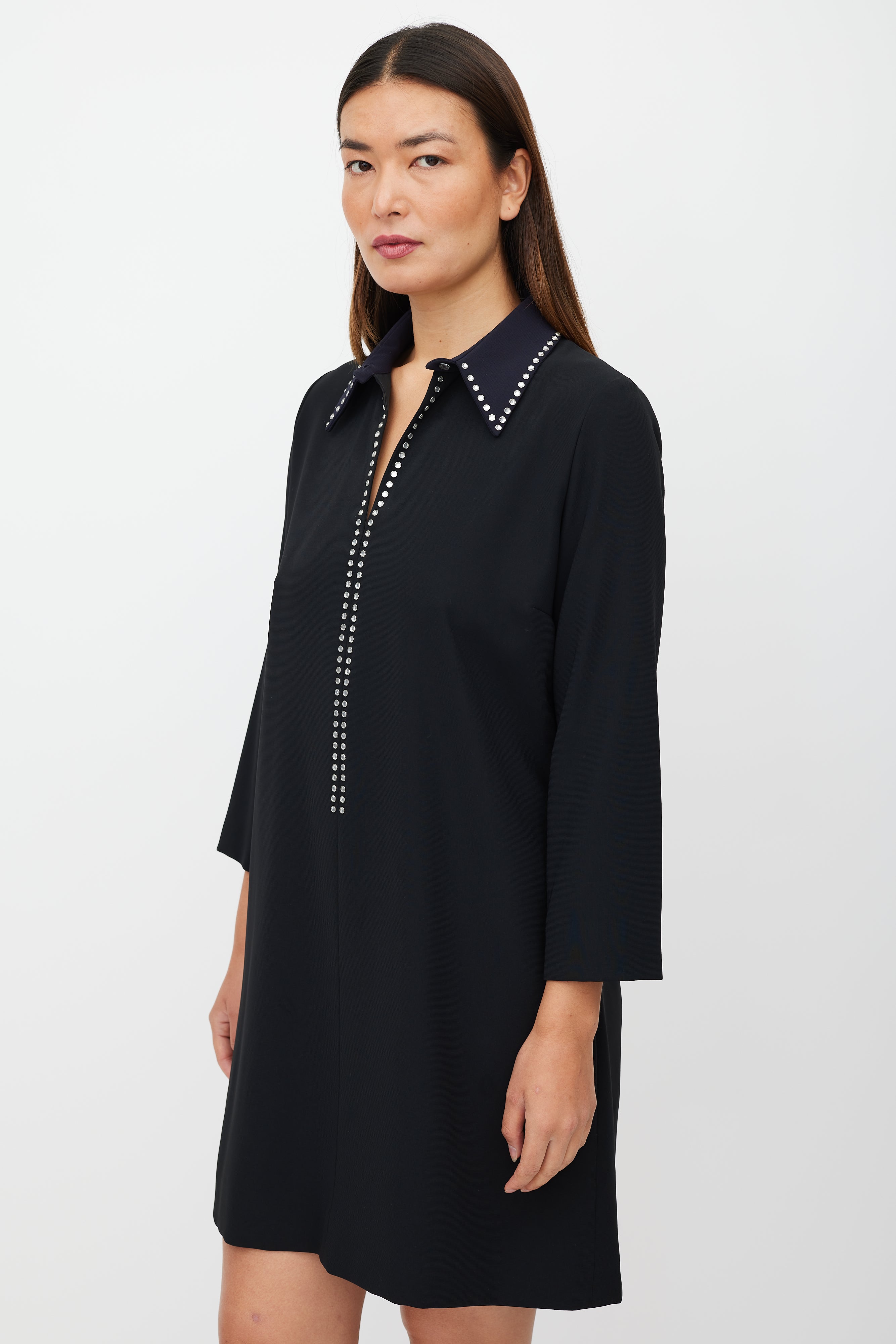Pre-owned VVB black dress featuring a navy pointed keyhole collar, studded jewel detailing, long sleeves, two slip pockets at hip, and zip closure at side. Lined.