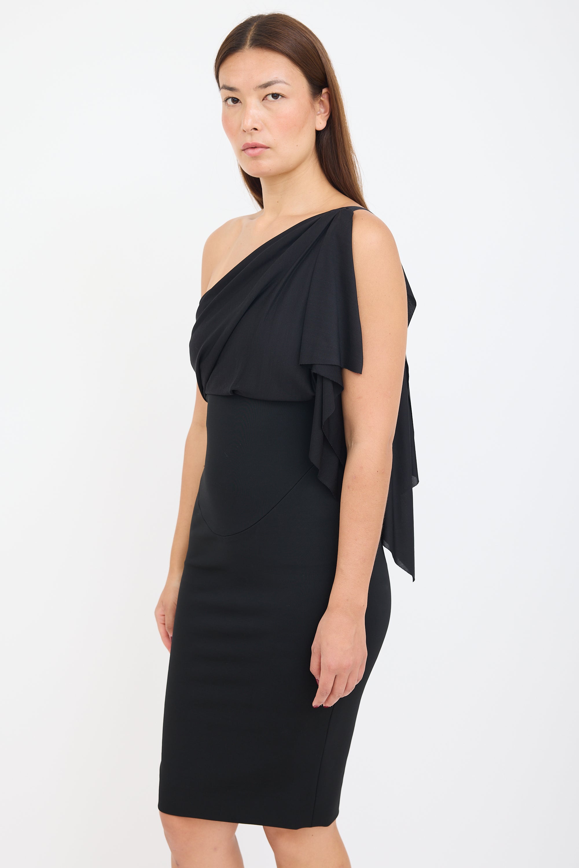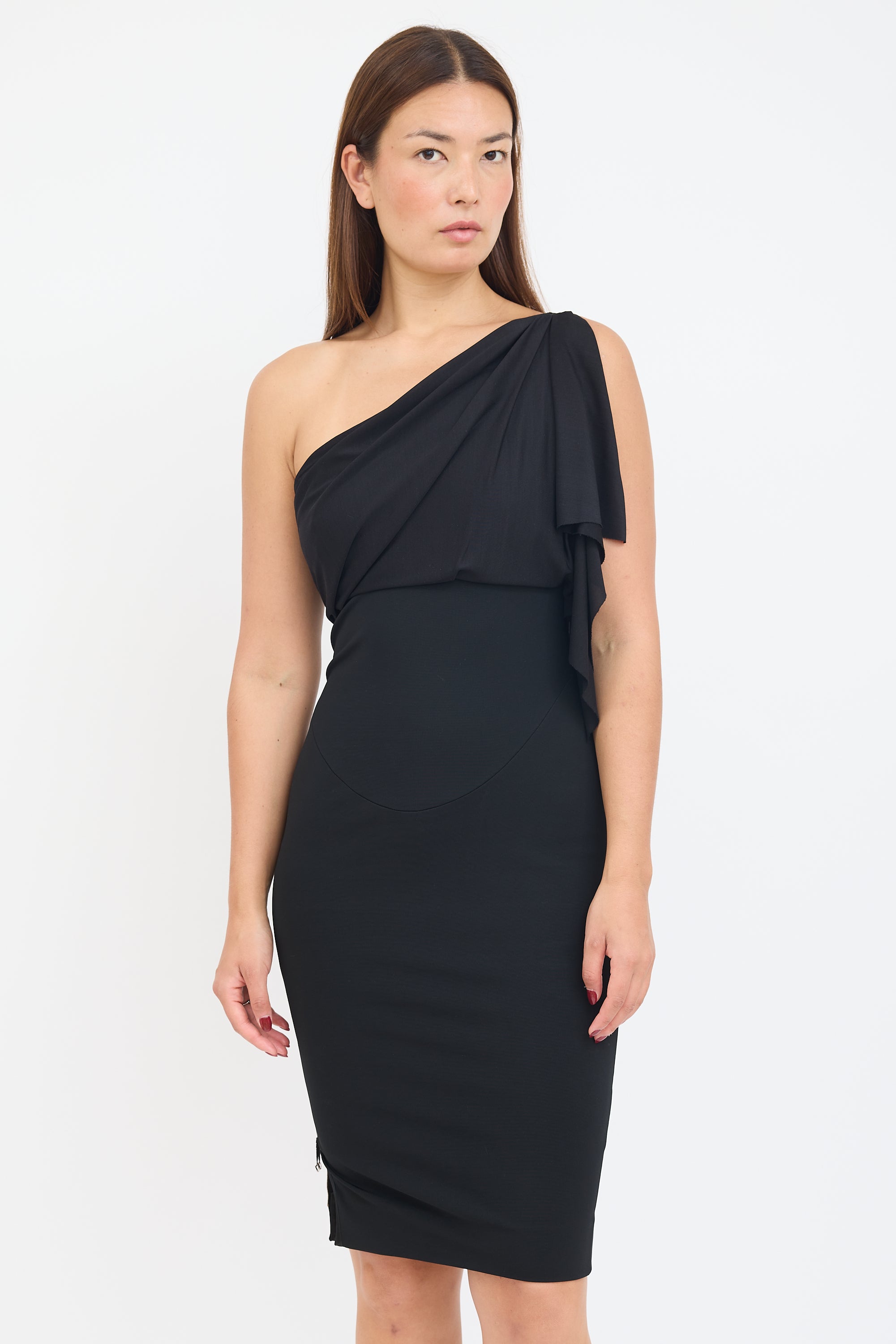 Pre-owned Victoria Beckham black dress featuring a rounded neckline, one shoulder styling, draped bust, darted back, and zip closure at side. Lined.