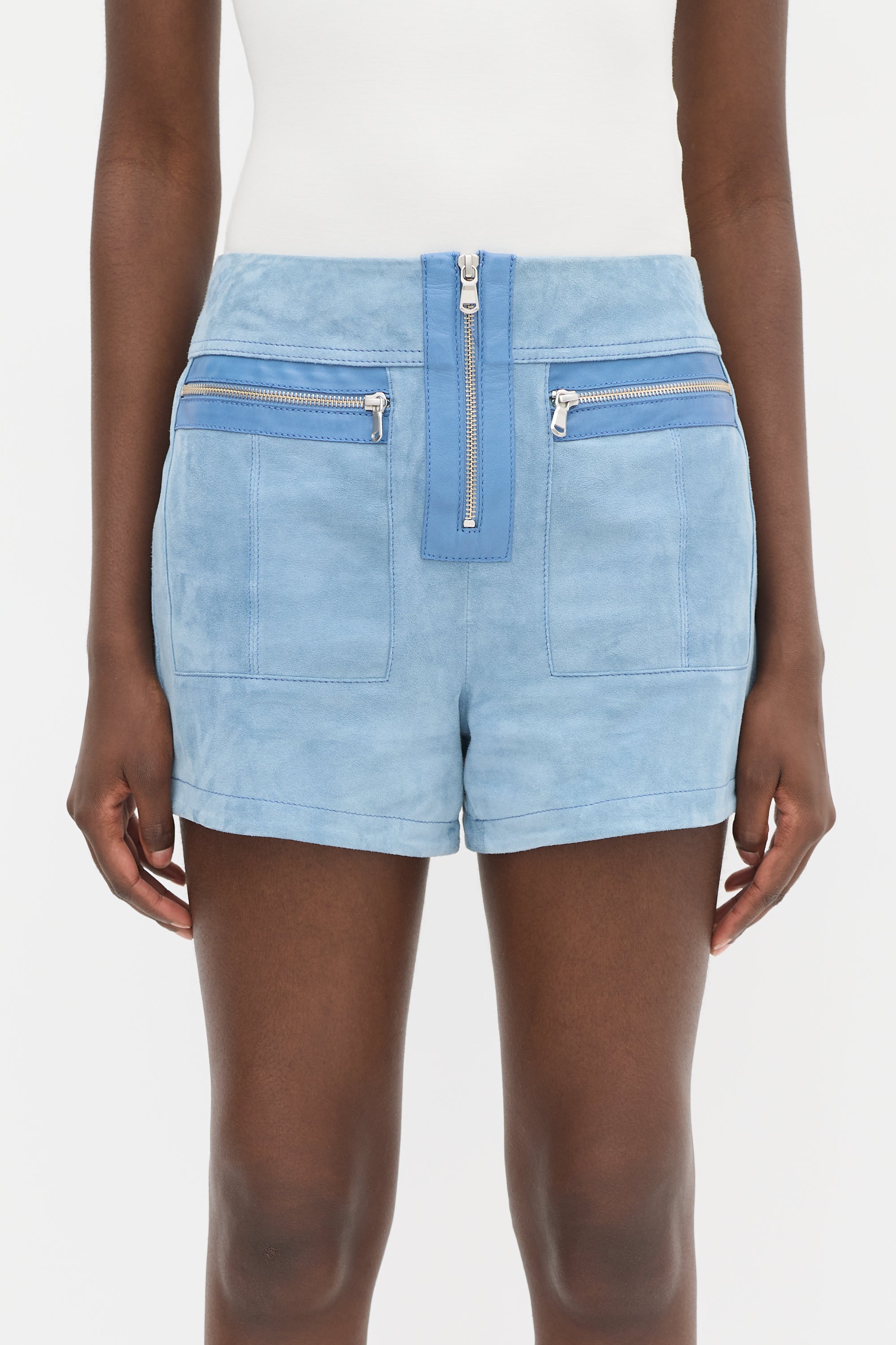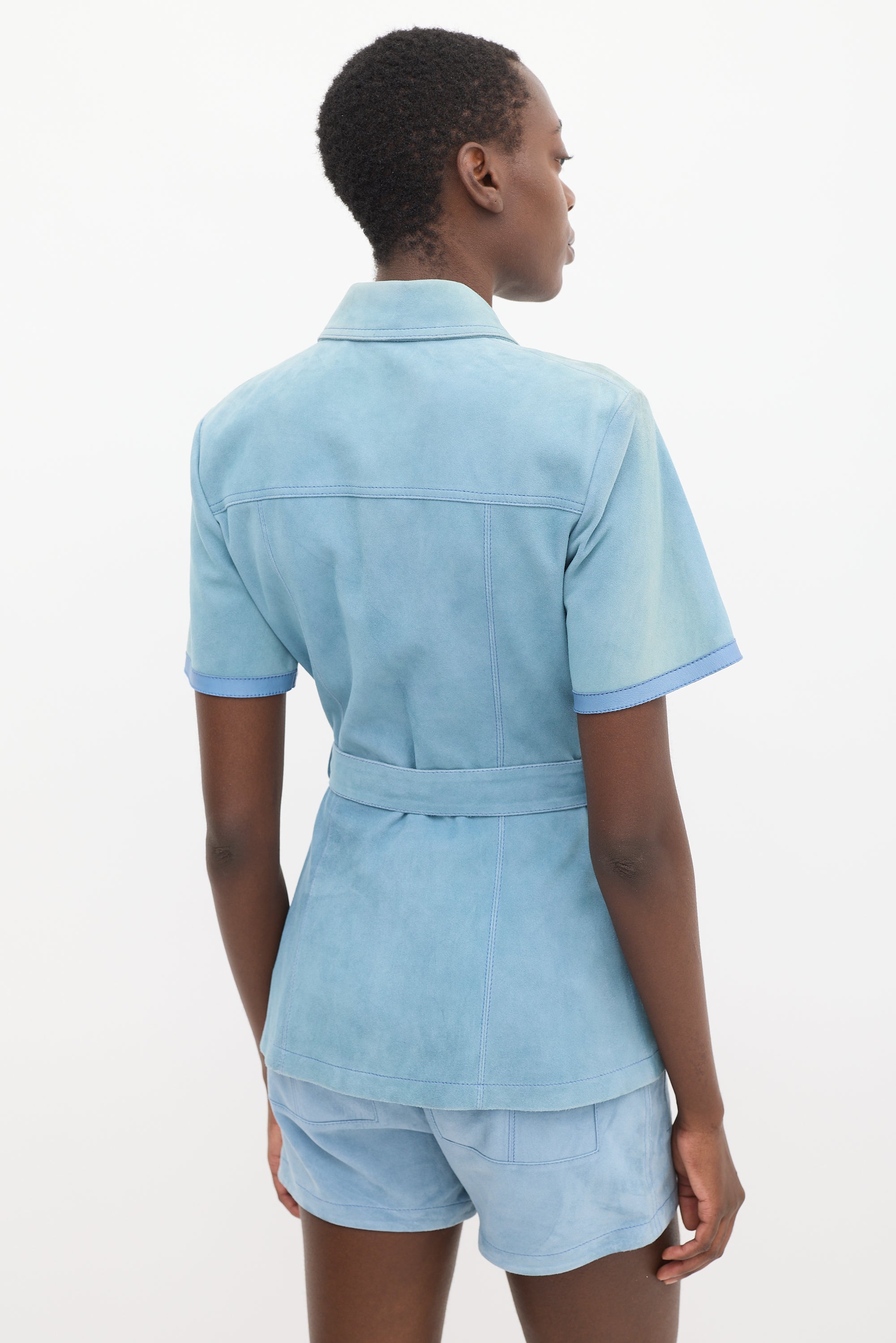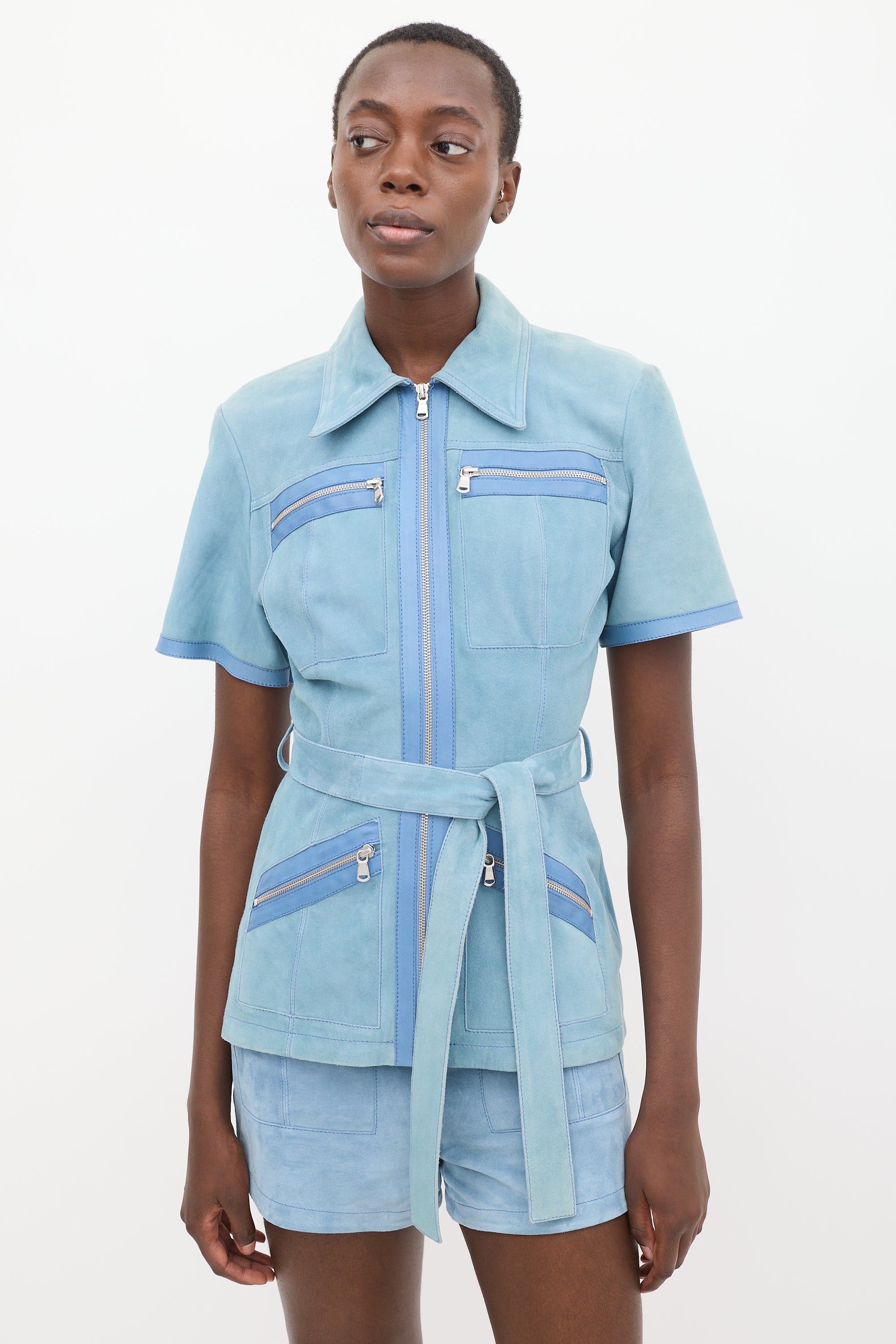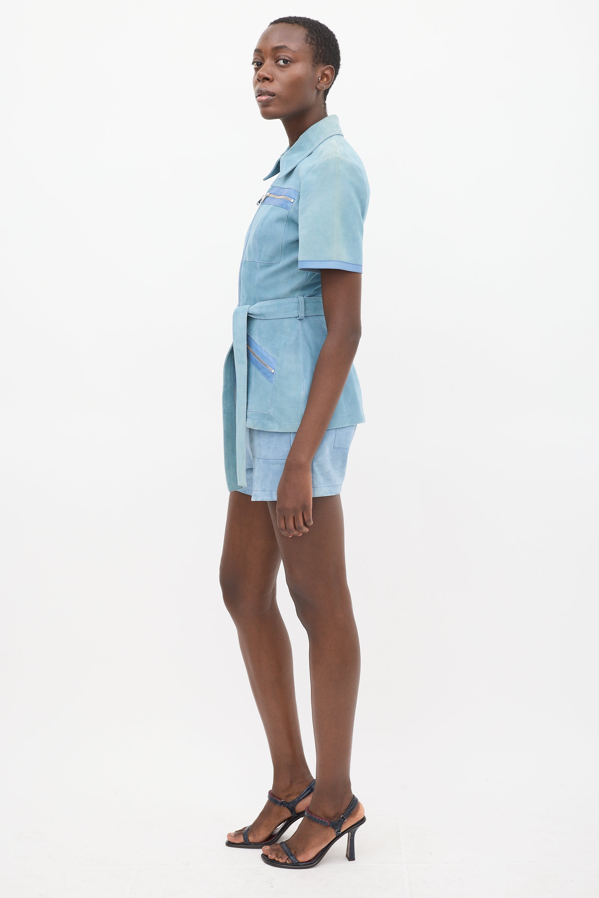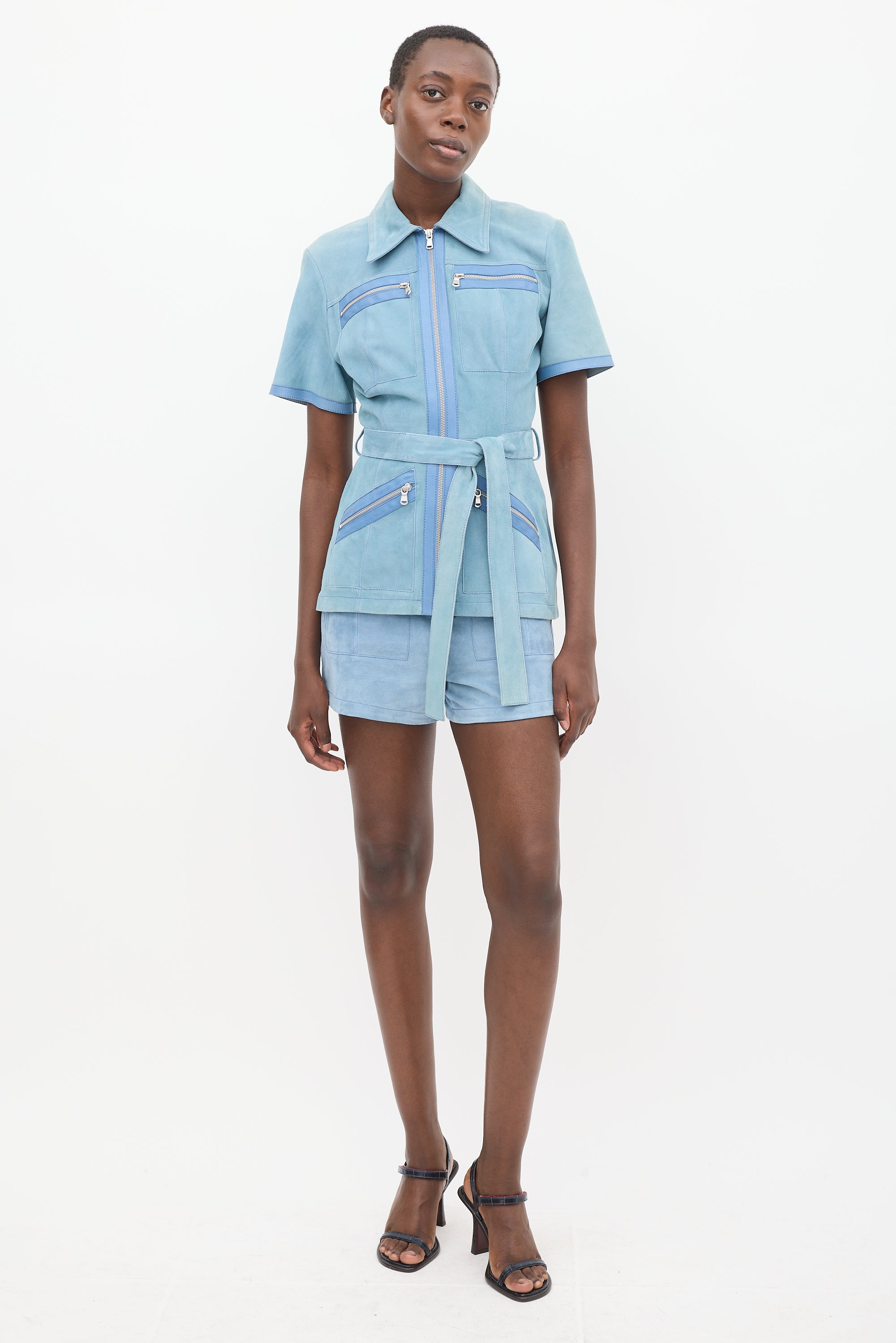 Pre-owned VVB blue suede jacket featuring a pointed collar, short sleeves, two zip pockets at chest, tie belt at waist, two zip pockets at hip, tonal leather trim, and front zip closure. Matching shorts featuring two zip pockets at hip, two zip pockets at back, wide leg, and front zip closure.