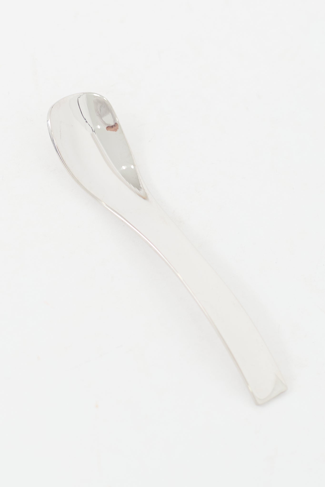 Pre-owned Guzzini set of six 4.25" stainless steel spoons featuring elegant curved design and stamped logo at back side. Designed by Ross Lovegrove. Comes with original box.