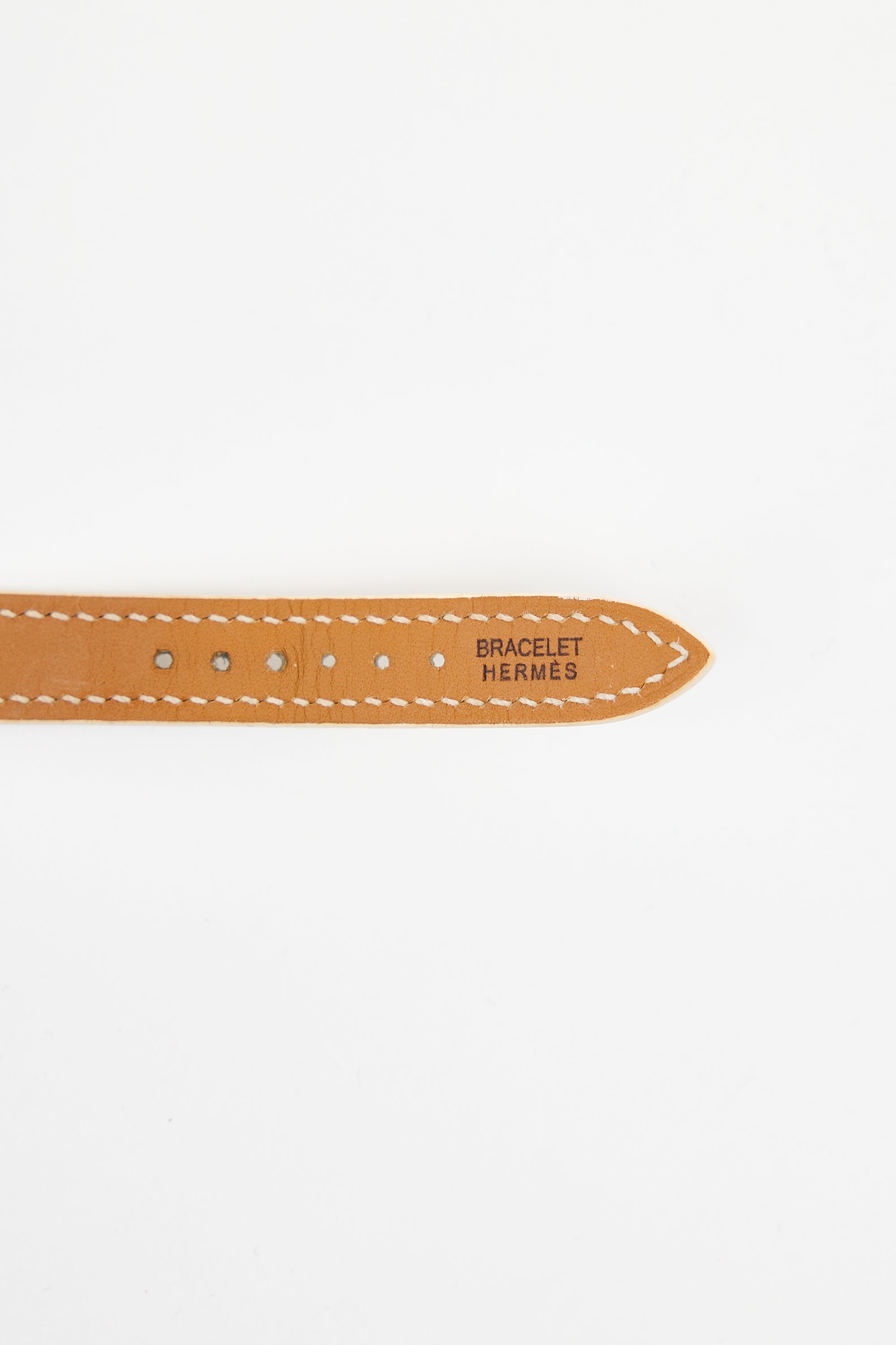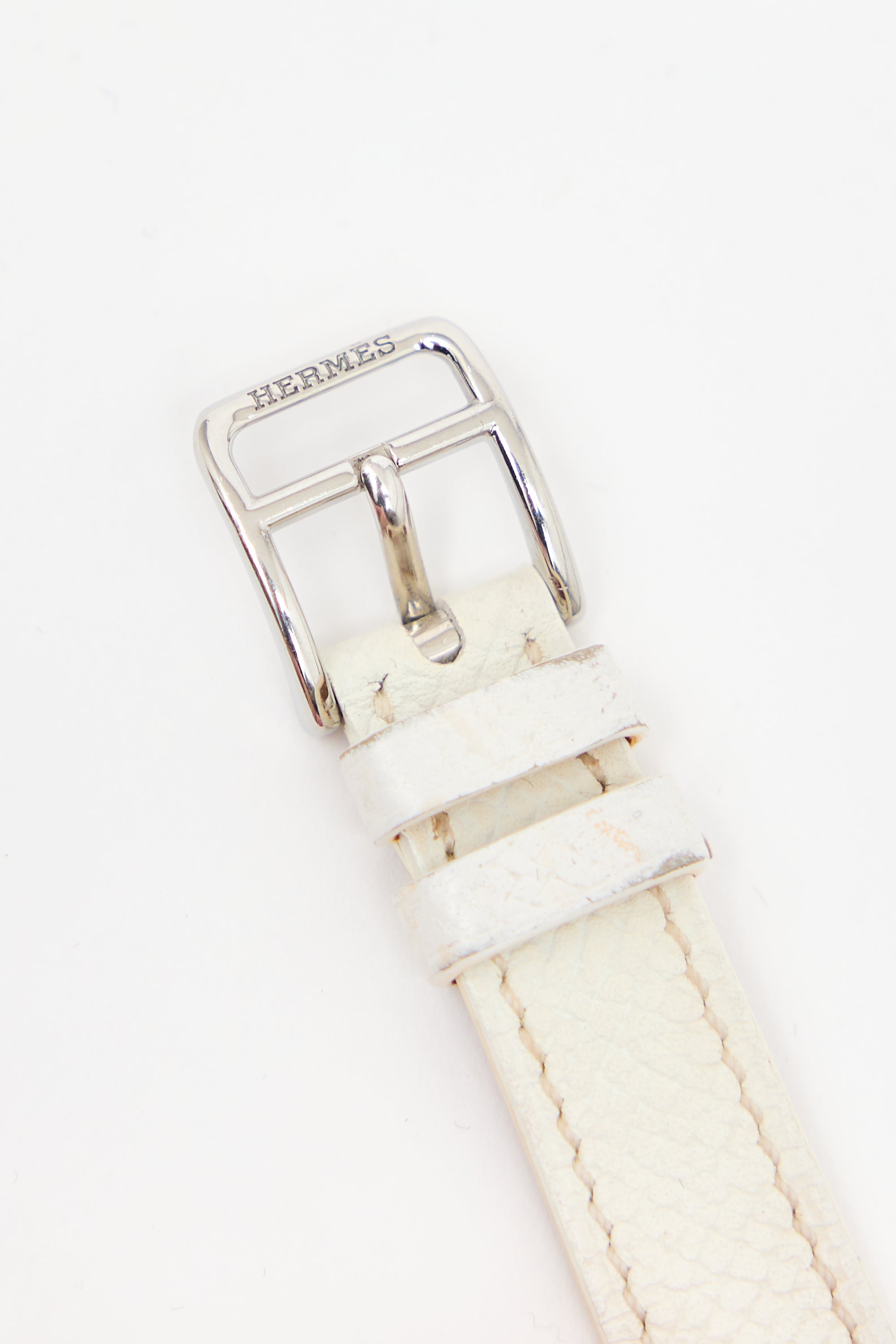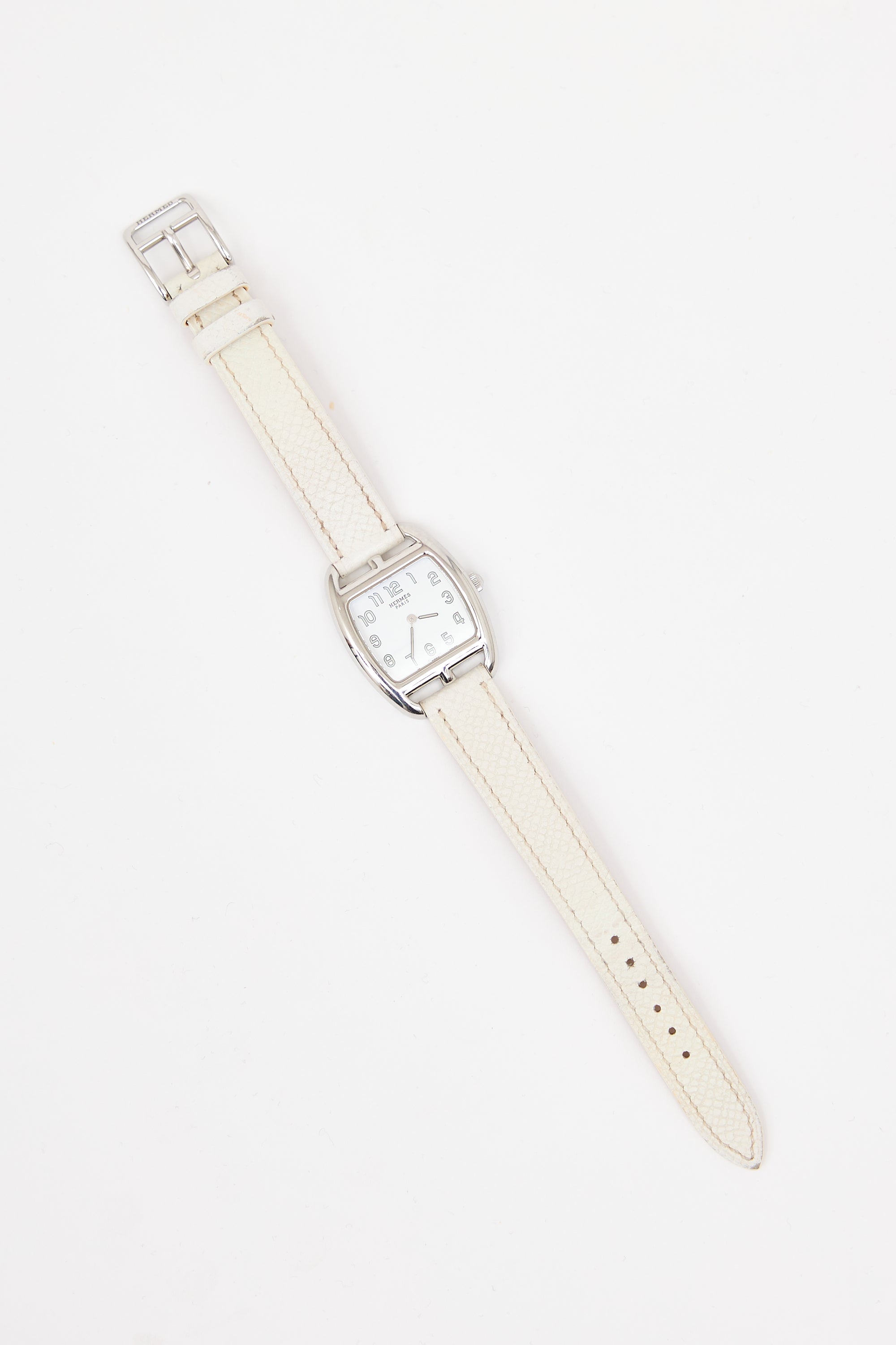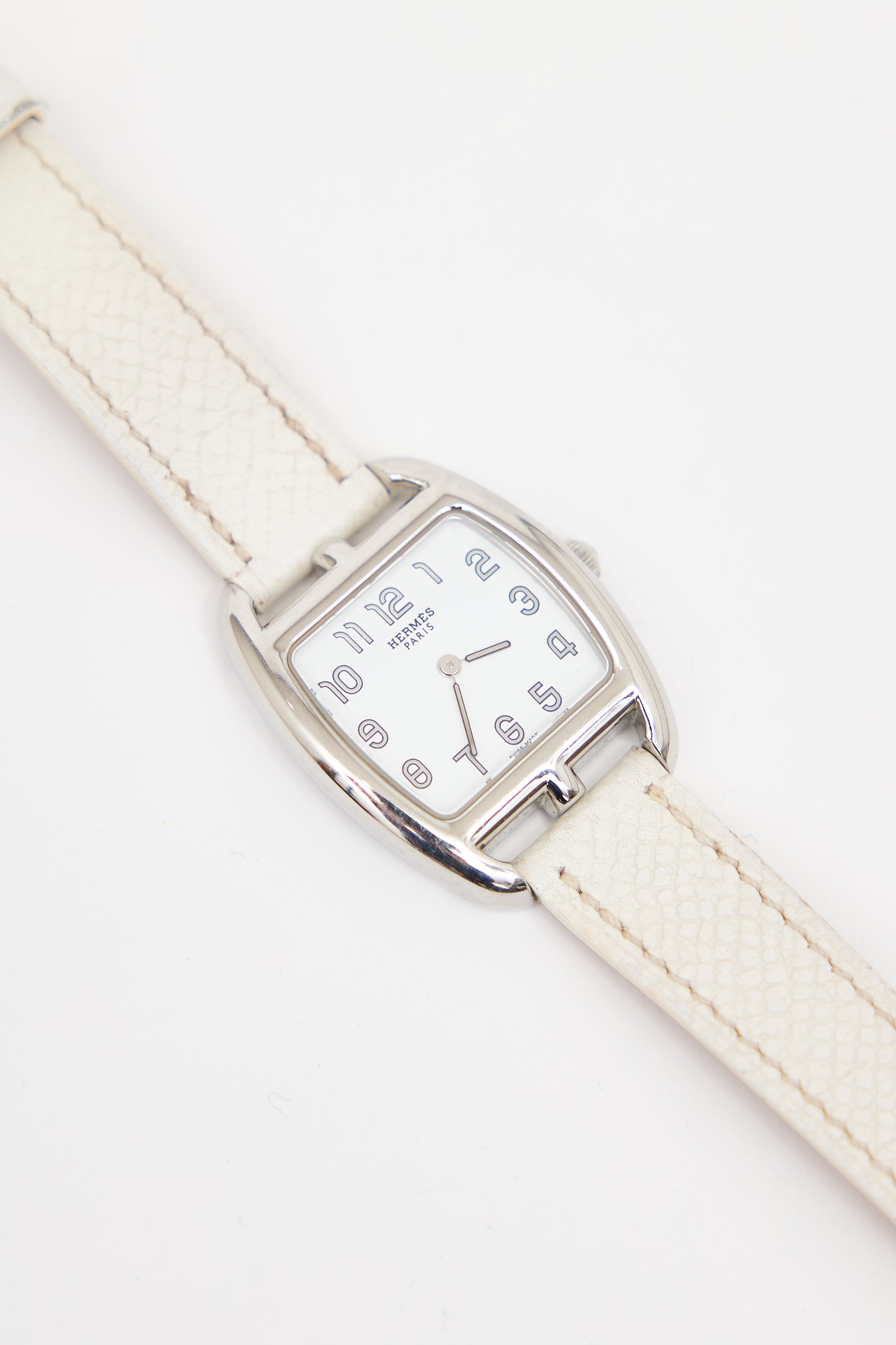 Pre-owned Hermès 2009 Cape Cod watch featuring adjustable Craie Epsom leather straps, 23mm stainless steel square case, quartz movement, silver tone dial, and stamped logo at reverse. Comes with cushion.