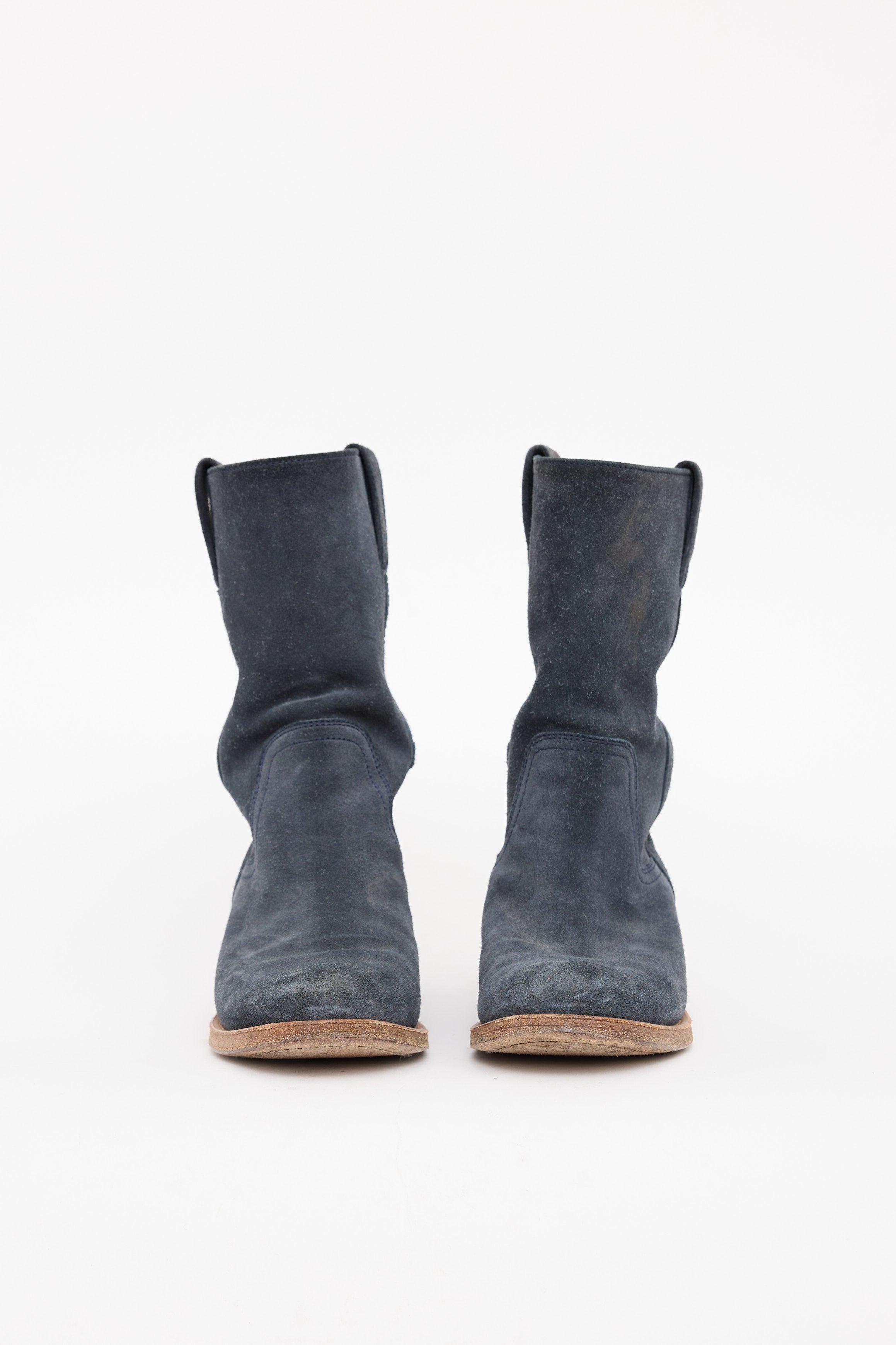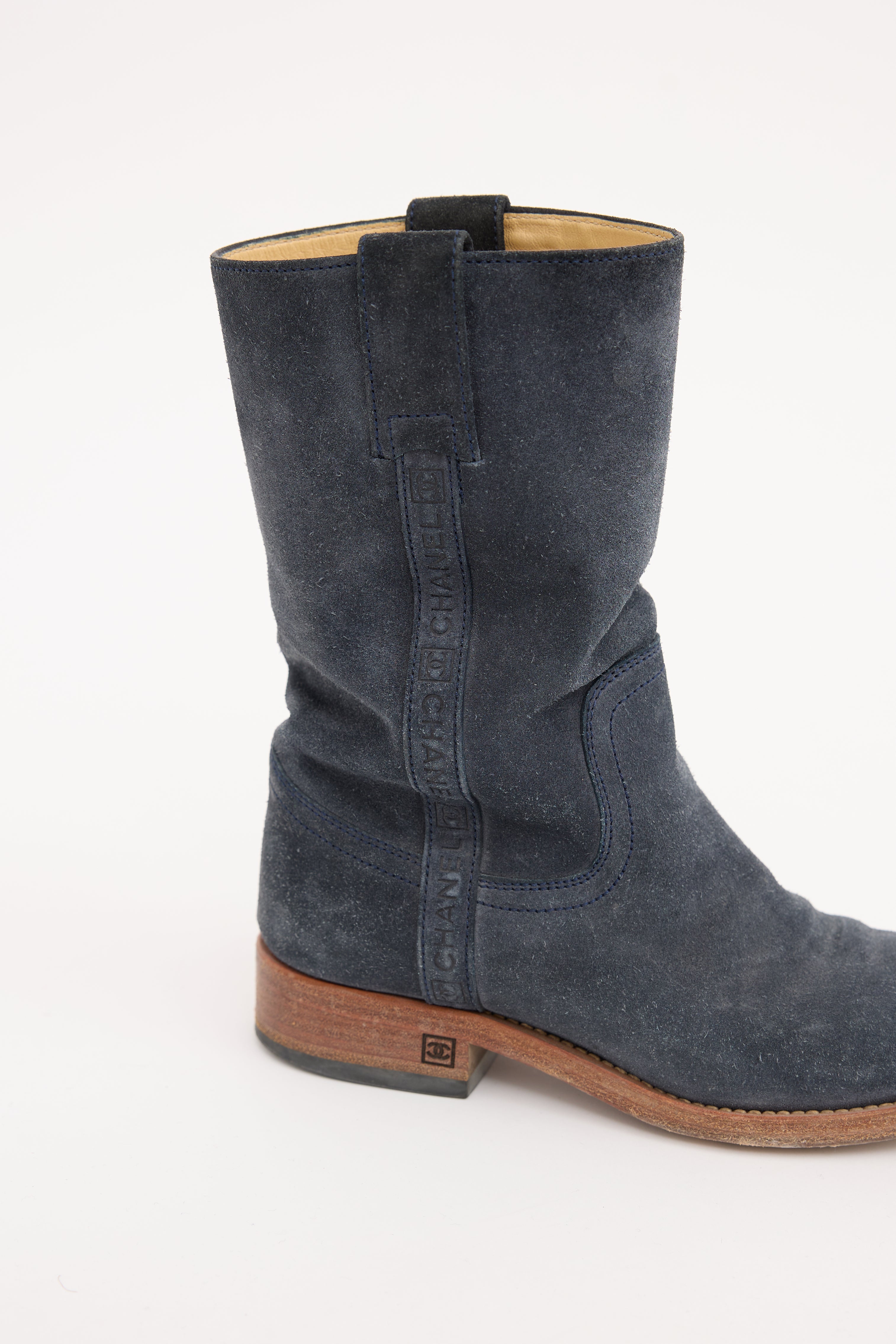 Pre-owned Chanel blue suede western boots featuring round toe, paneling on upper with Chanel logo text, dual pull tabs on entry and wooden midsole with covered CC stamped block heel.