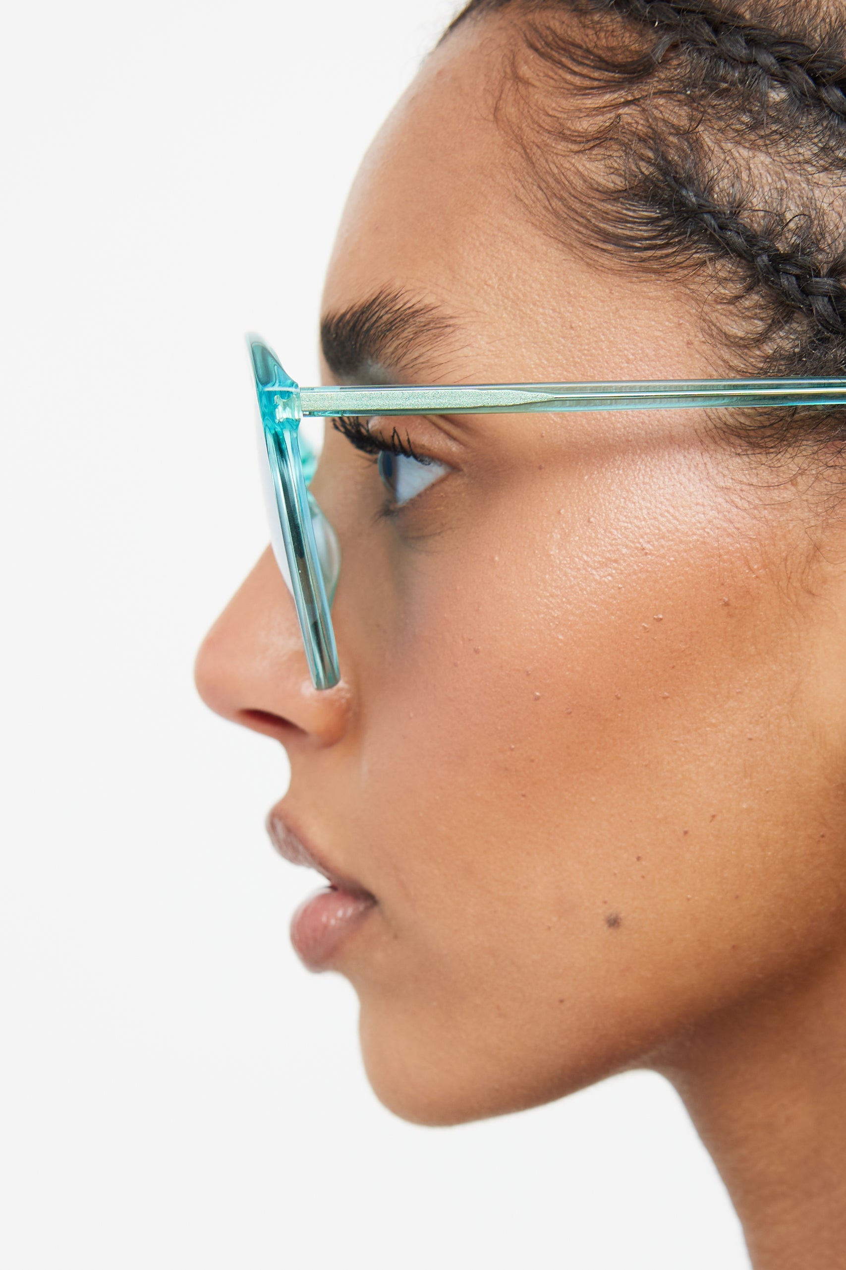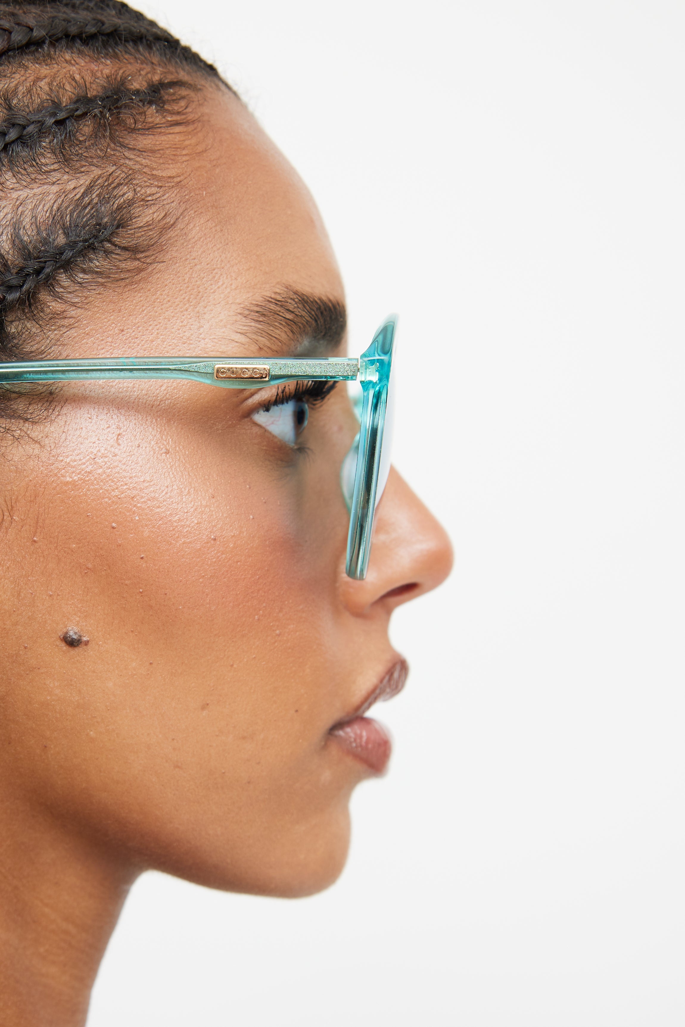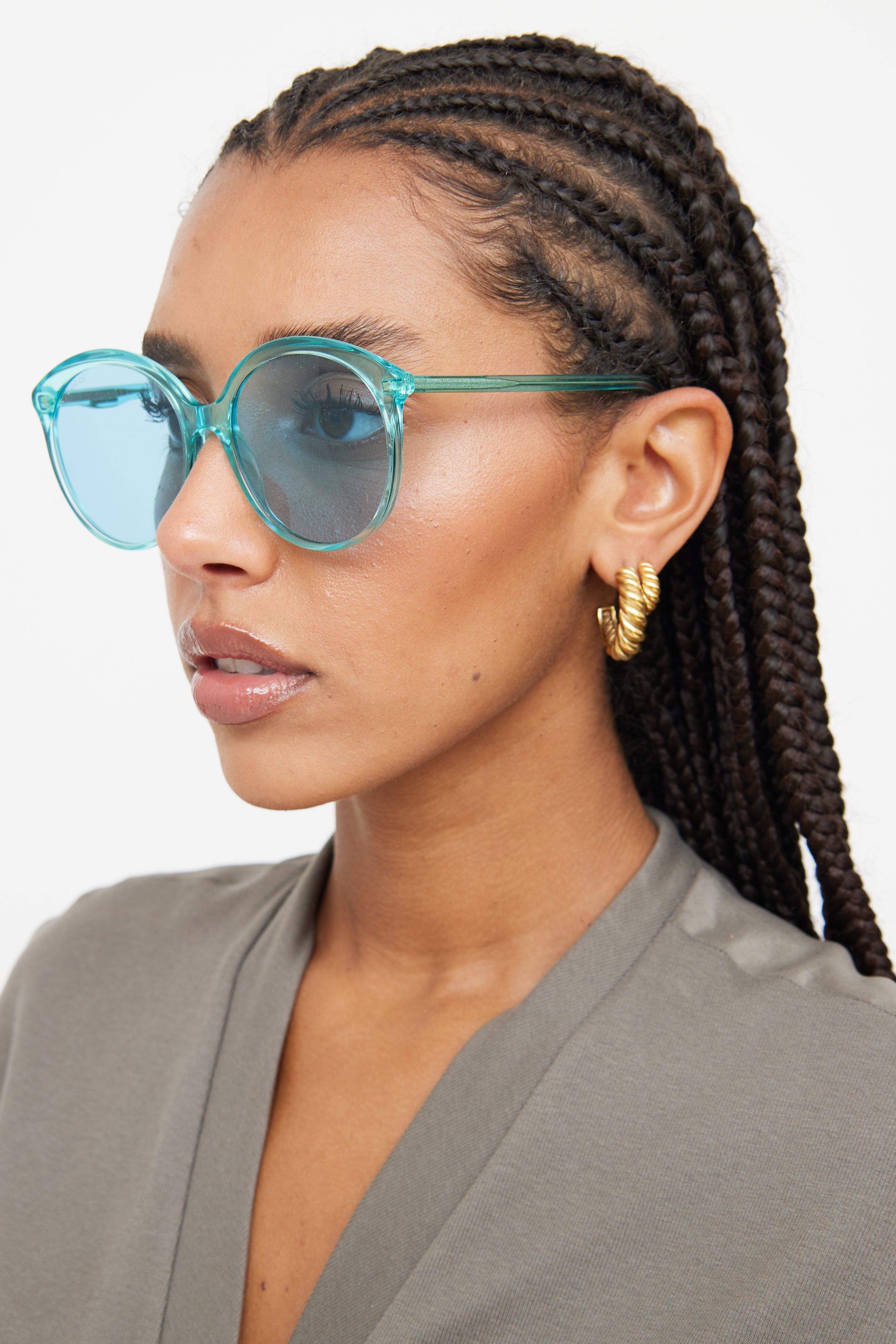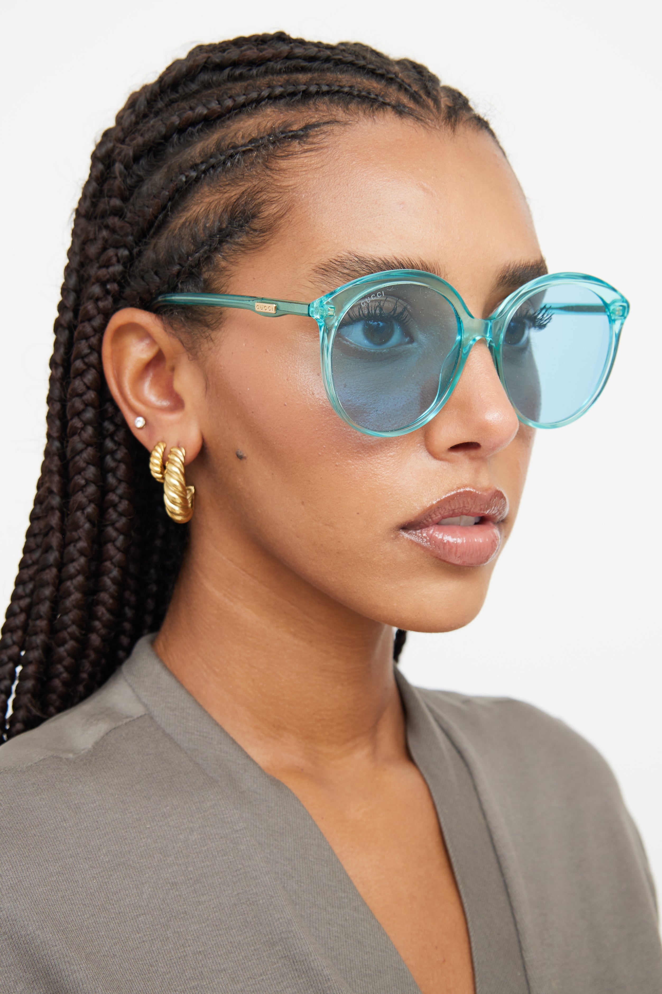 Pre-owned Gucci blue oversized GG0257S sunglasses featuring a rounded frame, blue translucent rims, blue tinted lenses, tonal temples with gold tone Gucci logo detailing and a saddle bridge.