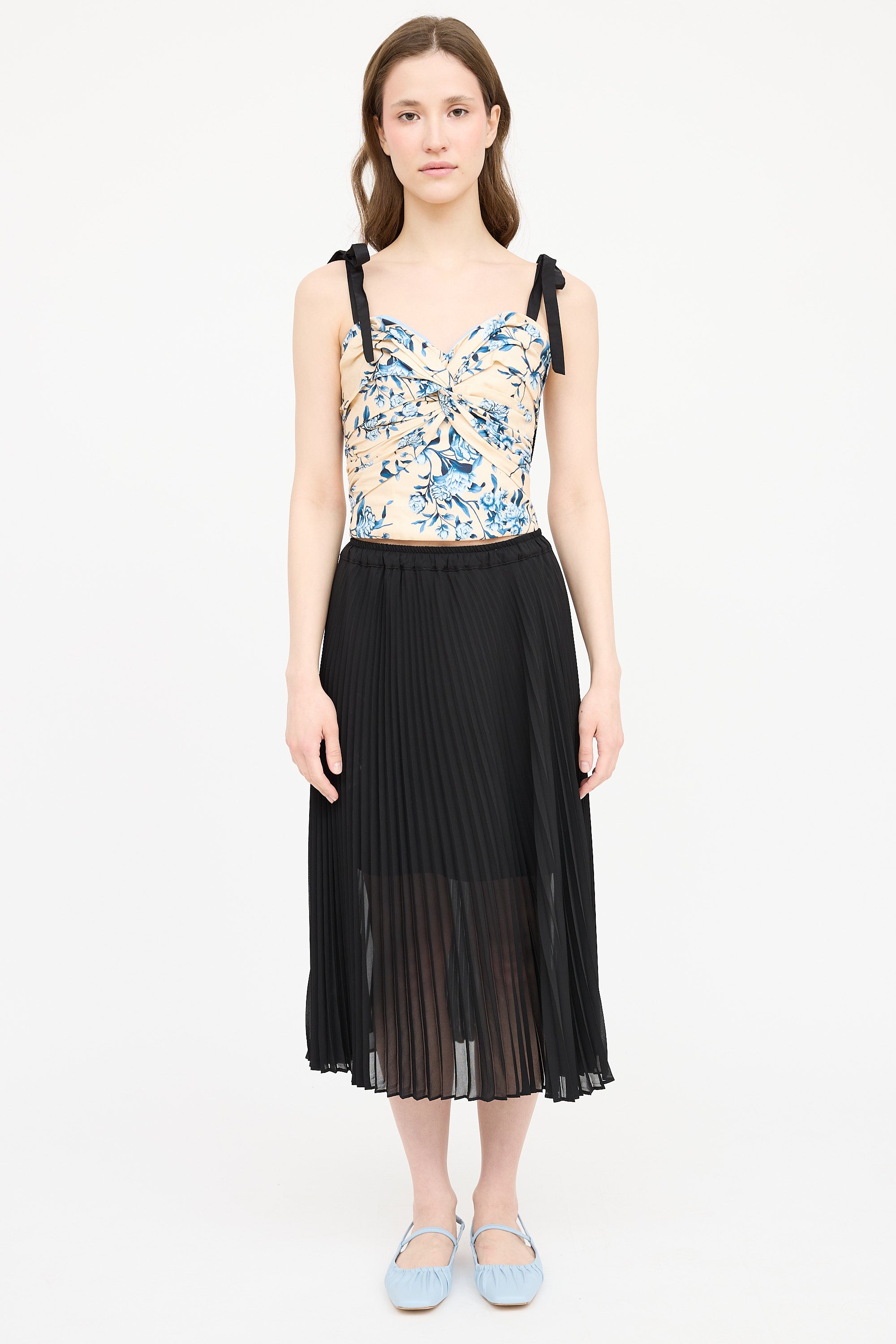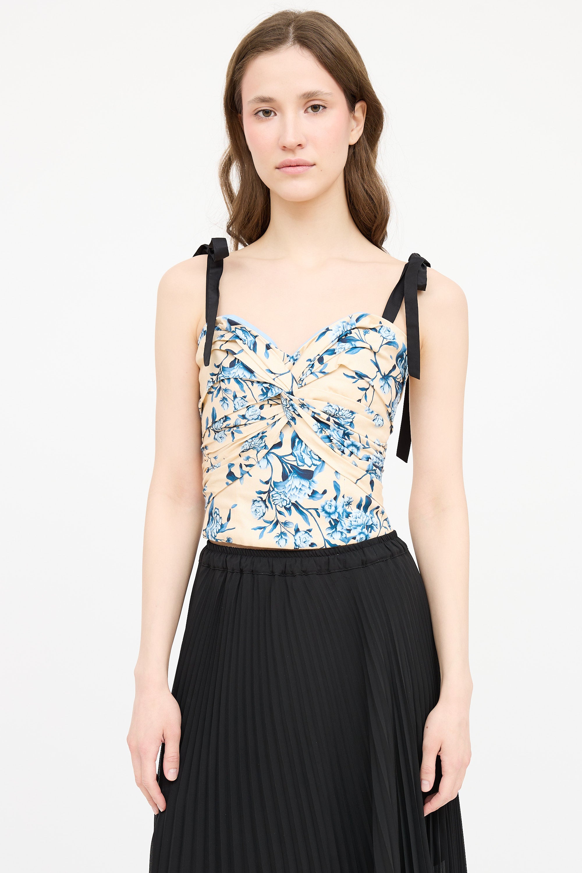 Pre-owned Johanna Ortiz cream and navy floral corset top featuring black tie straps, structured bust, sweetheart neckline with knotted detail, ruched pleating, and zip closure at back. Lined.