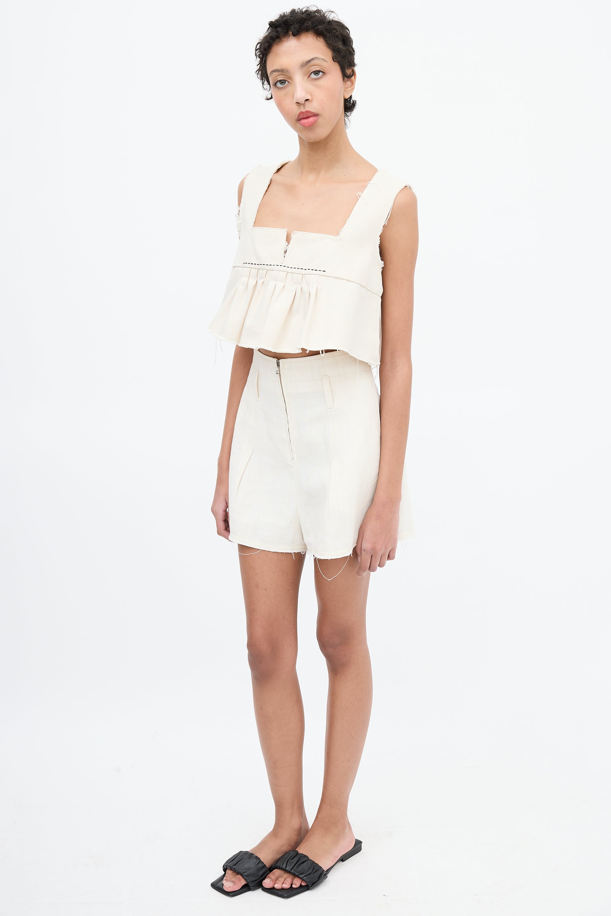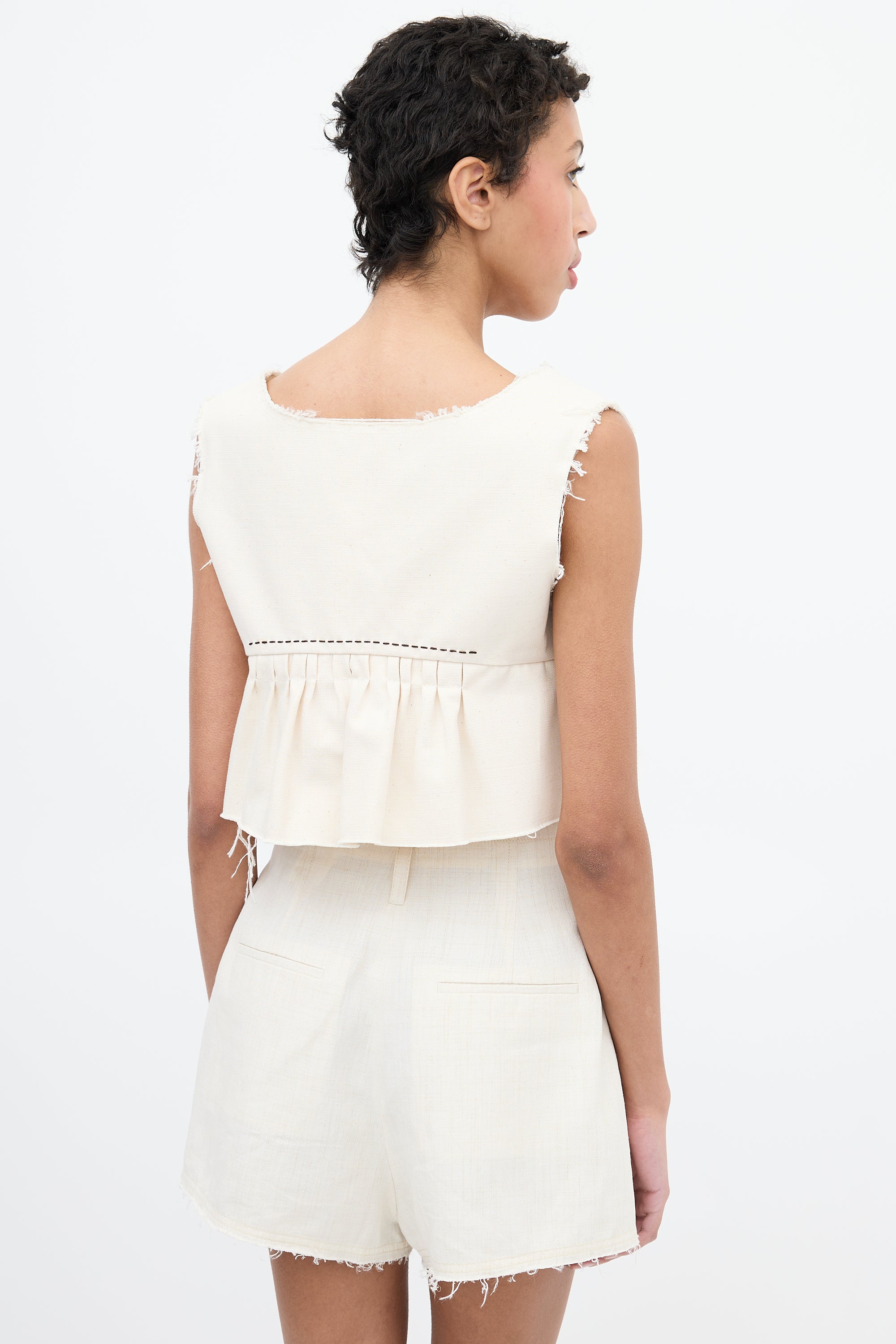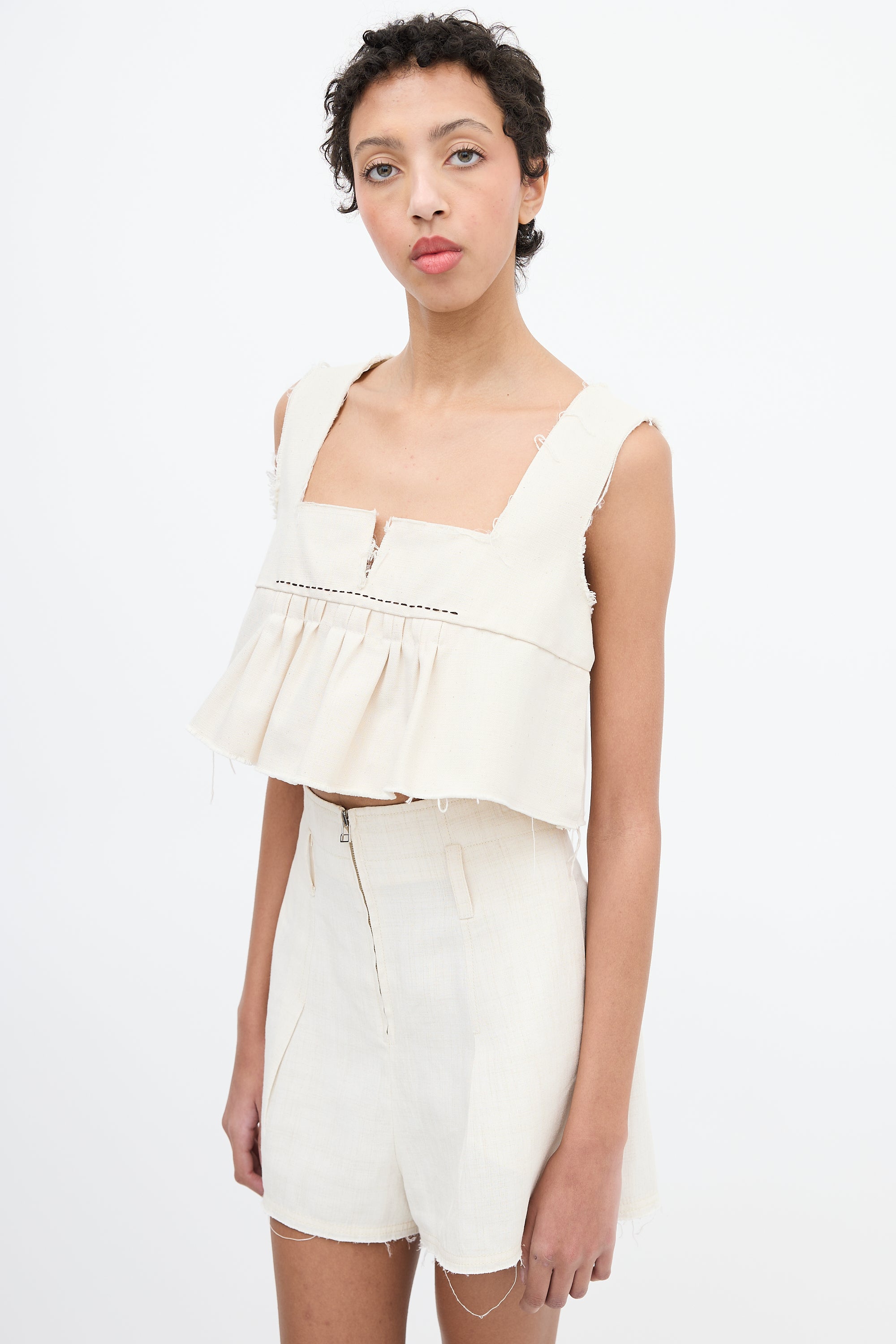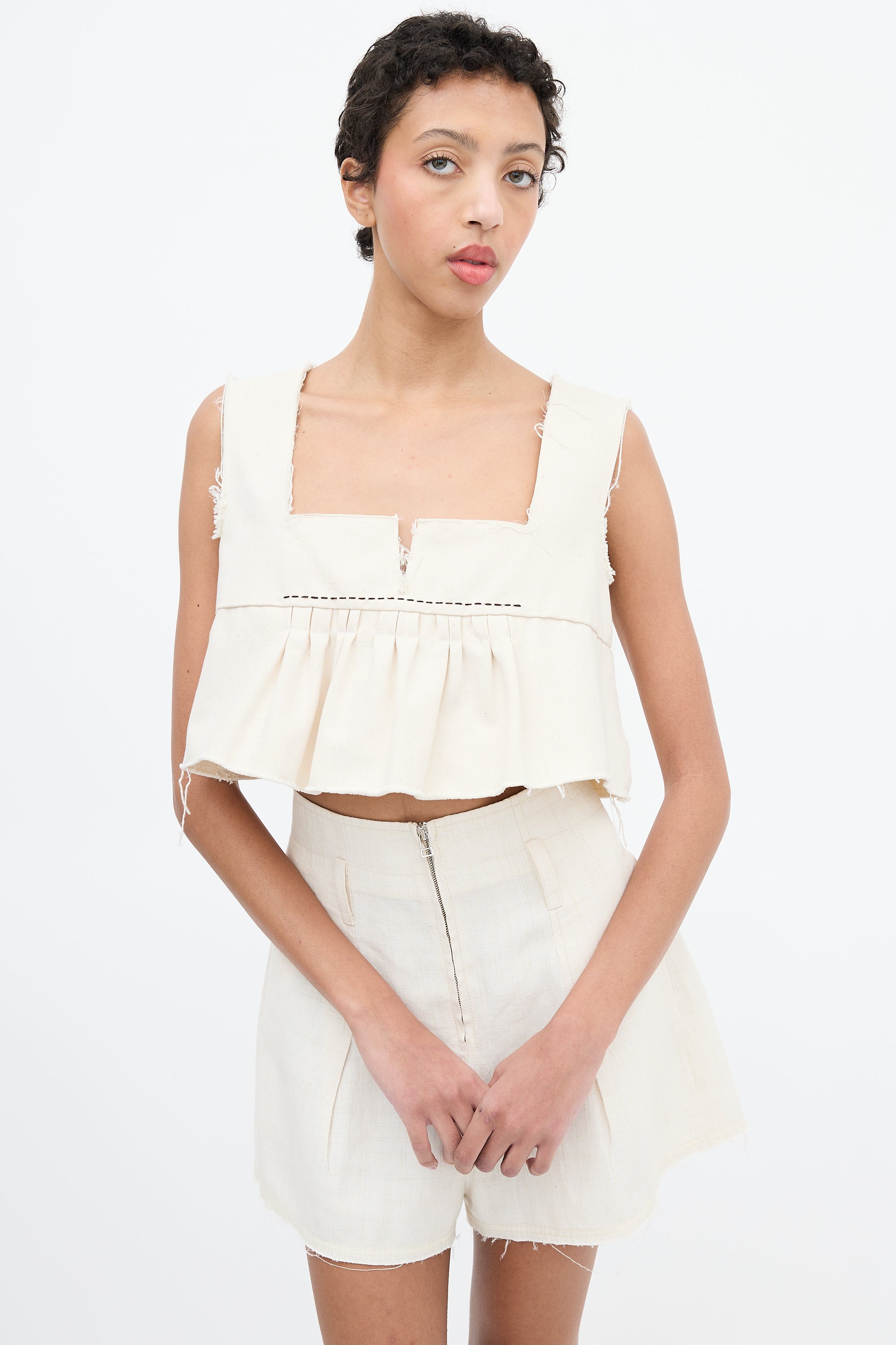 Pre-owned Miu Miu cream cotton canvas crop top featuring a square neckline with slit at centre front, black embroidered stitch detail across chest, pleated peplum design, raw edges, and concealed side snap button up closure. Lined.