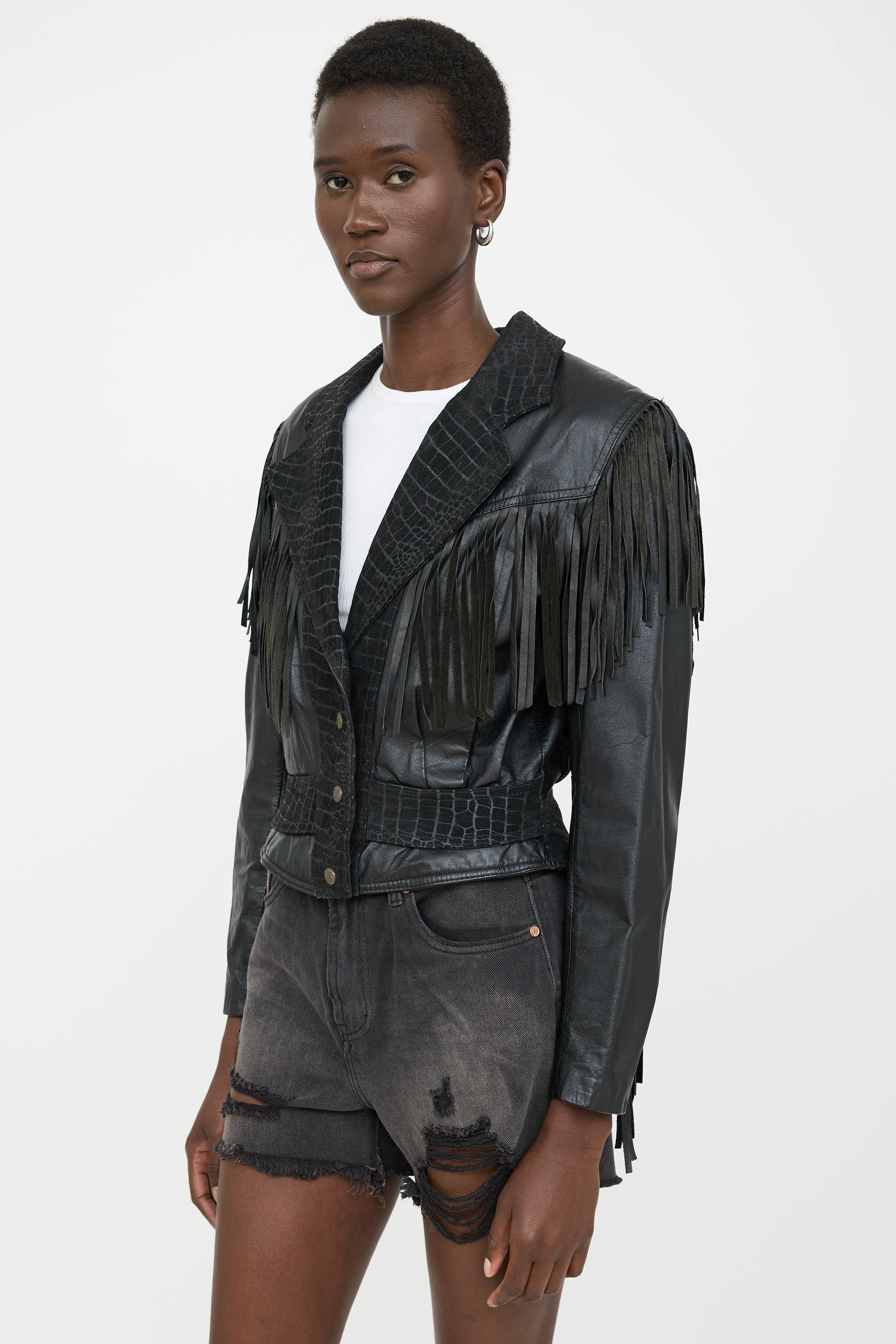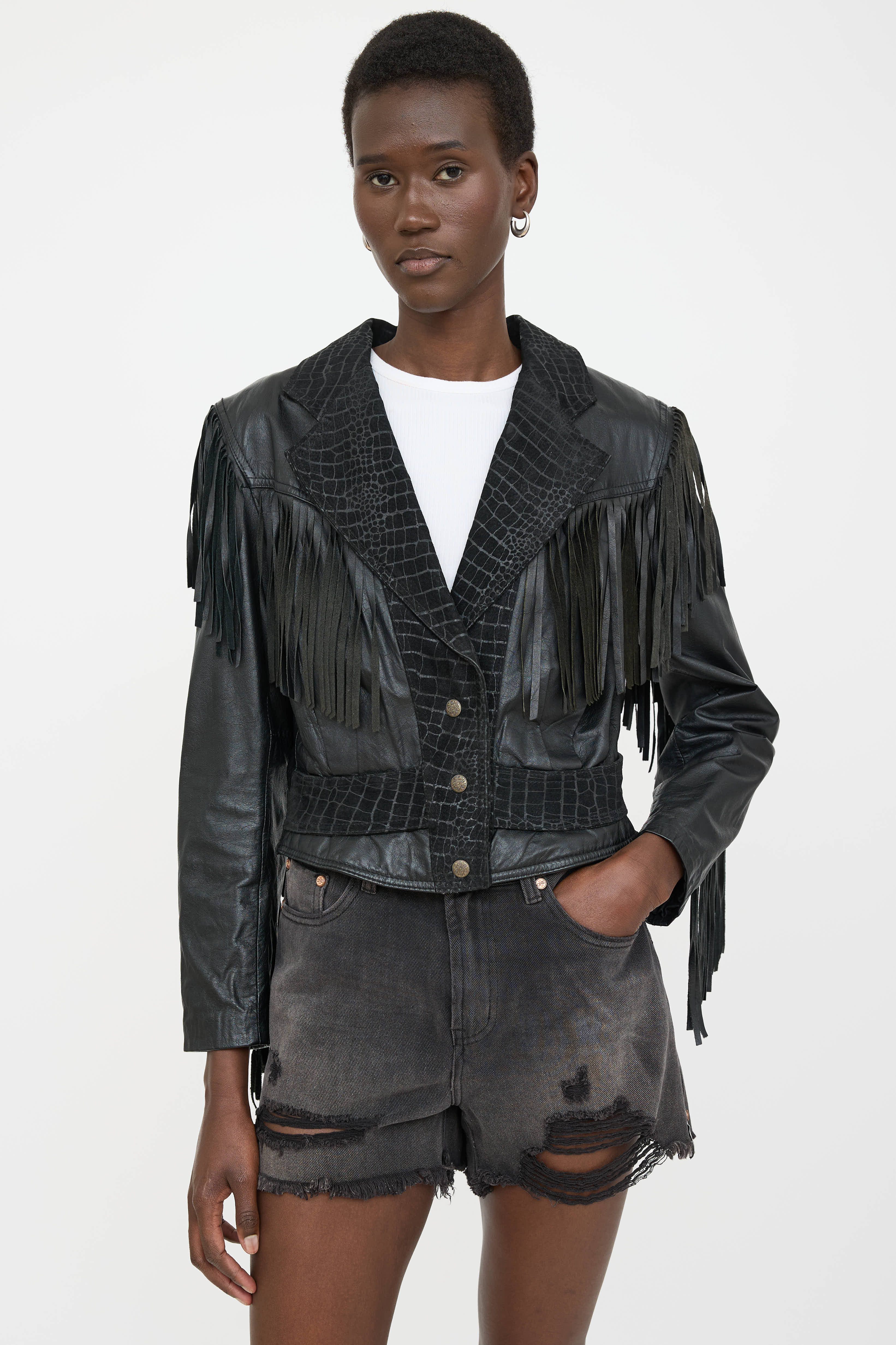 Pre-owned G3O black long sleeve leather jacket featuring notched lapel collar, fringe detail at shoulders and at sleeve, snap button closure, and croc suede paneling throughout.
