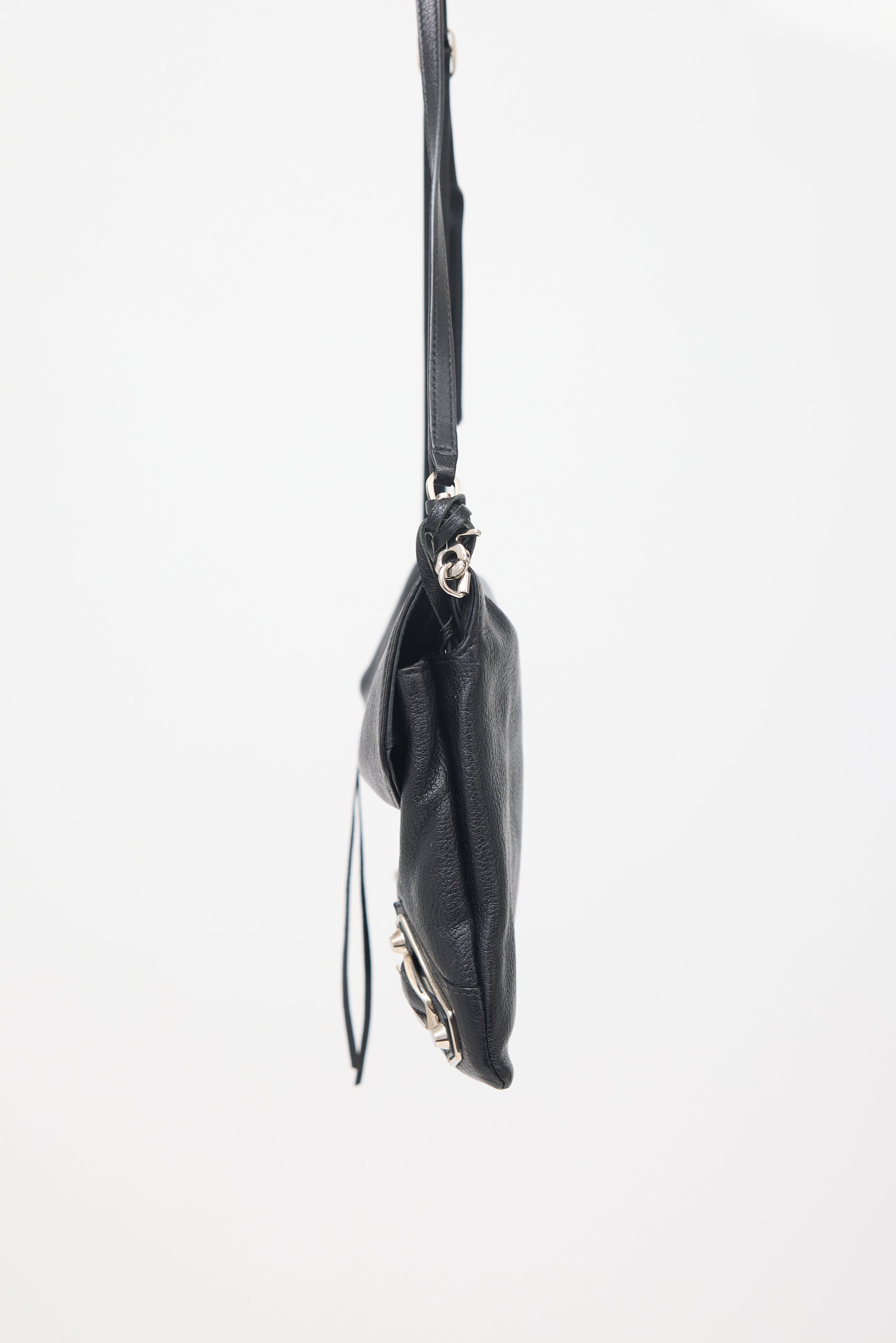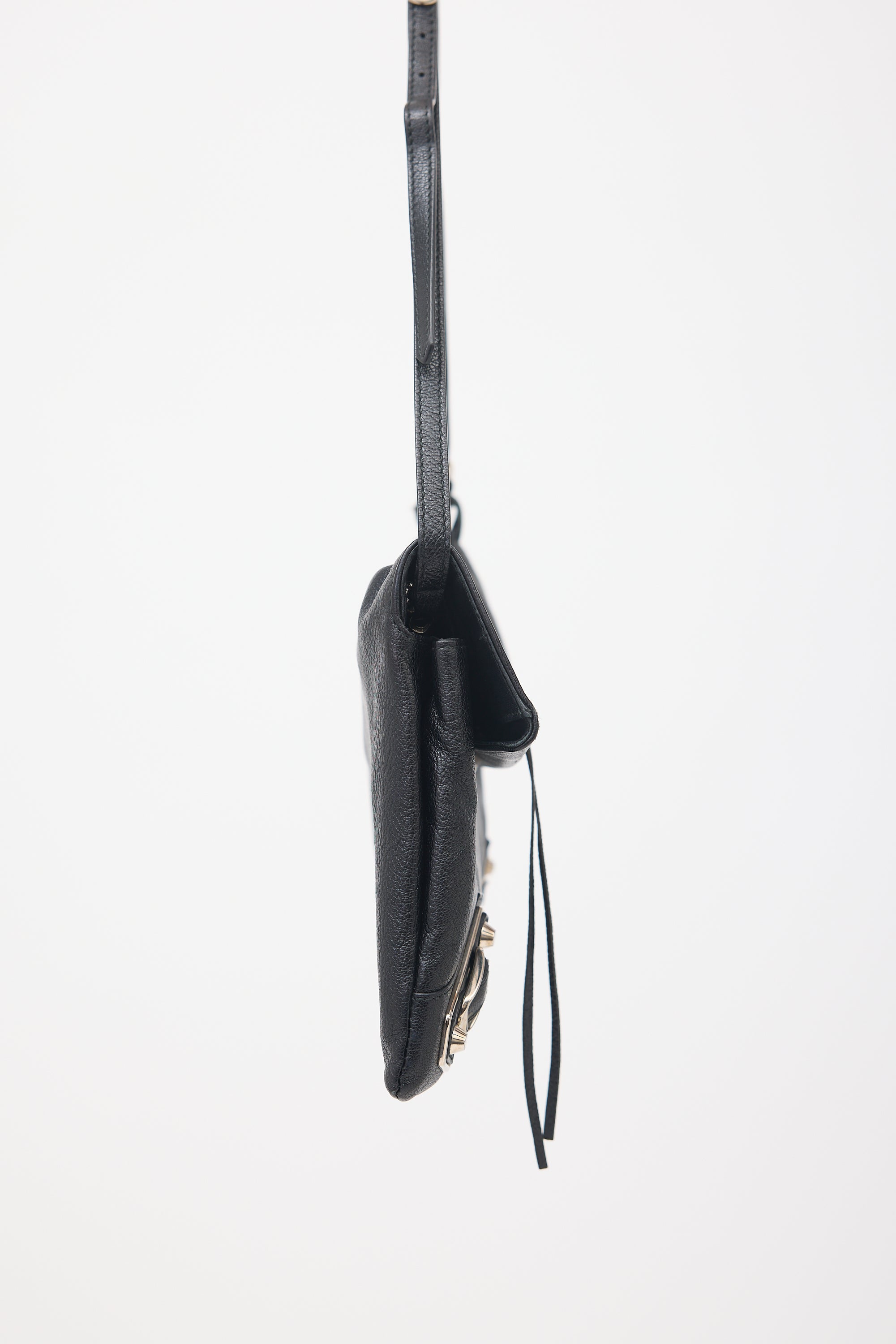 Pre-owned Balenciaga black leather City clutch bag featuring silver tone hardware, signature studs and buckles, front zip pocket with leather tassel, top flap with magnetic closure, detachable and adjustable shoulder strap, mirror charm, two main compartments, and one interior zip pocket.