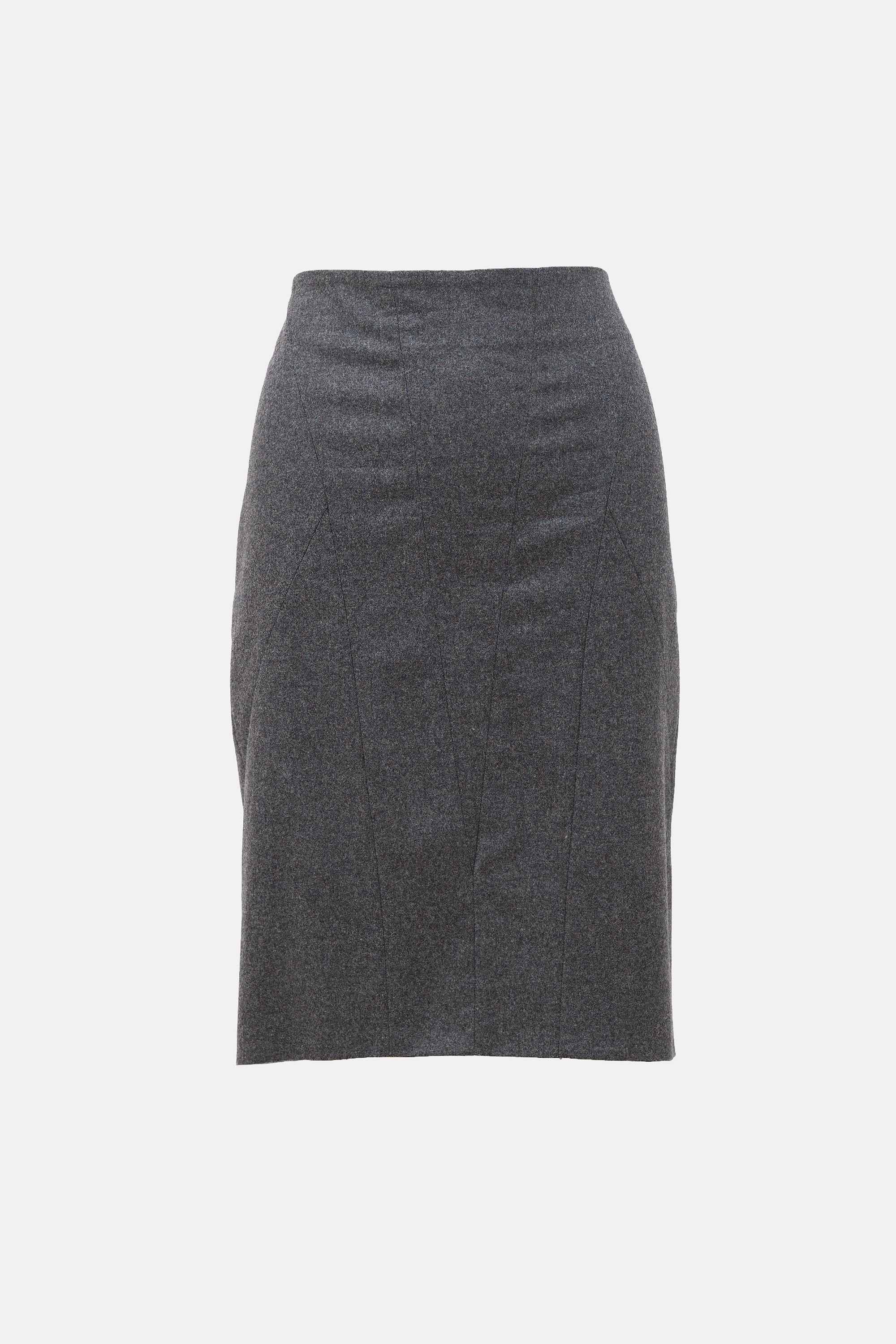 Pre-owned Brunello Cucinelli dark grey wool midi pencil skirt featuring high waist, back vent, and back zip closure. Lined.