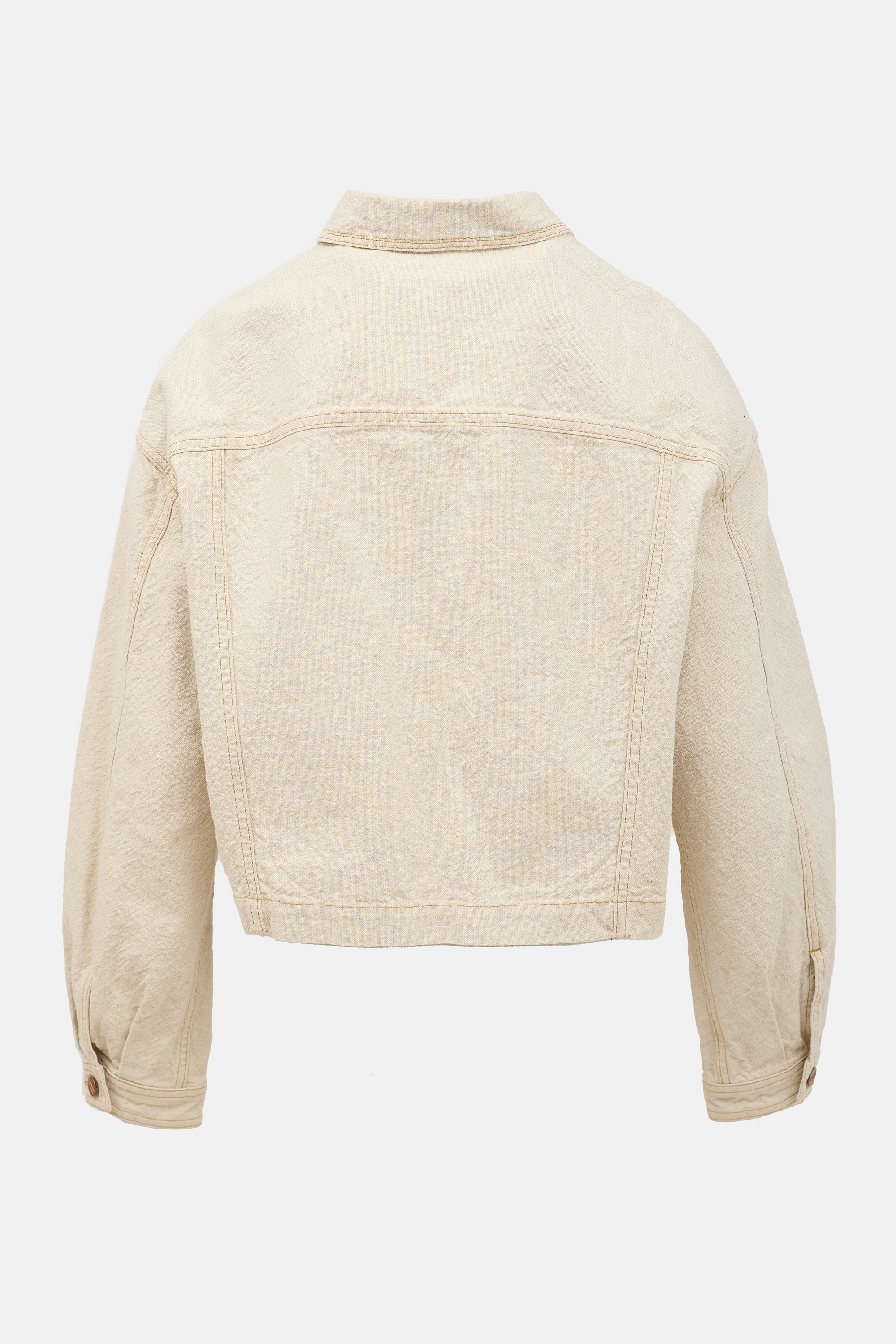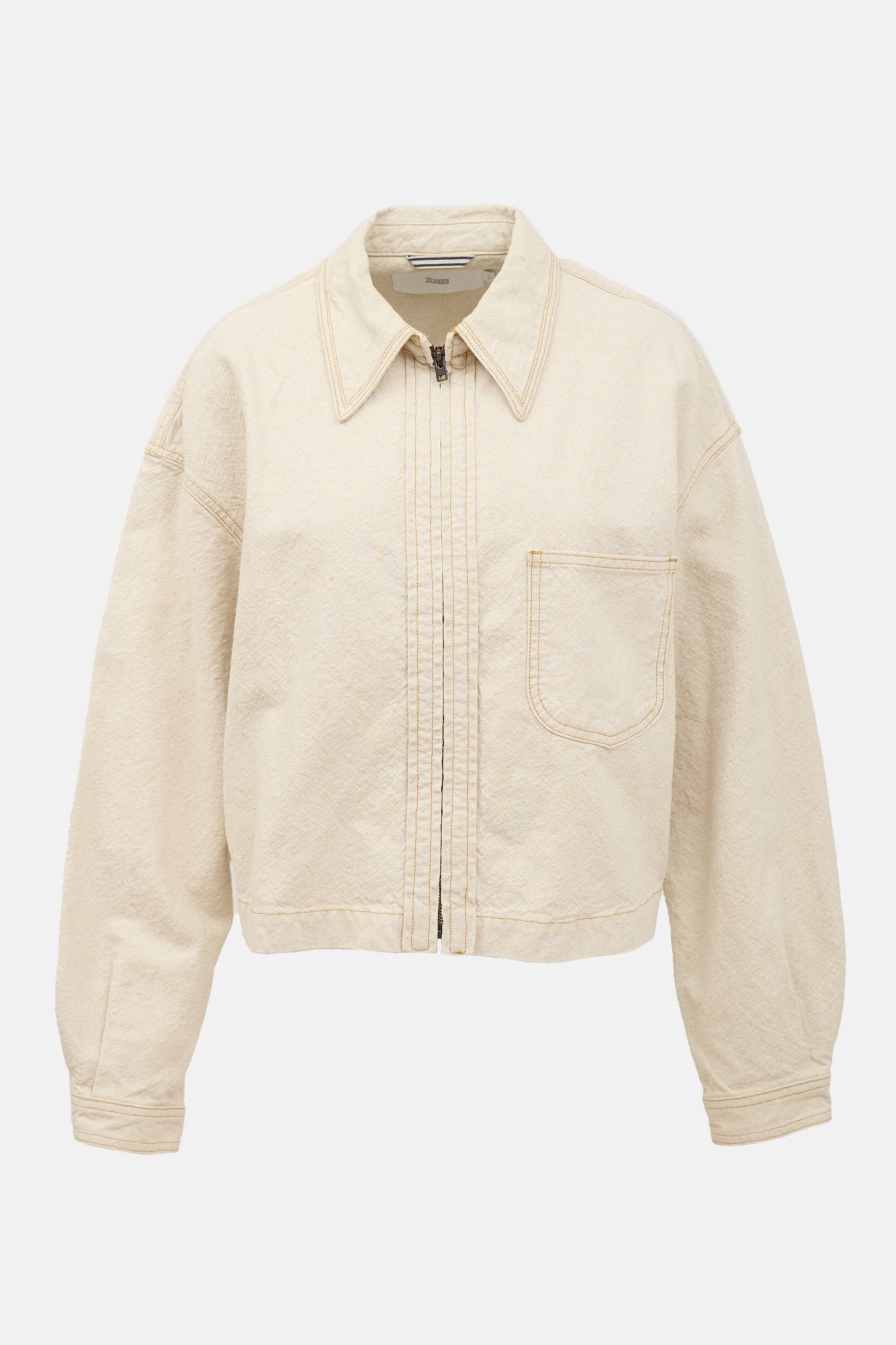 Pre-owned Closed beige denim jacket featuring point collar, zip up front, patch pocket at left chest, and buttoned cuffs with pleating.