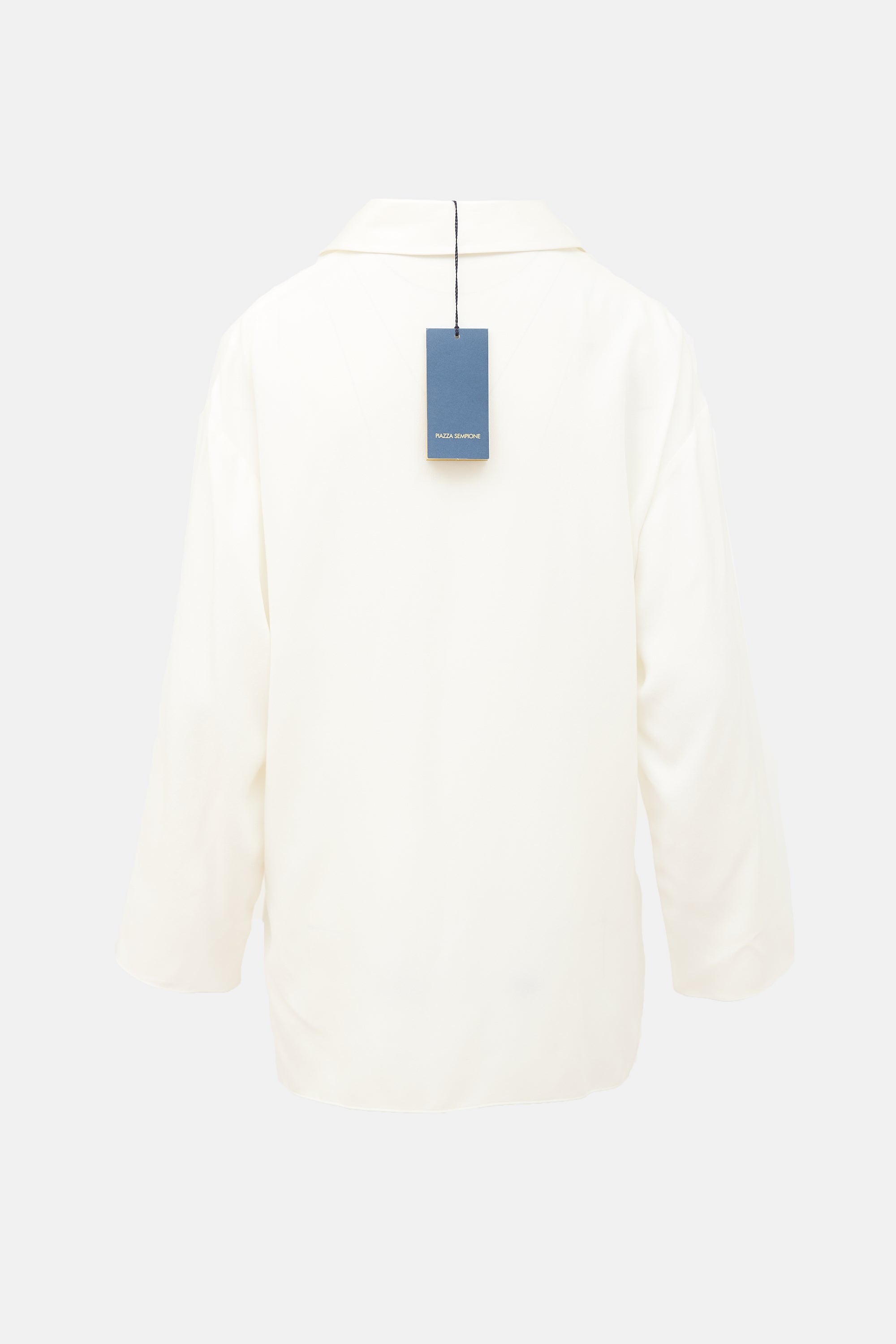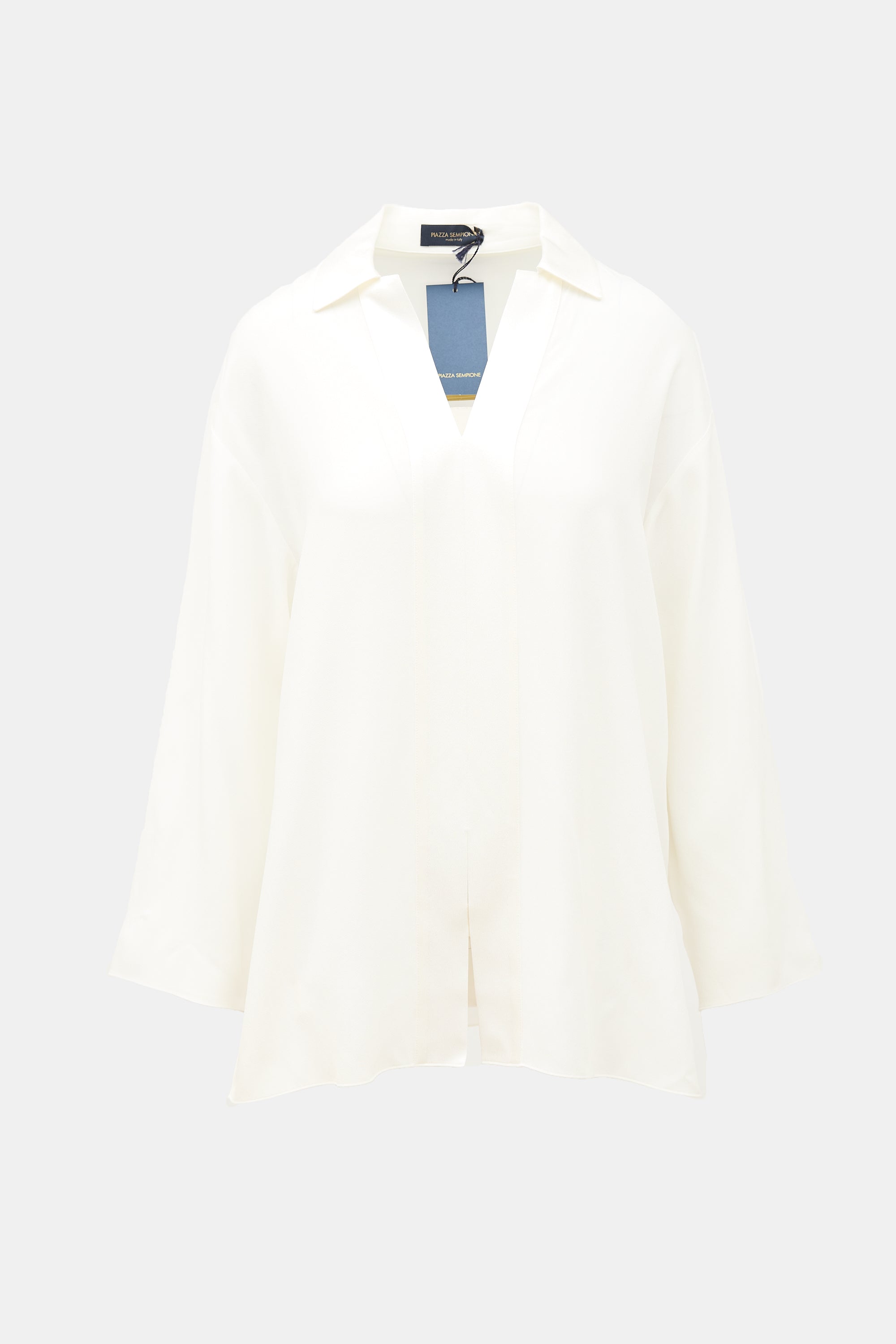 Pre-owned Piazza Sempione white satin tunic blouse featuring split neckline with collar, split front, and side vents.