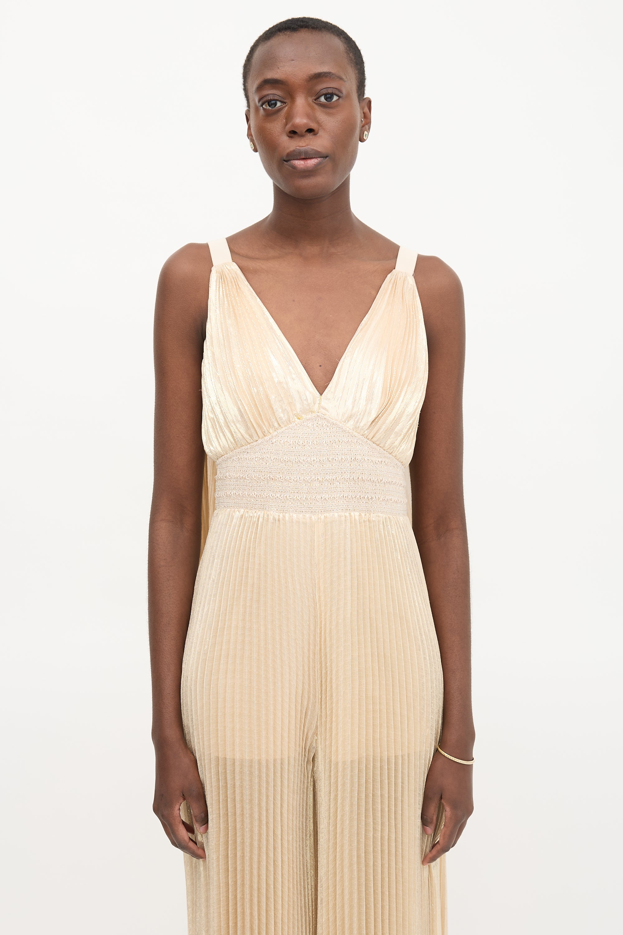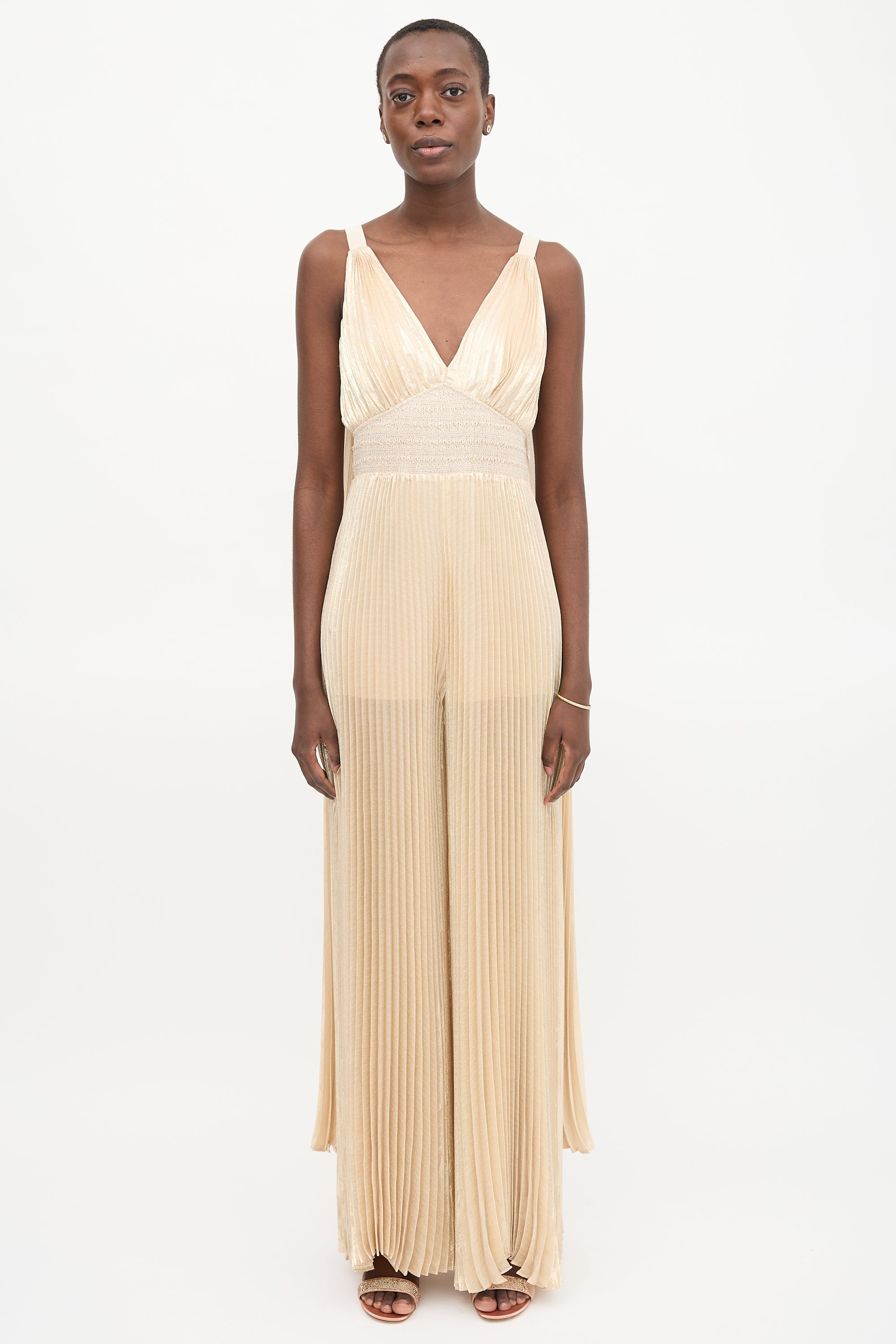 Pre-owned Alice + Olivia beige and gold metallic silk blend plissé Rosalie jumpsuit featuring a V-neckline, back zip closure, smocked waist, detachable cape, and wide leg. Partially lined.
