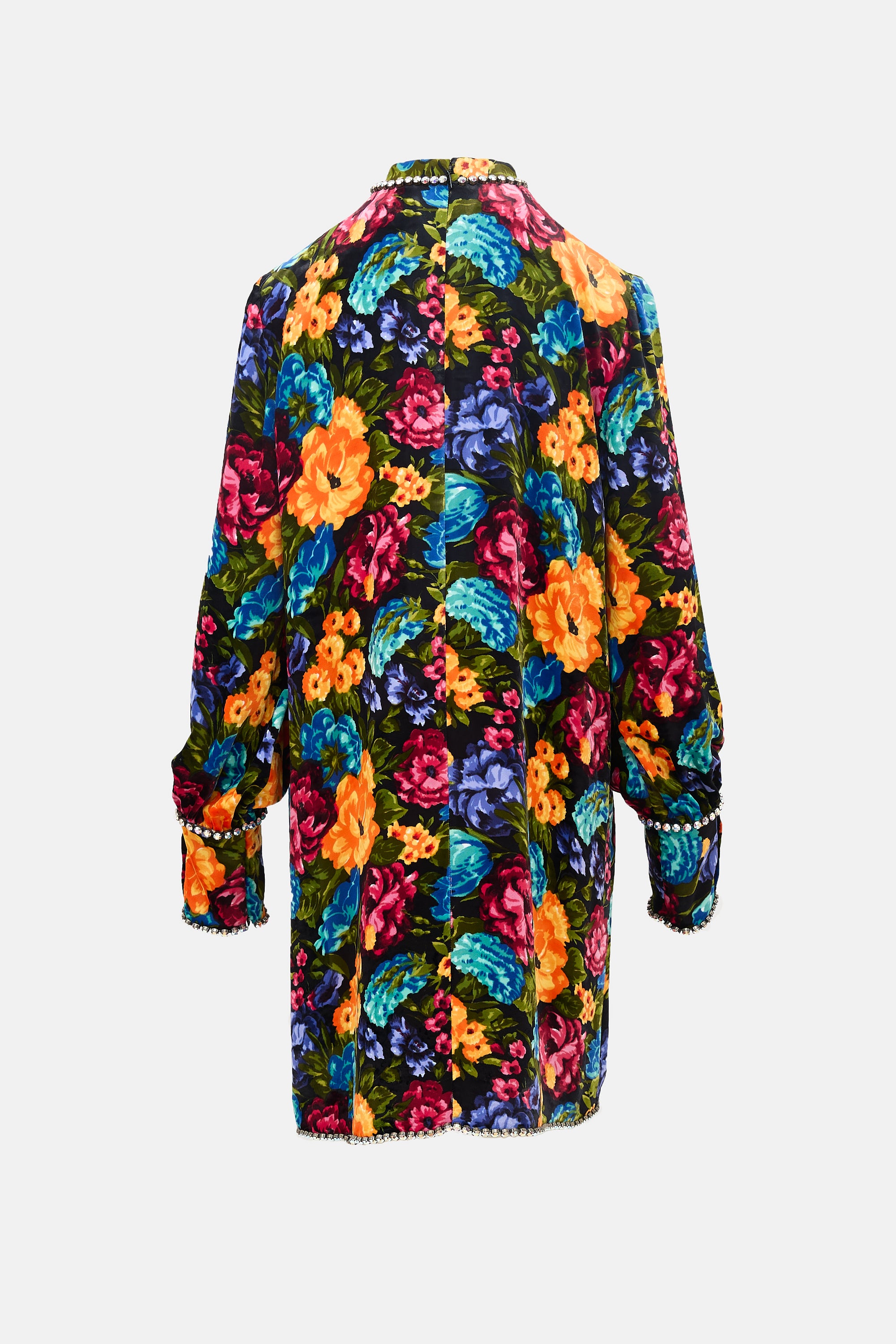 Pre-owned Gucci 2017 black and multicolour velvet dress featuring floral print, mock neckline, crystal embellished trim edges, attached navy bow tie, and zip closure. Alessandro Michele era design.