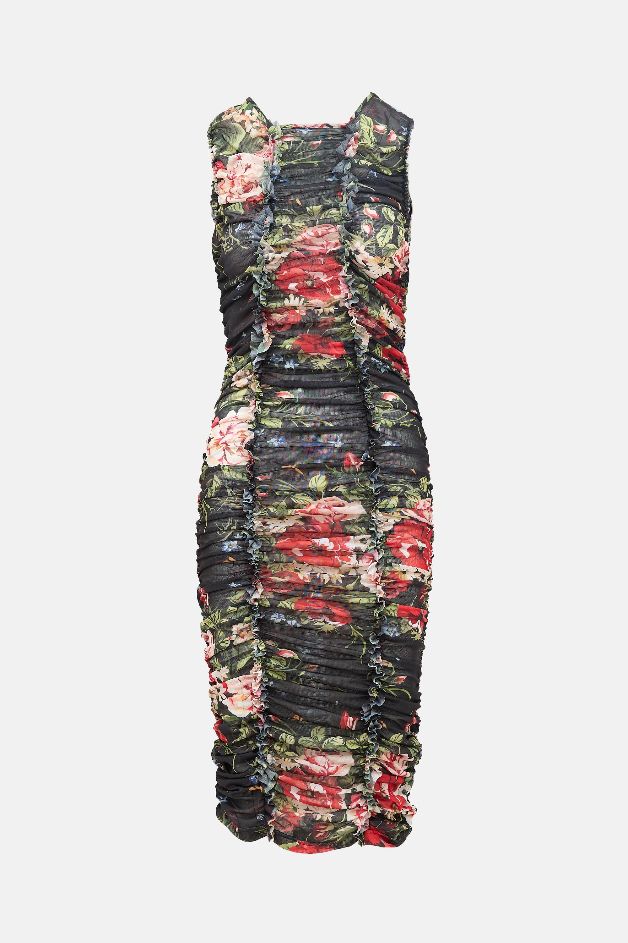 Pre-owned Molly Goddard black and multicolour mesh dress featuring floral print, crew neckline, and ruching throughout.