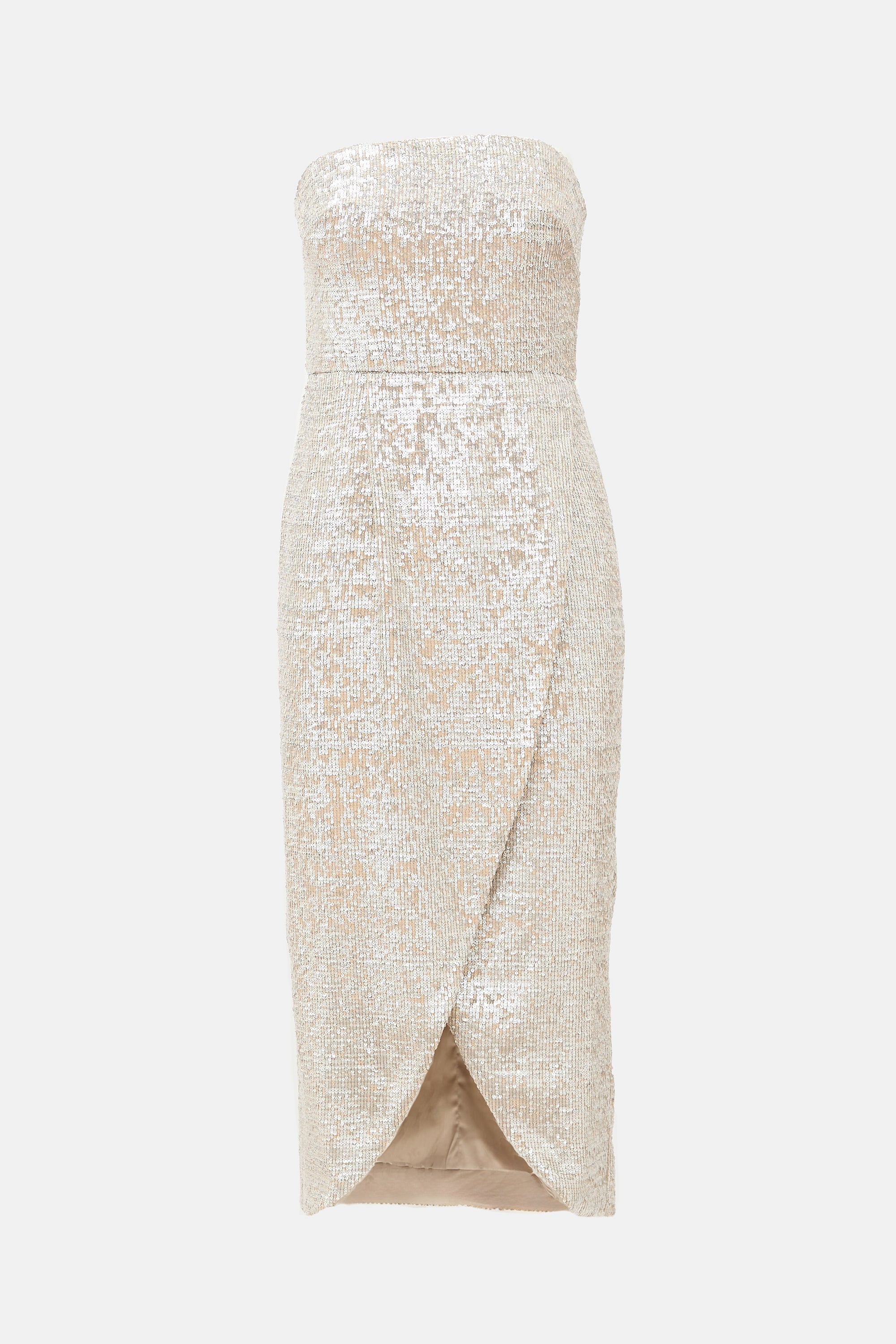 Pre-owned Monique Lhuillier beige sequin strapless dress featuring square neckline, front slit, and zip closure at back. Lined.