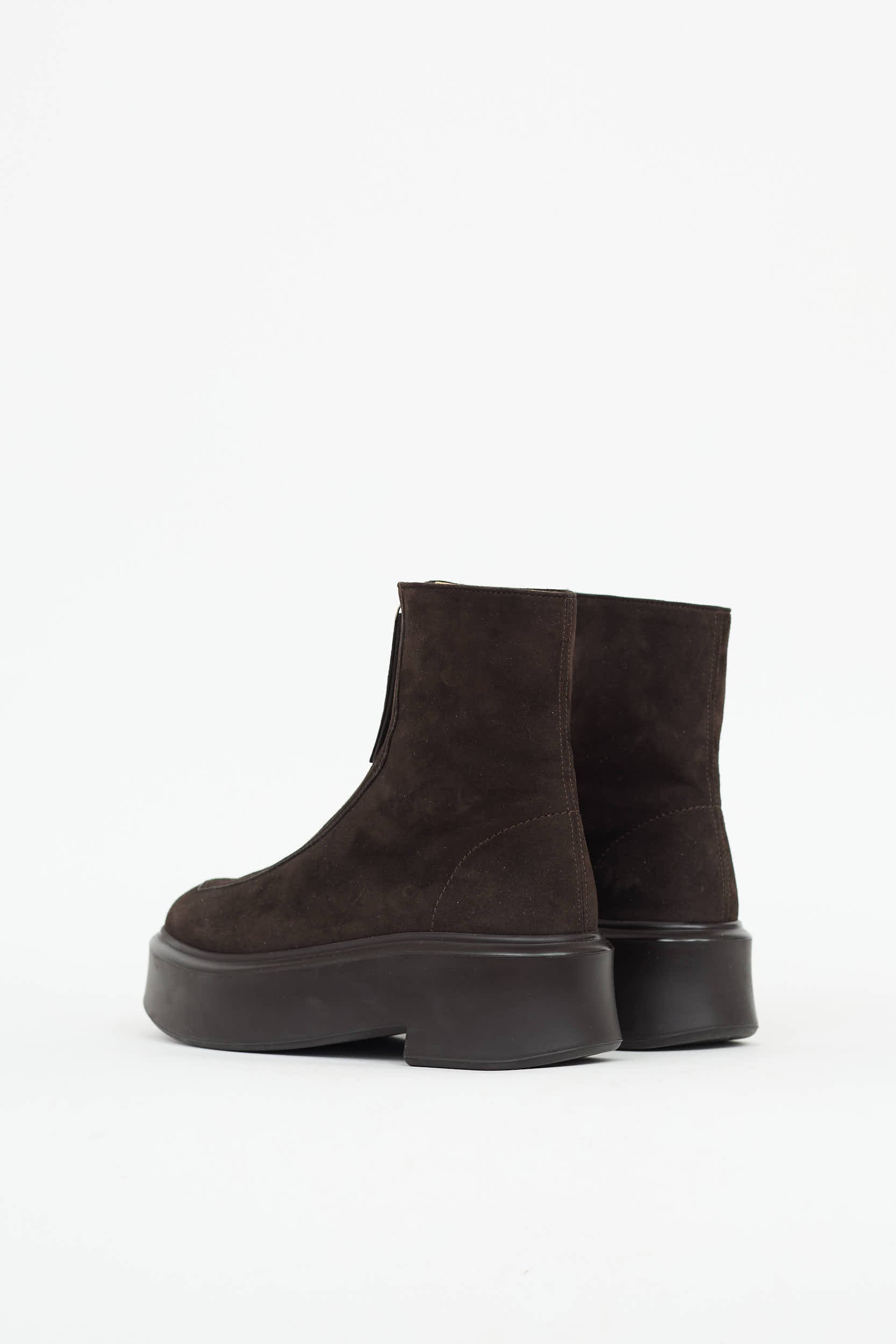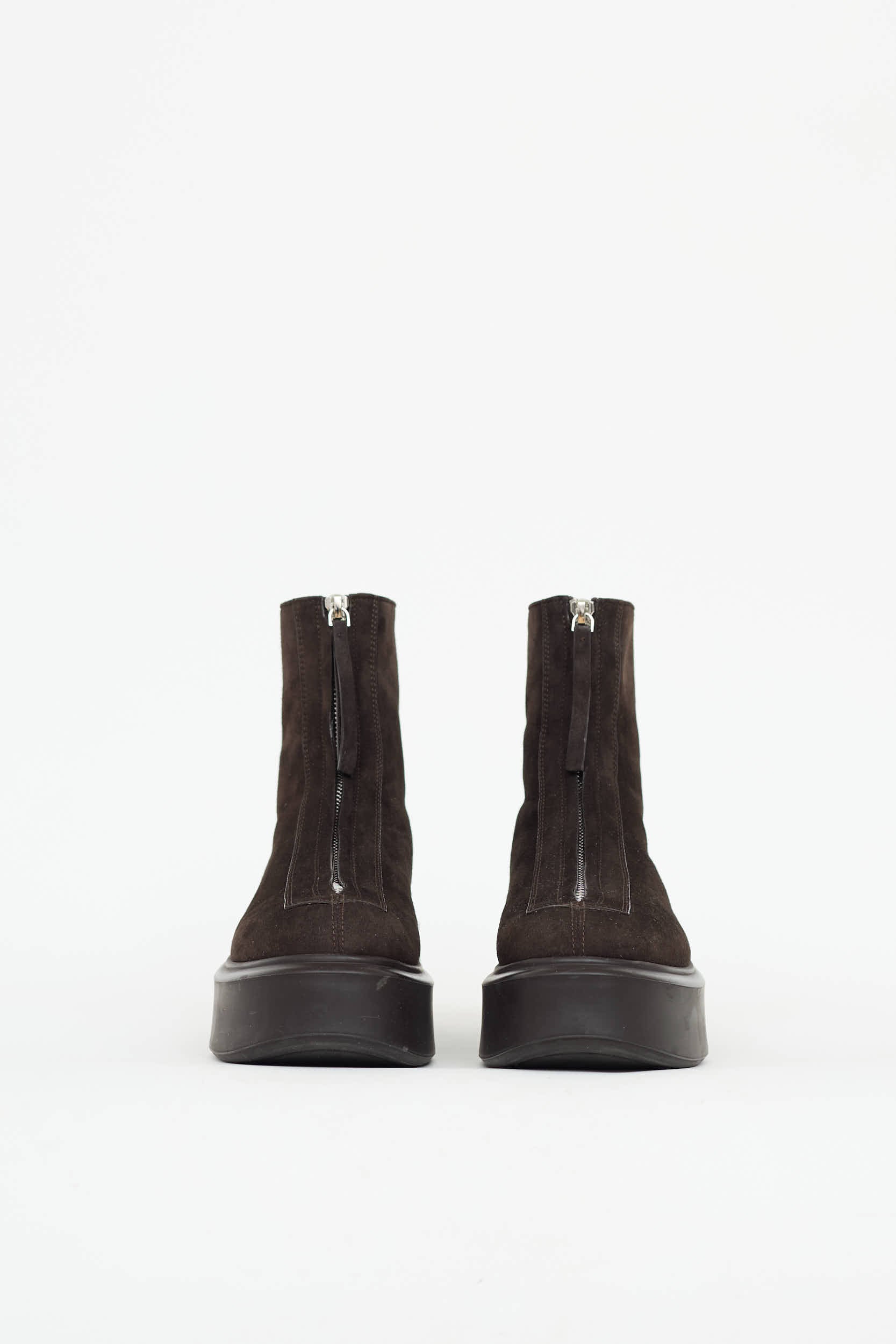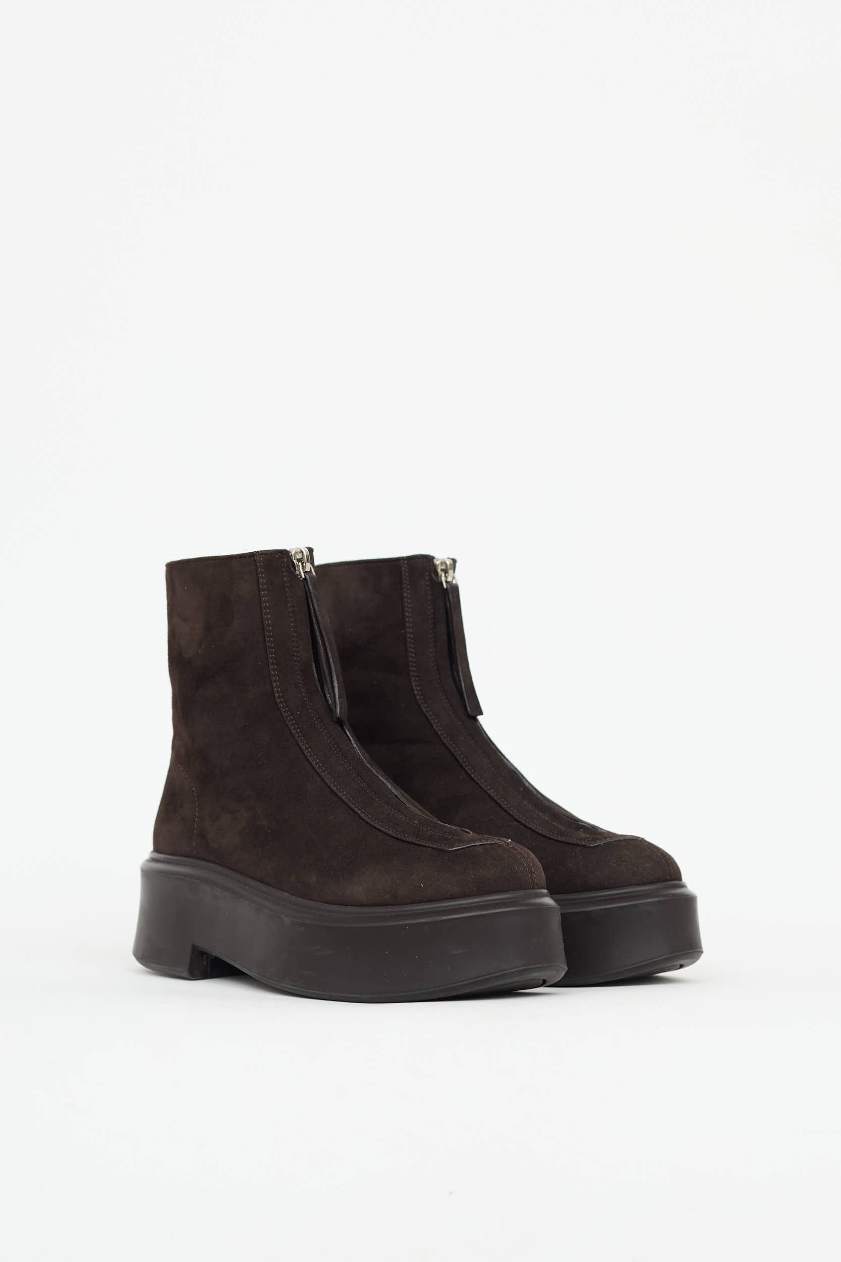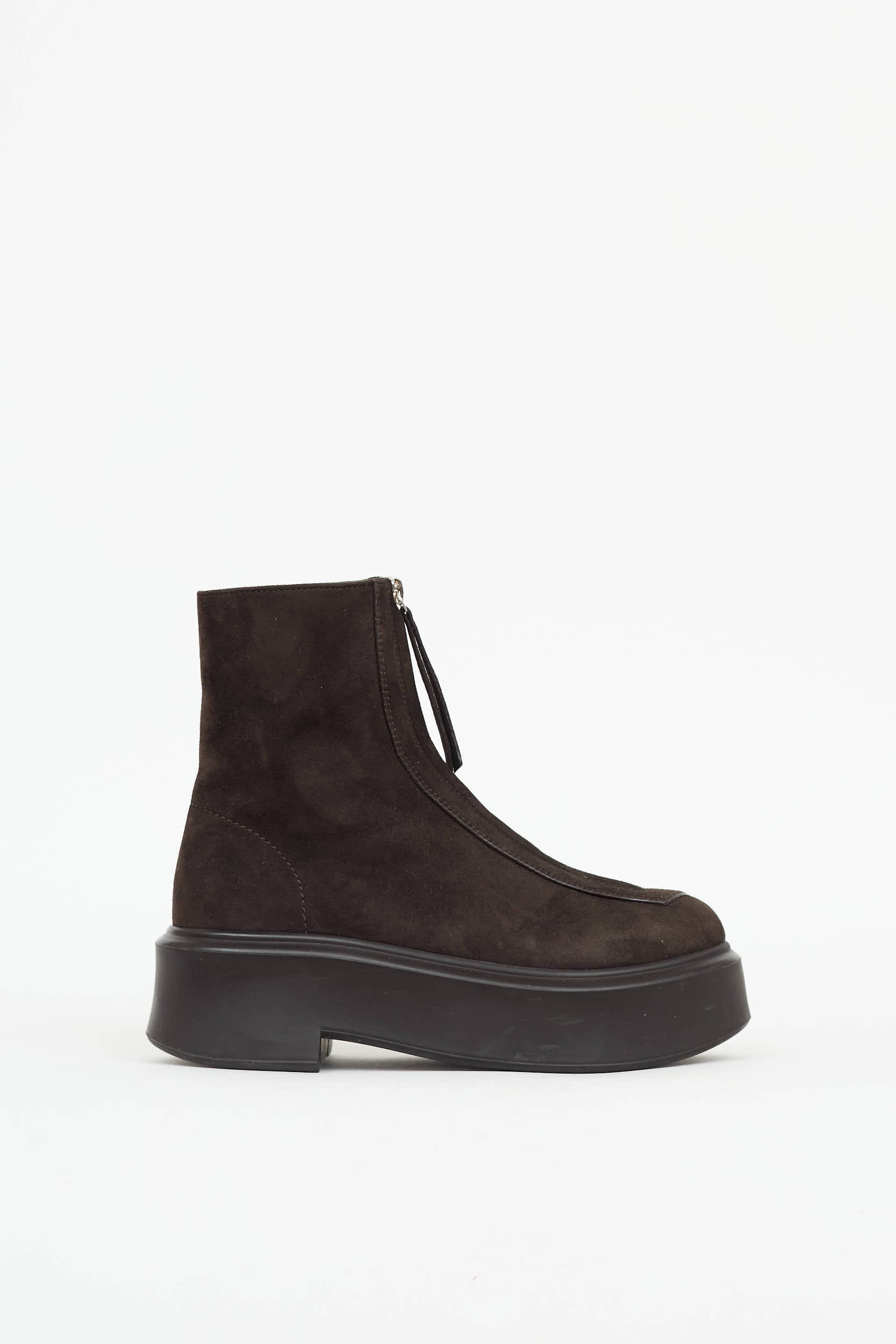 Pre-owned The Row brown Zipped ankle boot featuring rounded toe, suede upper, platform midsole, and zip front.