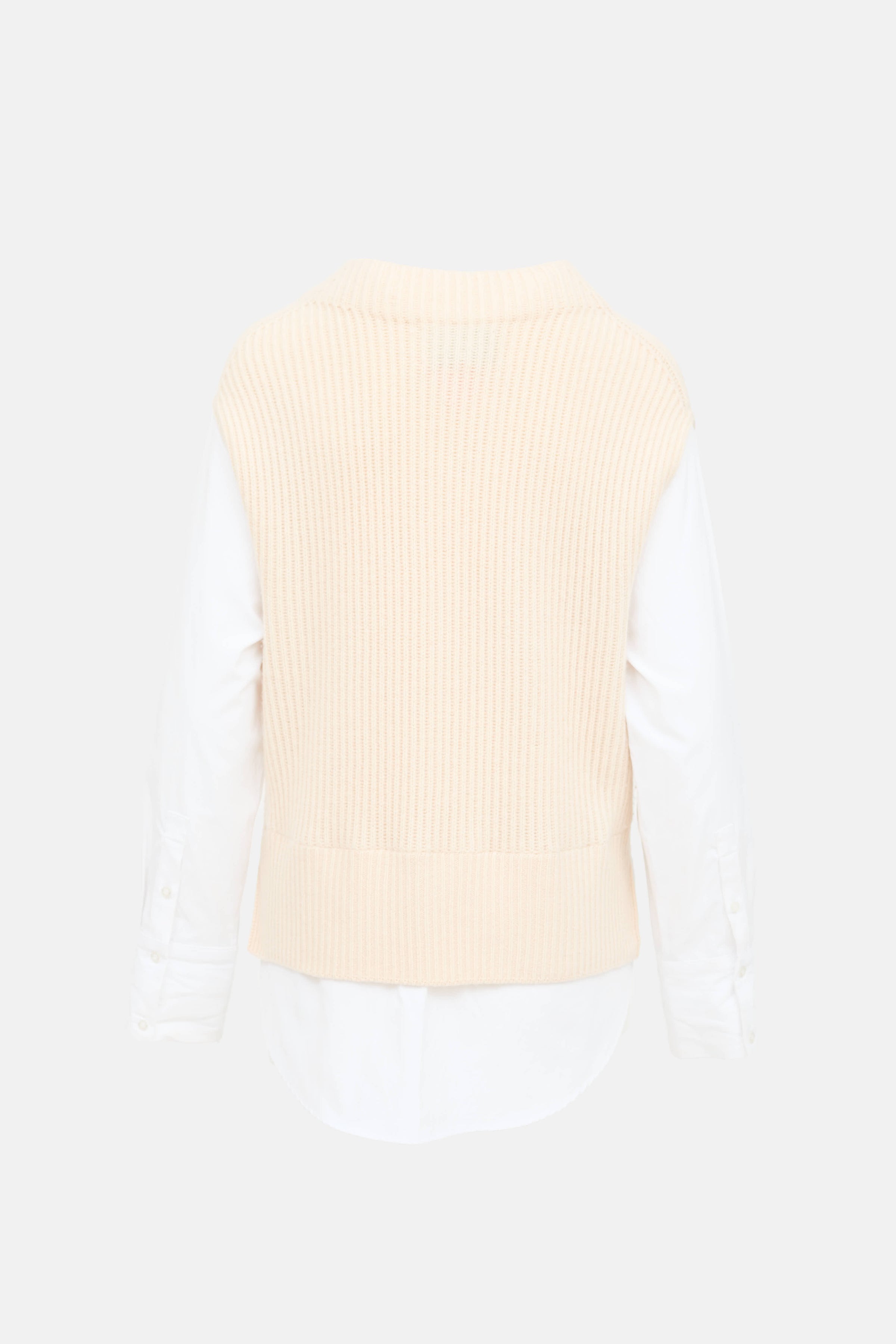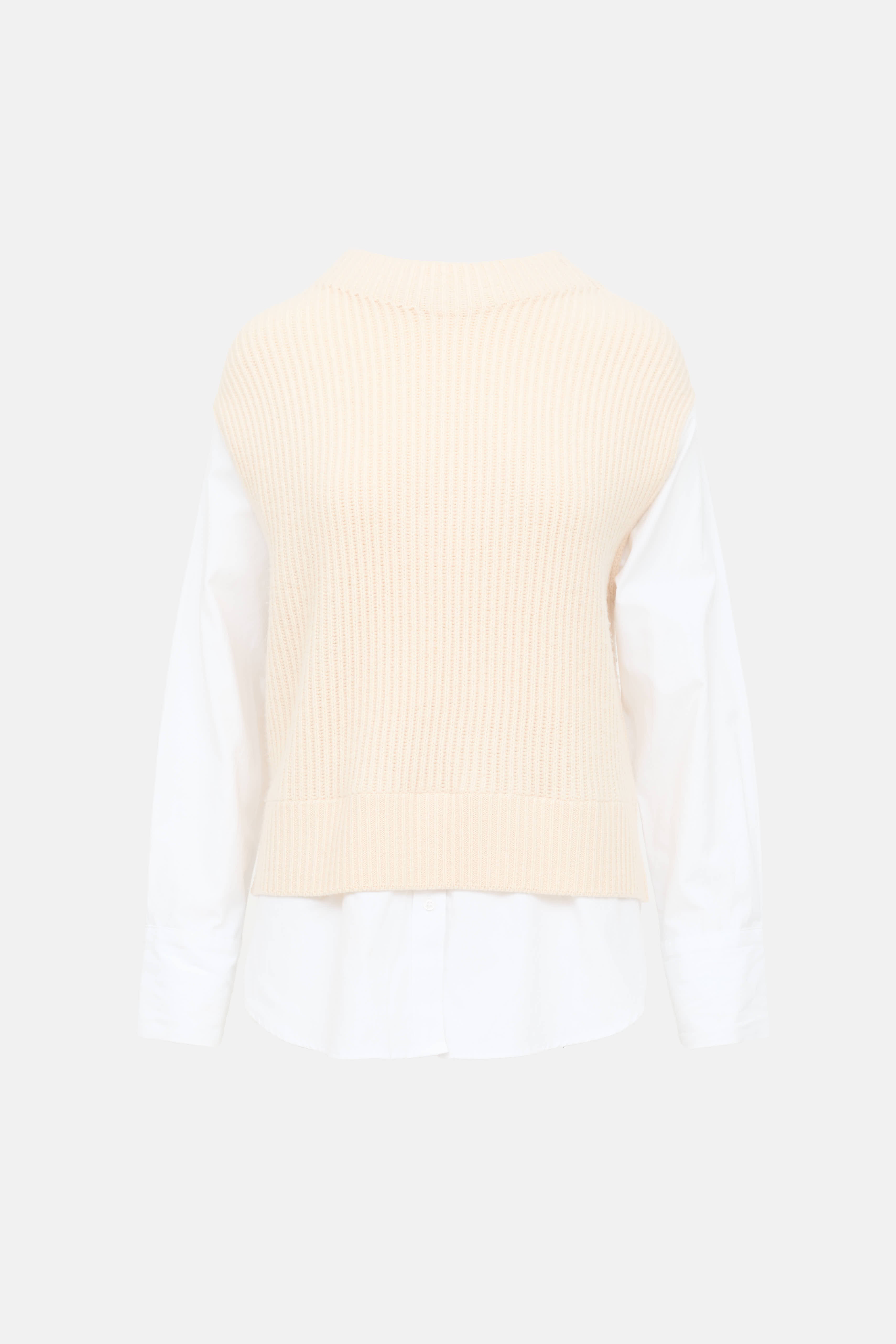 Pre-owned Brochu Walker cream Joni wool knit sweater featuring a white layered contrast shirt, crew neckline, long sleeves, and ribbed hem.