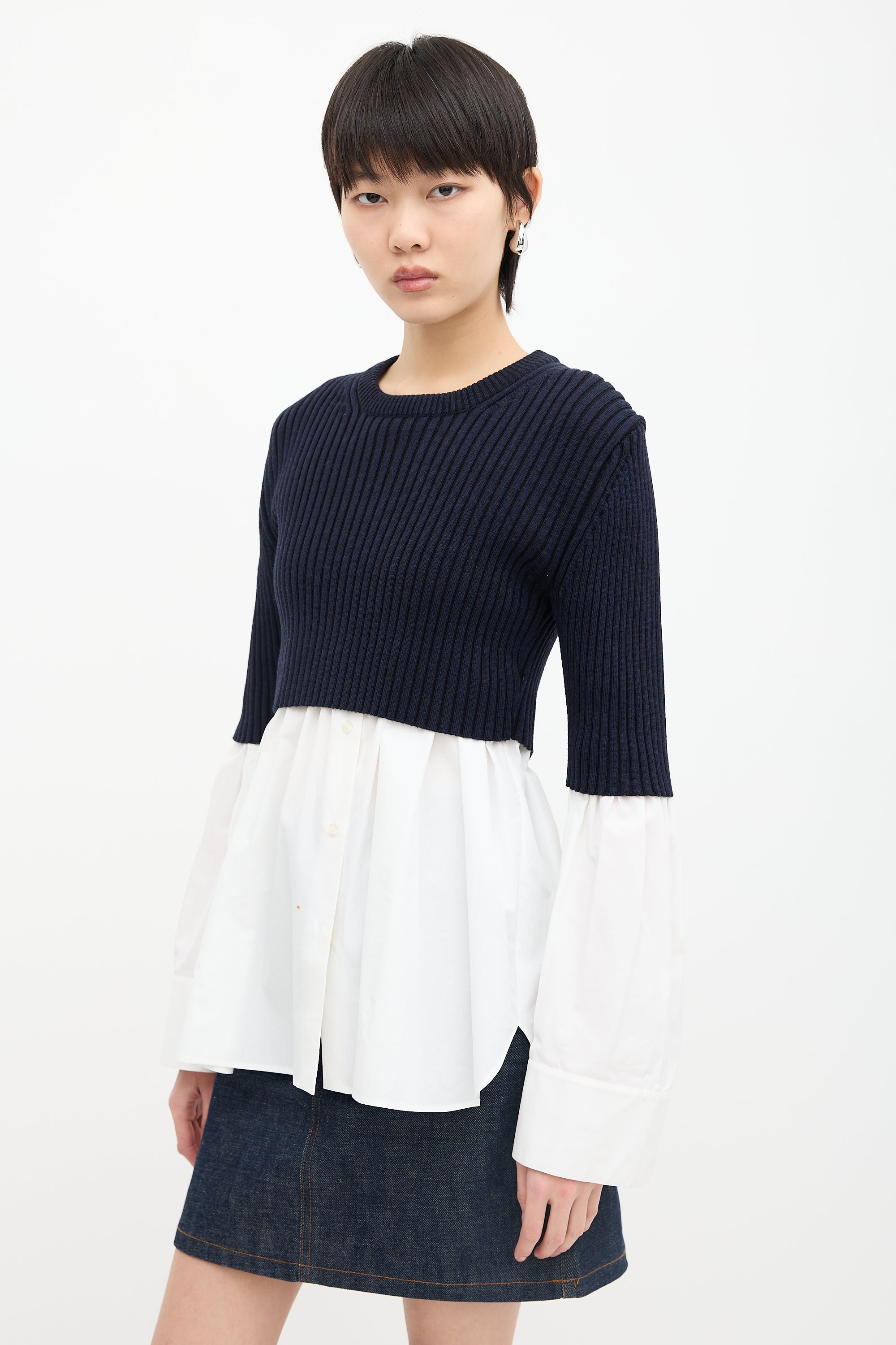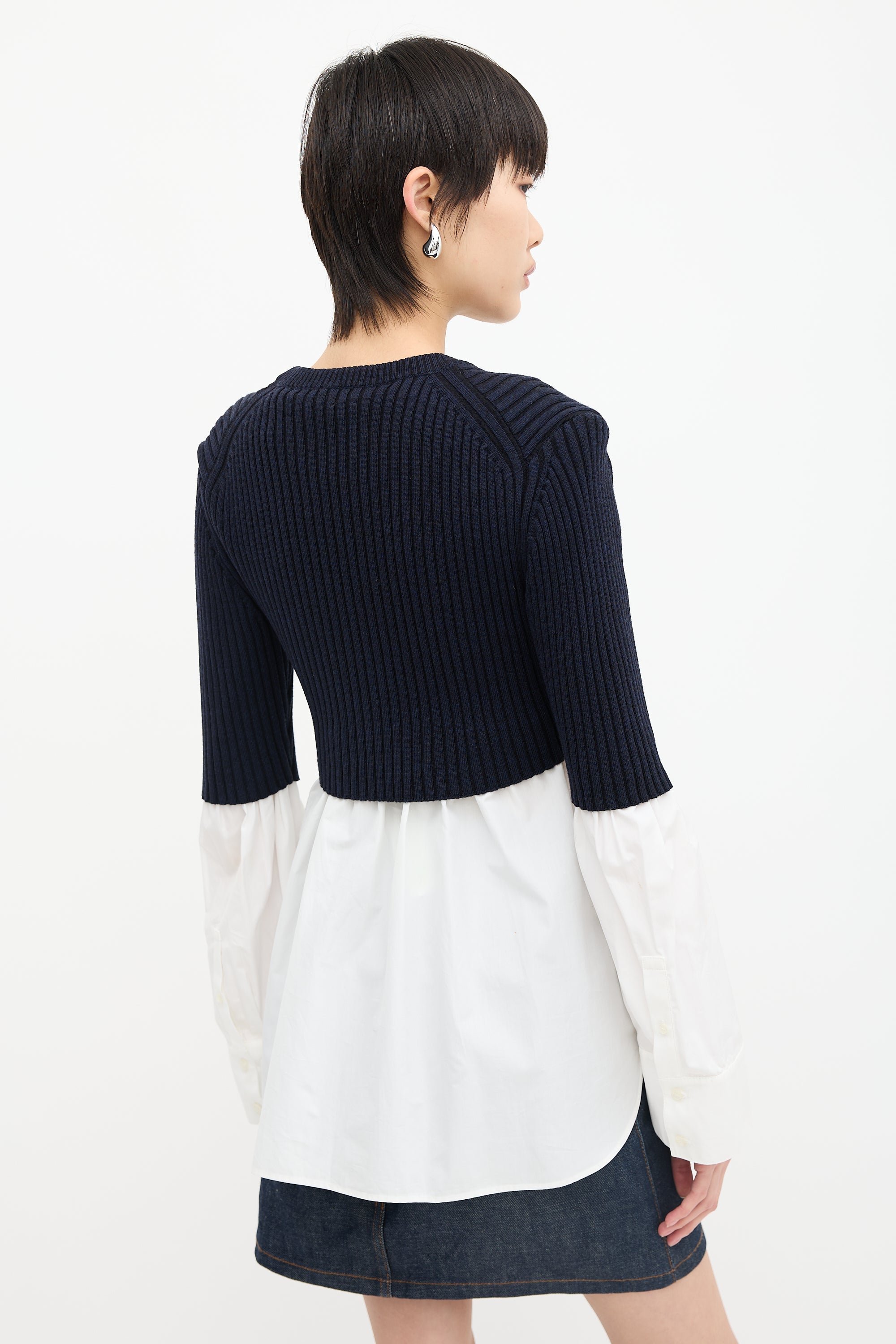 Pre-owned Kenzo navy and white layered shirt featuring a ribbed sweater upper with a crew neckline, poplin button up underlayer, and wide sleeves with buttoned cuffs.