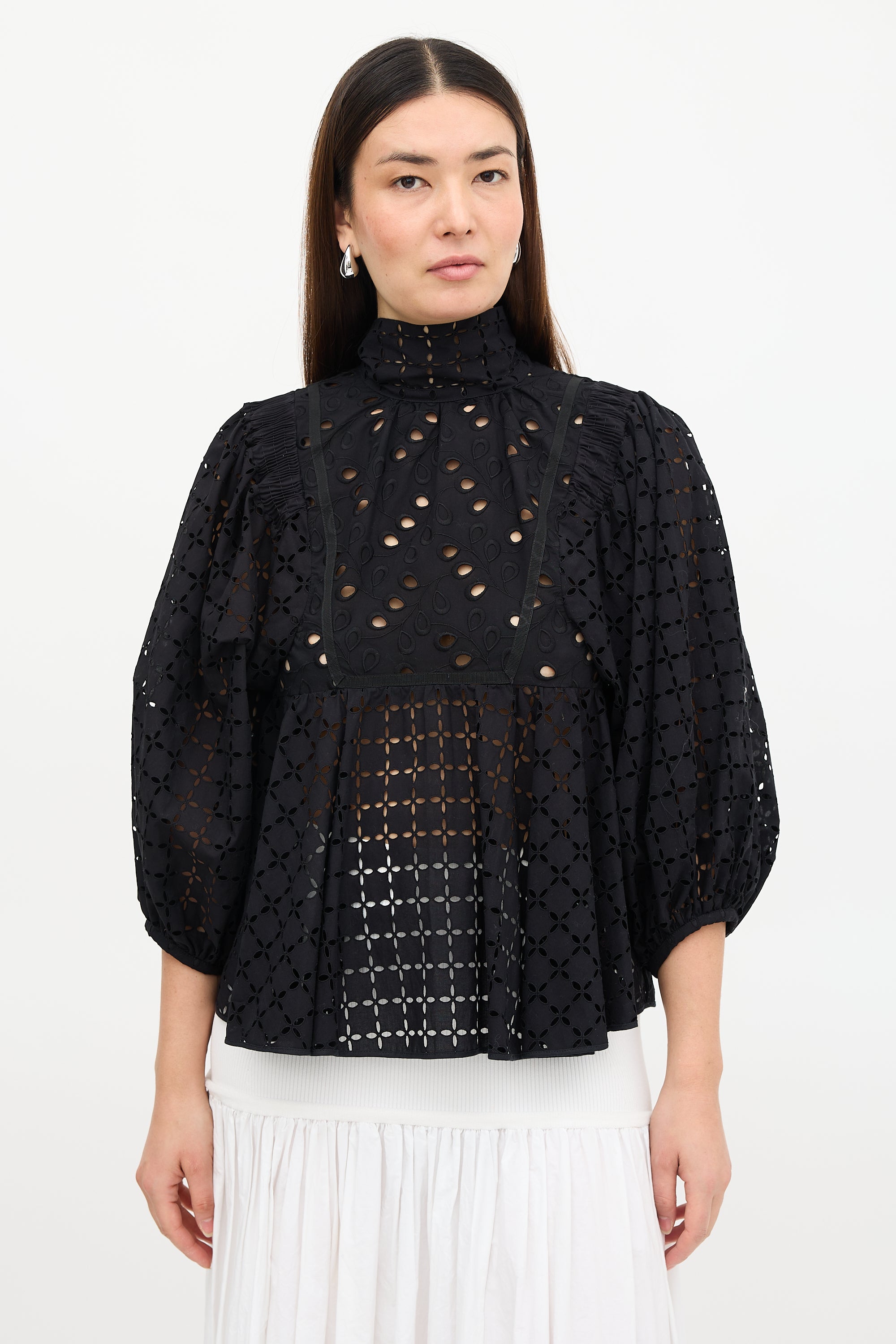 Pre-owned Rochas black broderie anglaise blouse featuring a mock neck with self-tie back collar, button closure with keyhole at back, bib design with grosgrain trim, smocked shoulders, and puff sleeves with buttoned cuffs. Unlined.