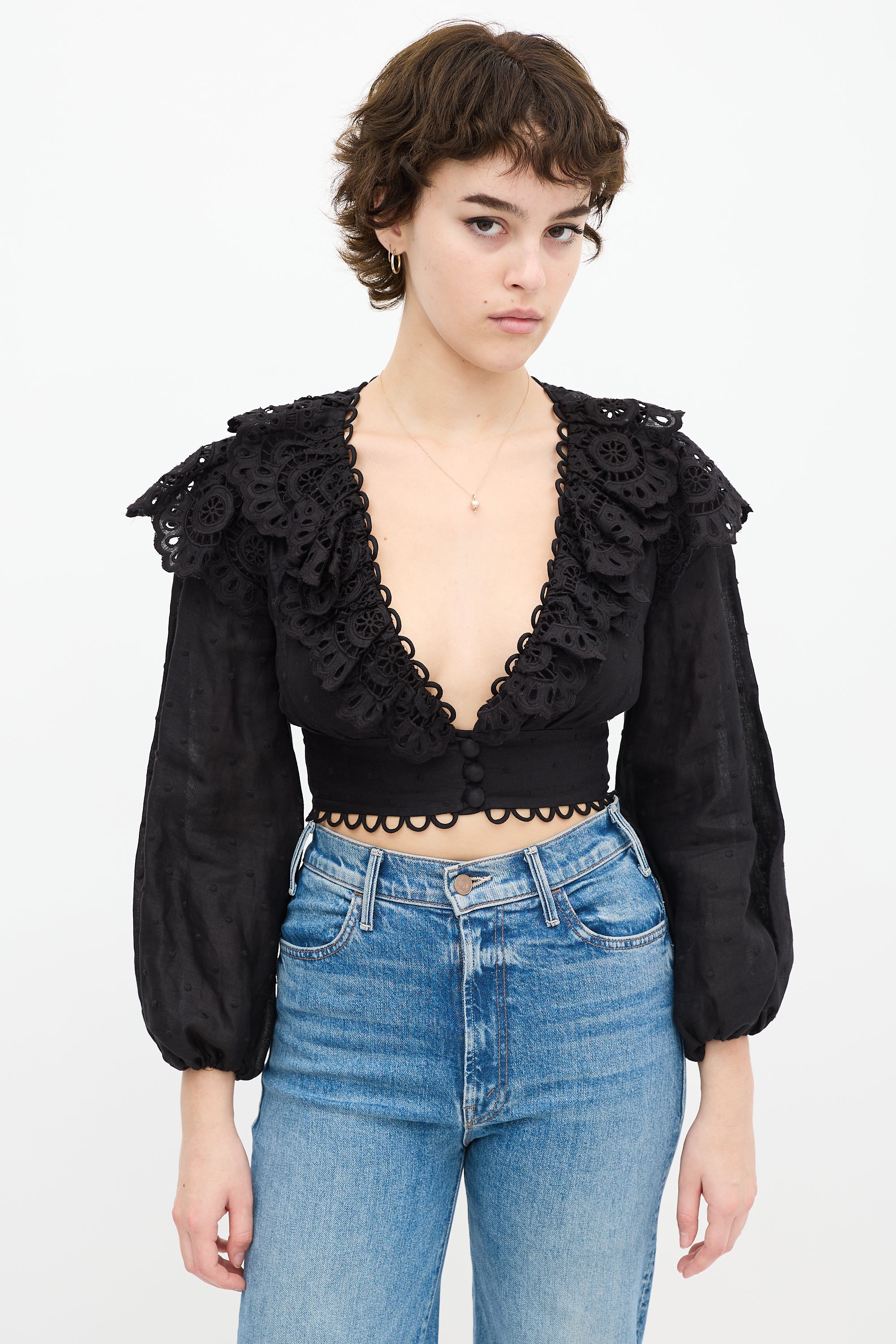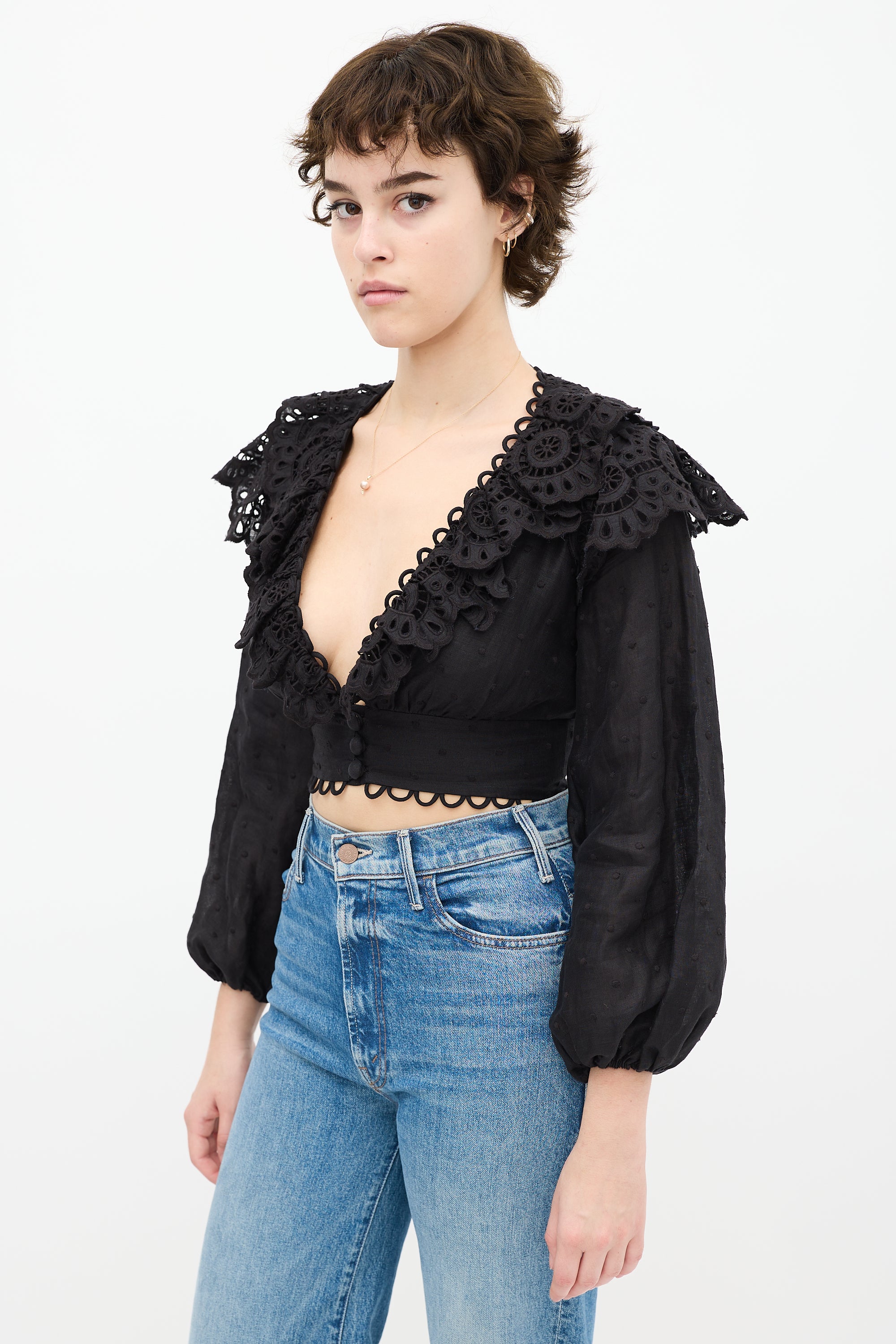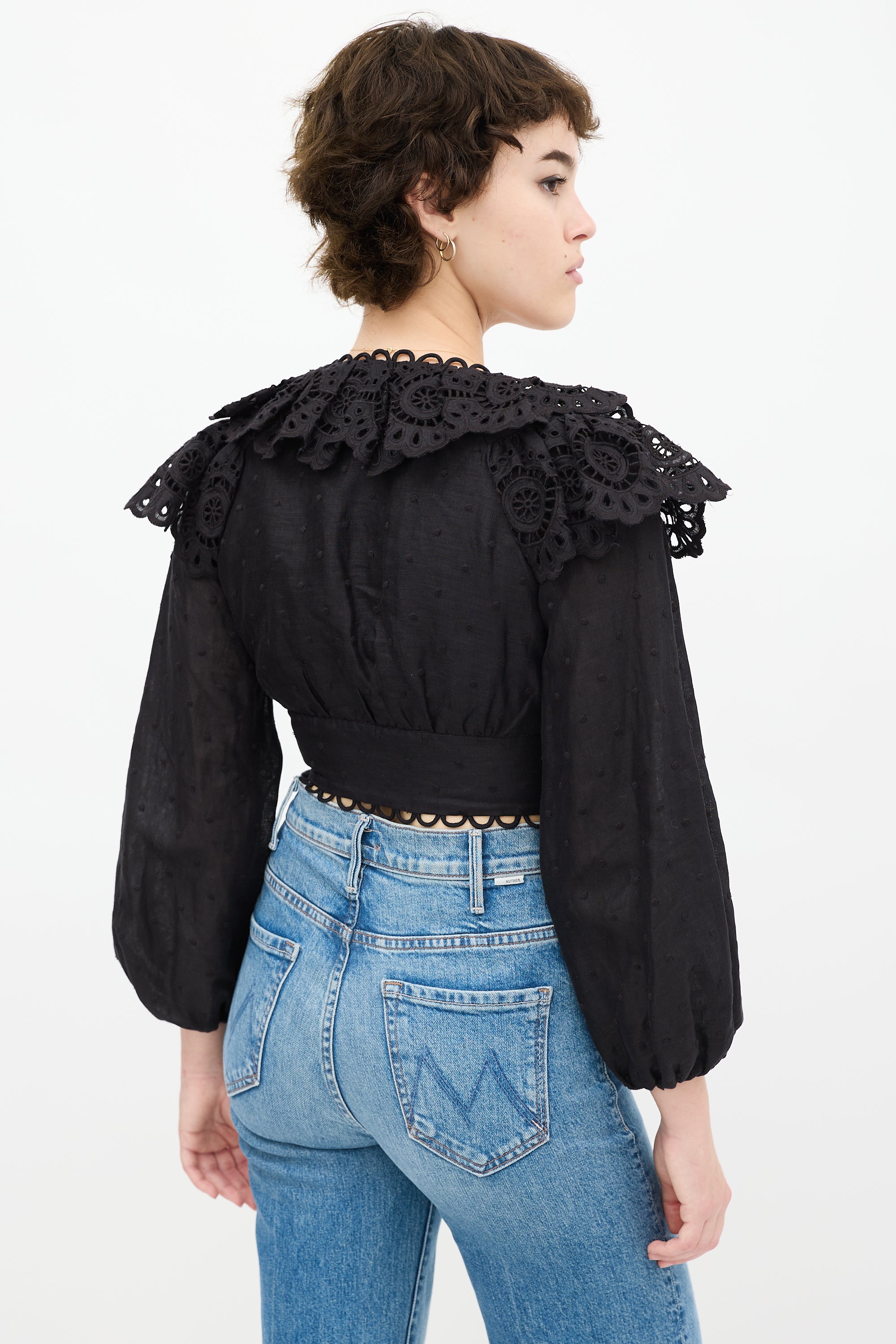 Pre-owned Zimmermann black top featuring a V-neckline, long gathered sleeves, tonal polka dot embroidery throughout, ruffled eyelet trim at bust, cropped fit, scalloped hem, and wrapped button closure. Lined.