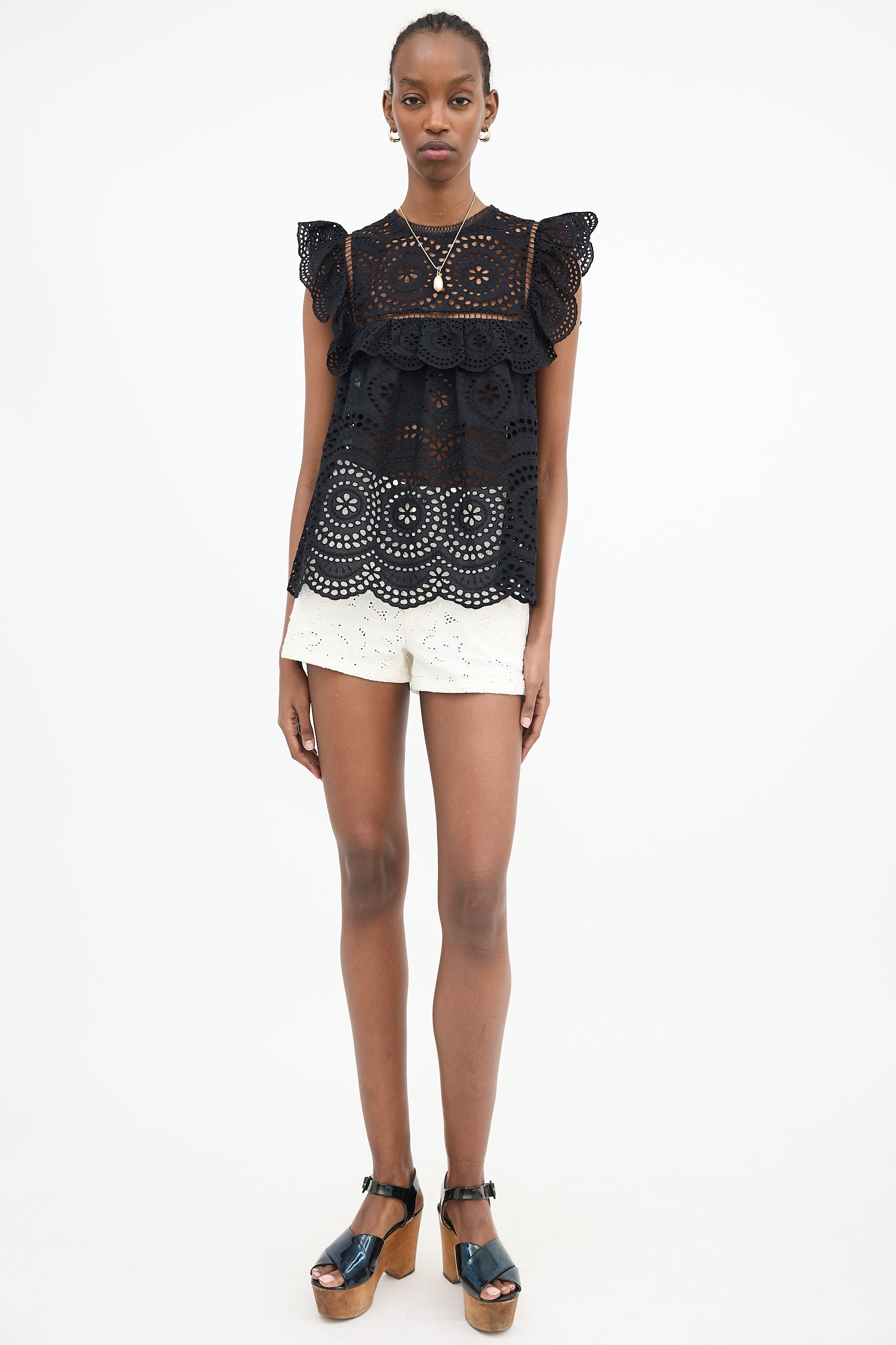 Pre-owned Zimmermann black Meridian blouse featuring broderie anglaise, round neckline, upper back zip, ruffle trim, and scalloped hem. Unlined.