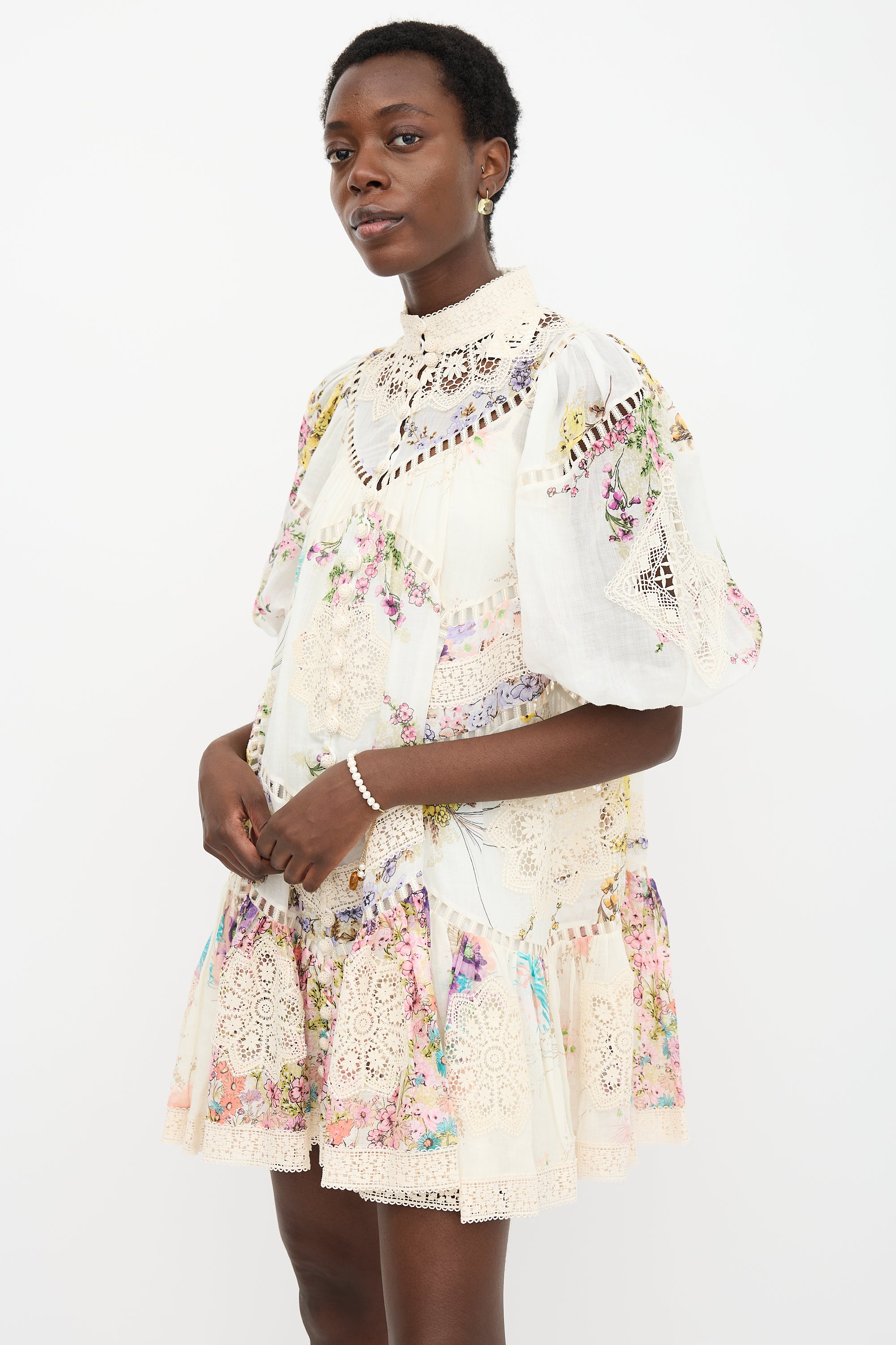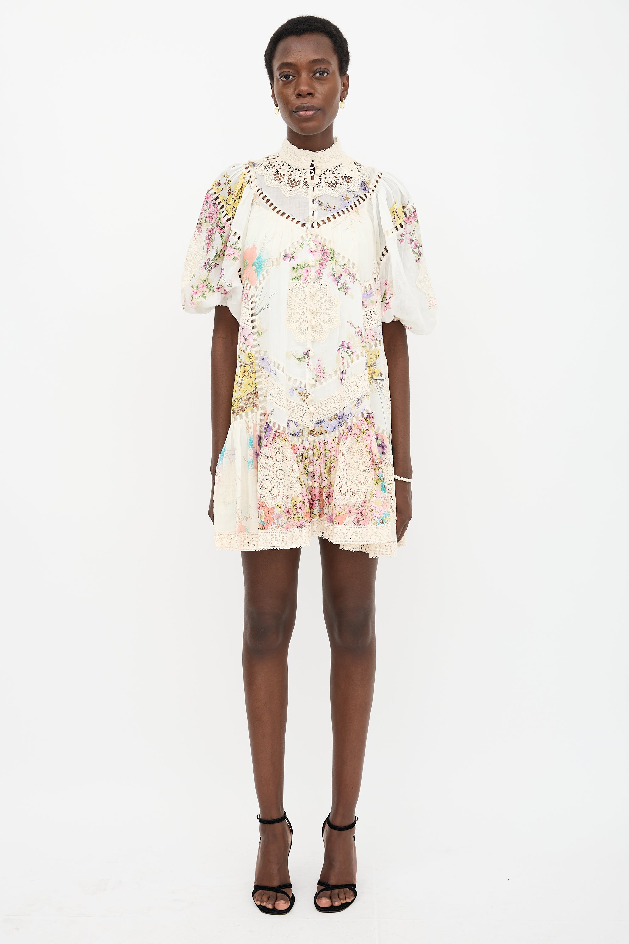 Pre-owned Zimmermann white ramie Jude dress featuring a multicolour floral print, tonal lace details and trim, button front, concealed back zip, half length puff sleeves, and ruffle hem. Comes with slip.