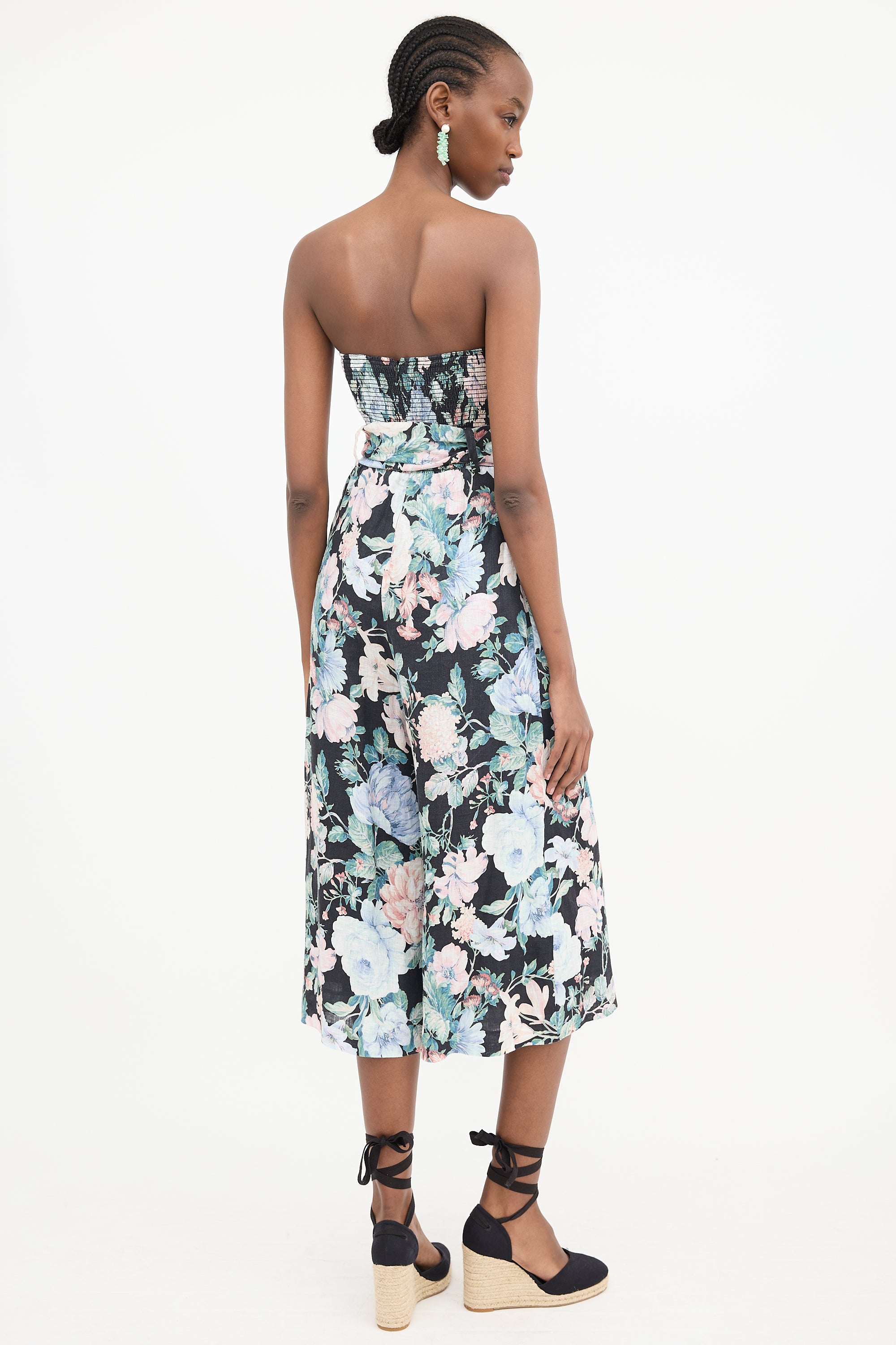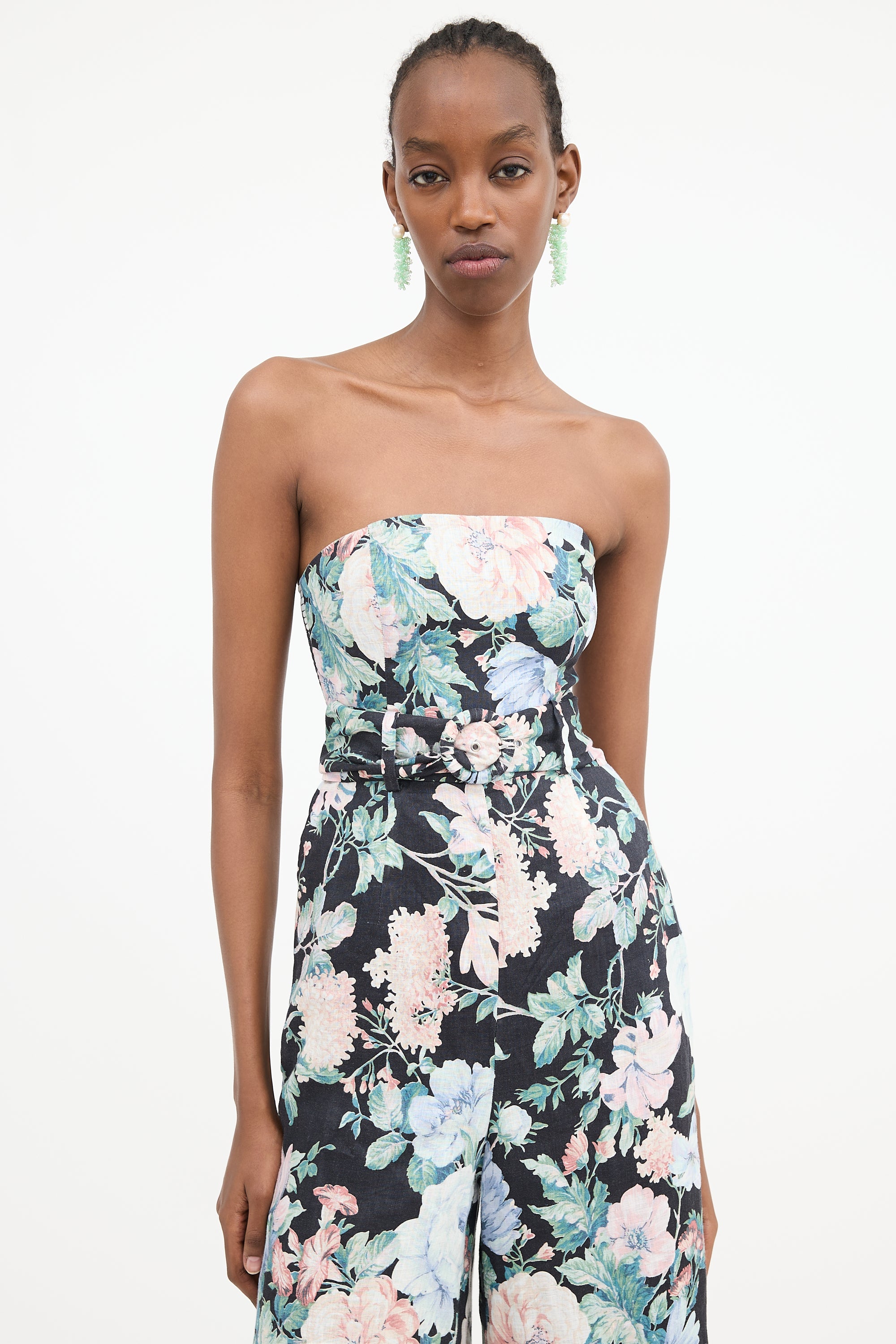 Pre-owned Zimmermann black and multicolour linen Honour strapless jumpsuit featuring floral print, straight across topline, smocked back, in seam pockets, wide leg, waist belt, and concealed back zip. Lined.