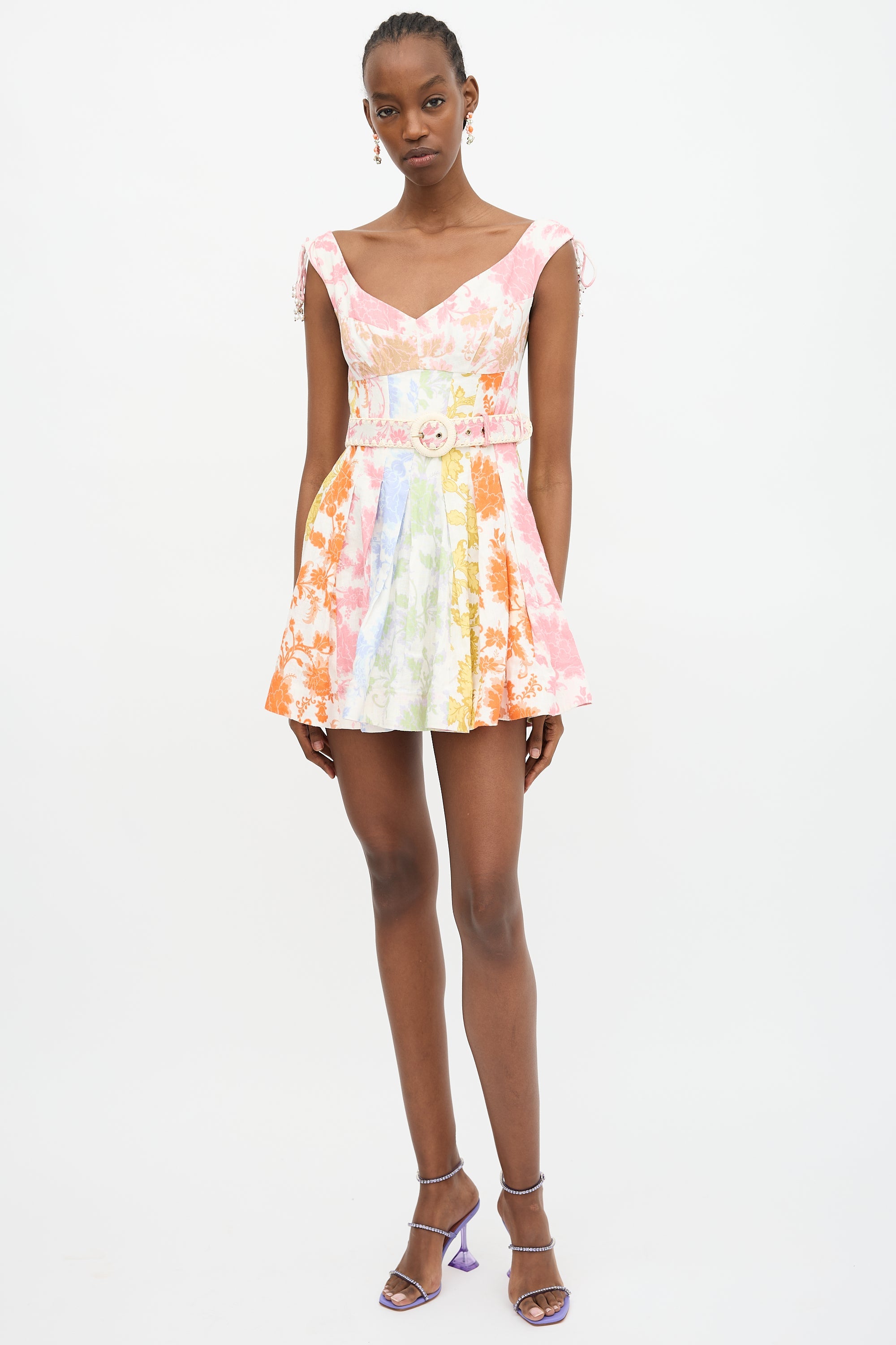 Pre-owned Zimmermann linen Postcard Spliced dress featuring multicolour floral print, beaded shoulder straps, adjustable belt, pleated skirt, and concealed back zip. Lined.