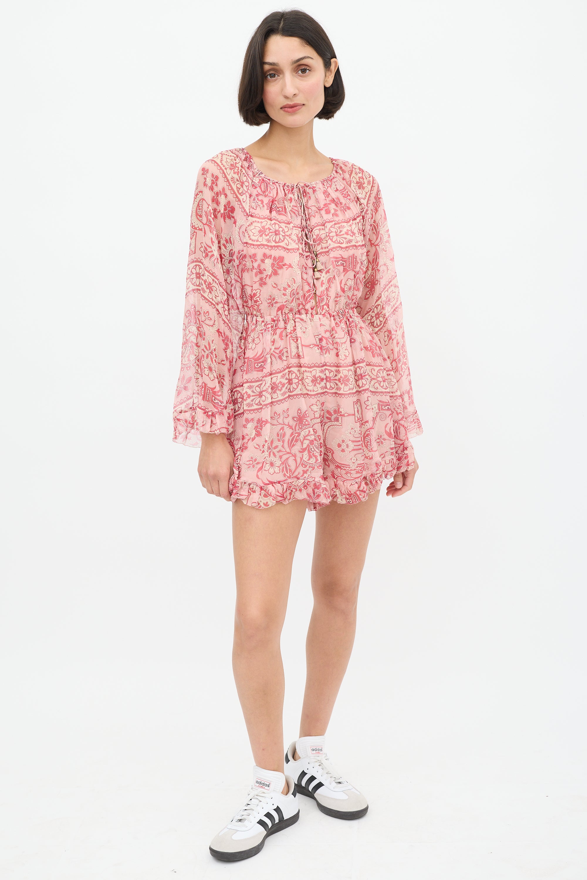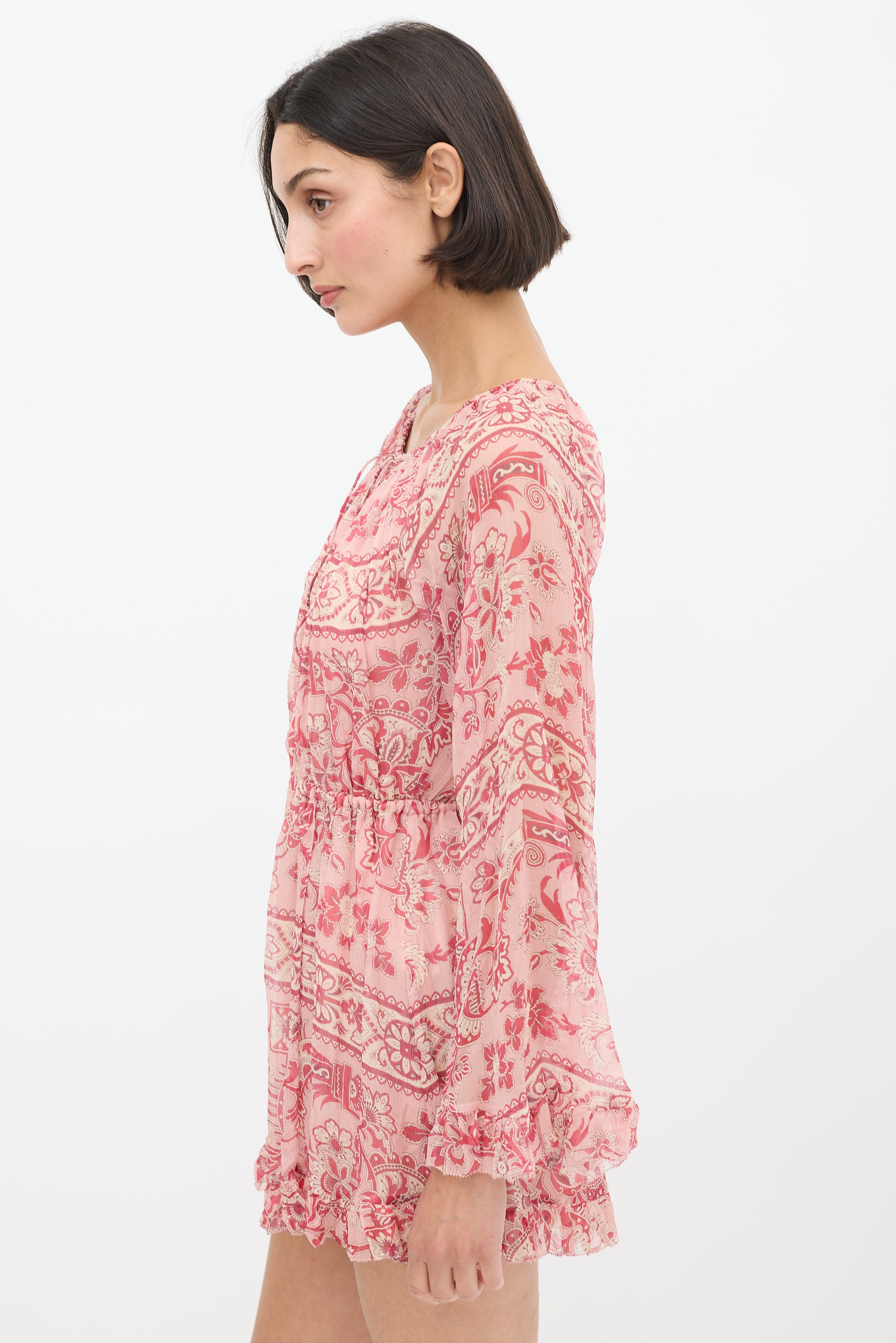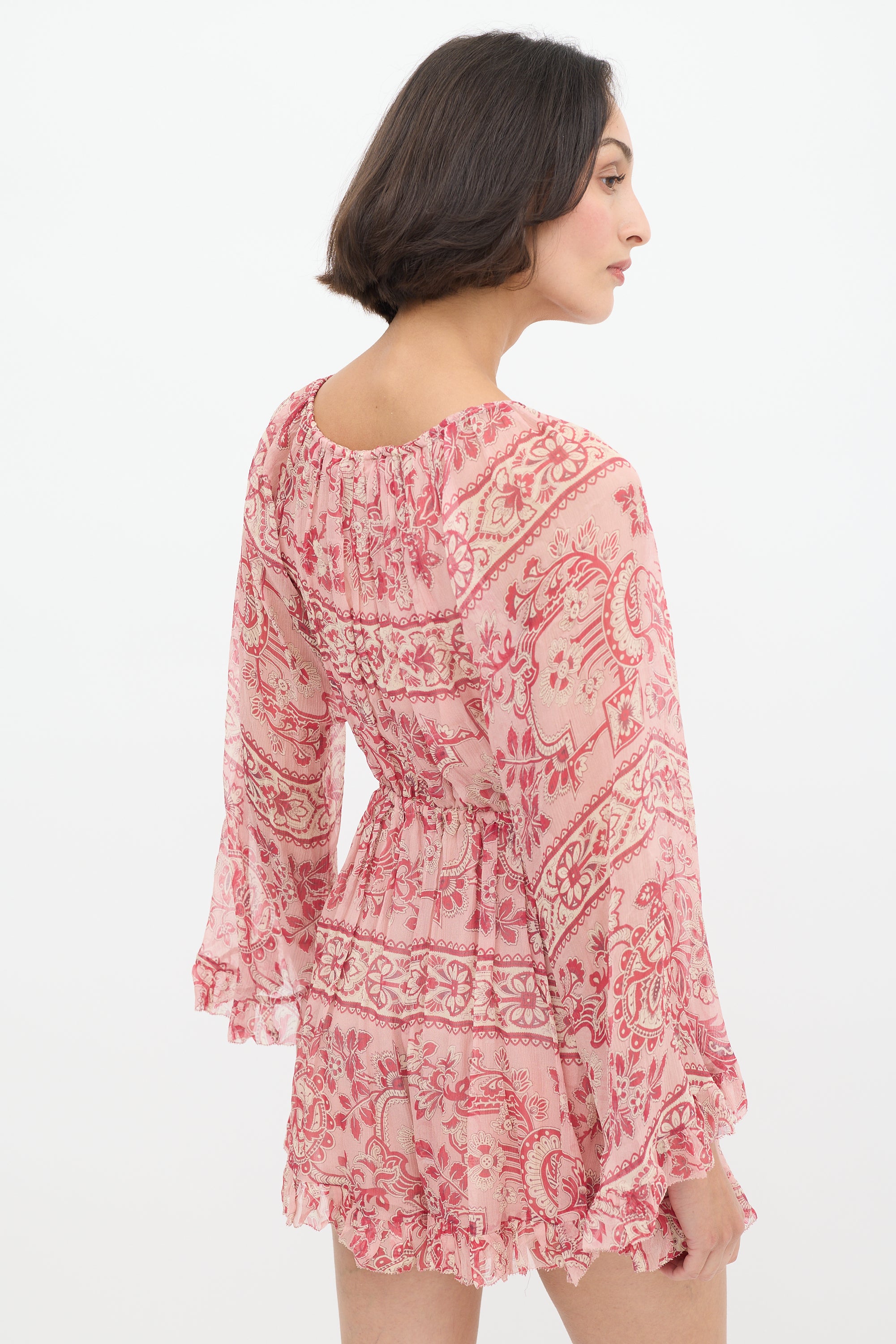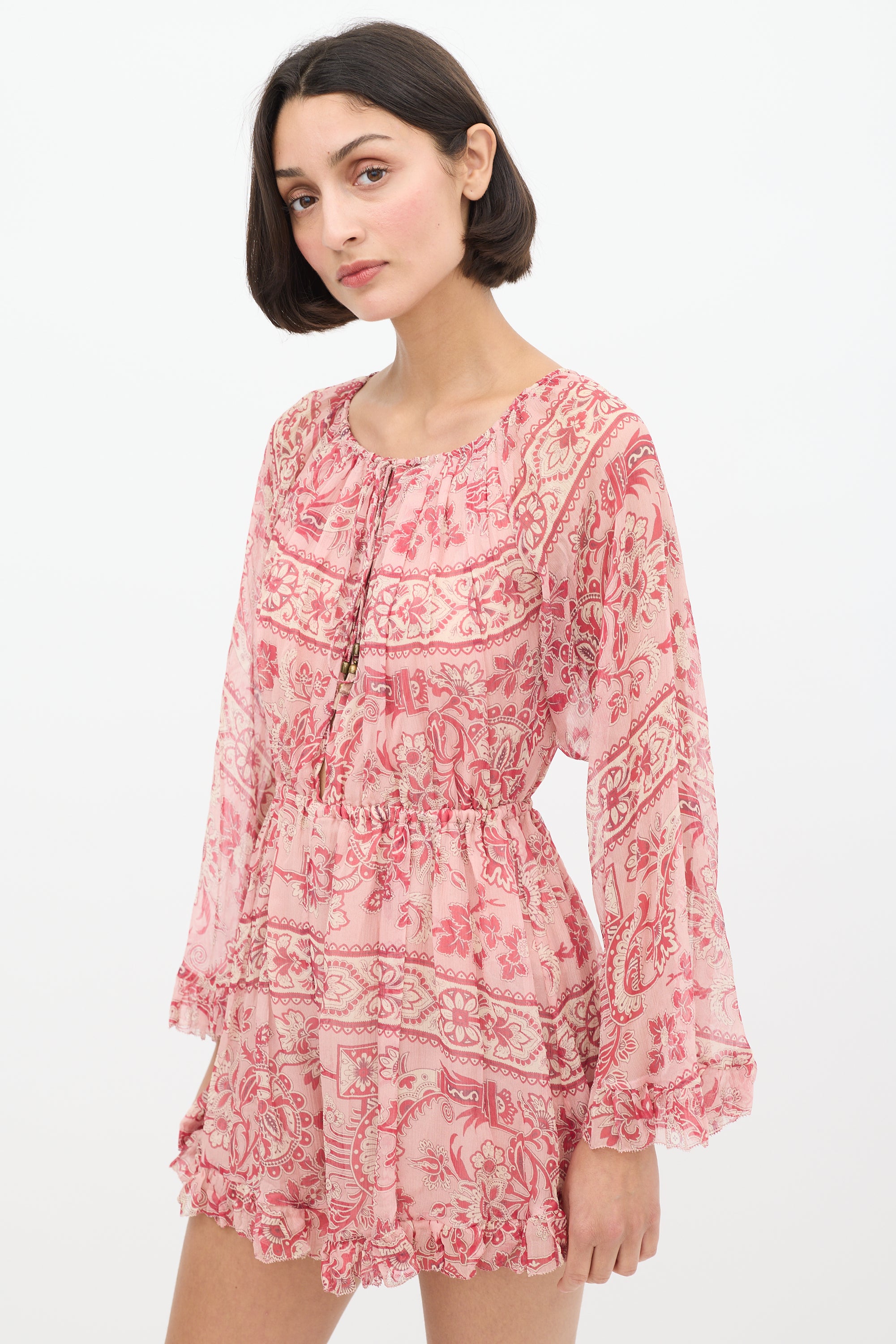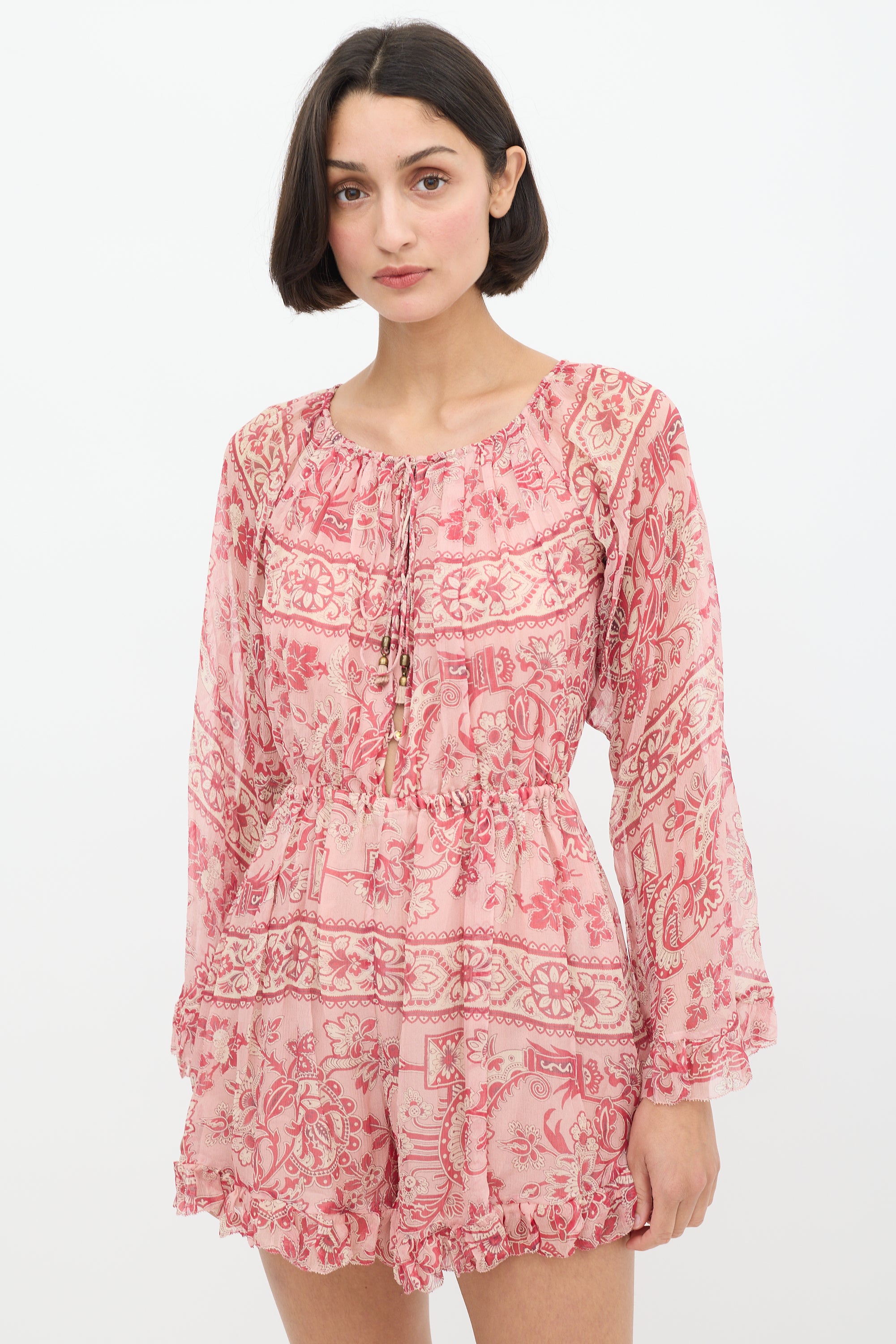 Pre-owned Zimmermann pink silk Castile romper featuring a drawstring bateau neckline, centre front cutout, elasticized waist, long flared sleeves, ruffle trim at hem and cuffs, and ornate floral print throughout. Partially lined.