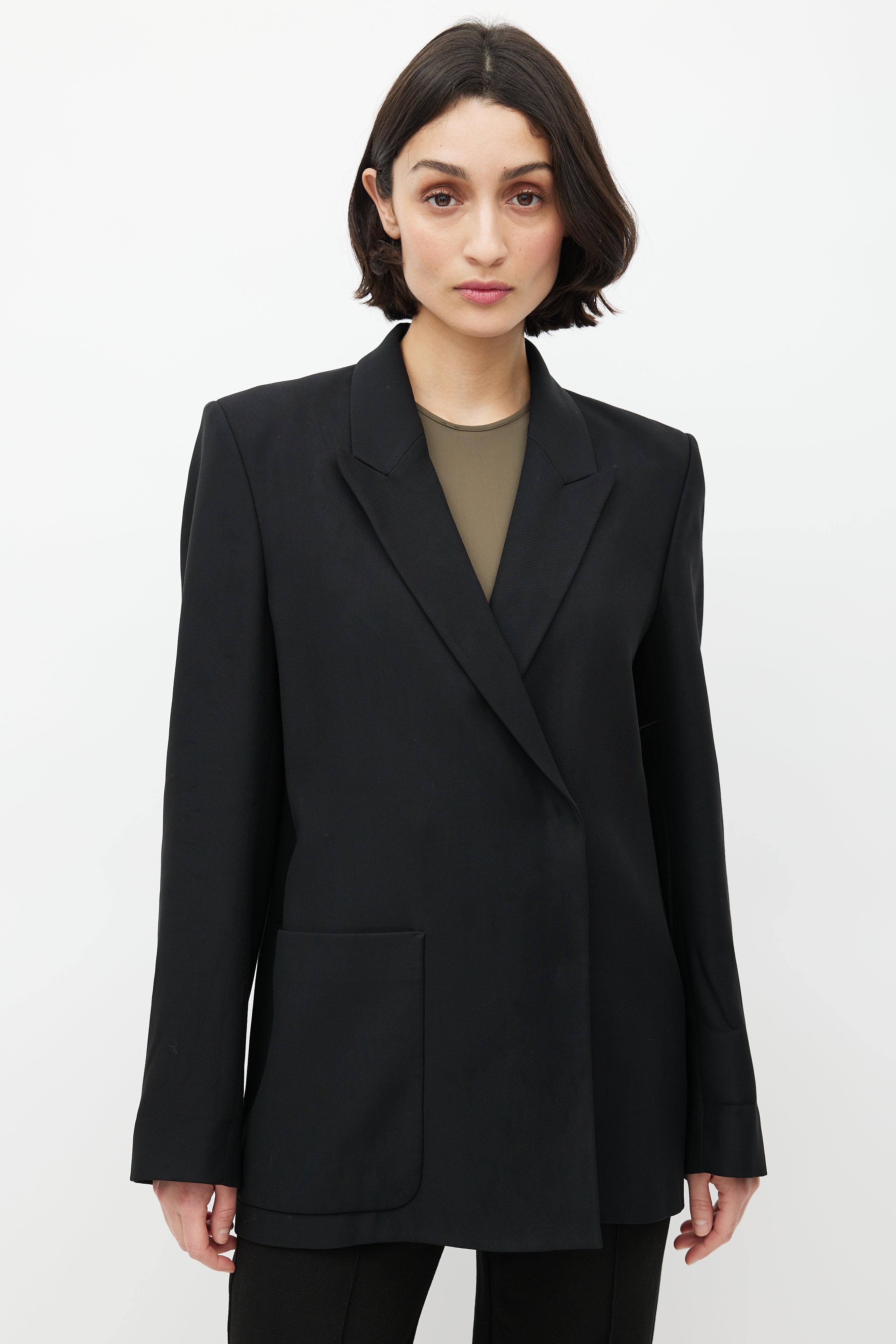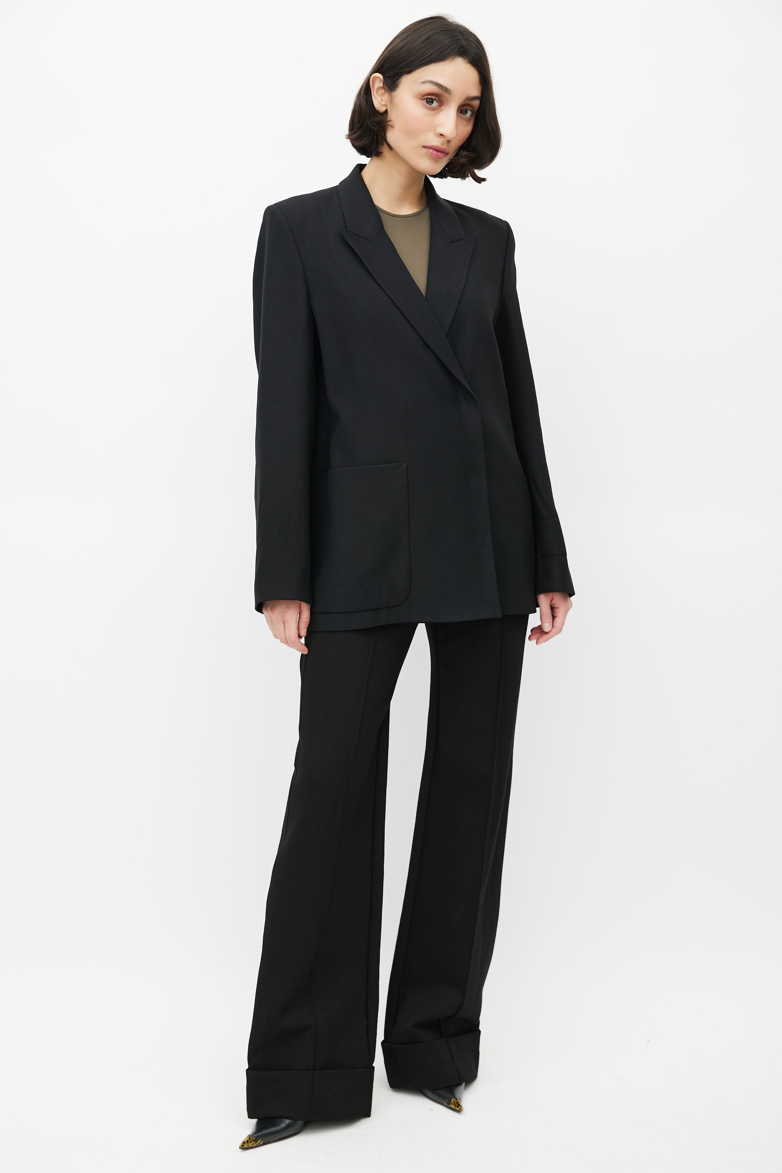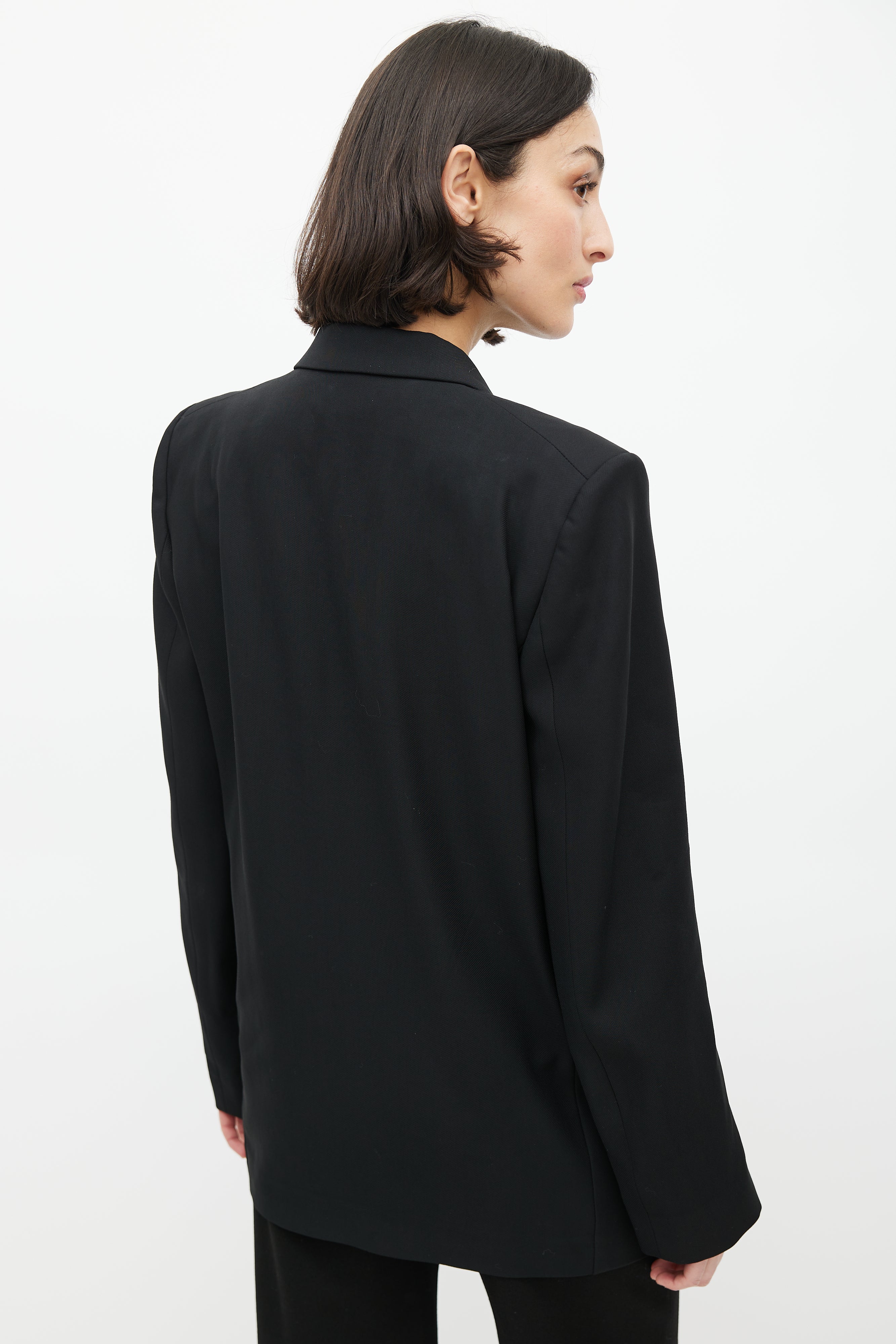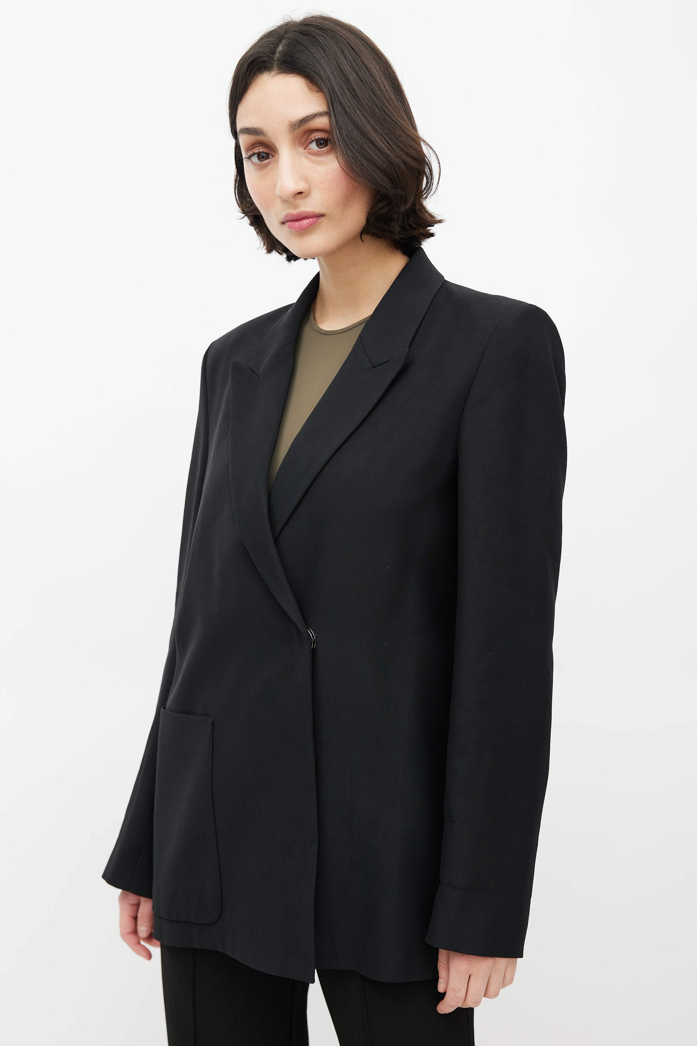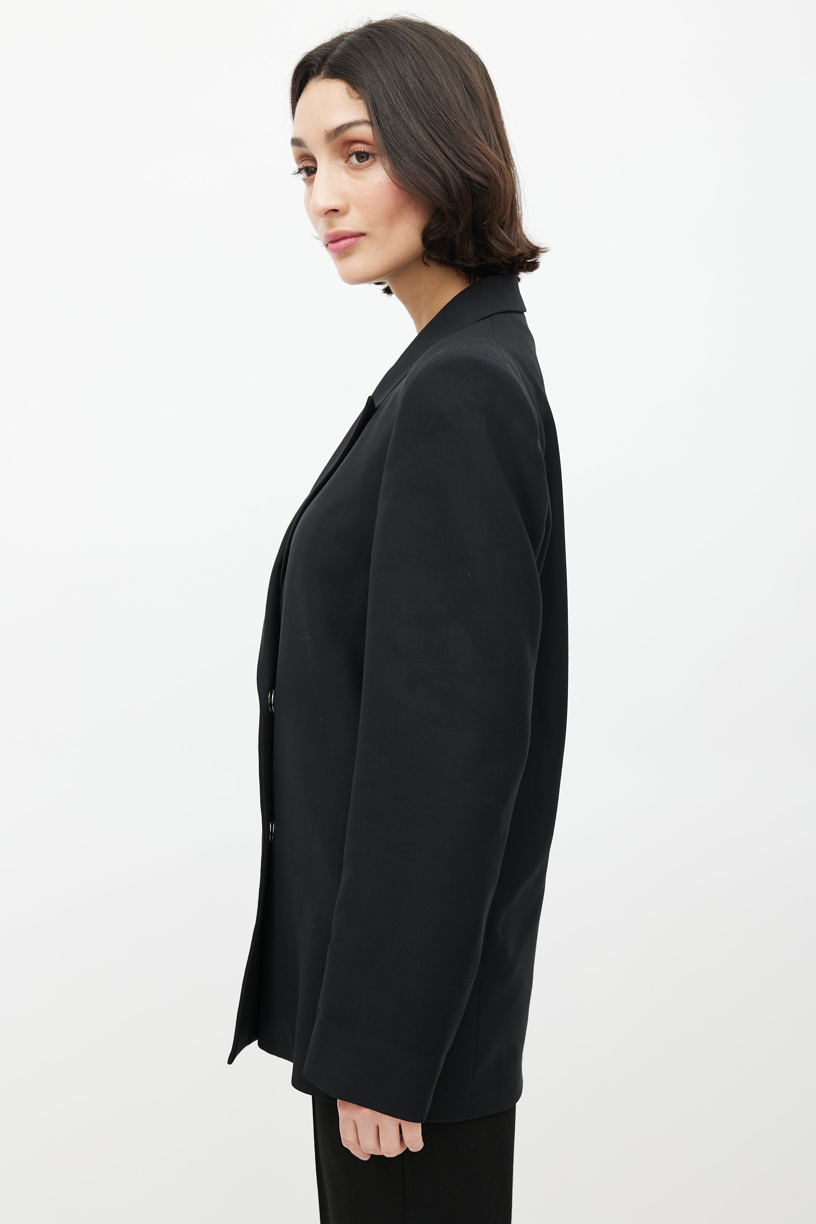 Pre-owned Acne Studios black wool oversized blazer featuring peak lapels, double breasted front with concealed snap buttons, and one patch pocket at hip. Partially lined.
