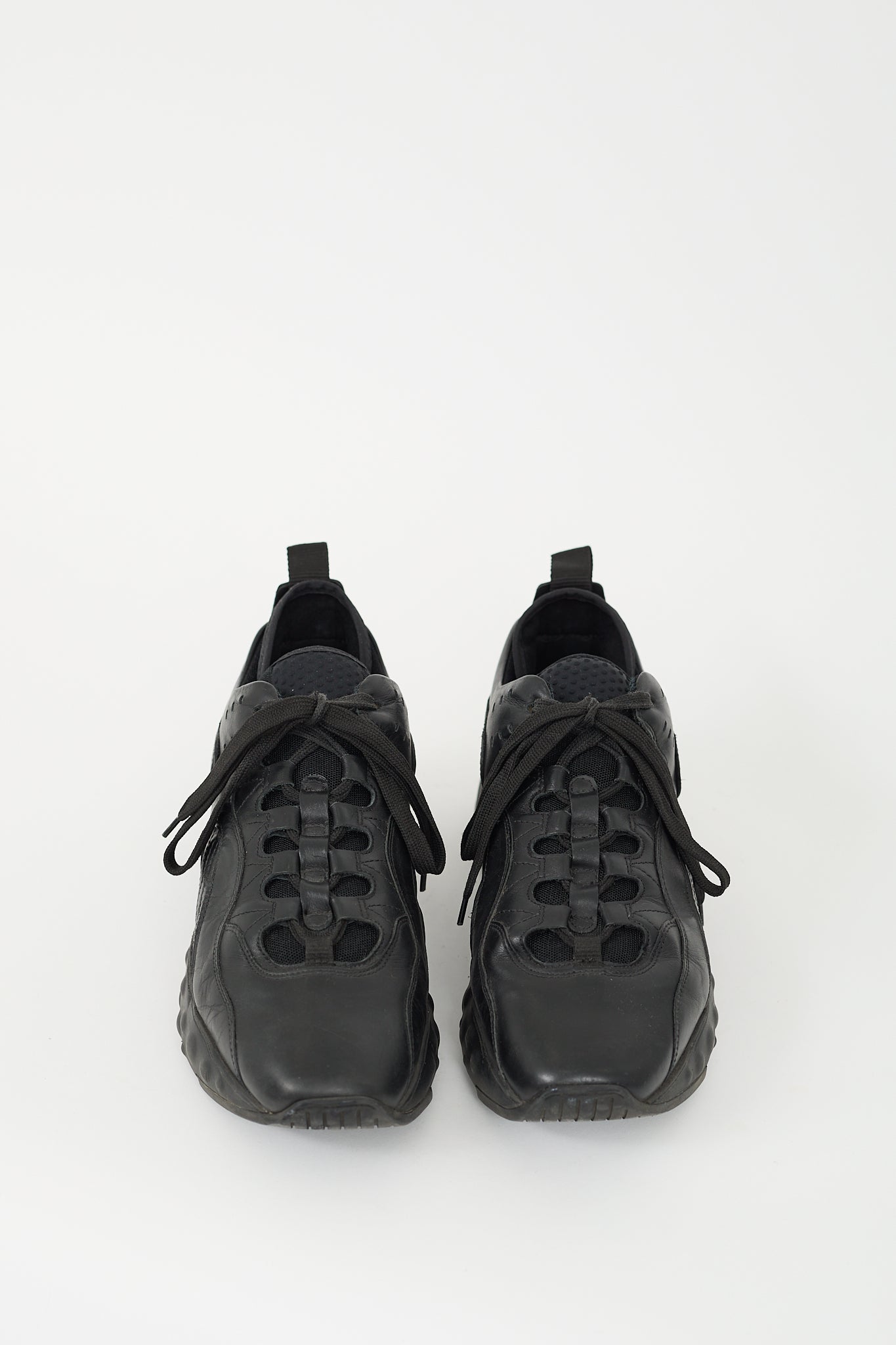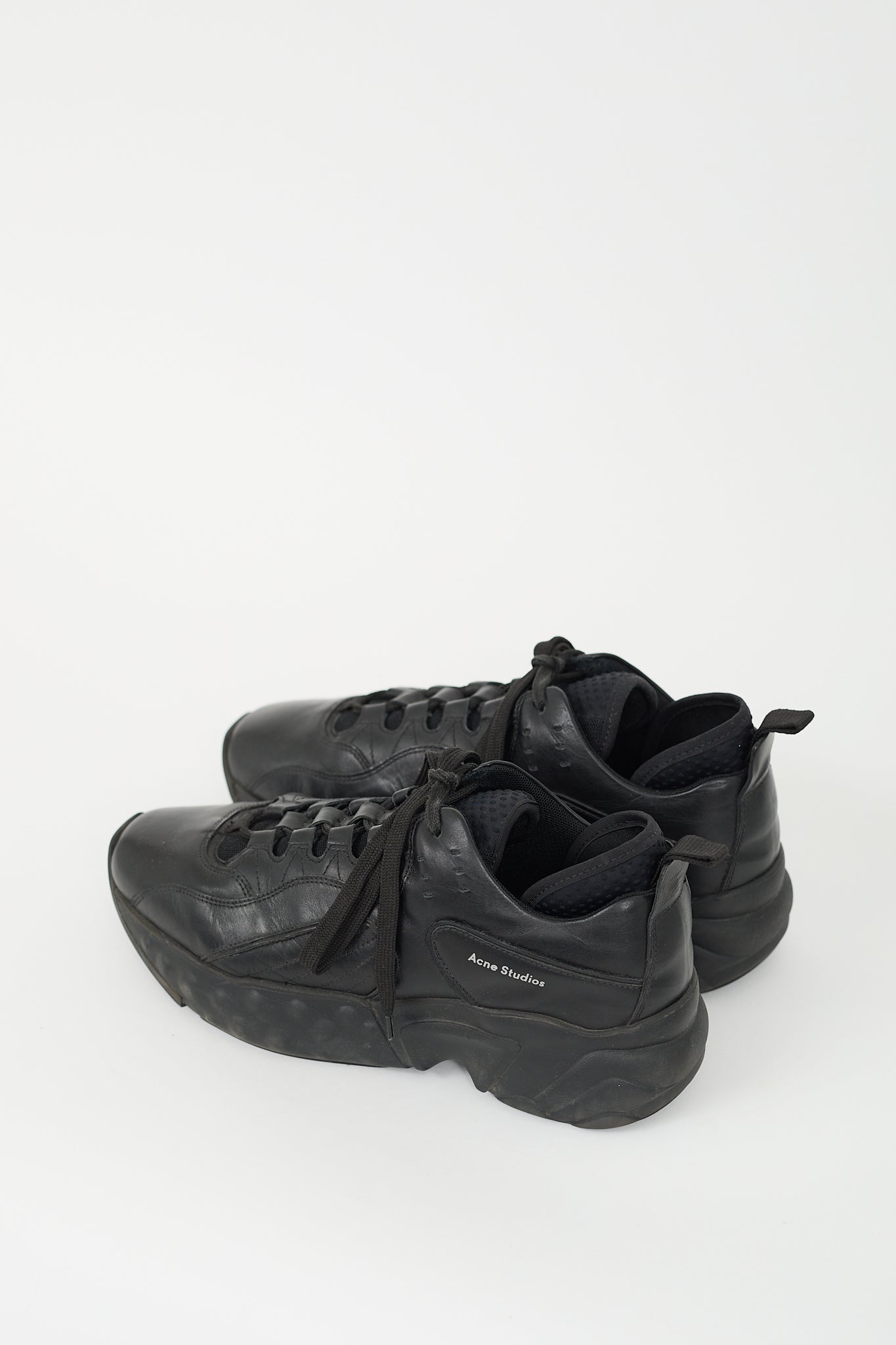 Pre-owned Acne Studios black Rockaway sneakers featuring tapered square toe, leather upper, mesh lace up vamp, textured insert at interior counter, chunky rubber sole, and silver tone stamped logo at side.