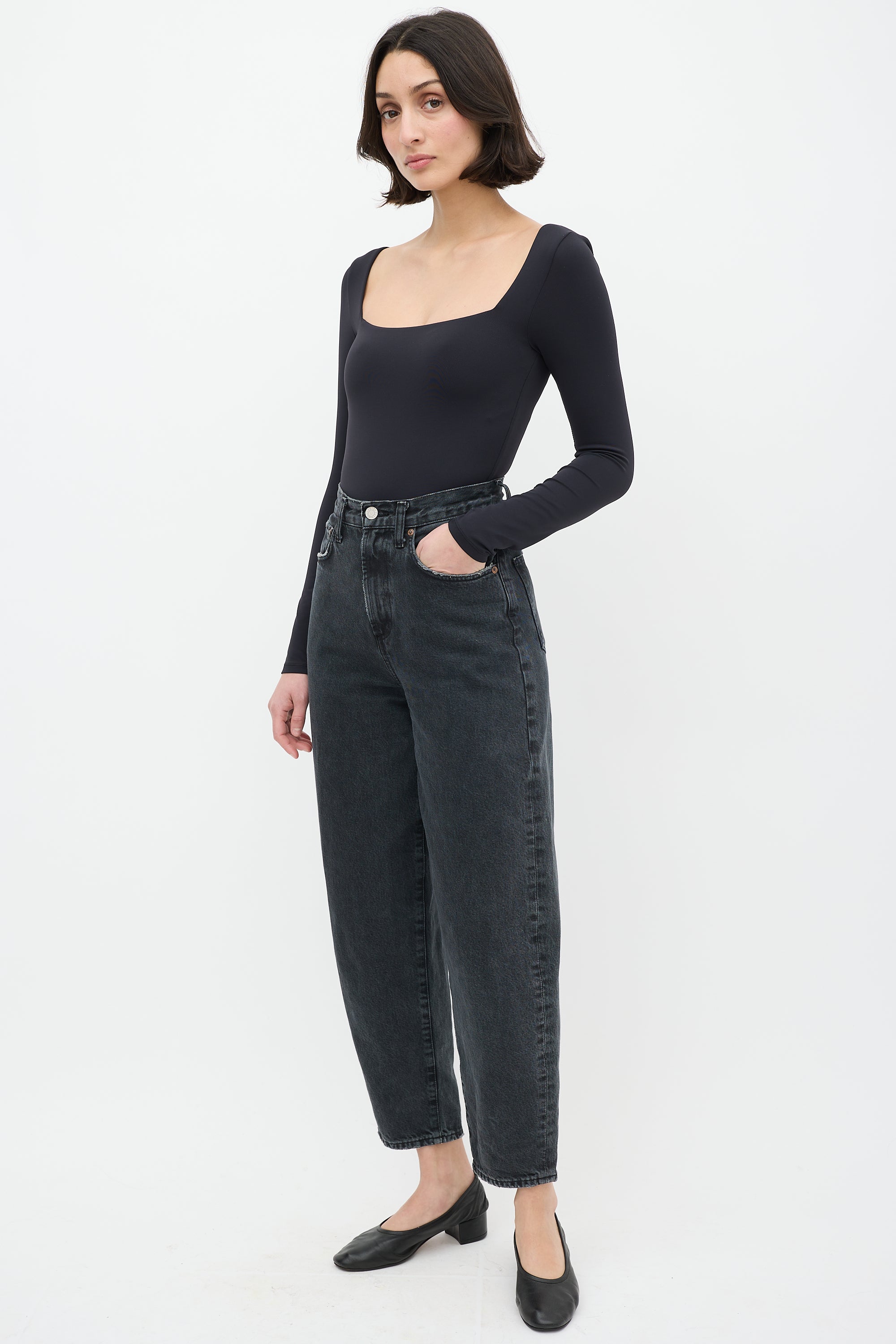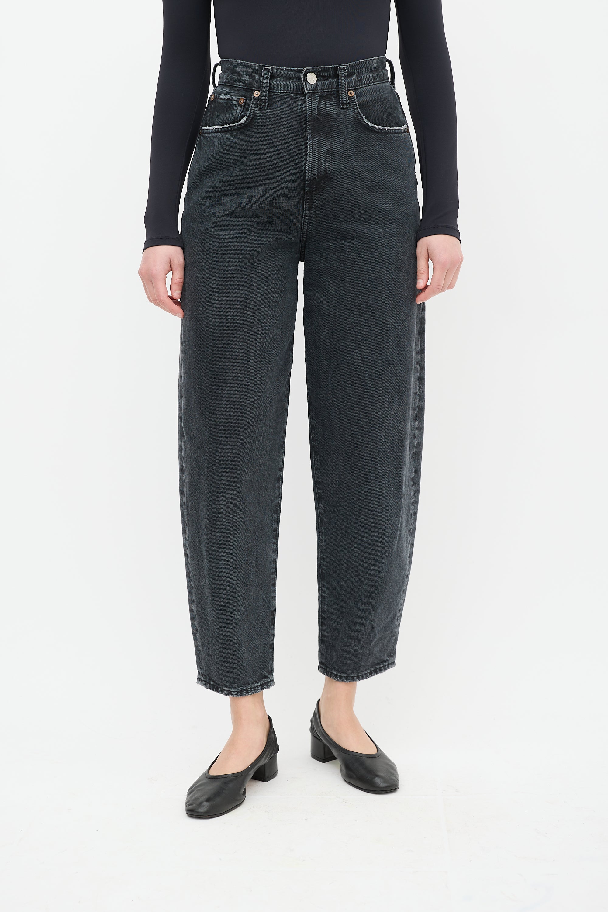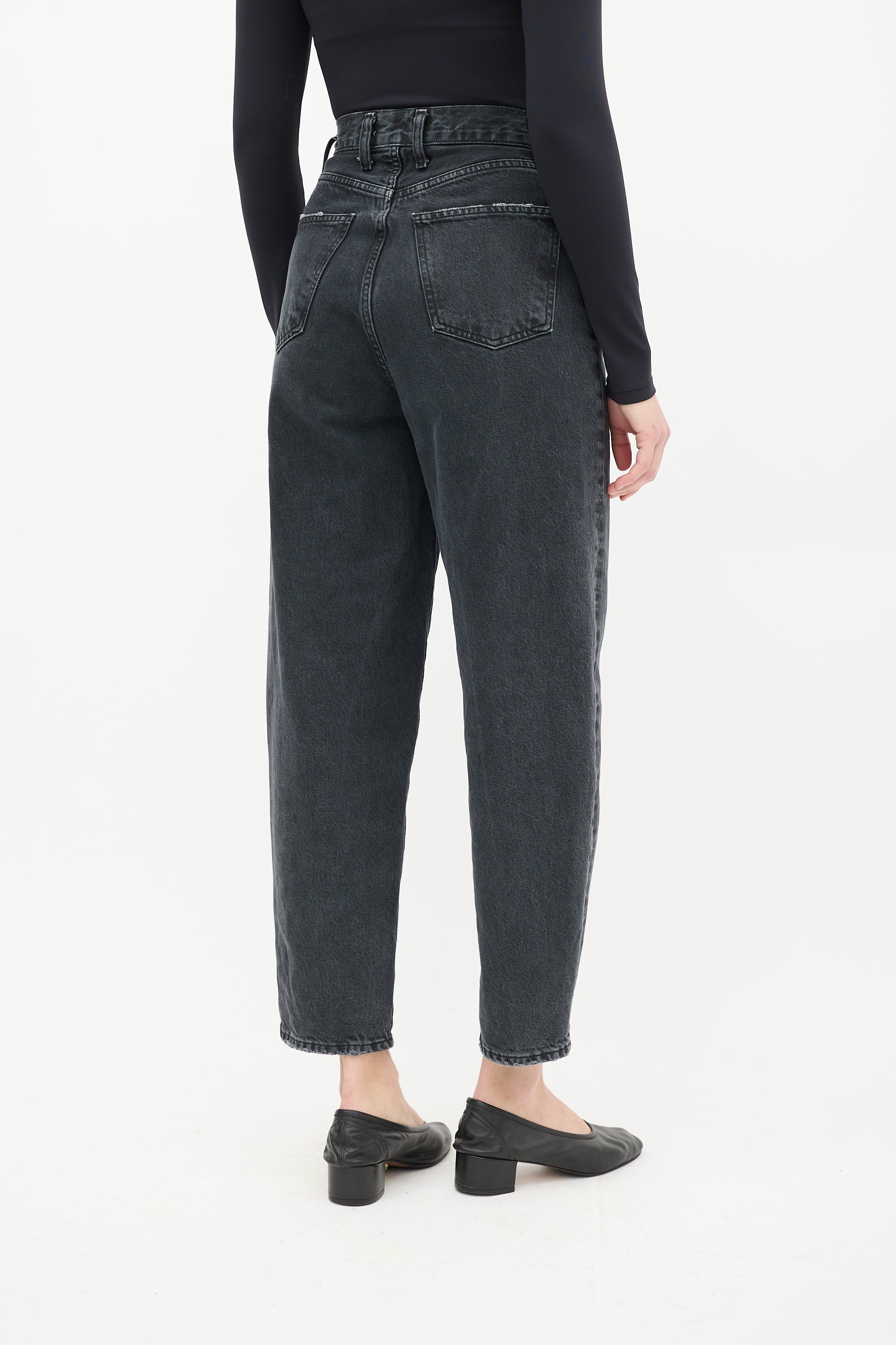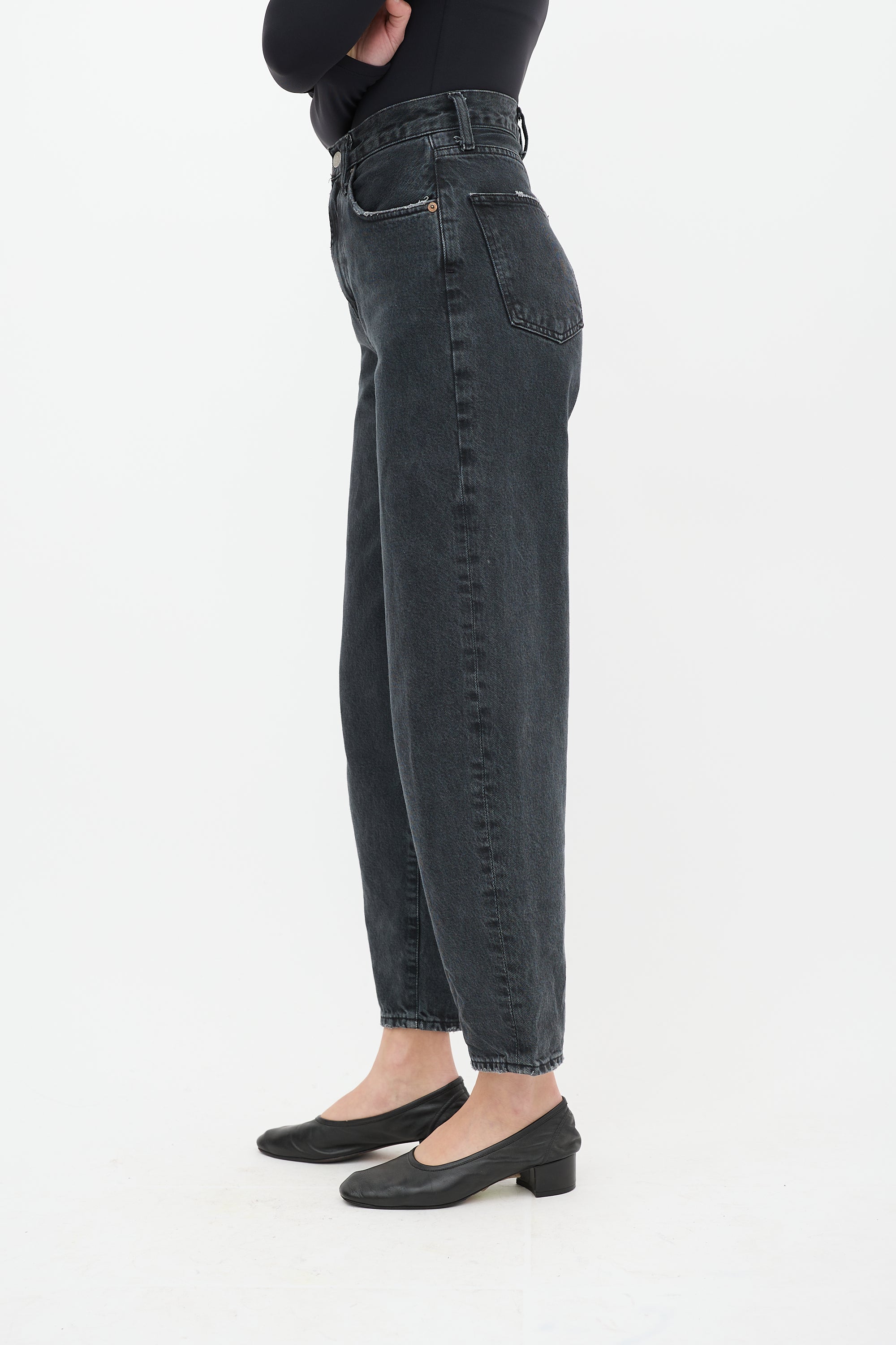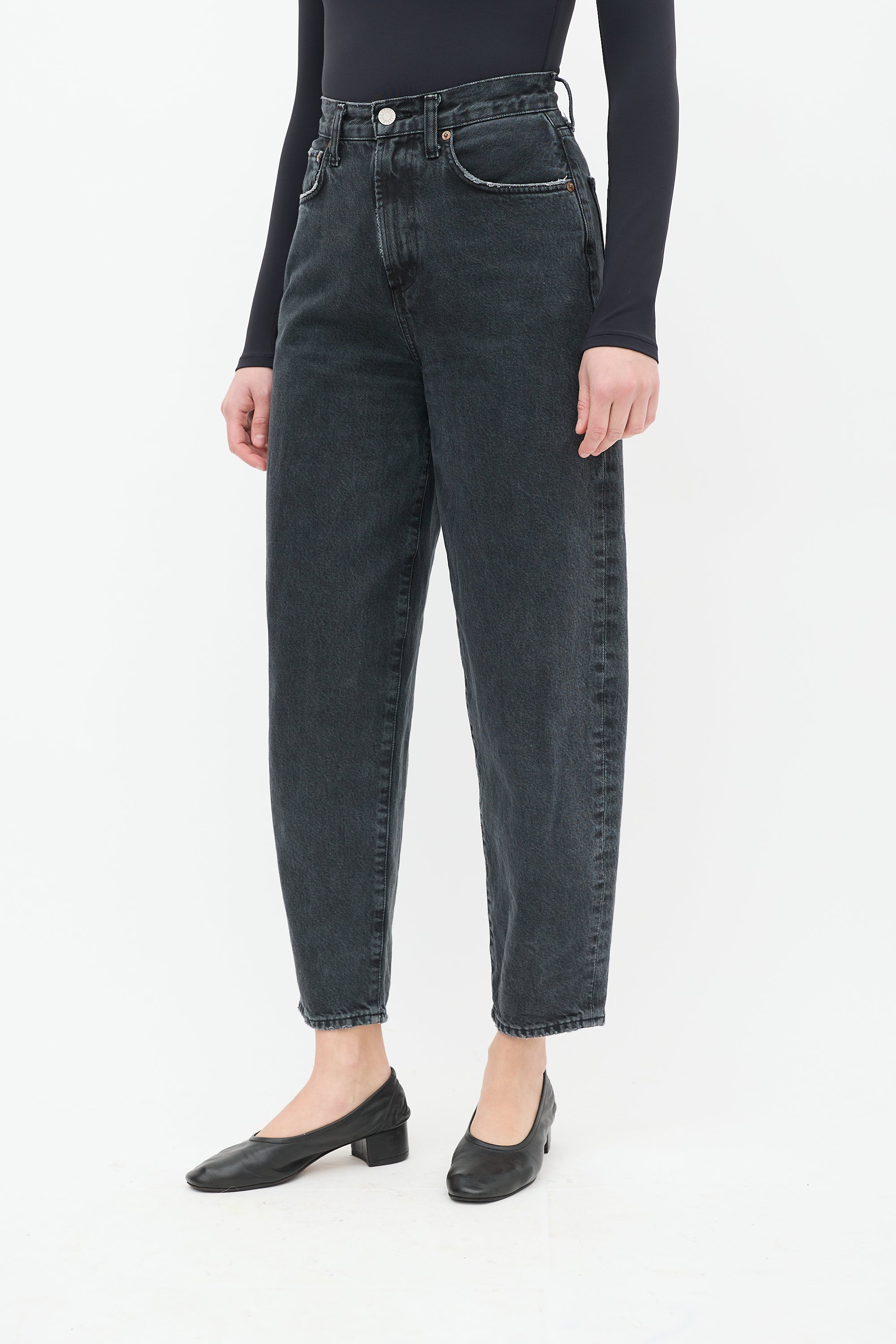 Pre-owned Agolde black high waist Balloon jeans featuring belt loops, zip fly, five pocket styling, barrel leg, and distressing throughout.