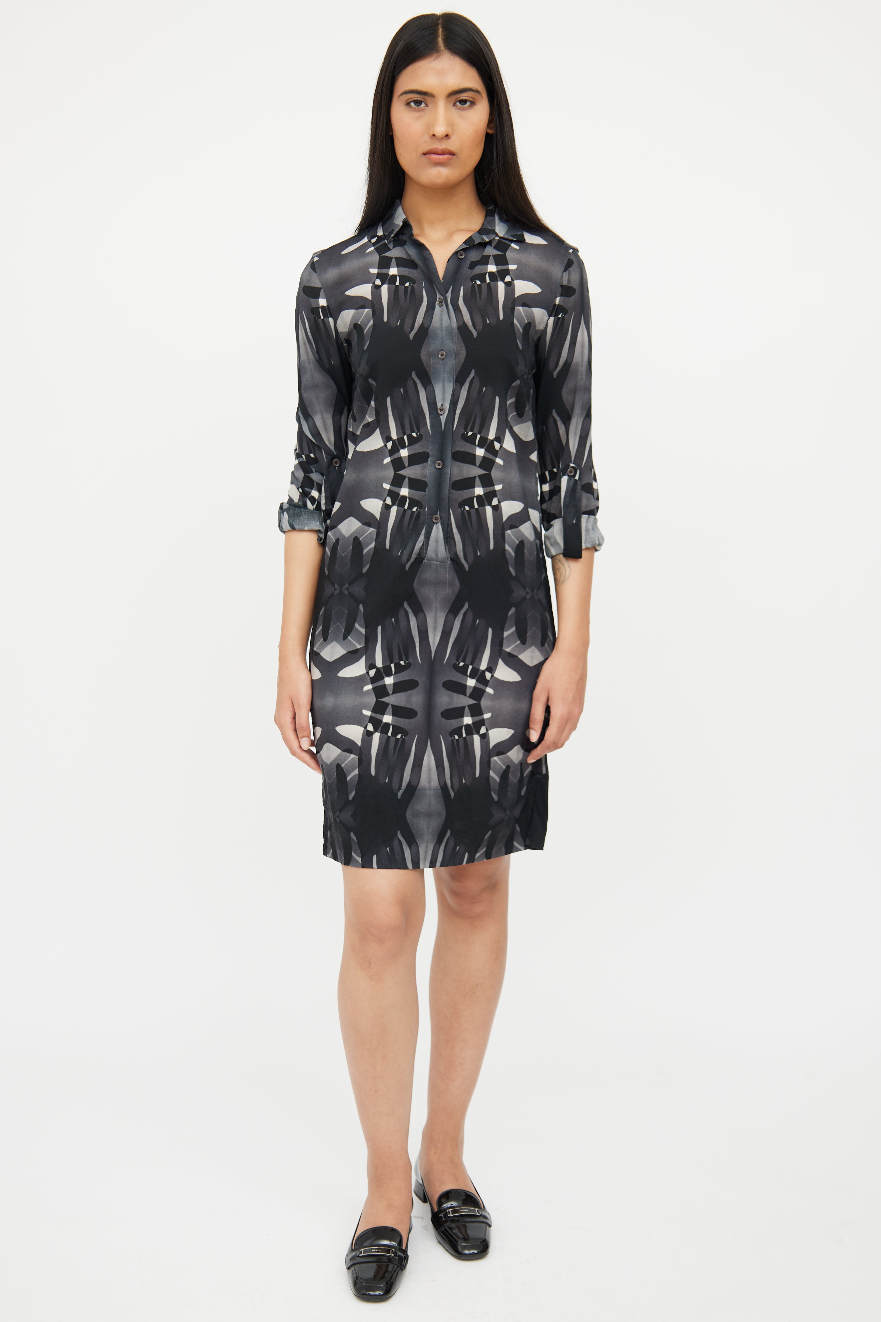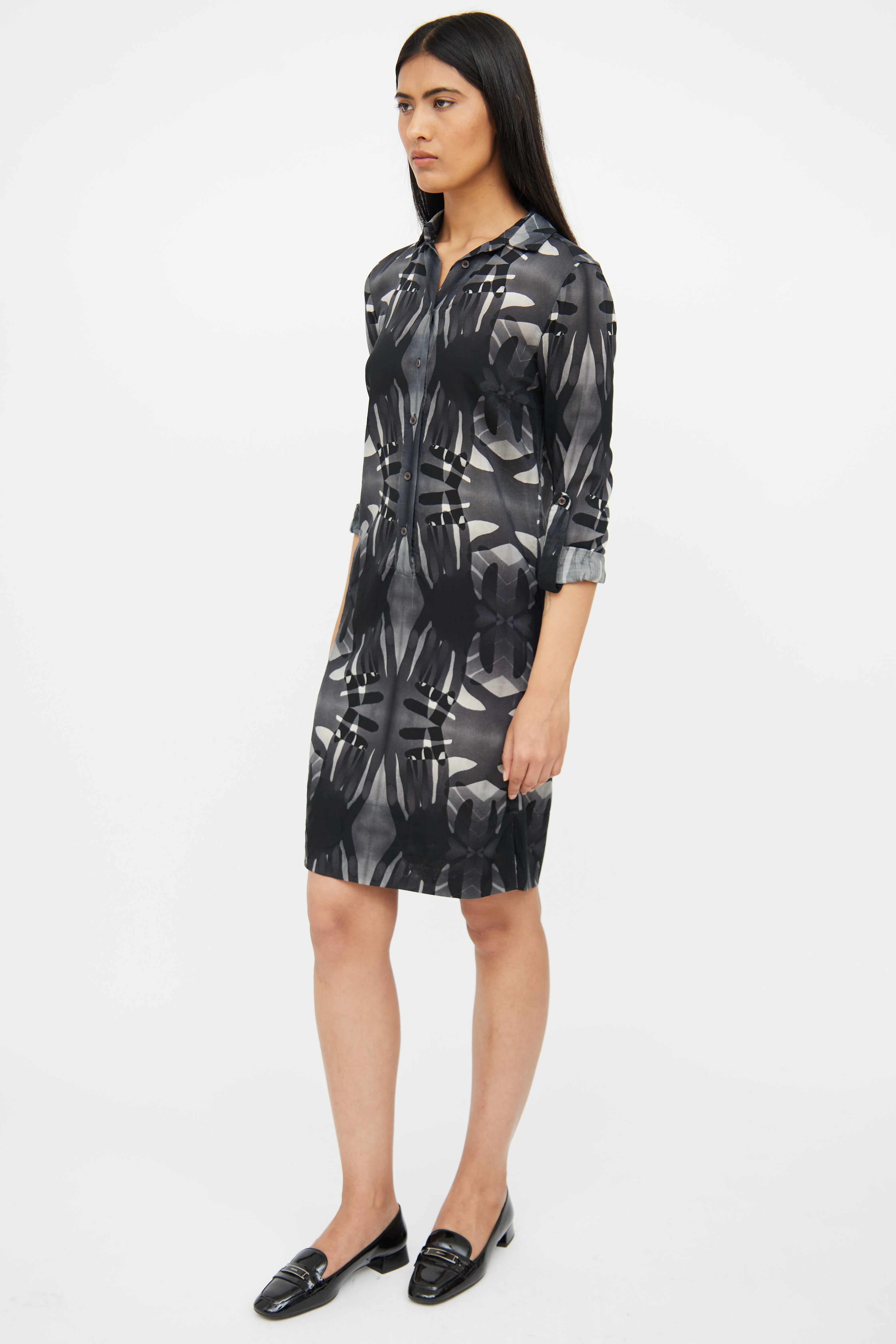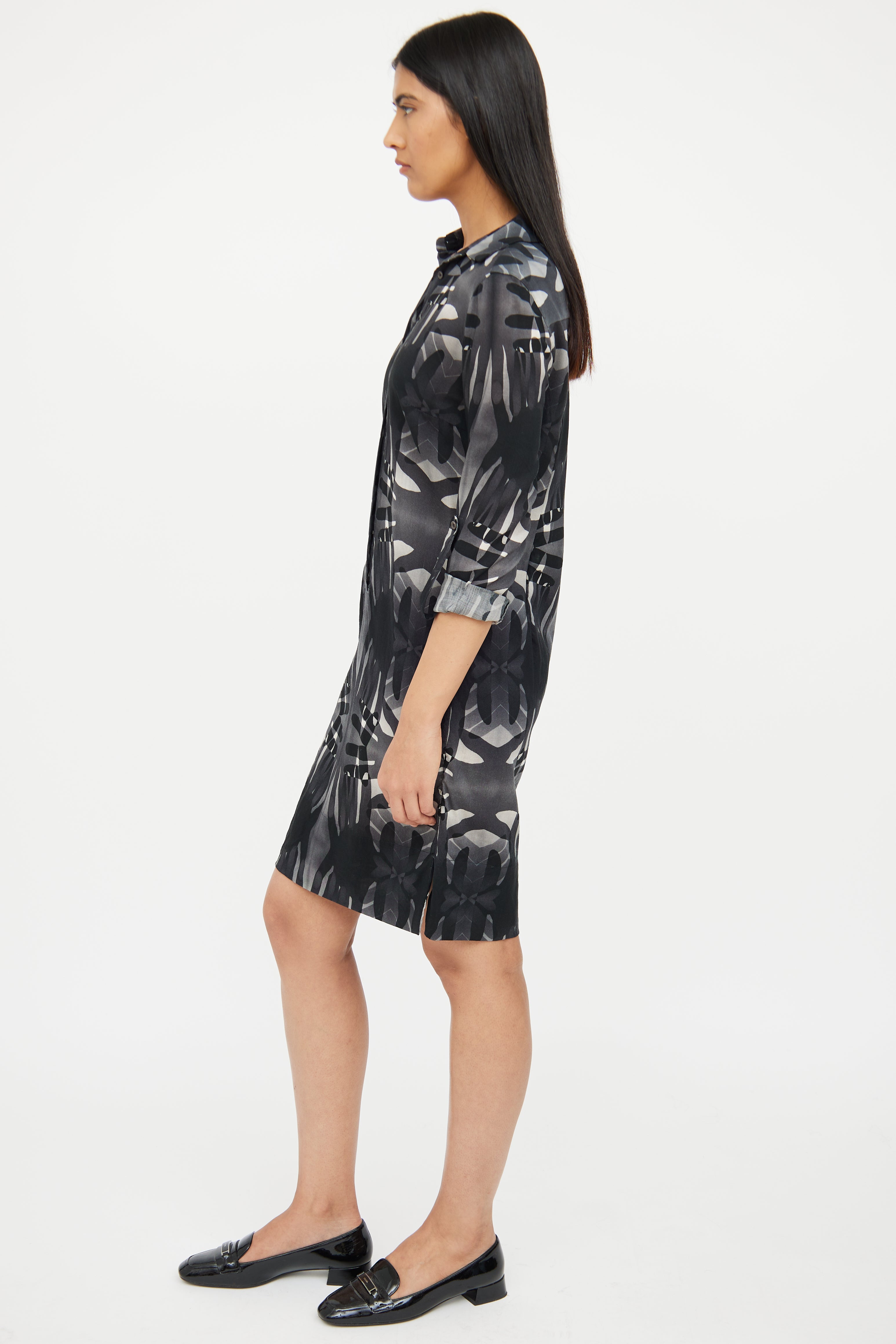 Pre-owned Akris grey linen shirt dress featuring a black pattern throughout, pointed collar, long sleeves with buttoned cuffs, darted bust, slits at hem, and button up closure.
