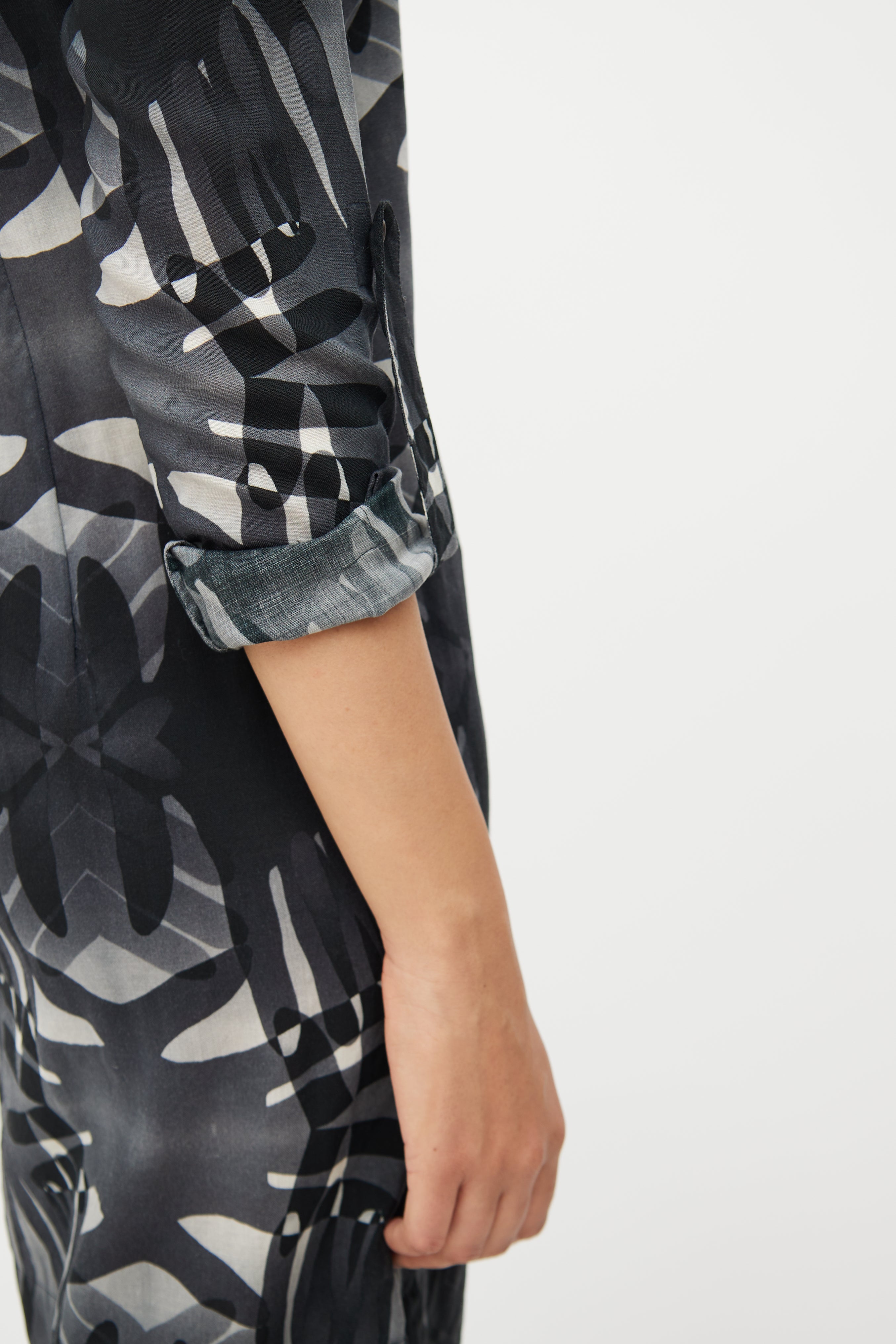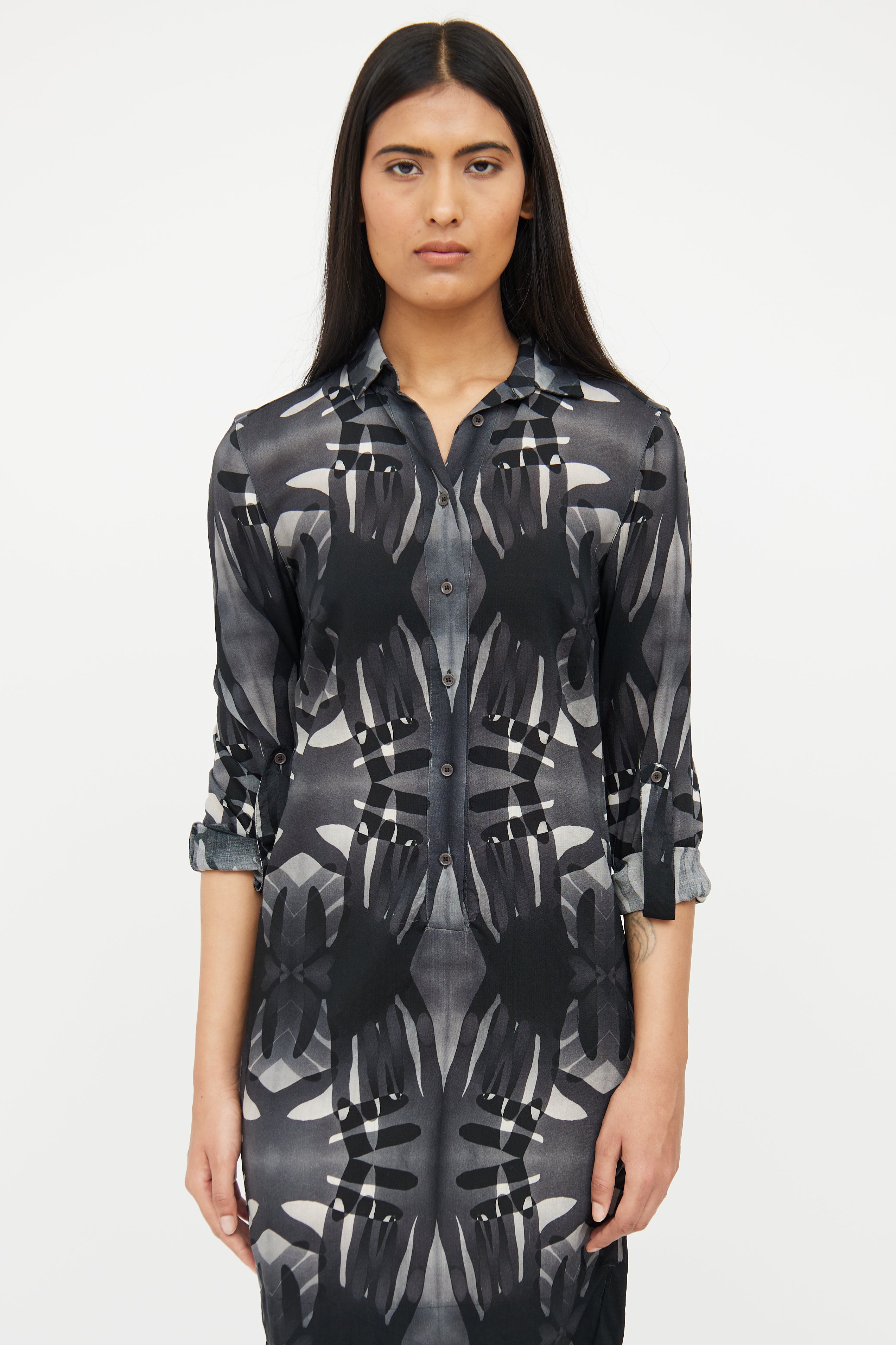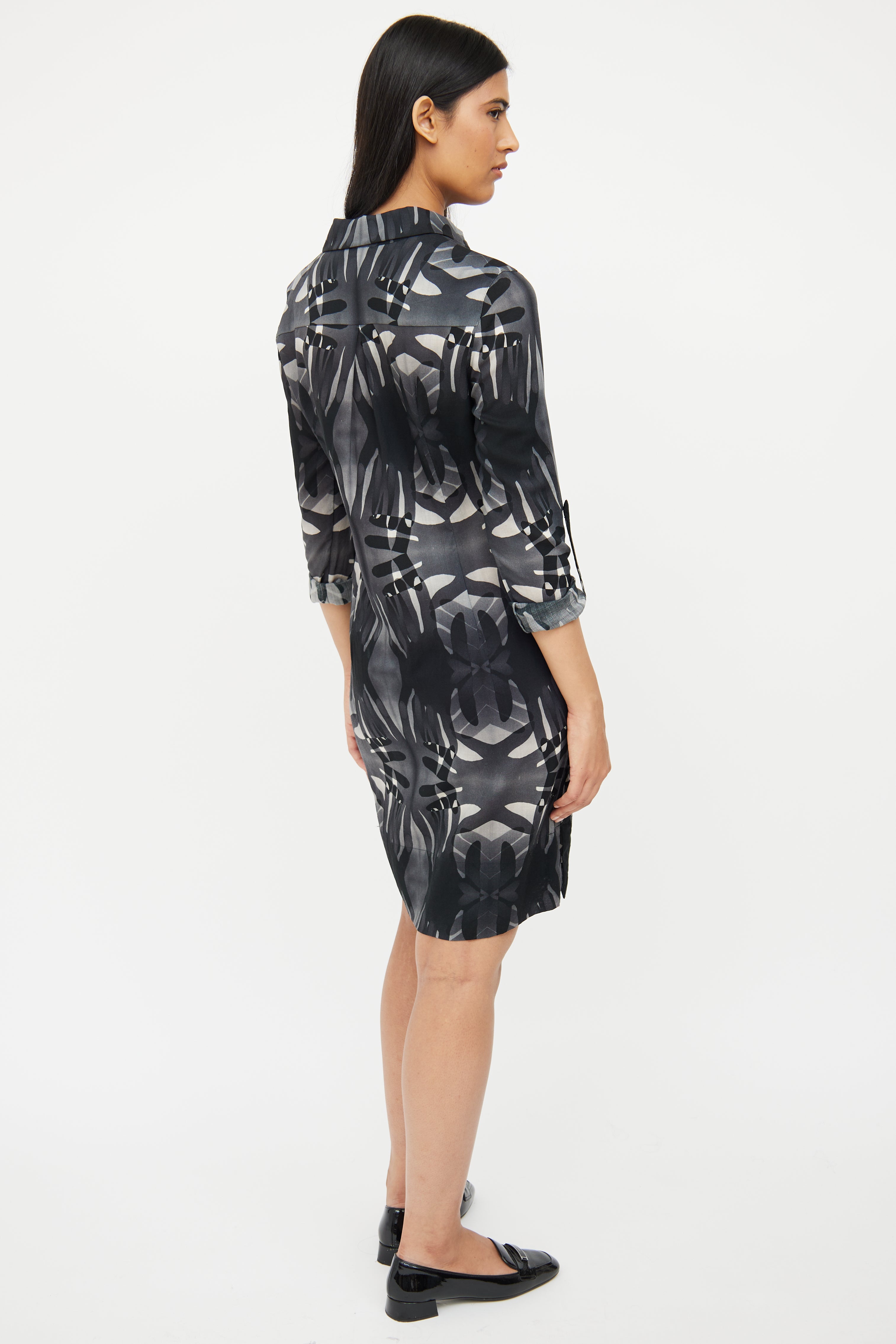Pre-owned Akris grey linen shirt dress featuring a black pattern throughout, pointed collar, long sleeves with buttoned cuffs, darted bust, slits at hem, and button up closure.