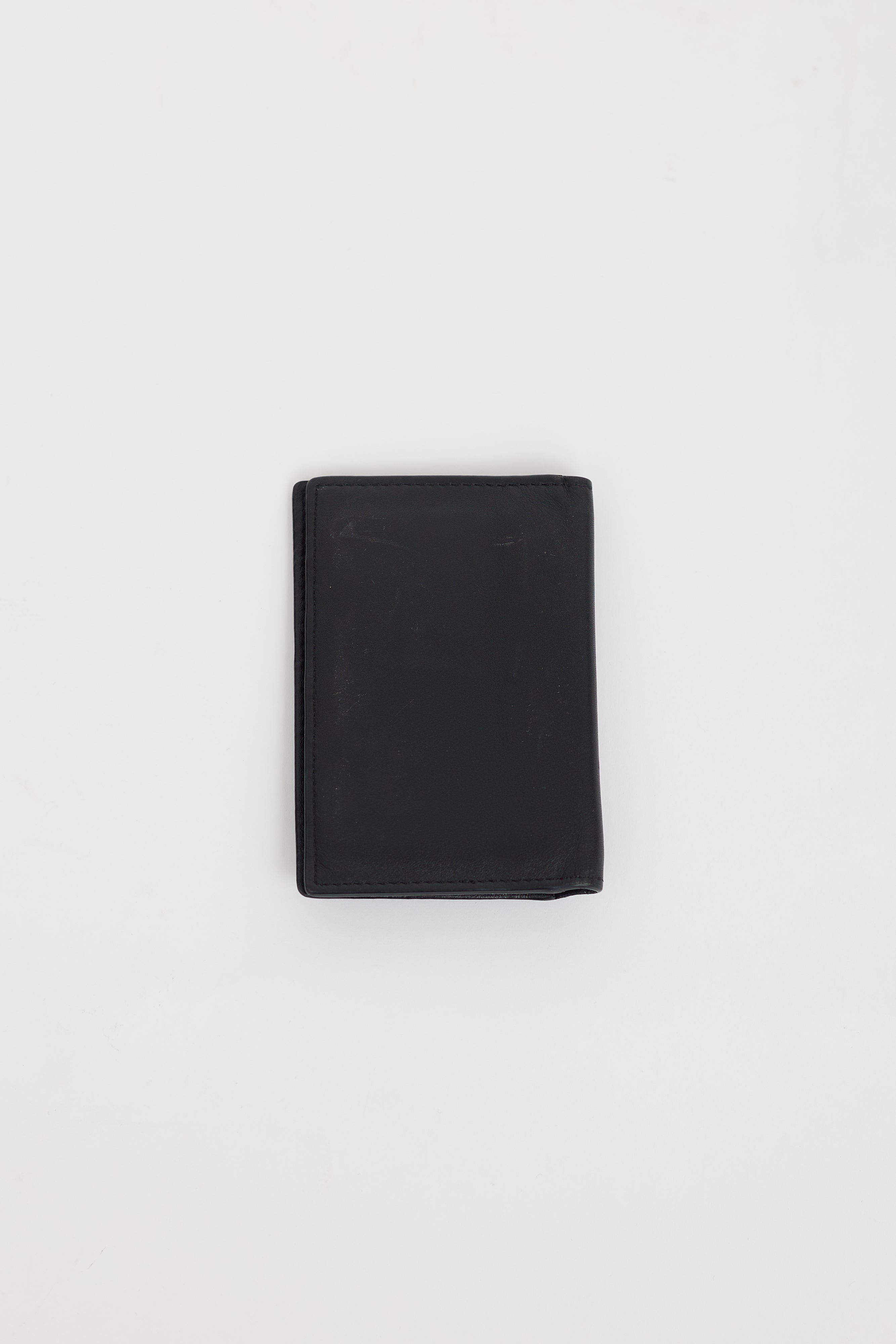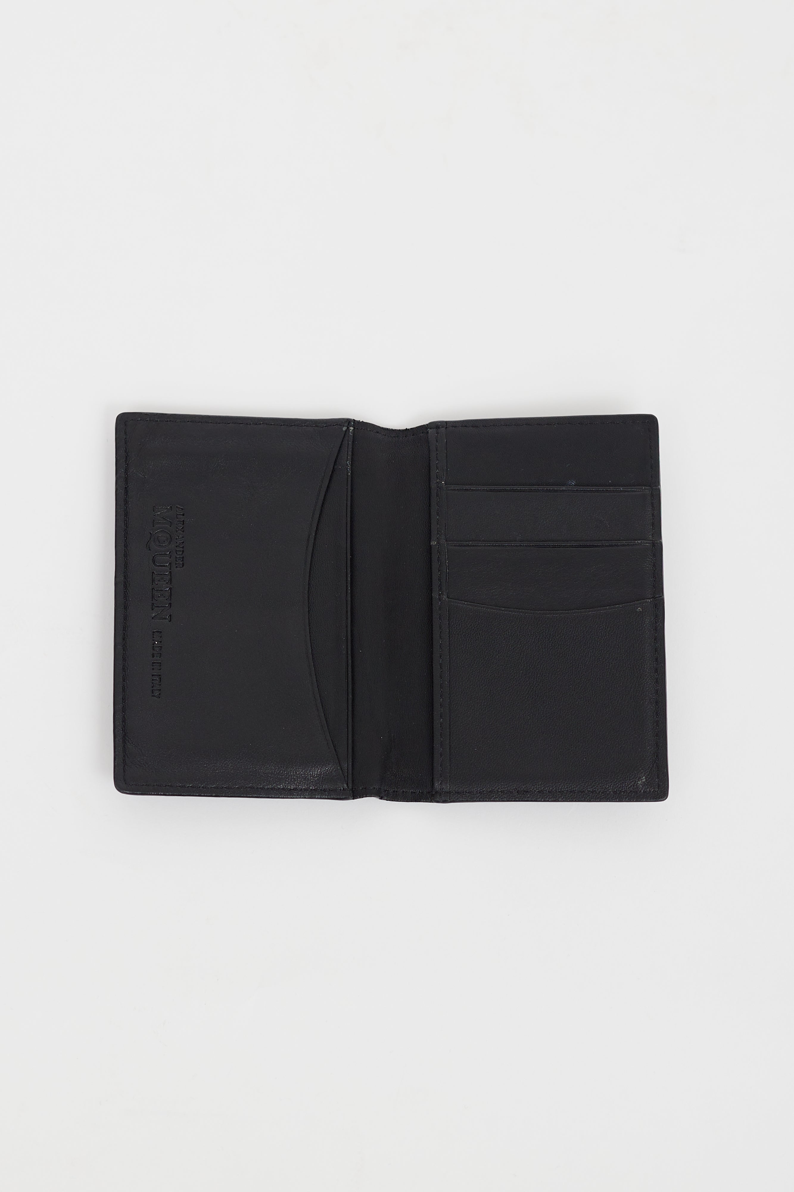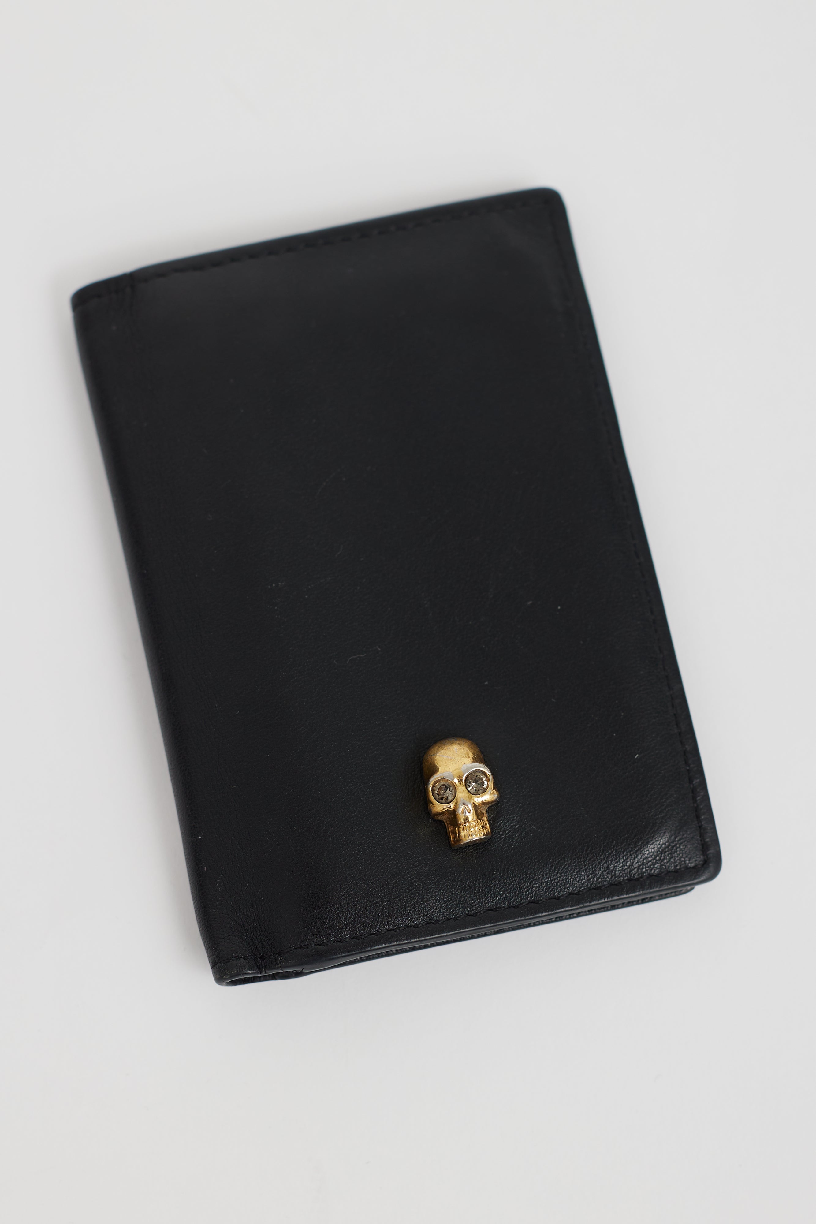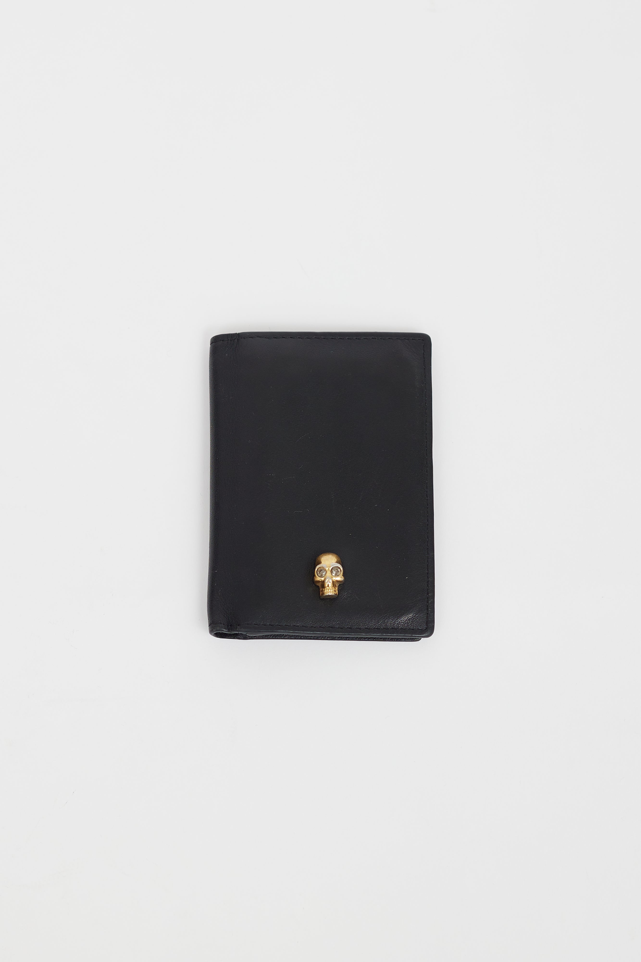 Pre-owned Alexander McQueen black leather cardholder featuring gold tone skull embellishment at front, multiple slots at interior, and engraved logo at interior.