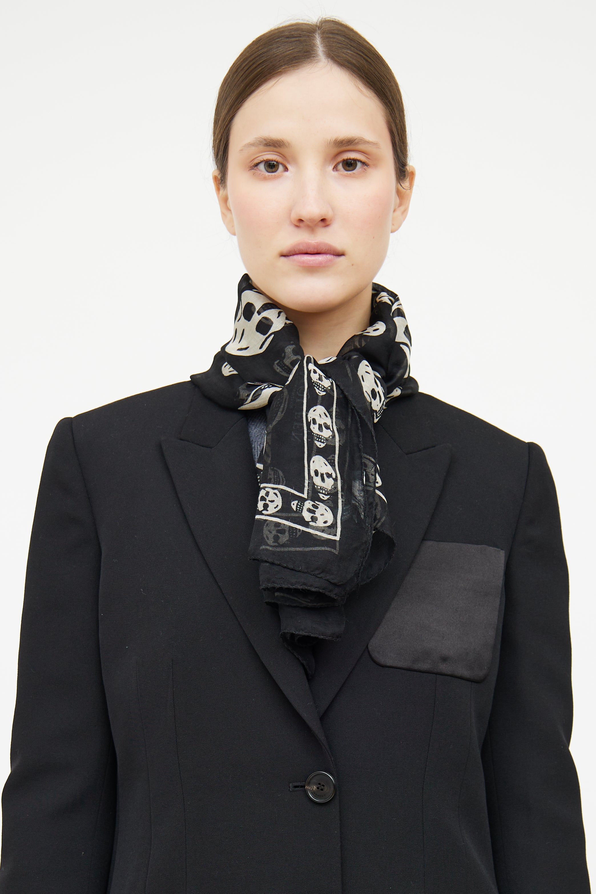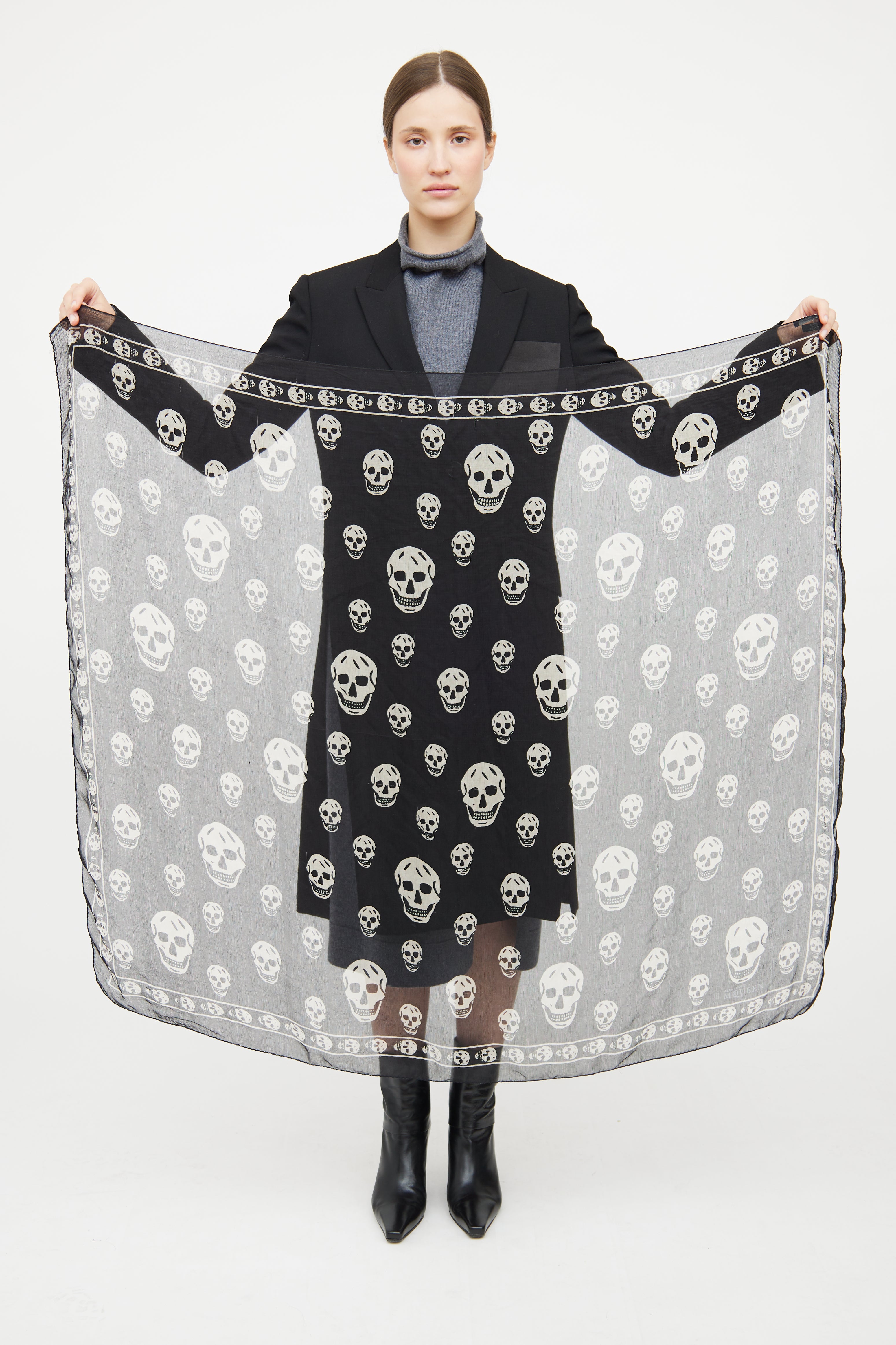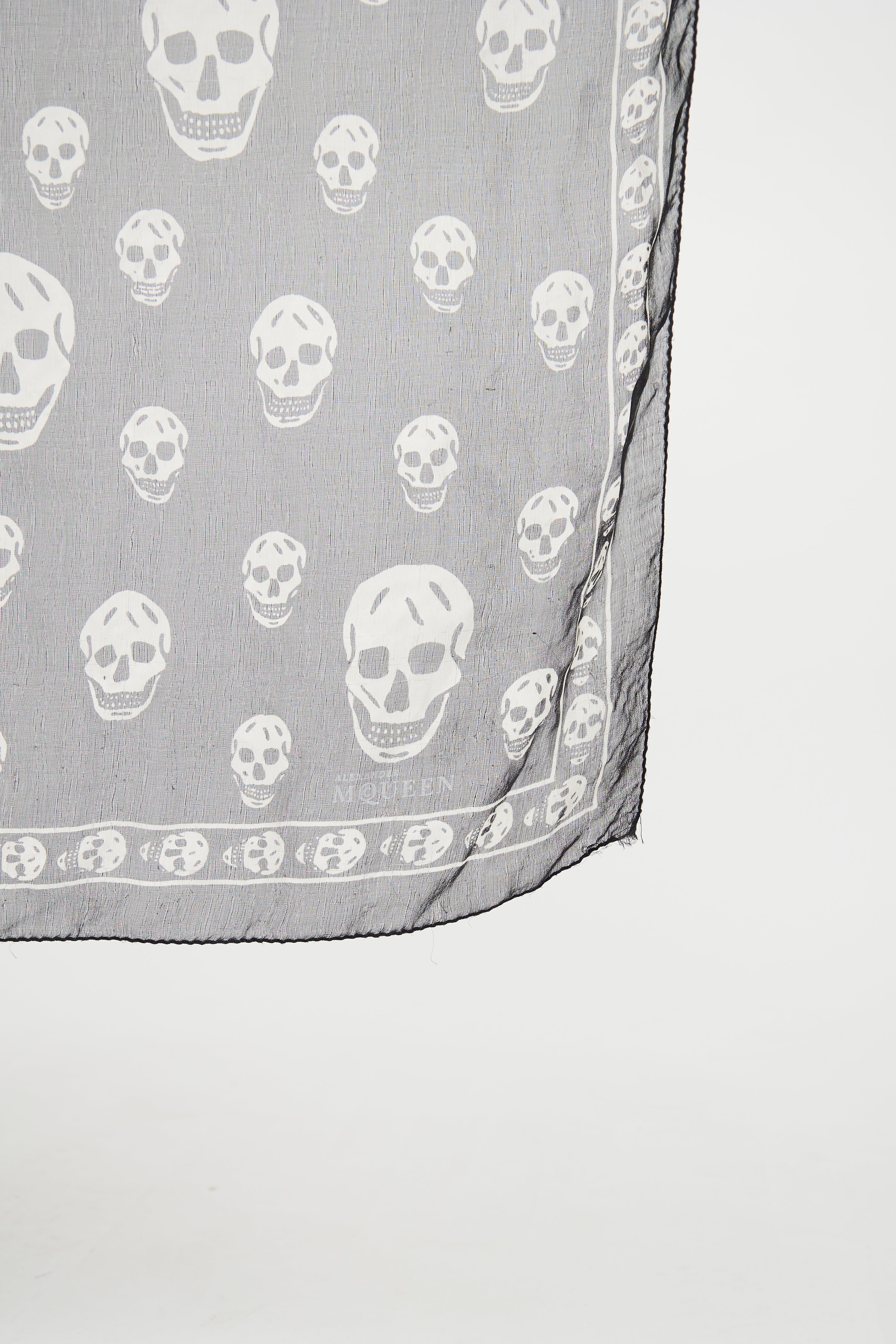 Pre-owned Alexander McQueen black silk scarf featuring white skull pattern and boarder with hand rolled edges.